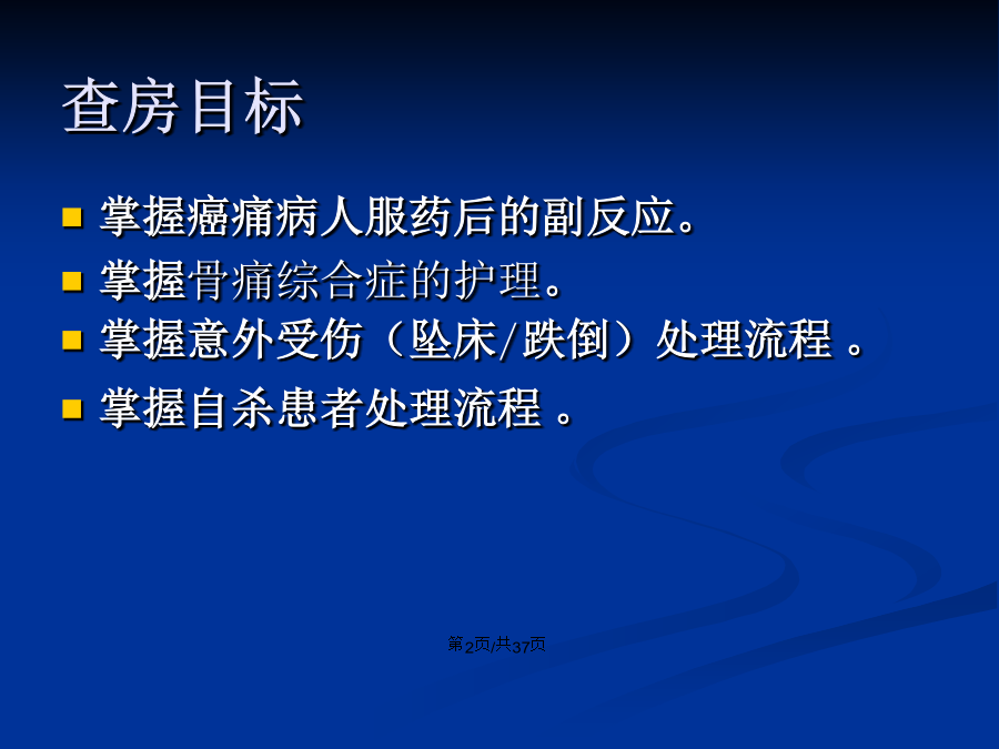 会计学业务查房查房目标重点分析内容拟题的问题责任护士:黄如娜汇报病情患者,女性,50岁。 病史资料既往史现病史客观资料心理社会评估:情绪低落,很少与人交流,对于疾病有一定的了解,有自杀倾向。 内护二级 普食 予抗肿瘤、止痛治疗2-8血常规:白细胞计数:8.5*10^9/L;中性粒细胞百分率:71.5↑%;红细胞计数:3.73↓*10^12/L;血红蛋白:103↓g/L;血小板计数:360↑*10^9/L; 2-8肿标全[女]:CEA:1244.0↑ng/ml;CA12-5:1162.0↑U/ml;CA19-9:>10000.0↑U/ml;NSE:53.6↑ng/ml; 2-8大生化:白蛋白:33.5↓g/L;谷草转氨酶:49↑U/L;碱性磷酸酶:204↑U/L;乳酸脱氢酶:925↑U/L;诊断检查护理措施2月7日15:21护理措施效果评价2月16日护理措施效果评价2月16日护理措施效果评估2月18日护理措施2月20日2月22日护理措施2月24日拟题问题癌痛病人服药后的副反应。骨痛综合症的护理意外受伤(坠床/跌倒)处理流程自杀患者处理流程谢谢!