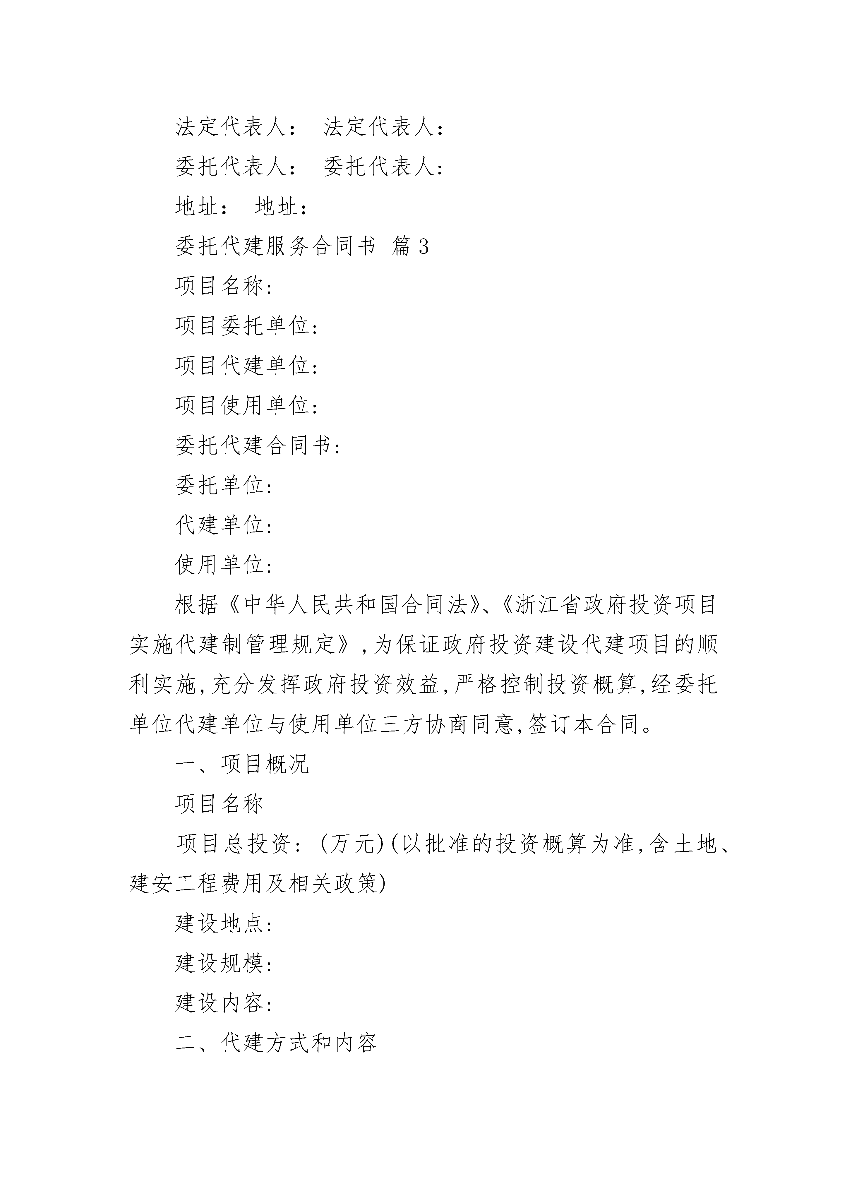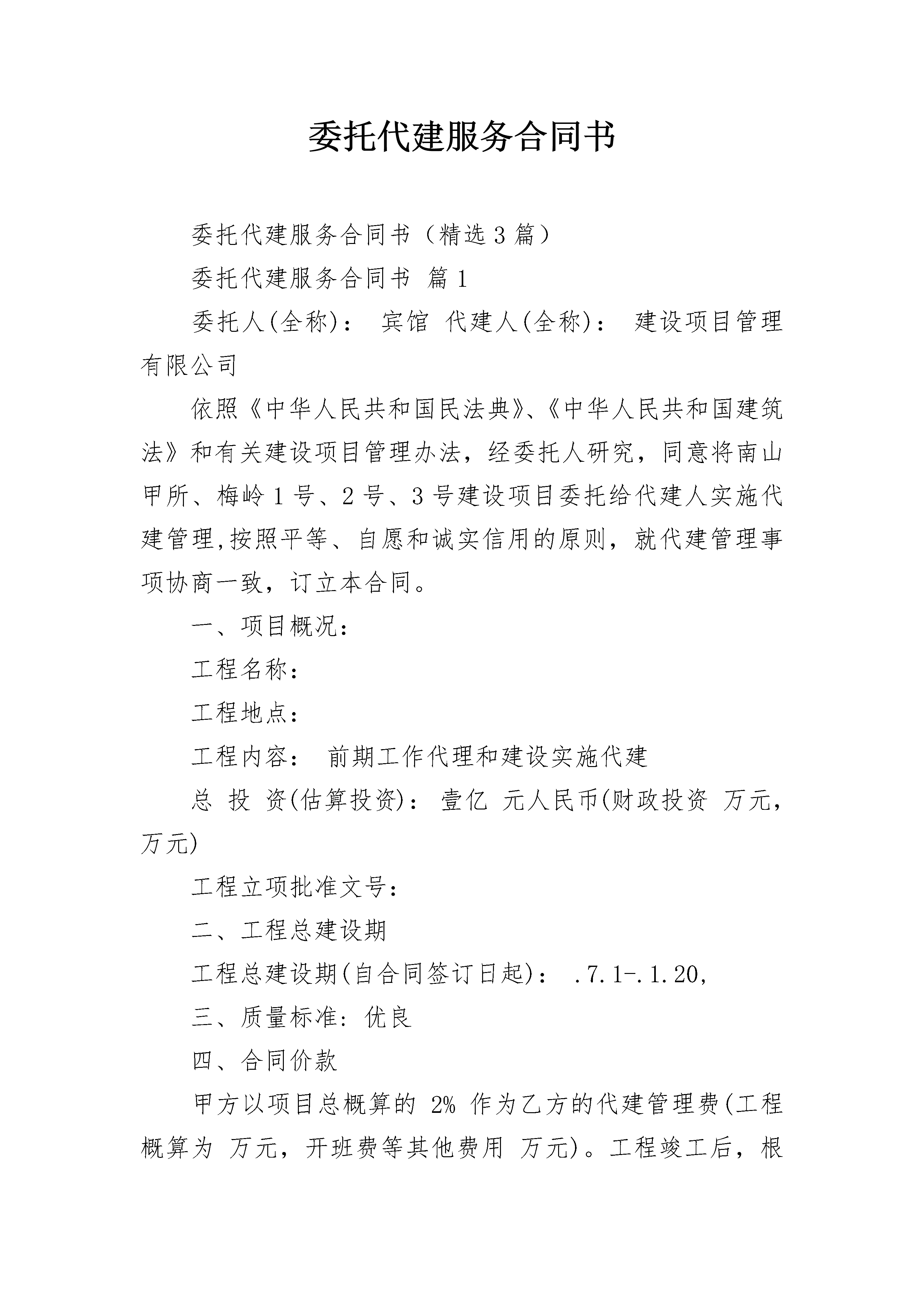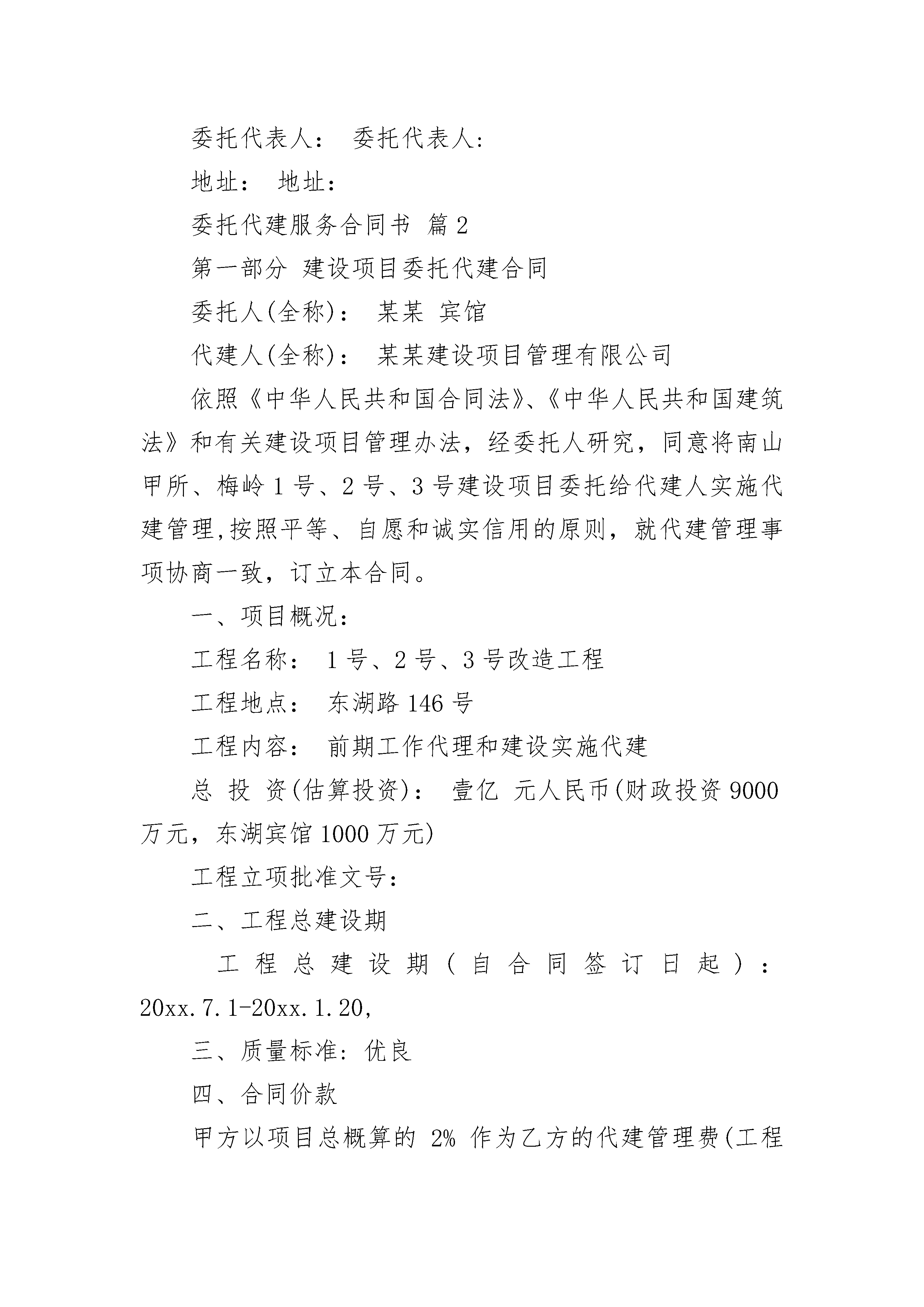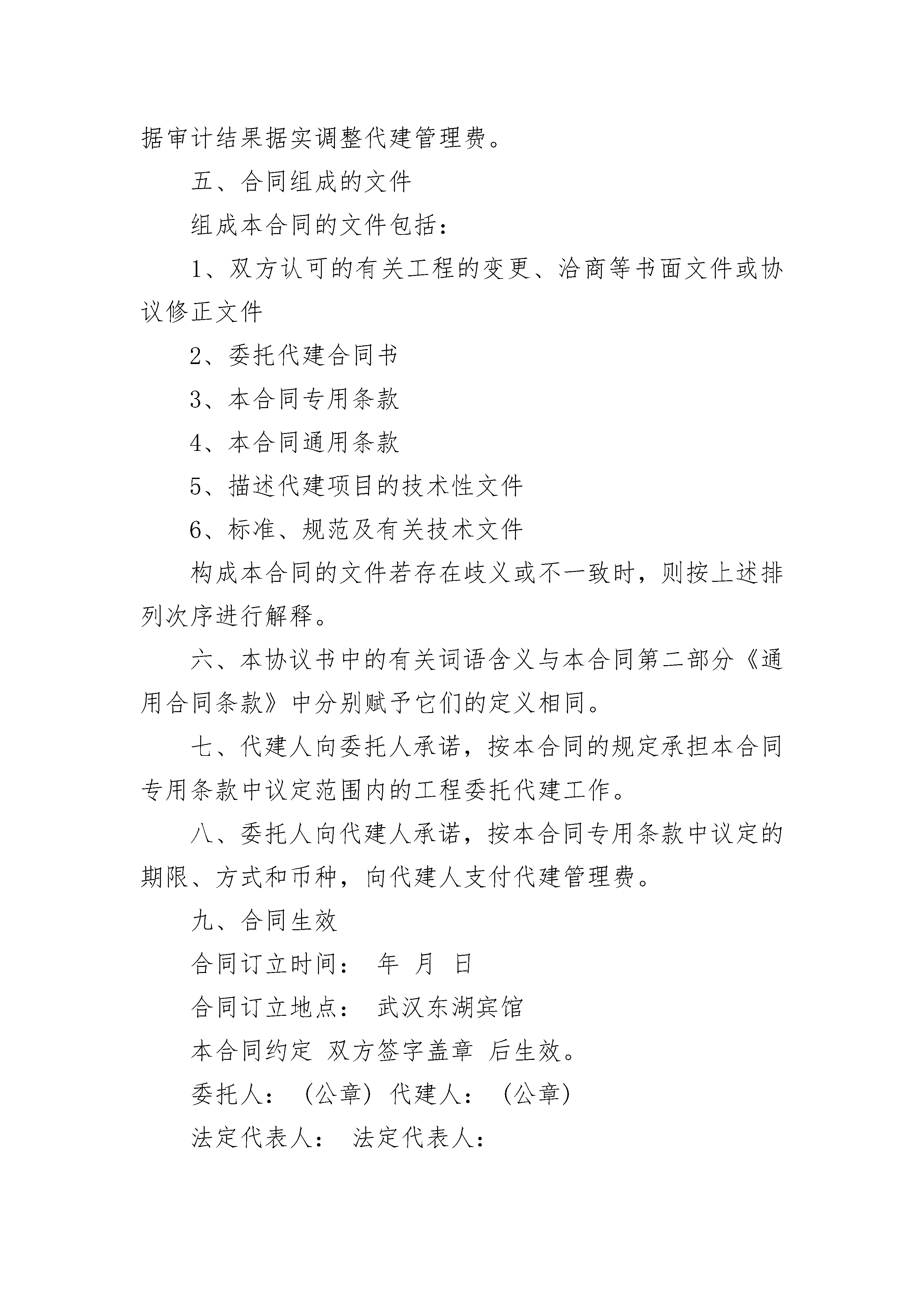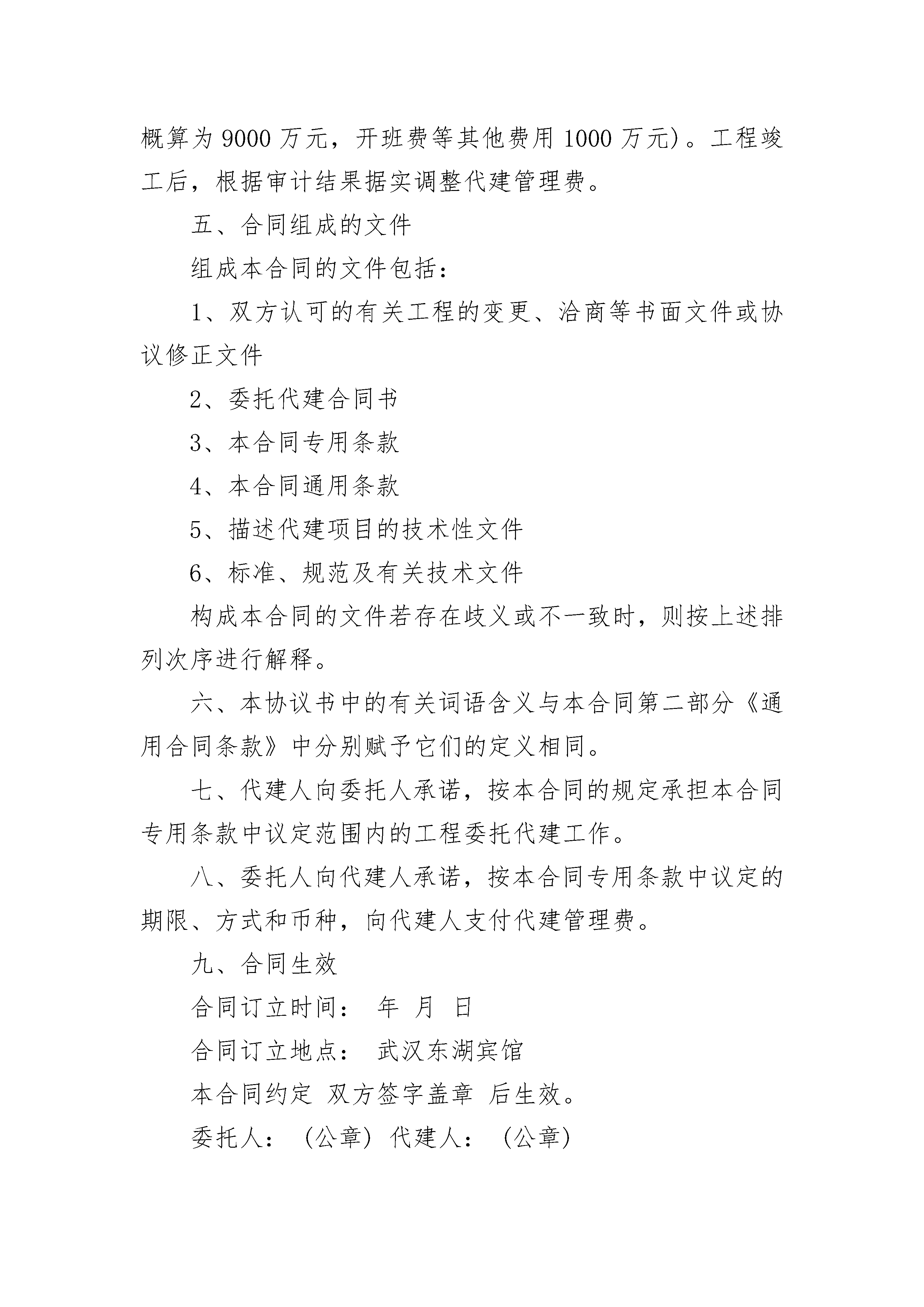 委托代建服务合同书委托代建服务合同书(精选3篇)委托代建服务合同书篇1委托人(全称):宾馆代建人(全称):建设项目管理有限公司依照《中华人民共和国民法典》、《中华人民共和国建筑法》和有关建设项目管理办法,经委托人研究,同意将南山甲所、梅岭1号、2号、3号建设项目委托给代建人实施代建管理,按照平等、自愿和诚实信用的原则,就代建管理事项协商一致,订立本合同。一、项目概况:工程名称:工程地点:工程内容:前期工作代理和建设实施代建总投资(估算投资):壹亿元人民币(财政投资万元,万元)工程立项批准文号:二、工程总建设期工程总建设期(自合同签订日起):.7.1-.1.20,三、质量标准:优良四、合同价款甲方以项目总概算的2%作为乙方的代建管理费(工程概算为万元,开班费等其他费用万元)。工程竣工后,根据审计结果据实调整代建管理费。五、合同组成的文件组成本合同的文件包括:1、双方认可的有关工程的变更、洽商等书面文件或协议修正文件2、委托代建合同书3、本合同专用条款4、本合同通用条款5、描述代建项目的技术性文件6、标准、规范及有关技术文件构成本合同的文件若存在歧义或不一致时,则按上述排列次序进行解释。六、本协议书中的有关词语含义与本合同第二部分《通用合同条款》中分别赋予它们的定义相同。七、代建人向委托人承诺,按本合同的规定承担本合同专用条款中议定范围内的工程委托代建工作。八、委托人向代建人承诺,按本合同专用条款中议定的期限、方式和币种,向代建人支付代建管理费。九、合同生效合同订立时间:年月日合同订立地点:武汉东湖宾馆本合同约定双方签字盖章后生效。委托人:(公章)代建人:(公章)法定代表人:法定代表人:委托代表人:委托代表人:地址:地址:委托代建服务合同书篇2第一部分建设项目委托代建合同委托人(全称):某某宾馆代建人(全称):某某建设项目管理有限公司依照《中华人民共和国合同法》、《中华人民共和国建筑法》和有关建设项目管理办法,经委托人研究,同意将南山甲所、梅岭1号、2号、3号建设项目委托给代建人实施代建管理,按照平等、自愿和诚实信用的原则,就代建管理事项协商一致,订立本合同。一、项目概况:工程名称:1号、2号、3号改造工程工程地点:东湖路146号工程内容:前期工作代理和建设实施代建总投资(估算投资):壹亿元人民币(财政投资9000万元,东湖宾馆1000万元)工程立项批准文号:二、工程总建设期工程总建设期(自合同签订日起):20xx.7.1-20xx.1.20,三、质量标准:优良四、合同价款甲方以项目总概算的2%作为乙方的代建管理费(工程概算为9000万元,开班费等其他费用1000万元)。工程竣工后,根据审计结果据实调整代建管理费。五、合同组成的文件组成本合同的文件包括:1、双方认可的有关工程的变更、洽商等书面文件或协议修正文件2、委托代建合同书3、本合同专用条款4、本合同通用条款5、描述代建项目的技术性文件6、标准、规范及有关技术文件构成本合同的文件若存在歧义或不一致时,则按上述排列次序进行解释。六、本协议书中的有关词语含义与本合同第二部分《通用合同条款》中分别赋予它们的定义相同。七、代建人向委托人承诺,按本合同的规定承担本合同专用条款中议定范围内的工程委托代建工作。八、委托人向代建人承诺,按本合同专用条款中议定的期限、方式和币种,向代建人支付代建管理费。九、合同生效合同订立时间:年月日合同订立地点:武汉东湖宾馆本合同约定双方签字盖章后生效。委托人:(公章)代建人:(公章)法定代表人:法定代表人:委托代表人:委托代表人:地址:地址:委托代建服务合同书篇3项目名称:项目委托单位:项目代建单位:项目使用单位:委托代建合同书:委托单位:代建单位:使用单位:根据《中华人民共和国合同法》、《浙江省政府投资项目实施代建制管理规定》,为保证政府投资建设代建项目的顺利实施,充分发挥政府投资效益,严格控制投资概算,经委托单位代建单位与使用单位三方协商同意,签订本合同。一、项目概况项目名称项目总投资:(万元)(以批准的投资概算为准,含土地、建安工程费用及相关政策)建设地点:建设规模:建设内容:二、代建方式和内容1、代建方式(①全过程代理,②前期工作代理,③建设实施代理)2、代建内容①前期工作代理内容:组织项目可研、工程勘察、初步设计编制,办理可研报告、初步设计、土地征用、拆迁、环保、消防等手续。②组织建设实施代理内容:施工图设计、施工、监理、设备材料选购年度计划、工程规划许可证、施工许可证、消防、园林绿化、市政等手续,工程合同的洽谈与签订;投资计划、用款计划申请;工程中间验收、编制工程决算报告、施工验收、资产交付等。③全过程代建是指包含以上两方面的代理内容。三、代建项目管理目标投资控制金额:(万元)(以代建单位投标报价为准)工程质量标准:代建管理期限(合同签约后