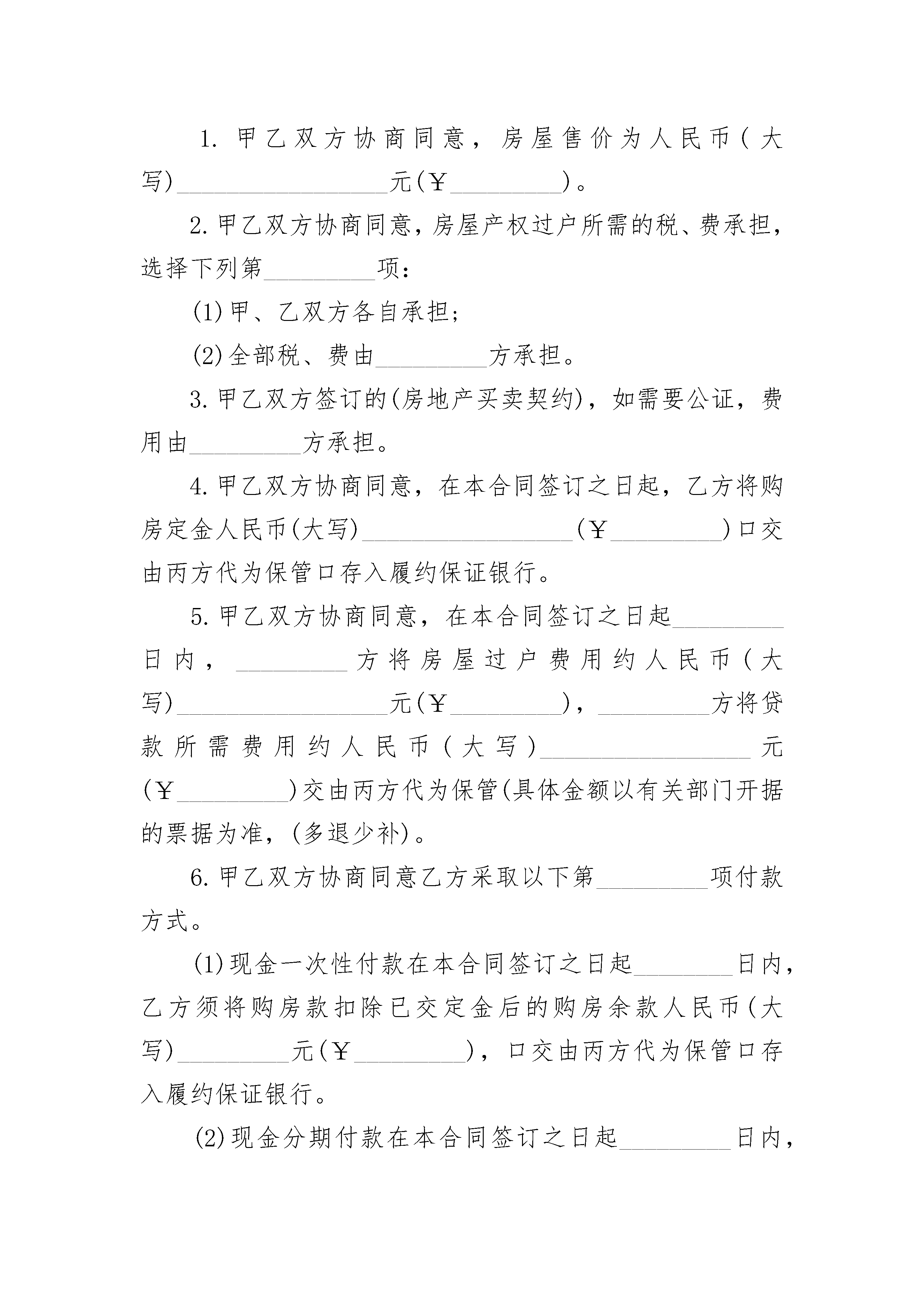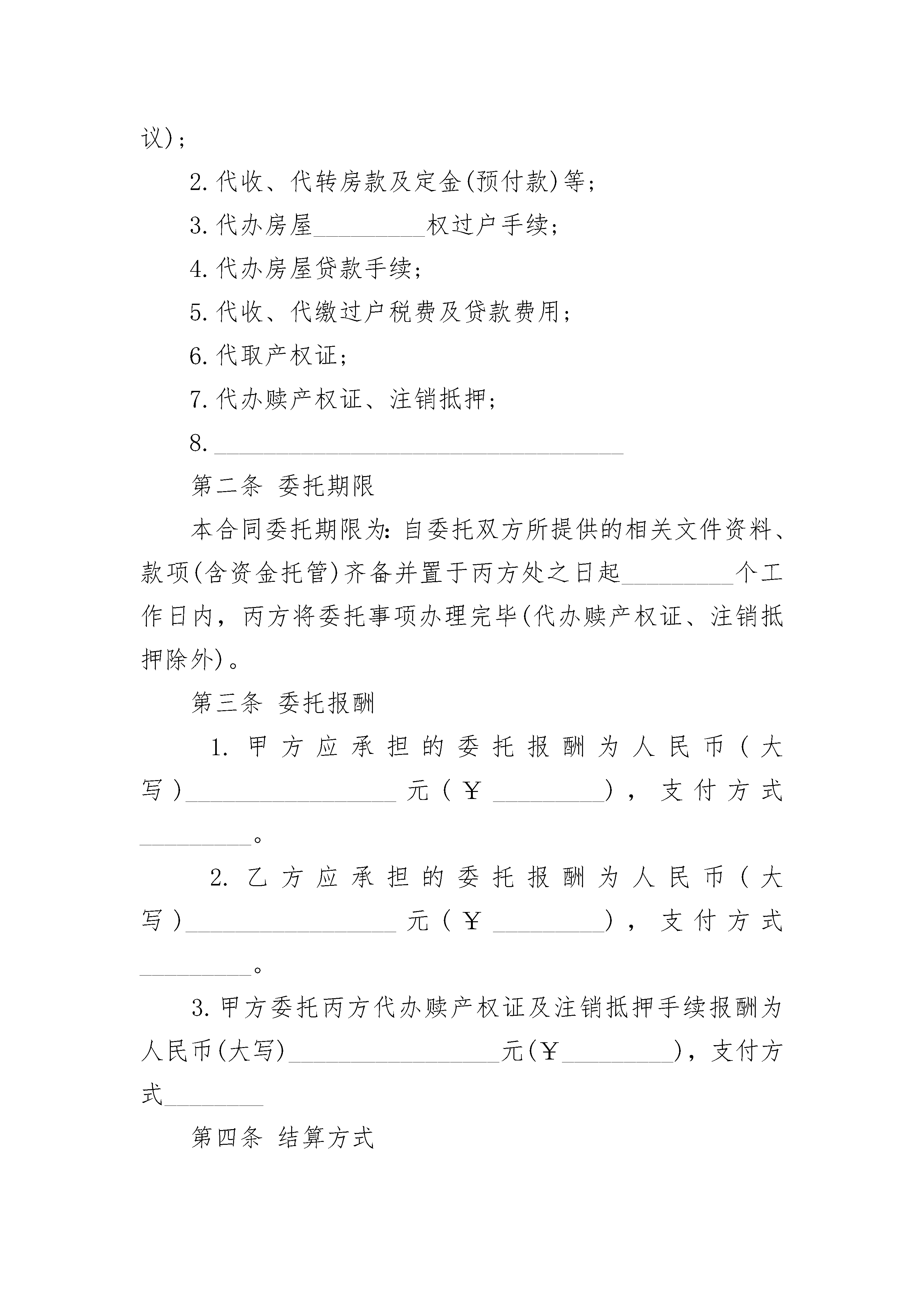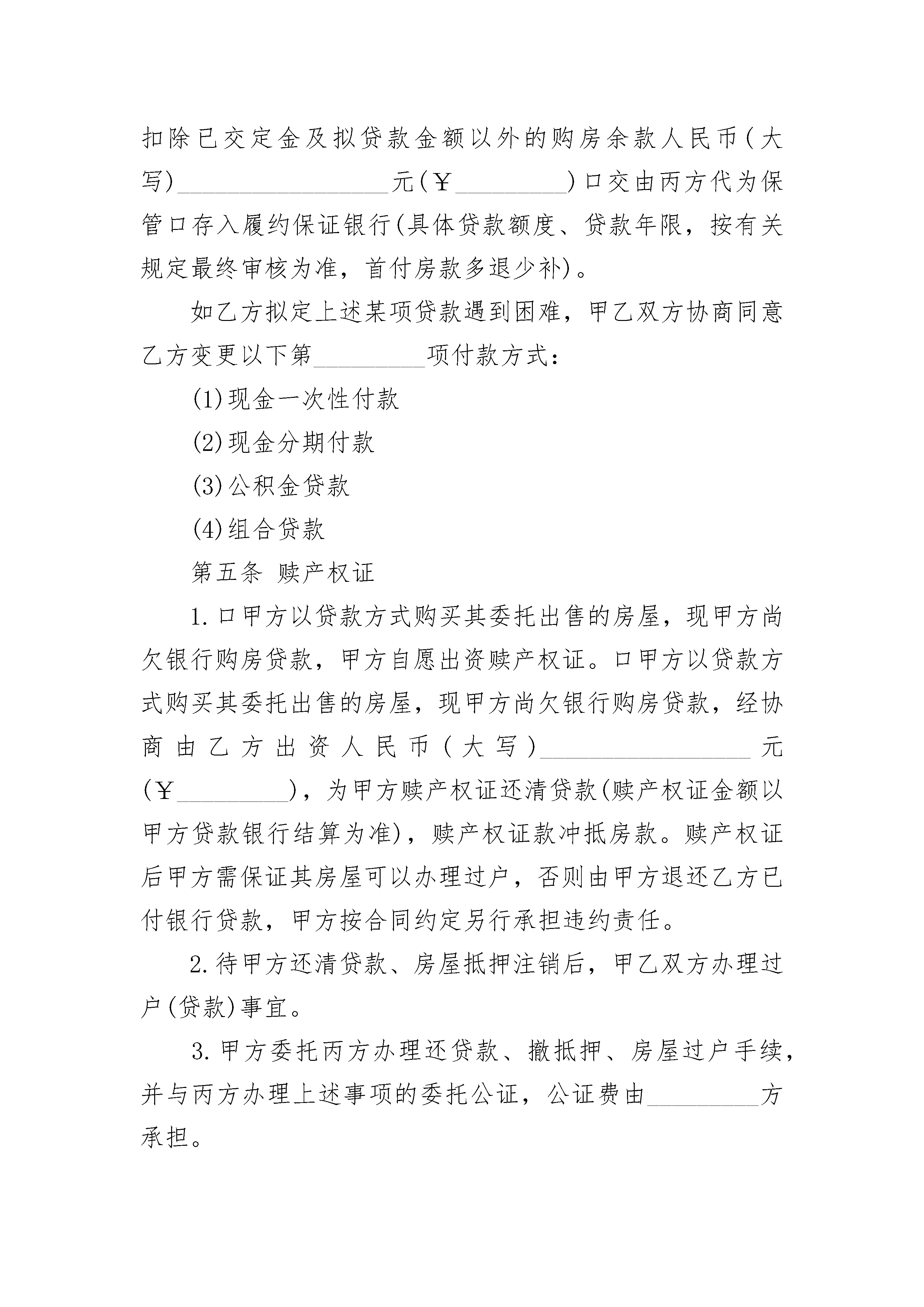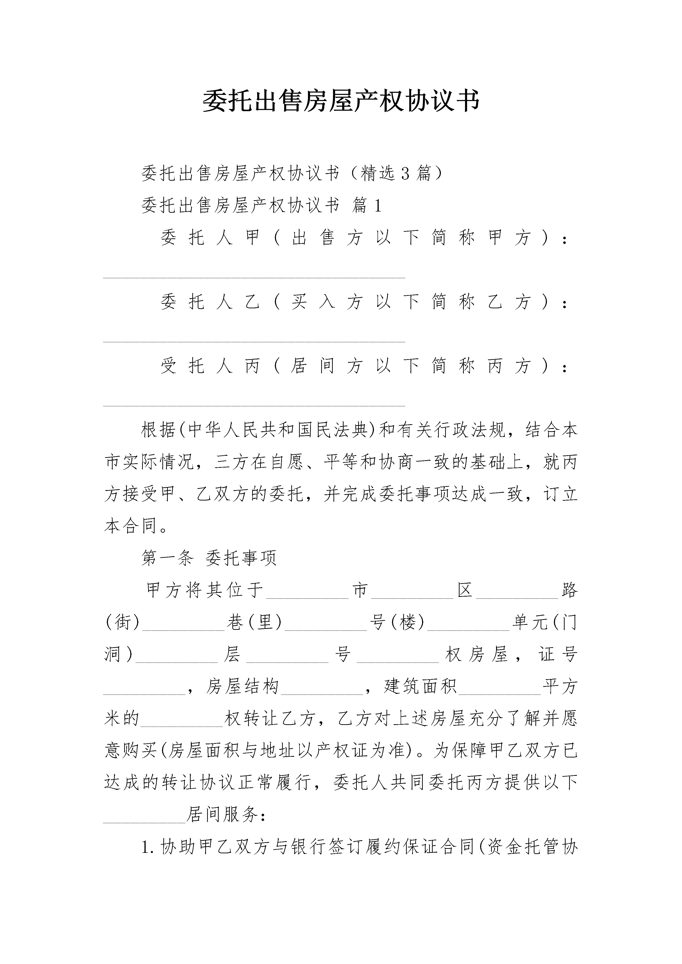 委托出售房屋产权协议书委托出售房屋产权协议书(精选3篇)委托出售房屋产权协议书篇1委托人甲(出售方以下简称甲方):_________________________________委托人乙(买入方以下简称乙方):_________________________________受托人丙(居间方以下简称丙方):_________________________________根据(中华人民共和国民法典)和有关行政法规,结合本市实际情况,三方在自愿、平等和协商一致的基础上,就丙方接受甲、乙双方的委托,并完成委托事项达成一致,订立本合同。第一条委托事项甲方将其位于_________市_________区_________路(街)_________巷(里)_________号(楼)_________单元(门洞)_________层_________号_________权房屋,证号_________,房屋结构_________,建筑面积_________平方米的_________权转让乙方,乙方对上述房屋充分了解并愿意购买(房屋面积与地址以产权证为准)。为保障甲乙双方已达成的转让协议正常履行,委托人共同委托丙方提供以下_________居间服务:1.协助甲乙双方与银行签订履约保证合同(资金托管协议);2.代收、代转房款及定金(预付款)等;3.代办房屋_________权过户手续;4.代办房屋贷款手续;5.代收、代缴过户税费及贷款费用;6.代取产权证;7.代办赎产权证、注销抵押;8._________________________________第二条委托期限本合同委托期限为:自委托双方所提供的相关文件资料、款项(含资金托管)齐备并置于丙方处之日起_________个工作日内,丙方将委托事项办理完毕(代办赎产权证、注销抵押除外)。第三条委托报酬1.甲方应承担的委托报酬为人民币(大写)_________________元(¥_________),支付方式_________。2.乙方应承担的委托报酬为人民币(大写)_________________元(¥_________),支付方式_________。3.甲方委托丙方代办赎产权证及注销抵押手续报酬为人民币(大写)_________________元(¥_________),支付方式________第四条结算方式1.甲乙双方协商同意,房屋售价为人民币(大写)_________________元(¥_________)。2.甲乙双方协商同意,房屋产权过户所需的税、费承担,选择下列第_________项:(1)甲、乙双方各自承担;(2)全部税、费由_________方承担。3.甲乙双方签订的(房地产买卖契约),如需要公证,费用由_________方承担。4.甲乙双方协商同意,在本合同签订之日起,乙方将购房定金人民币(大写)_________________(¥_________)口交由丙方代为保管口存入履约保证银行。5.甲乙双方协商同意,在本合同签订之日起_________日内,_________方将房屋过户费用约人民币(大写)_________________元(¥_________),_________方将贷款所需费用约人民币(大写)_________________元(¥_________)交由丙方代为保管(具体金额以有关部门开据的票据为准,(多退少补)。6.甲乙双方协商同意乙方采取以下第_________项付款方式。(1)现金一次性付款在本合同签订之日起________日内,乙方须将购房款扣除已交定金后的购房余款人民币(大写)_________元(¥_________),口交由丙方代为保管口存入履约保证银行。(2)现金分期付款在本合同签订之日起_________日内,乙方将首付购房款人民币(大写)_________________元(¥_________)支付给甲方。在本合同签订之日起_________日内,乙方将扣除已交定金及首付款以外的购房余款人民币(大写)_______________元(¥_________),口交由丙方代为保管口存入履约保证银行。(3)商业贷款乙方申请商业贷款,拟贷款金额为人民币(大写)_________________元(¥_________),贷款年限为______年。在本合同签订之日起_________日内,乙方须将购房总款扣除已交定金及拟贷款金额以外的购房余款人民币(大写)_________________(¥_________)口交由丙方代为保管口存入履约保证银行(具体的贷款额度、贷款年限,按有关规定最终审核为准首付房款多退少补)(4)公积金贷款乙方申请公积金贷款,拟贷款金额为人民币(大写)_______________元(¥________),贷