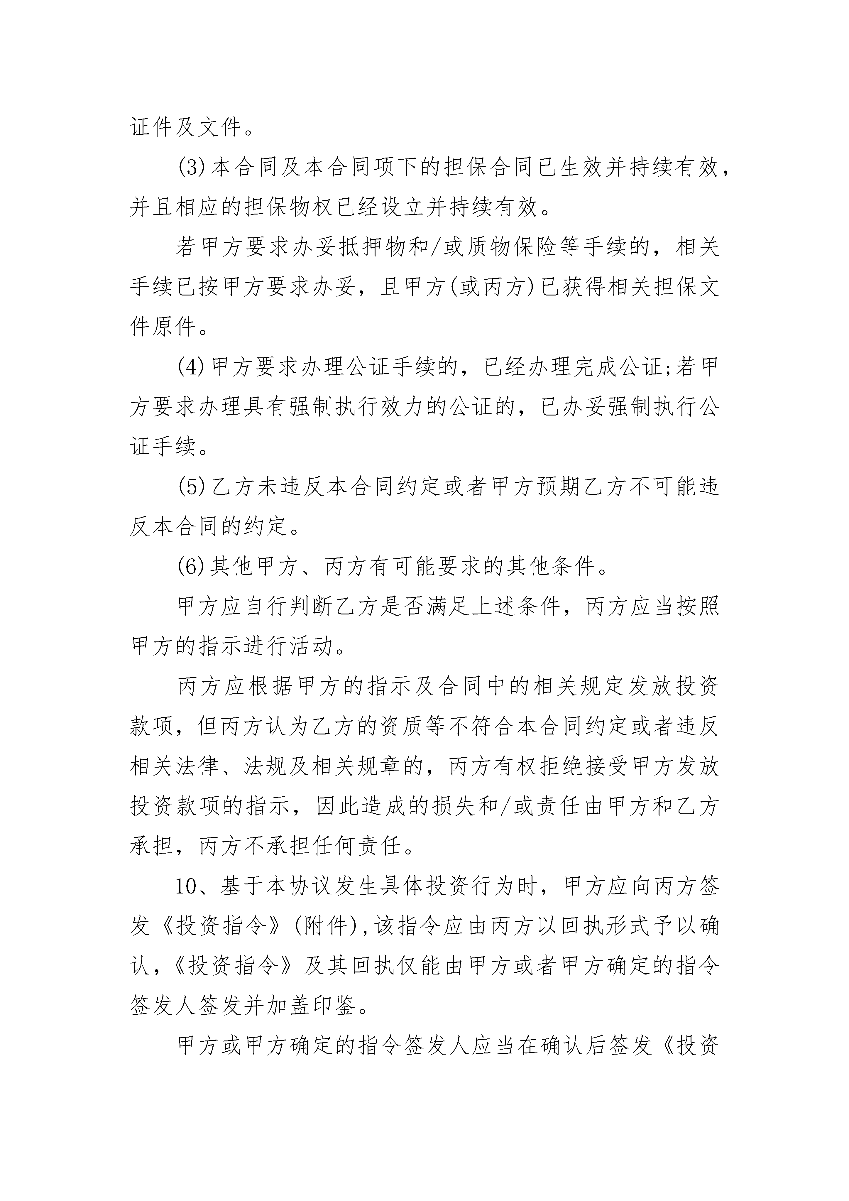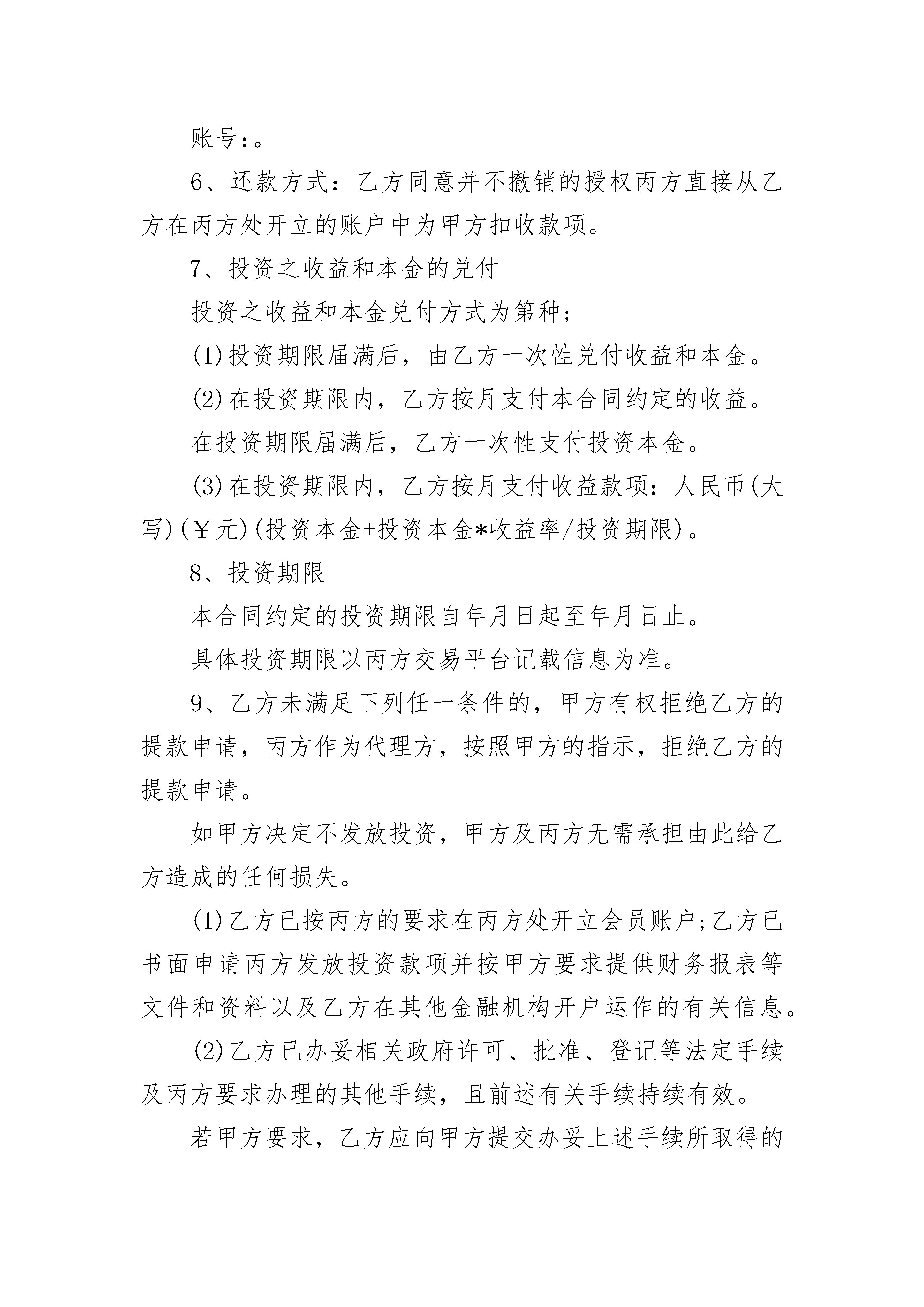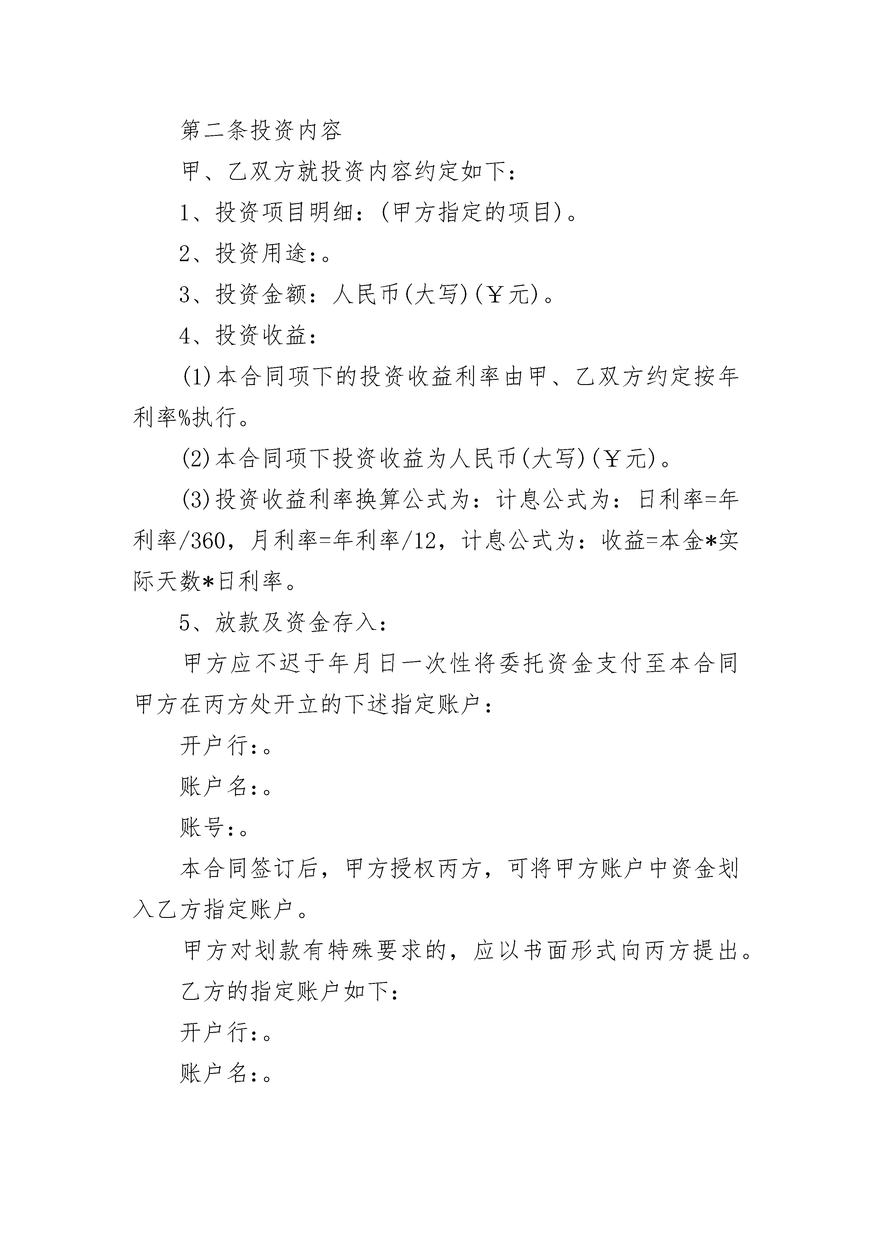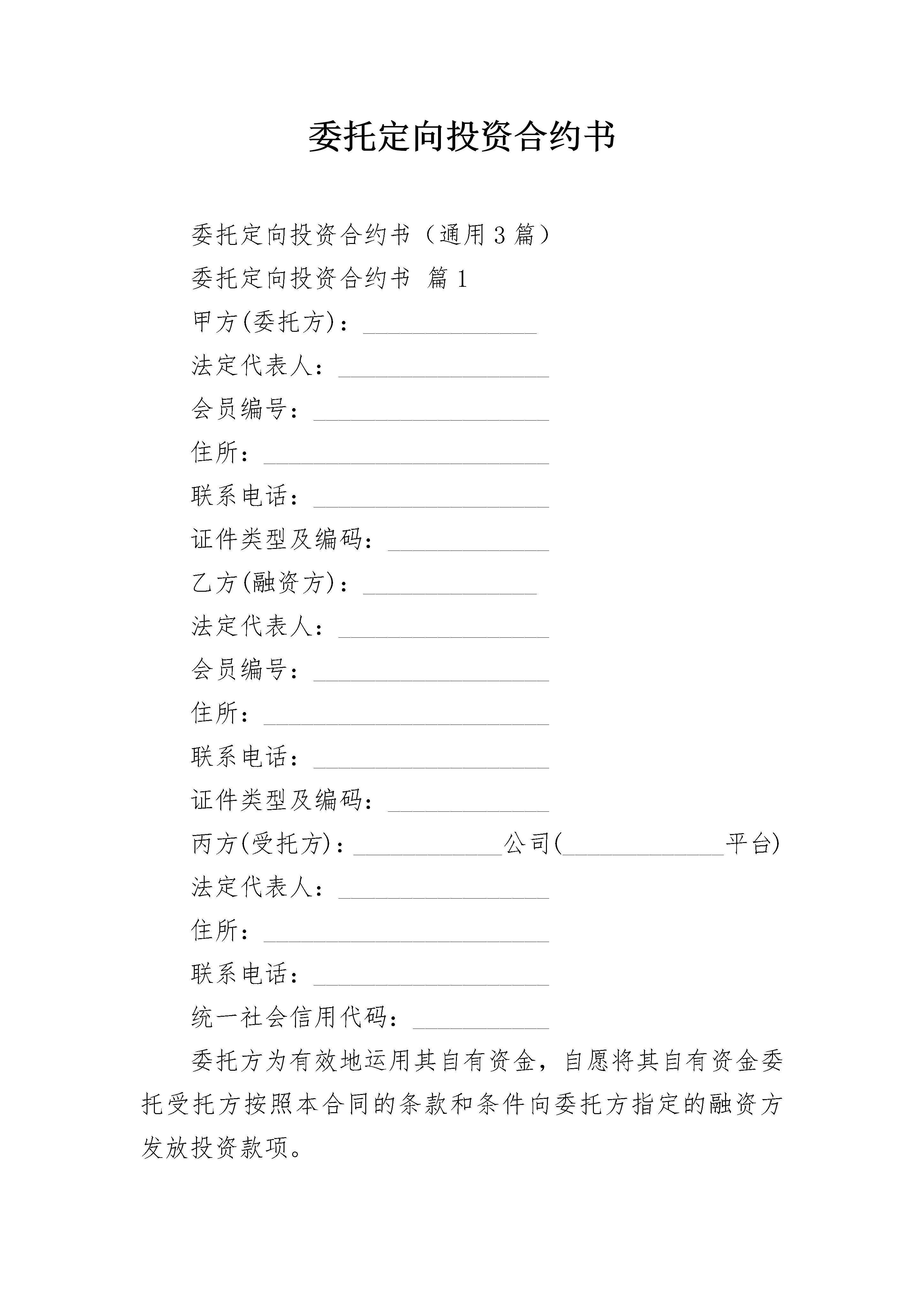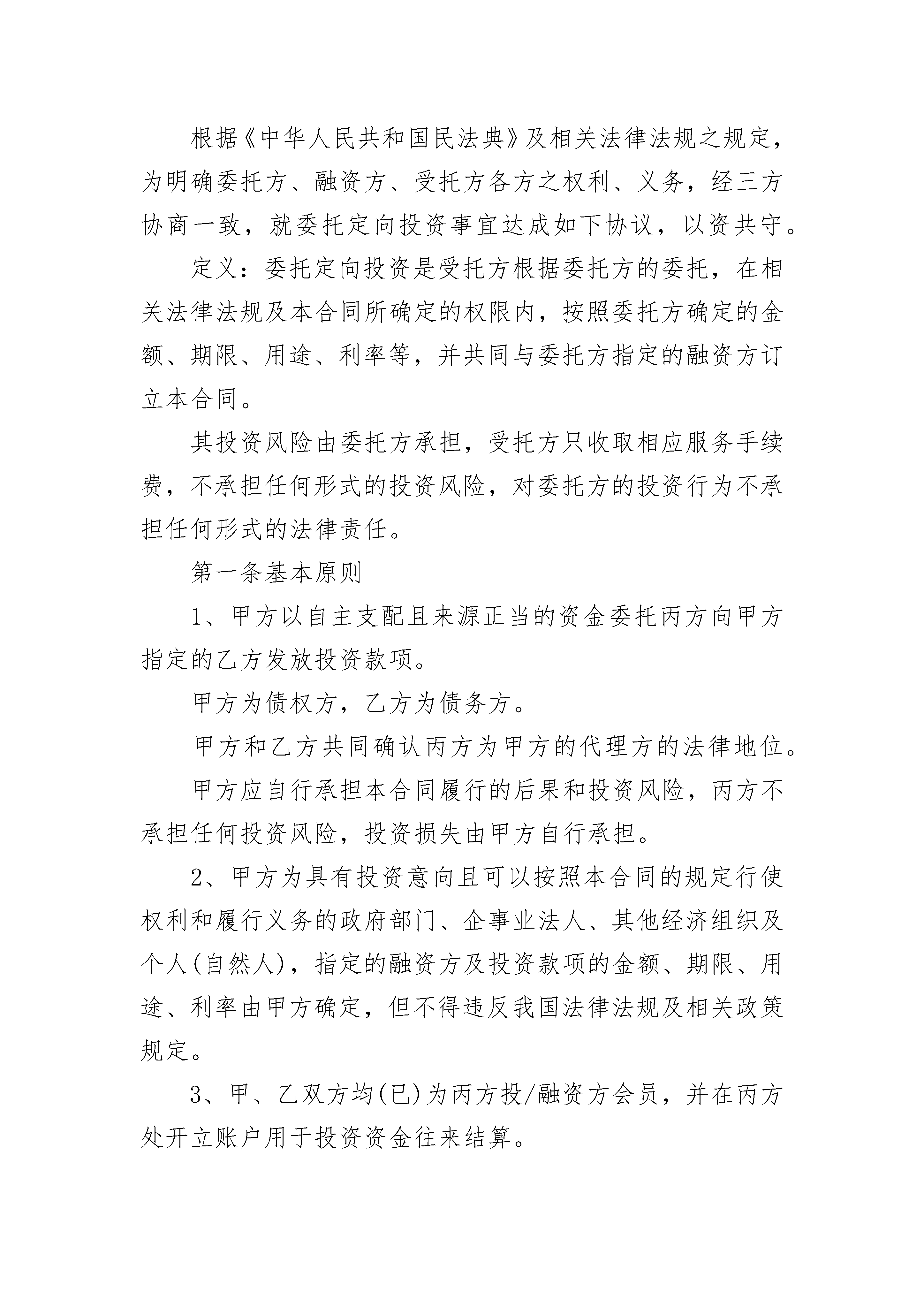 委托定向投资合约书委托定向投资合约书(通用3篇)委托定向投资合约书篇1甲方(委托方):______________法定代表人:_________________会员编号:___________________住所:_______________________联系电话:___________________证件类型及编码:_____________乙方(融资方):______________法定代表人:_________________会员编号:___________________住所:_______________________联系电话:___________________证件类型及编码:_____________丙方(受托方):____________公司(_____________平台)法定代表人:_________________住所:_______________________联系电话:___________________统一社会信用代码:___________委托方为有效地运用其自有资金,自愿将其自有资金委托受托方按照本合同的条款和条件向委托方指定的融资方发放投资款项。根据《中华人民共和国民法典》及相关法律法规之规定,为明确委托方、融资方、受托方各方之权利、义务,经三方协商一致,就委托定向投资事宜达成如下协议,以资共守。定义:委托定向投资是受托方根据委托方的委托,在相关法律法规及本合同所确定的权限内,按照委托方确定的金额、期限、用途、利率等,并共同与委托方指定的融资方订立本合同。其投资风险由委托方承担,受托方只收取相应服务手续费,不承担任何形式的投资风险,对委托方的投资行为不承担任何形式的法律责任。第一条基本原则1、甲方以自主支配且来源正当的资金委托丙方向甲方指定的乙方发放投资款项。甲方为债权方,乙方为债务方。甲方和乙方共同确认丙方为甲方的代理方的法律地位。甲方应自行承担本合同履行的后果和投资风险,丙方不承担任何投资风险,投资损失由甲方自行承担。2、甲方为具有投资意向且可以按照本合同的规定行使权利和履行义务的政府部门、企事业法人、其他经济组织及个人(自然人),指定的融资方及投资款项的金额、期限、用途、利率由甲方确定,但不得违反我国法律法规及相关政策规定。3、甲、乙双方均(已)为丙方投/融资方会员,并在丙方处开立账户用于投资资金往来结算。第二条投资内容甲、乙双方就投资内容约定如下:1、投资项目明细:(甲方指定的项目)。2、投资用途:。3、投资金额:人民币(大写)(¥元)。4、投资收益:(1)本合同项下的投资收益利率由甲、乙双方约定按年利率%执行。(2)本合同项下投资收益为人民币(大写)(¥元)。(3)投资收益利率换算公式为:计息公式为:日利率=年利率/360,月利率=年利率/12,计息公式为:收益=本金*实际天数*日利率。5、放款及资金存入:甲方应不迟于年月日一次性将委托资金支付至本合同甲方在丙方处开立的下述指定账户:开户行:。账户名:。账号:。本合同签订后,甲方授权丙方,可将甲方账户中资金划入乙方指定账户。甲方对划款有特殊要求的,应以书面形式向丙方提出。乙方的指定账户如下:开户行:。账户名:。账号:。6、还款方式:乙方同意并不撤销的授权丙方直接从乙方在丙方处开立的账户中为甲方扣收款项。7、投资之收益和本金的兑付投资之收益和本金兑付方式为第种;(1)投资期限届满后,由乙方一次性兑付收益和本金。(2)在投资期限内,乙方按月支付本合同约定的收益。在投资期限届满后,乙方一次性支付投资本金。(3)在投资期限内,乙方按月支付收益款项:人民币(大写)(¥元)(投资本金+投资本金*收益率/投资期限)。8、投资期限本合同约定的投资期限自年月日起至年月日止。具体投资期限以丙方交易平台记载信息为准。9、乙方未满足下列任一条件的,甲方有权拒绝乙方的提款申请,丙方作为代理方,按照甲方的指示,拒绝乙方的提款申请。如甲方决定不发放投资,甲方及丙方无需承担由此给乙方造成的任何损失。(1)乙方已按丙方的要求在丙方处开立会员账户;乙方已书面申请丙方发放投资款项并按甲方要求提供财务报表等文件和资料以及乙方在其他金融机构开户运作的有关信息。(2)乙方已办妥相关政府许可、批准、登记等法定手续及丙方要求办理的其他手续,且前述有关手续持续有效。若甲方要求,乙方应向甲方提交办妥上述手续所取得的证件及文件。(3)本合同及本合同项下的担保合同已生效并持续有效,并且相应的担保物权已经设立并持续有效。若甲方要求办妥抵押物和/或质物保险等手续的,相关手续已按甲方要求办妥,且甲方(或丙方)已获得相关担保文件原件。(4)甲方要求办理公证手续的,已经办理完成公证;若甲方要求办理具有强制执行效力的公证的,已办妥强制执行公证手续。(5)乙方未违反本合同约定或者甲方预期