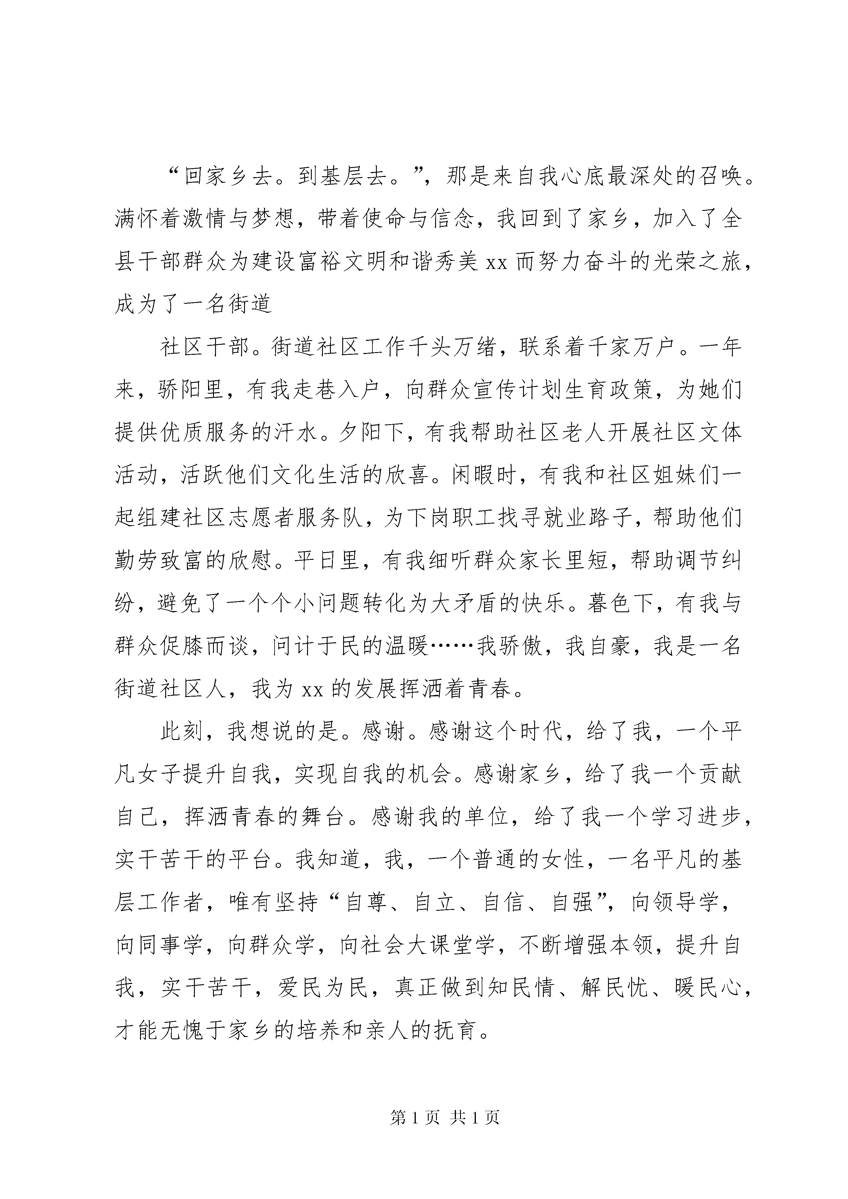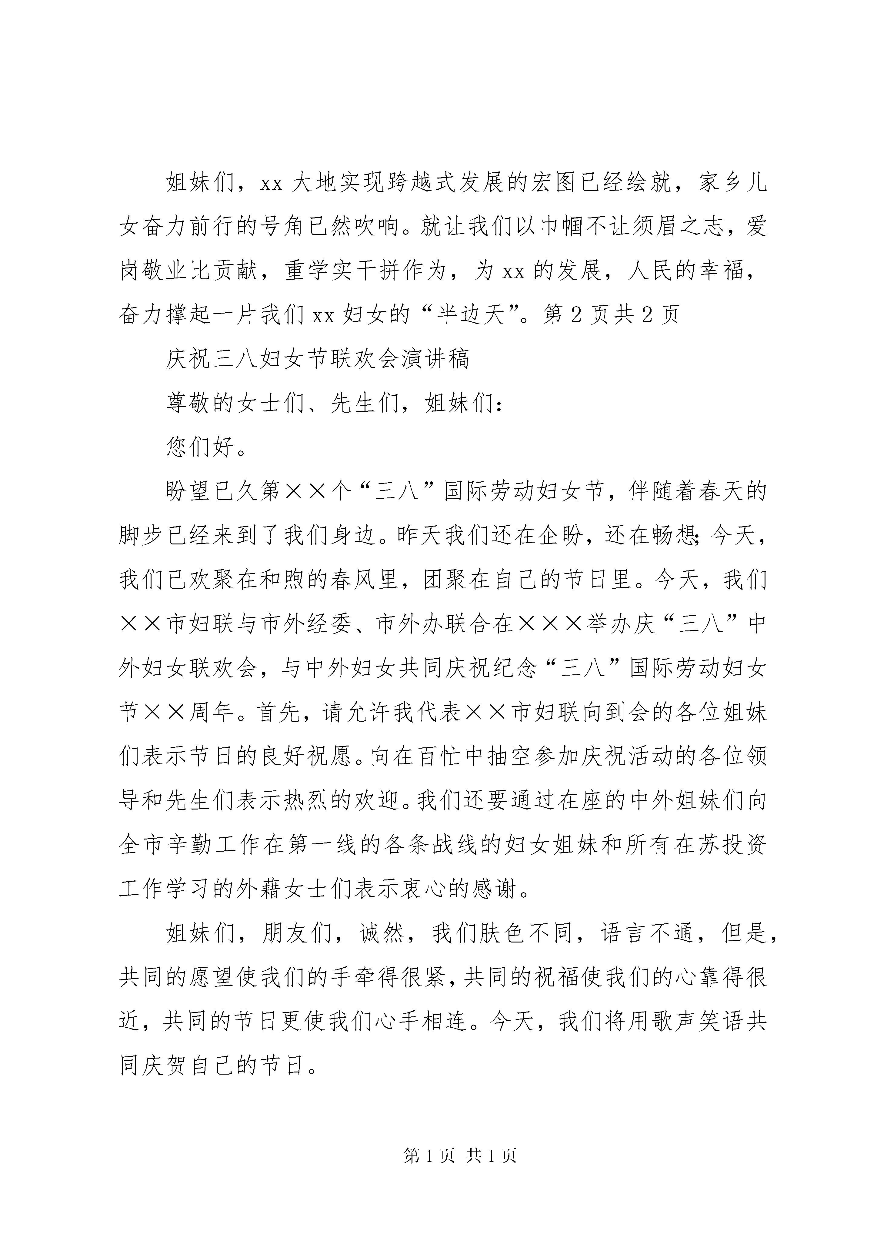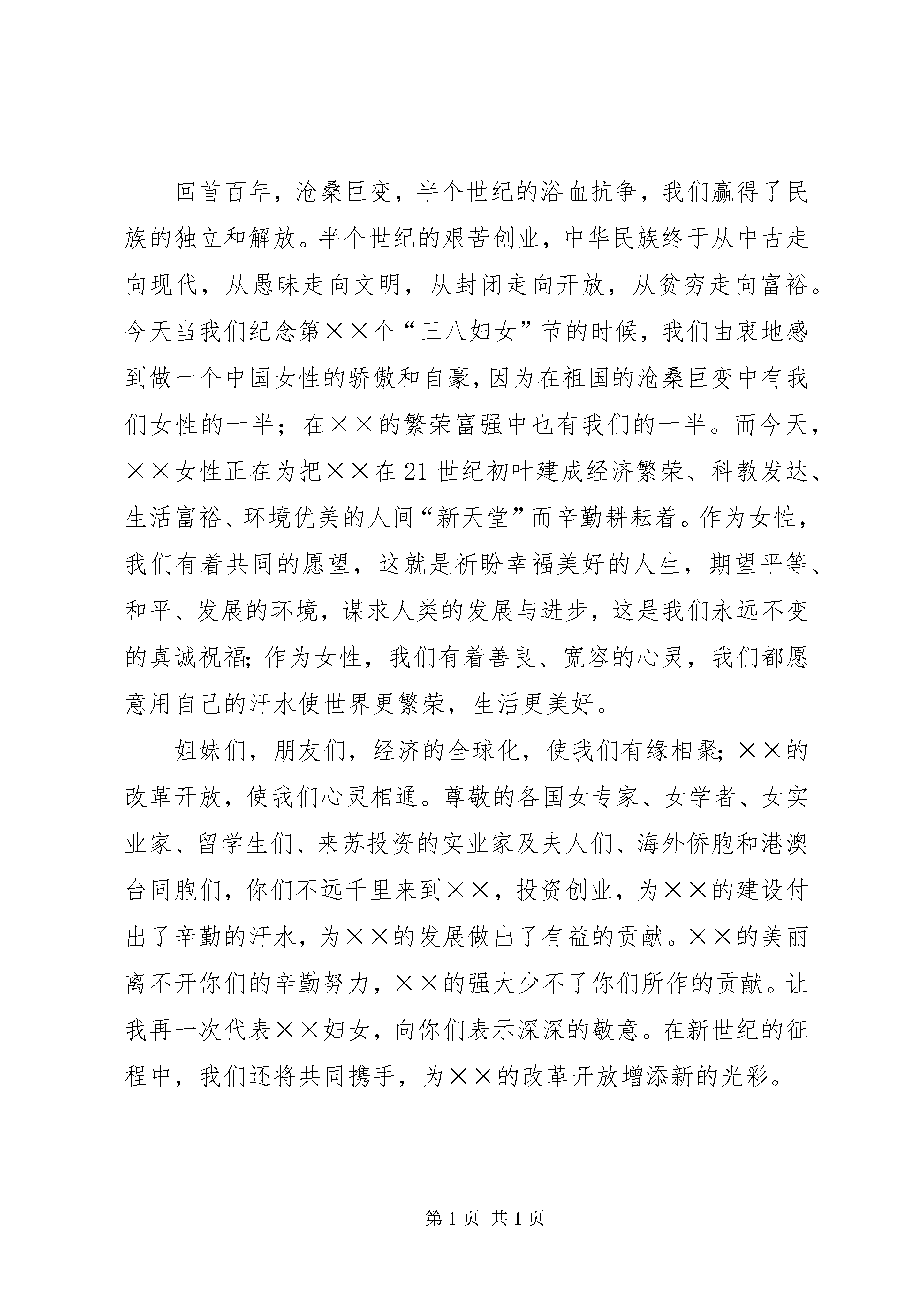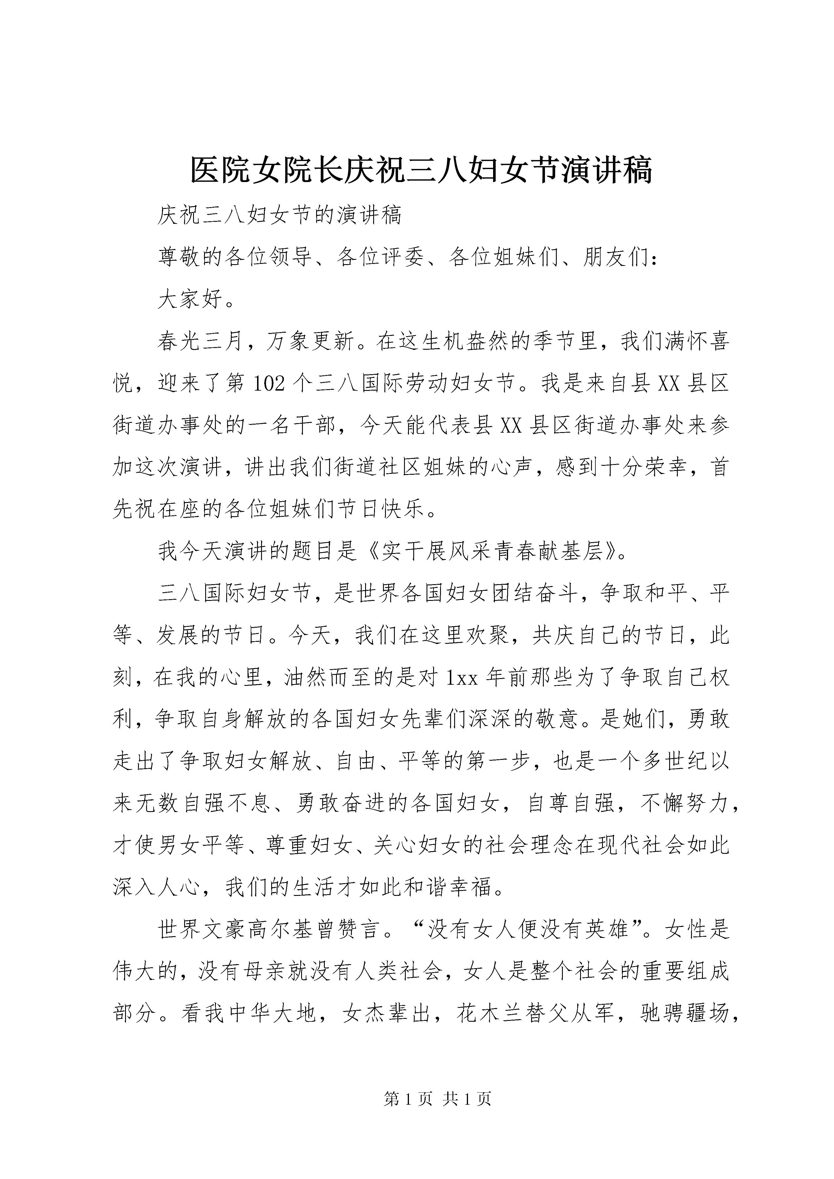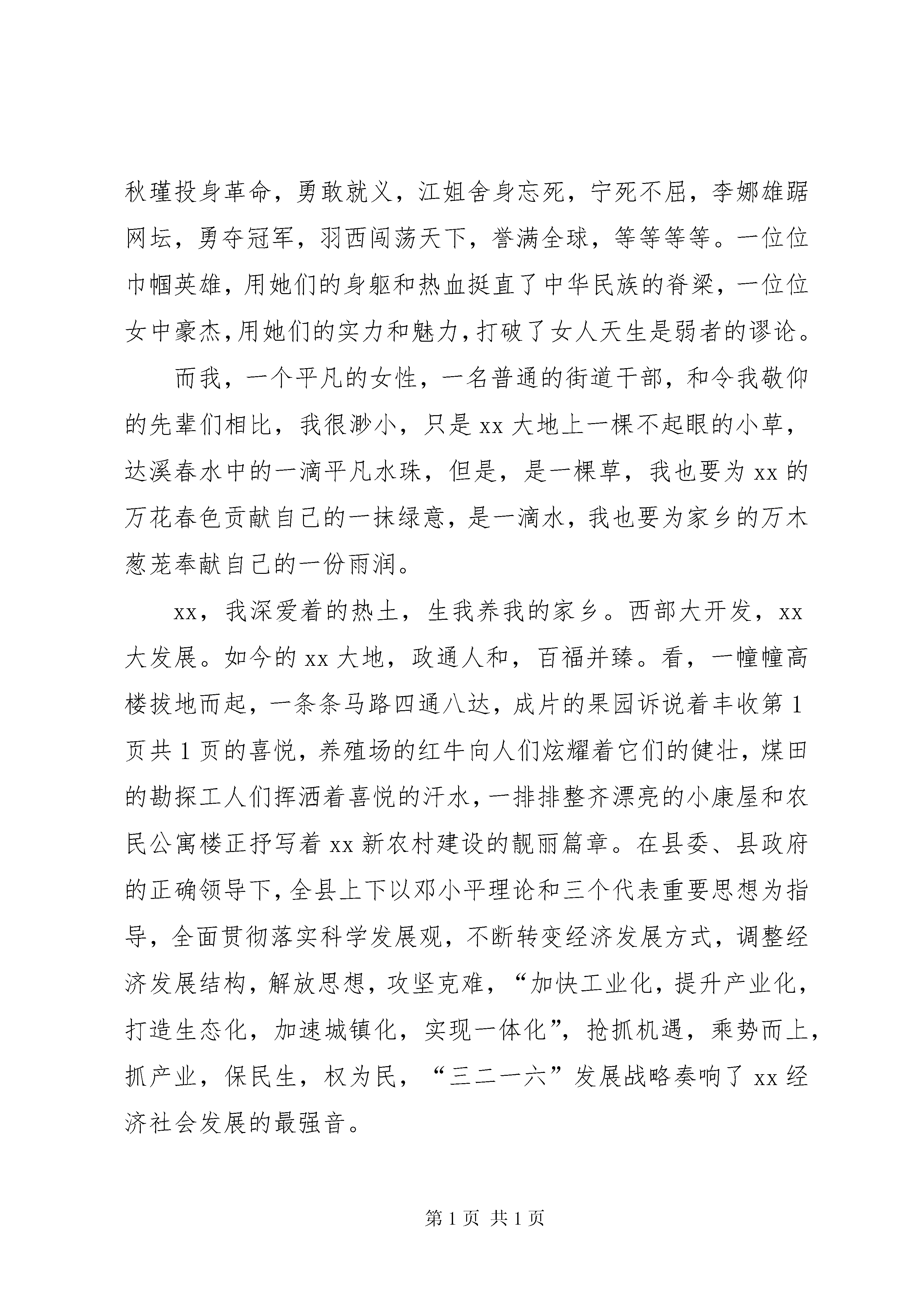 医院女院长庆祝三八妇女节演讲稿庆祝三八妇女节的演讲稿尊敬的各位领导、各位评委、各位姐妹们、朋友们:大家好。春光三月,万象更新。在这生机盎然的季节里,我们满怀喜悦,迎来了第102个三八国际劳动妇女节。我是来自县XX县区街道办事处的一名干部,今天能代表县XX县区街道办事处来参加这次演讲,讲出我们街道社区姐妹的心声,感到十分荣幸,首先祝在座的各位姐妹们节日快乐。我今天演讲的题目是《实干展风采青春献基层》。三八国际妇女节,是世界各国妇女团结奋斗,争取和平、平等、发展的节日。今天,我们在这里欢聚,共庆自己的节日,此刻,在我的心里,油然而至的是对1xx年前那些为了争取自己权利,争取自身解放的各国妇女先辈们深深的敬意。是她们,勇敢走出了争取妇女解放、自由、平等的第一步,也是一个多世纪以来无数自强不息、勇敢奋进的各国妇女,自尊自强,不懈努力,才使男女平等、尊重妇女、关心妇女的社会理念在现代社会如此深入人心,我们的生活才如此和谐幸福。世界文豪高尔基曾赞言。“没有女人便没有英雄”。女性是伟大的,没有母亲就没有人类社会,女人是整个社会的重要组成部分。看我中华大地,女杰辈出,花木兰替父从军,驰骋疆场,秋瑾投身革命,勇敢就义,江姐舍身忘死,宁死不屈,李娜雄踞网坛,勇夺冠军,羽西闯荡天下,誉满全球,等等等等。一位位巾帼英雄,用她们的身躯和热血挺直了中华民族的脊梁,一位位女中豪杰,用她们的实力和魅力,打破了女人天生是弱者的谬论。而我,一个平凡的女性,一名普通的街道干部,和令我敬仰的先辈们相比,我很渺小,只是xx大地上一棵不起眼的小草,达溪春水中的一滴平凡水珠,但是,是一棵草,我也要为xx的万花春色贡献自己的一抹绿意,是一滴水,我也要为家乡的万木葱茏奉献自己的一份雨润。xx,我深爱着的热土,生我养我的家乡。西部大开发,xx大发展。如今的xx大地,政通人和,百福并臻。看,一幢幢高楼拔地而起,一条条马路四通八达,成片的果园诉说着丰收的喜悦,养殖场的红牛向人们炫耀着它们的健壮,煤田的勘探工人们挥洒着喜悦的汗水,一排排整齐漂亮的小康屋和农民公寓楼正抒写着xx新农村建设的靓丽篇章。在县委、县政府的正确领导下,全县上下以邓小平理论和三个代表重要思想为指导,全面贯彻落实科学发展观,不断转变经济发展方式,调整经济发展结构,解放思想,攻坚克难,“加快工业化,提升产业化,打造生态化,加速城镇化,实现一体化”,抢抓机遇,乘势而上,抓产业,保民生,权为民,“三二一六”发展战略奏响了xx经济社会发展的最强音。“回家乡去。到基层去。”,那是来自我心底最深处的召唤。满怀着激情与梦想,带着使命与信念,我回到了家乡,加入了全县干部群众为建设富裕文明和谐秀美xx而努力奋斗的光荣之旅,成为了一名街道社区干部。街道社区工作千头万绪,联系着千家万户。一年来,骄阳里,有我走巷入户,向群众宣传计划生育政策,为她们提供优质服务的汗水。夕阳下,有我帮助社区老人开展社区文体活动,活跃他们文化生活的欣喜。闲暇时,有我和社区姐妹们一起组建社区志愿者服务队,为下岗职工找寻就业路子,帮助他们勤劳致富的欣慰。平日里,有我细听群众家长里短,帮助调节纠纷,避免了一个个小问题转化为大矛盾的快乐。暮色下,有我与群众促膝而谈,问计于民的温暖……我骄傲,我自豪,我是一名街道社区人,我为xx的发展挥洒着青春。此刻,我想说的是。感谢。感谢这个时代,给了我,一个平凡女子提升自我,实现自我的机会。感谢家乡,给了我一个贡献自己,挥洒青春的舞台。感谢我的单位,给了我一个学习进步,实干苦干的平台。我知道,我,一个普通的女性,一名平凡的基层工作者,唯有坚持“自尊、自立、自信、自强”,向领导学,向同事学,向群众学,向社会大课堂学,不断增强本领,提升自我,实干苦干,爱民为民,真正做到知民情、解民忧、暖民心,才能无愧于家乡的培养和亲人的抚育。姐妹们,xx大地实现跨越式发展的宏图已经绘就,家乡儿女奋力前行的号角已然吹响。就让我们以巾帼不让须眉之志,爱岗敬业比贡献,重学实干拼作为,为xx的发展,人民的幸福,奋力撑起一片我们xx妇女的“半边天”。庆祝三八妇女节联欢会演讲稿尊敬的女士们、先生们,姐妹们:您们好。盼望已久第××个“三八”国际劳动妇女节,伴随着春天的脚步已经来到了我们身边。昨天我们还在企盼,还在畅想;今天,我们已欢聚在和煦的春风里,团聚在自己的节日里。今天,我们××市妇联与市外经委、市外办联合在×××举办庆“三八”中外妇女联欢会,与中外妇女共同庆祝纪念“三八”国际劳动妇女节××周年。首先,请允许我代表××市妇联向到会的各位姐妹们表示节日的良好祝愿。向在百忙中抽空参加庆祝活动的各位领导和先生们表示热烈的欢迎。我们还要通过在座的中外姐妹们向全市辛勤工作在第一线的各条战线的妇女姐妹和所有在苏投资工作学习的