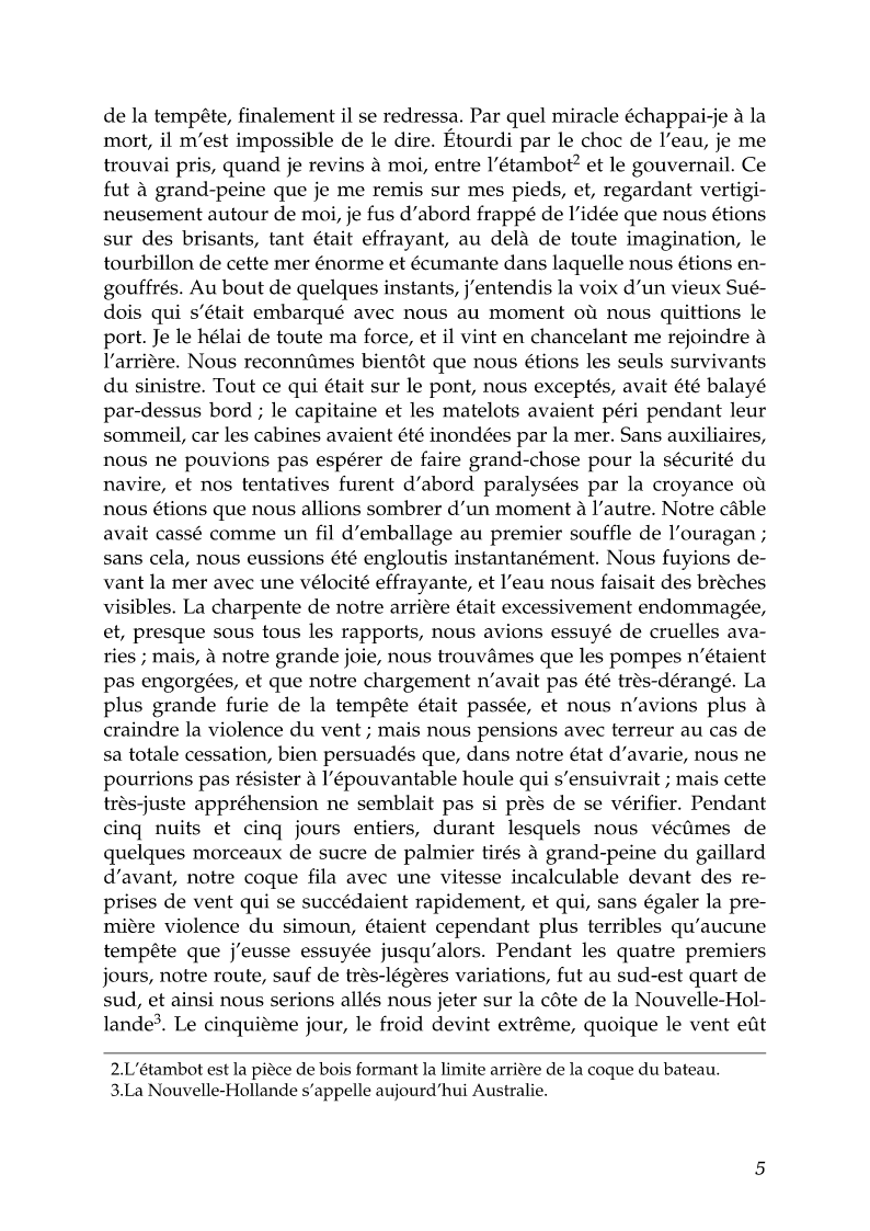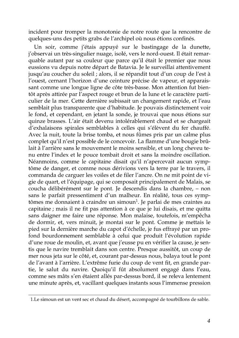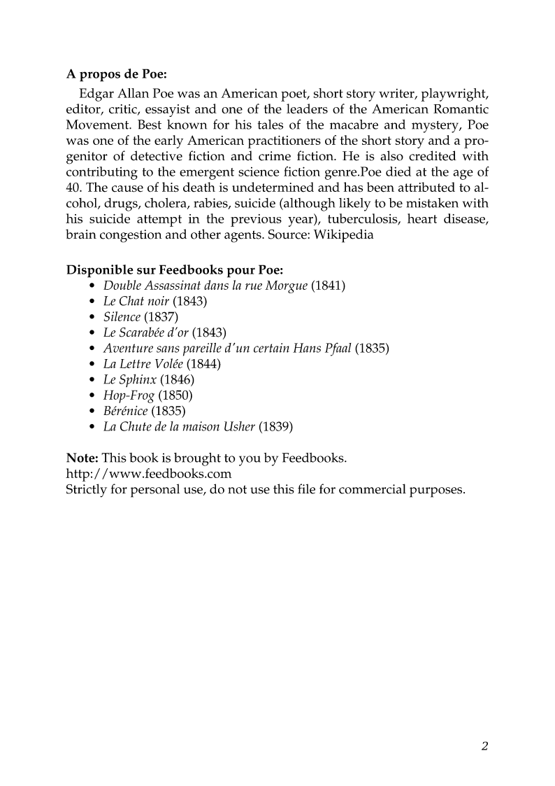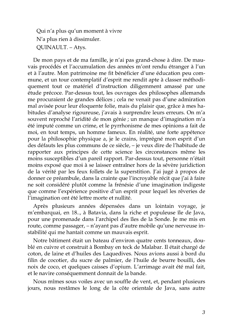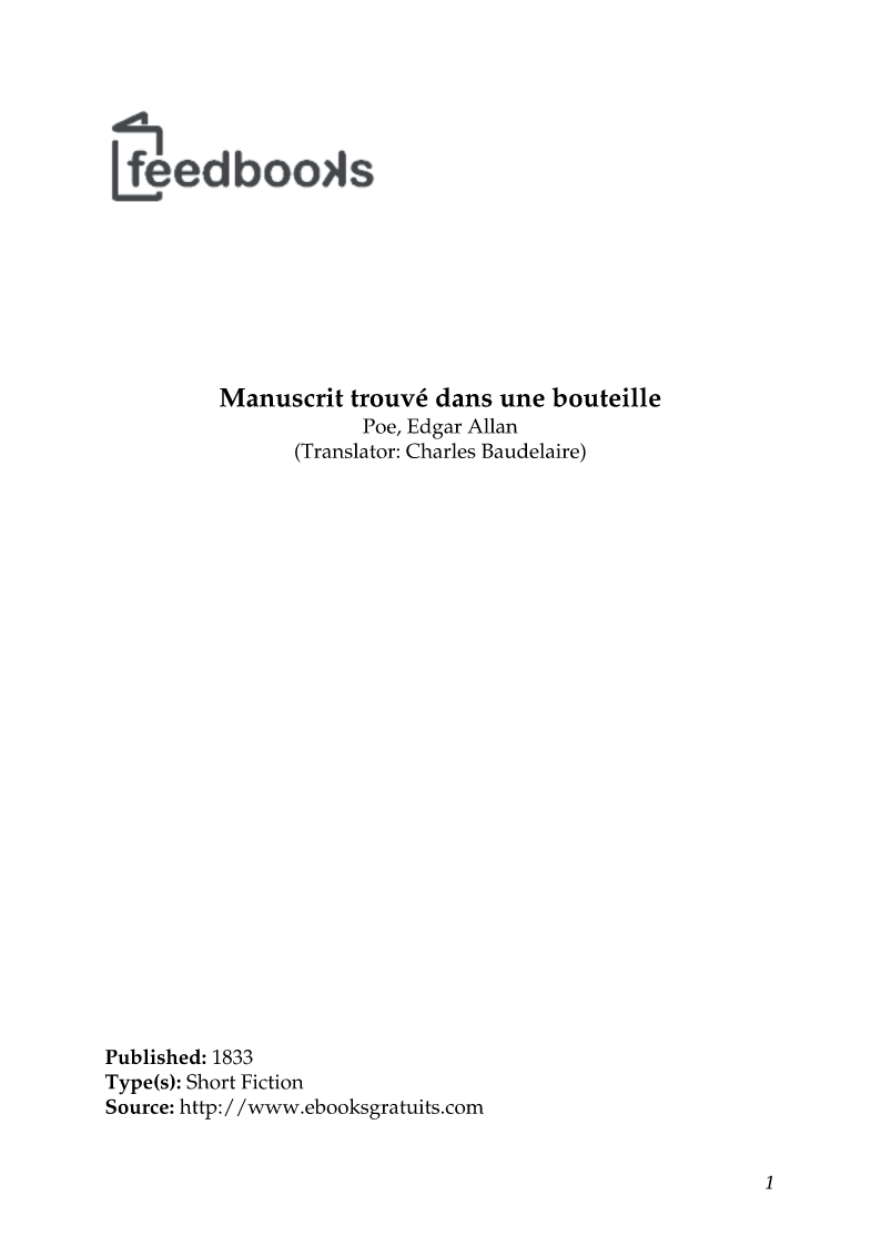 Manuscrittrouvédansunebouteille Poe,EdgarAllan (Translator:CharlesBaudelaire) Published:1833 Type(s):ShortFiction Source:http://www.ebooksgratuits.com 1 AproposdePoe: EdgarAllanPoewasanAmericanpoet,shortstorywriter,playwright, editor,critic,essayistandoneoftheleadersoftheAmericanRomantic Movement.Bestknownforhistalesofthemacabreandmystery,Poe wasoneoftheearlyAmericanpractitionersoftheshortstoryandapro- genitorofdetectivefictionandcrimefiction.Heisalsocreditedwith contributingtotheemergentsciencefictiongenre.Poediedattheageof 40.Thecauseofhisdeathisundeterminedandhasbeenattributedtoal- cohol,drugs,cholera,rabies,suicide(althoughlikelytobemistakenwith hissuicideattemptinthepreviousyear),tuberculosis,heartdisease, braincongestionandotheragents.Source:Wikipedia DisponiblesurFeedbookspourPoe: •DoubleAssassinatdanslarueMorgue(1841) •LeChatnoir(1843) •Silence(1837) •LeScarabéed’or(1843) •Aventuresanspareilled'uncertainHansPfaal(1835) •LaLettreVolée(1844) •LeSphinx(1846) •Hop-Frog(1850) •Bérénice(1835) •LaChutedelamaisonUsher(1839) Note:ThisbookisbroughttoyoubyFeedbooks. http://www.feedbooks.com Strictlyforpersonaluse,donotusethisfileforcommercialpurposes. 2 Quin’aplusqu’unmomentàvivre N’aplusrienàdissimuler. QUINAULT.–Atys. Demonpaysetdemafamille,jen’aipasgrand-choseàdire.Demau- vaisprocédésetl’accumulationdesannéesm’ontrenduétrangeràl’un etàl’autre.Monpatrimoinemefitbénéficierd’uneéducationpeucom- mune,etuntourcontemplatifd’espritmerenditapteàclasserméthodi- quementtoutcematérield’instructiondiligemmentamasséparune étudeprécoce.Par-dessustout,lesouvragesdesphilosophesallemands meprocuraientdegrandesdélices;celanevenaitpasd’uneadmiration malaviséepourleuréloquentefolie,maisduplaisirque,grâceàmesha- bitudesd’analyserigoureuse,j’avaisàsurprendreleurserreurs.Onm’a souventreprochél’ariditédemongénie;unmanqued’imaginationm’a étéimputécommeuncrime,etlepyrrhonismedemesopinionsafaitde moi,entouttemps,unhommefameux.Enréalité,uneforteappétence pourlaphilosophiephysiquea,j