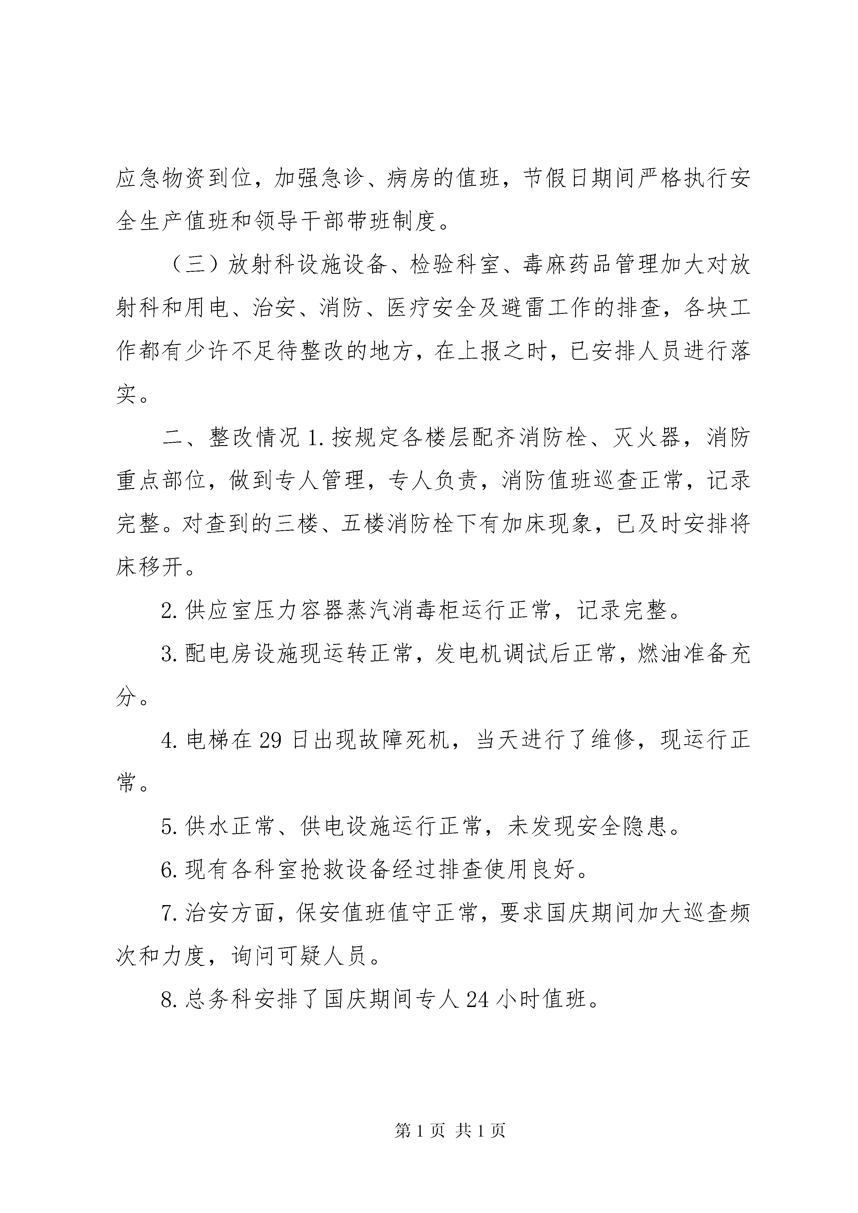 医院安全生产情况汇报医院安全生产大检查情况汇报根据县安委办、县消防大队相关文件精神,为确保国庆期间安全和社会稳定,扎实抓好医院安全生产工作,有效防范和坚决遏制较大事故发生,我院自年月日接到县卫生药监局工作安排,我院领导高度重视,要求各科严格自查,现将自查及整改情况汇报如下:一、自查情况(一)医院后勤、治安保卫和消防安全方面1.组织医院相关人员分楼层、分科室对全院的用水、用电、用火、线路及消防通道、重点防火部门逐个排查。2.对各科室人员进行强化管理和宣传,以加强消防安全工作职责落实,根据“谁主管,谁负责”的原则,使安全生产工作分工明确,落实到个人。3.治安方面,保安人员除正常值班以外,还要求国庆期间加大巡查频次和力度,对可疑人员进行询问。(二)应急人员及药品、车辆方面院领导及时召集各业务科室负责人围绕“以病人为中心”这个主题,组织开展全员医疗质量教育,提高医疗安全意识,节假日期间确保责任到位、措施到位、急救药品到位、急救车辆到位、应急物资到位,加强急诊、病房的值班,节假日期间严格执行安全生产值班和领导干部带班制度。(三)放射科设施设备、检验科室、毒麻药品管理加大对放射科和用电、治安、消防、医疗安全及避雷工作的排查,各块工作都有少许不足待整改的地方,在上报之时,已安排人员进行落实。二、整改情况1.按规定各楼层配齐消防栓、灭火器,消防重点部位,做到专人管理,专人负责,消防值班巡查正常,记录完整。对查到的三楼、五楼消防栓下有加床现象,已及时安排将床移开。2.供应室压力容器蒸汽消毒柜运行正常,记录完整。3.配电房设施现运转正常,发电机调试后正常,燃油准备充分。4.电梯在29日出现故障死机,当天进行了维修,现运行正常。5.供水正常、供电设施运行正常,未发现安全隐患。6.现有各科室抢救设备经过排查使用良好。7.治安方面,保安值班值守正常,要求国庆期间加大巡查频次和力度,询问可疑人员。8.总务科安排了国庆期间专人24小时值班。