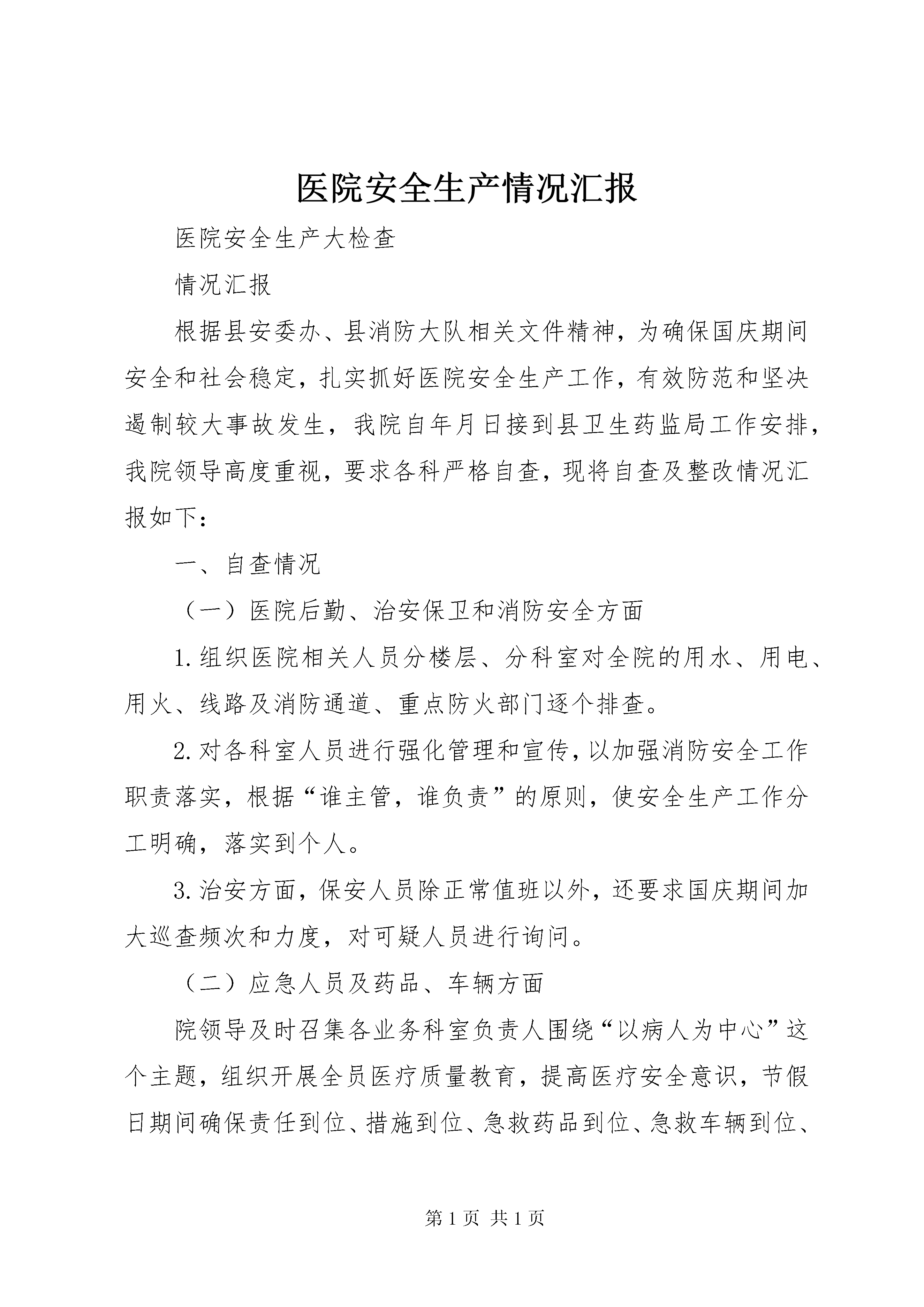 医院安全生产情况汇报医院安全生产大检查情况汇报根据县安委办、县消防大队相关文件精神,为确保国庆期间安全和社会稳定,扎实抓好医院安全生产工作,有效防范和坚决遏制较大事故发生,我院自年月日接到县卫生药监局工作安排,我院领导高度重视,要求各科严格自查,现将自查及整改情况汇报如下:一、自查情况(一)医院后勤、治安保卫和消防安全方面1.组织医院相关人员分楼层、分科室对全院的用水、用电、用火、线路及消防通道、重点防火部门逐个排查。2.对各科室人员进行强化管理和宣传,以加强消防安全工作职责落实,根据“谁主管,谁负责”的原则,使安全生产工作分工明确,落实到个人。3.治安方面,保安人员除正常值班以外,还要求国庆期间加大巡查频次和力度,对可疑人员进行询问。(二)应急人员及药品、车辆方面院领导及时召集各业务科室负责人围绕“以病人为中心”这个主题,组织开展全员医疗质量教育,提高医疗安全意识,节假日期间确保责任到位、措施到位、急救药品到位、急救车辆到位、应急物资到位,加强急诊、病房的值班,节假日期间严格执行安全生产值班和领导干部带班制度。(三)放射科设施设备、检验科室、毒麻药品管理加大对放射科和用电、治安、消防、医疗安全及避雷工作的排查,各块工作都有少许不足待整改的地方,在上报之时,已安排人员进行落实。二、整改情况1.按规定各楼层配齐消防栓、灭火器,消防重点部位,做到专人管理,专人负责,消防值班巡查正常,记录完整。对查到的三楼、五楼消防栓下有加床现象,已及时安排将床移开。2.供应室压力容器蒸汽消毒柜运行正常,记录完整。3.配电房设施现运转正常,发电机调试后正常,燃油准备充分。4.电梯在29日出现故障死机,当天进行了维修,现运行正常。5.供水正常、供电设施运行正常,未发现安全隐患。6.现有各科室抢救设备经过排查使用良好。7.治安方面,保安值班值守正常,要求国庆期间加大巡查频次和力度,询问可疑人员。8.总务科安排了国庆期间专人24小时值班。