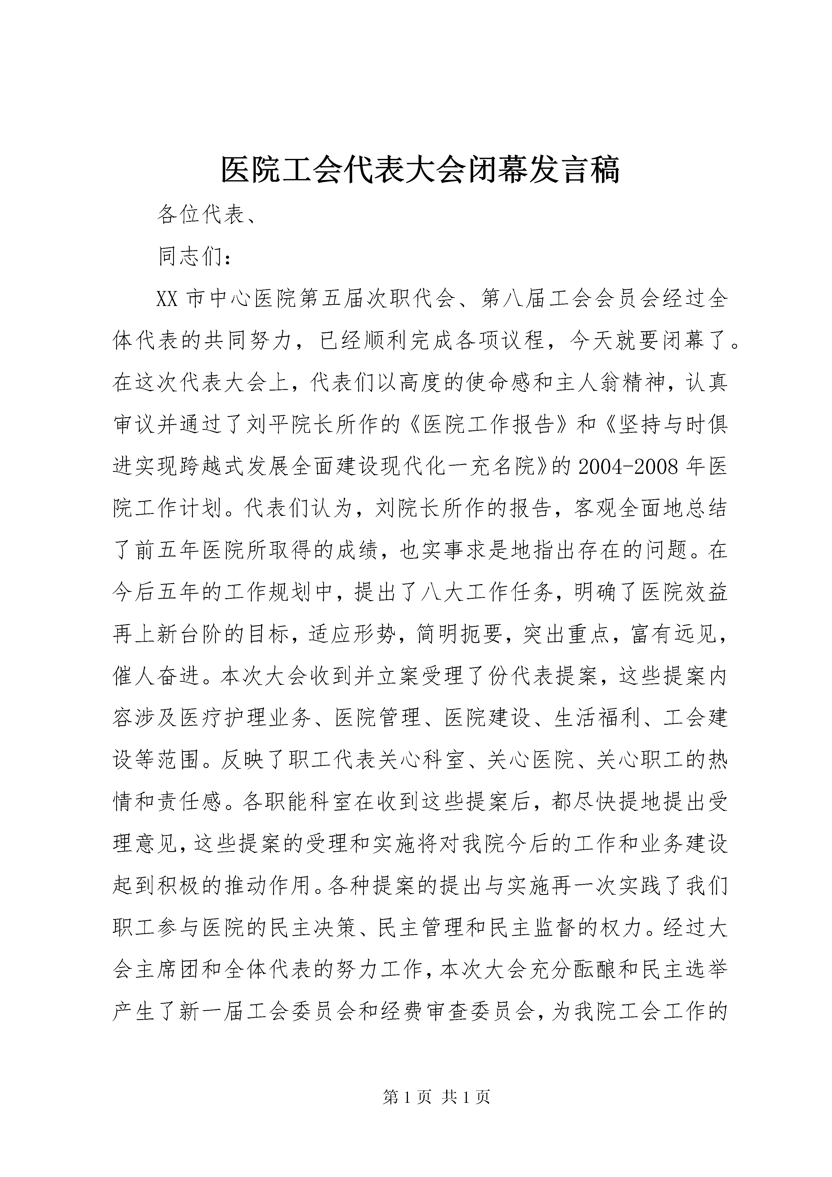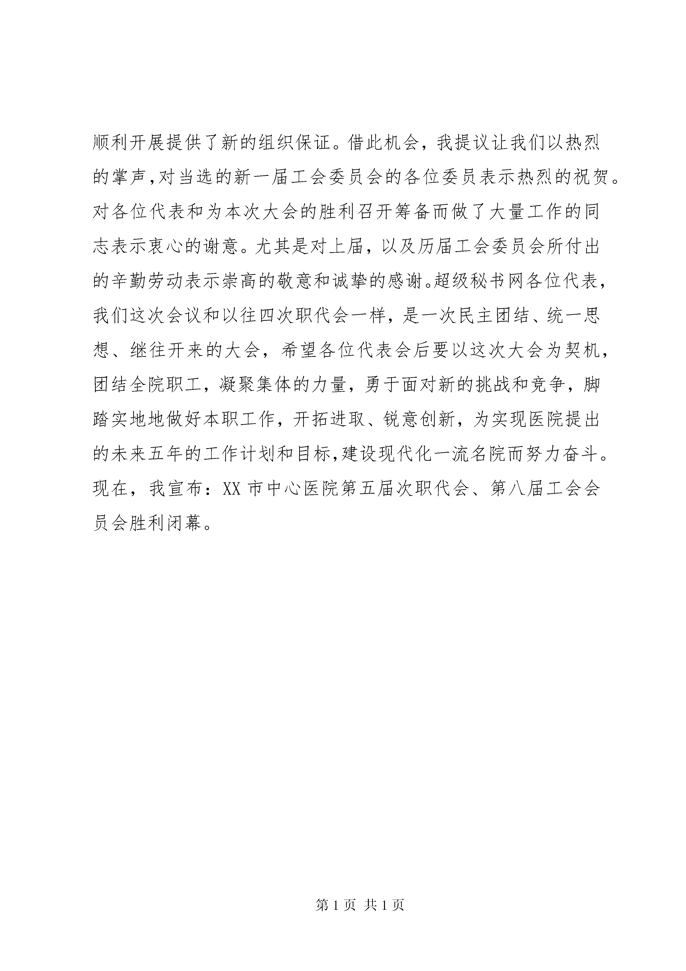 医院工会代表大会闭幕发言稿各位代表、同志们:XX市中心医院第五届次职代会、第八届工会会员会经过全体代表的共同努力,已经顺利完成各项议程,今天就要闭幕了。在这次代表大会上,代表们以高度的使命感和主人翁精神,认真审议并通过了刘平院长所作的《医院工作报告》和《坚持与时俱进实现跨越式发展全面建设现代化一充名院》的2004-2008年医院工作计划。代表们认为,刘院长所作的报告,客观全面地总结了前五年医院所取得的成绩,也实事求是地指出存在的问题。在今后五年的工作规划中,提出了八大工作任务,明确了医院效益再上新台阶的目标,适应形势,简明扼要,突出重点,富有远见,催人奋进。本次大会收到并立案受理了份代表提案,这些提案内容涉及医疗护理业务、医院管理、医院建设、生活福利、工会建设等范围。反映了职工代表关心科室、关心医院、关心职工的热情和责任感。各职能科室在收到这些提案后,都尽快提地提出受理意见,这些提案的受理和实施将对我院今后的工作和业务建设起到积极的推动作用。各种提案的提出与实施再一次实践了我们职工参与医院的民主决策、民主管理和民主监督的权力。经过大会主席团和全体代表的努力工作,本次大会充分酝酿和民主选举产生了新一届工会委员会和经费审查委员会,为我院工会工作的顺利开展提供了新的组织保证。借此机会,我提议让我们以热烈的掌声,对当选的新一届工会委员会的各位委员表示热烈的祝贺。对各位代表和为本次大会的胜利召开筹备而做了大量工作的同志表示衷心的谢意。尤其是对上届,以及历届工会委员会所付出的辛勤劳动表示崇高的敬意和诚挚的感谢。超级秘书网各位代表,我们这次会议和以往四次职代会一样,是一次民主团结、统一思想、继往开来的大会,希望各位代表会后要以这次大会为契机,团结全院职工,凝聚集体的力量,勇于面对新的挑战和竞争,脚踏实地地做好本职工作,开拓进取、锐意创新,为实现医院提出的未来五年的工作计划和目标,建设现代化一流名院而努力奋斗。现在,我宣布:XX市中心医院第五届次职代会、第八届工会会员会胜利闭幕。