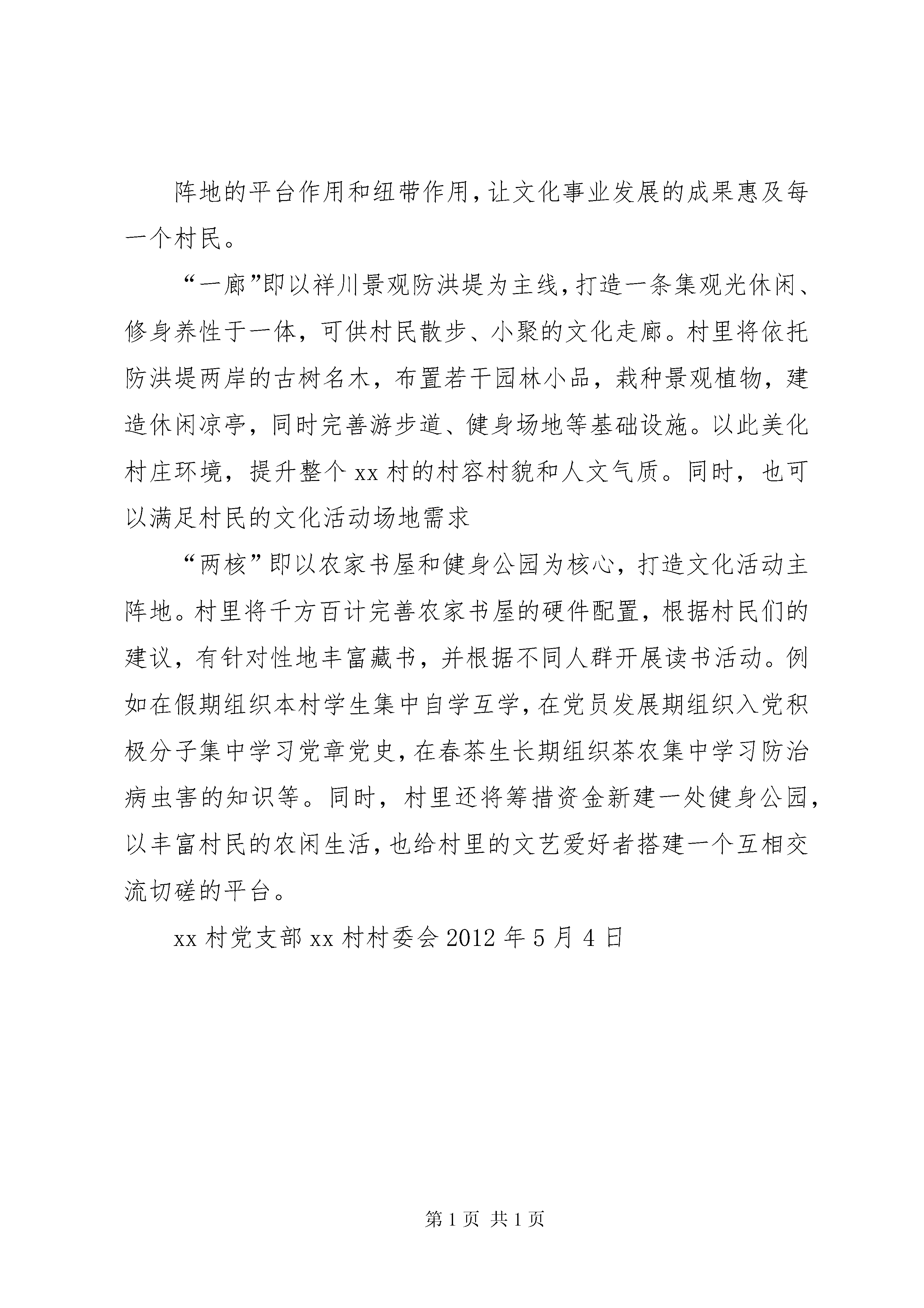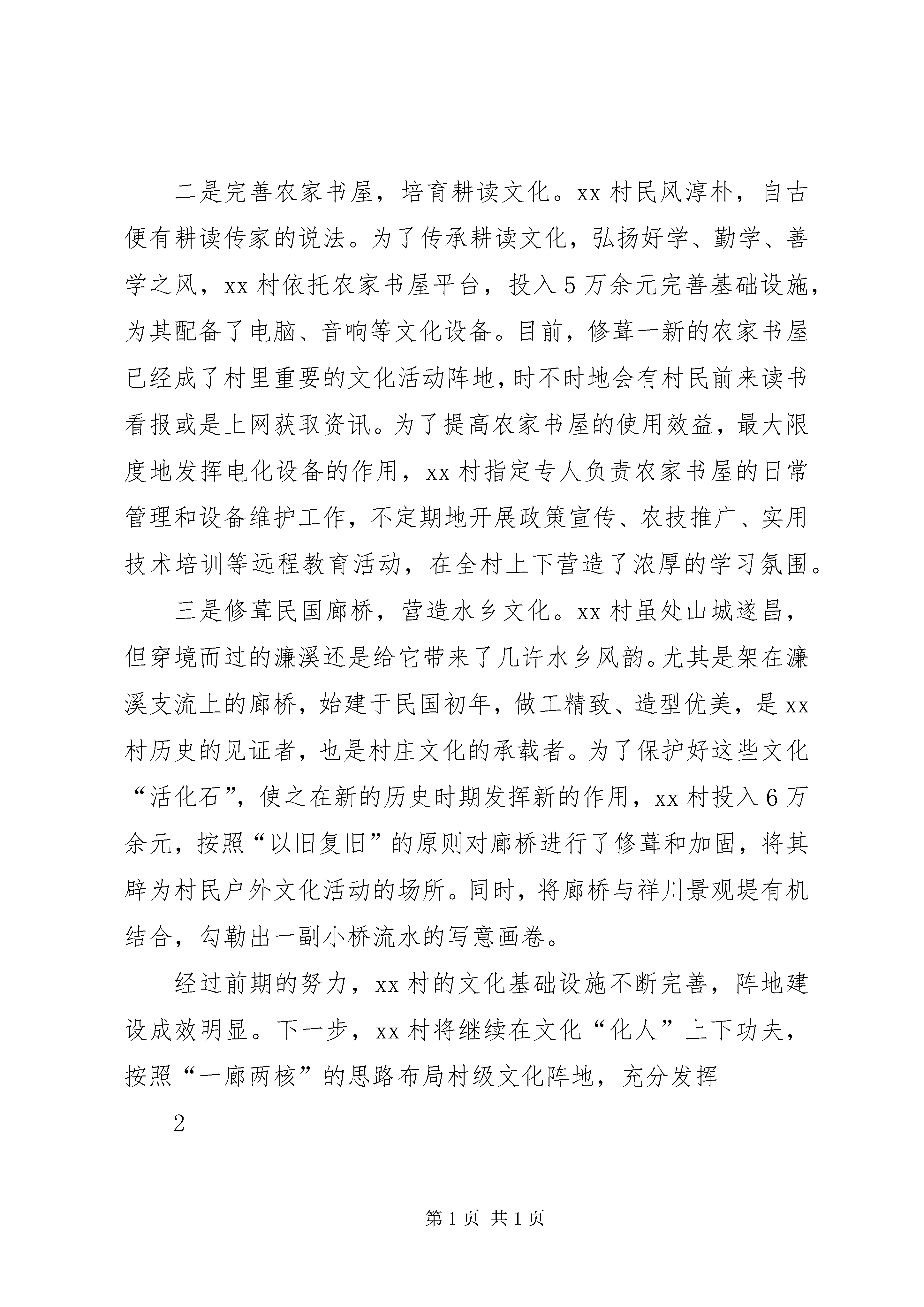 医院宣传阵地建设情况汇报村级文化阵地建设情况汇报xx村位于XX县区东部,xx街道腹地,由原祥川村、柿亨村、墩头村三村合并而成。全村辖32个村民小组,814户,1987人,其中党员82人,拥有耕地2335亩,林地12216亩。村民的收入主要来自茶叶种植和外出务工。2011年实现村集体经济收入14.73万元,人均纯收入达到7197元。在过去的一年中,xx村在各级党委政府的关心关怀和鼎力支持下,抢抓机遇、稳步发展,紧紧围绕县委县政府“经营山水、统筹城乡,全面建设长三角休闲旅游名城”发展战略,以文化化人为核心,以基础设施建设为重点,以项目推进为抓手,不断推进新农村建设和文化阵地建设,进一步提升了xx村的发展水平,在硬件和软件上初步构建起了属于xx人自己的精神家园。一是依托青山绿水,打造生态文化。xx村位于群山环抱之中,层峦叠翠、绿树掩映,又有淙淙濂溪穿境而过,自然环境十分优美。为了充分利用生态优势,培育生态文化,xx村顺势而为,在严格保护林地资源的同时,斥资3万余元疏浚河道、清理河塘,并在溪水中放养石斑鱼2万余尾、田鲤鱼1万余尾。同时,将防洪堤建设景观化,与周边自然风关有机结合,初步形成了“山也清,水也清,人在山荫道上行,春云处处生”的田园景致。1二是完善农家书屋,培育耕读文化。xx村民风淳朴,自古便有耕读传家的说法。为了传承耕读文化,弘扬好学、勤学、善学之风,xx村依托农家书屋平台,投入5万余元完善基础设施,为其配备了电脑、音响等文化设备。目前,修葺一新的农家书屋已经成了村里重要的文化活动阵地,时不时地会有村民前来读书看报或是上网获取资讯。为了提高农家书屋的使用效益,最大限度地发挥电化设备的作用,xx村指定专人负责农家书屋的日常管理和设备维护工作,不定期地开展政策宣传、农技推广、实用技术培训等远程教育活动,在全村上下营造了浓厚的学习氛围。三是修葺民国廊桥,营造水乡文化。xx村虽处山城遂昌,但穿境而过的濂溪还是给它带来了几许水乡风韵。尤其是架在濂溪支流上的廊桥,始建于民国初年,做工精致、造型优美,是xx村历史的见证者,也是村庄文化的承载者。为了保护好这些文化“活化石”,使之在新的历史时期发挥新的作用,xx村投入6万余元,按照“以旧复旧”的原则对廊桥进行了修葺和加固,将其辟为村民户外文化活动的场所。同时,将廊桥与祥川景观堤有机结合,勾勒出一副小桥流水的写意画卷。经过前期的努力,xx村的文化基础设施不断完善,阵地建设成效明显。下一步,xx村将继续在文化“化人”上下功夫,按照“一廊两核”的思路布局村级文化阵地,充分发挥2阵地的平台作用和纽带作用,让文化事业发展的成果惠及每一个村民。“一廊”即以祥川景观防洪堤为主线,打造一条集观光休闲、修身养性于一体,可供村民散步、小聚的文化走廊。村里将依托防洪堤两岸的古树名木,布置若干园林小品,栽种景观植物,建造休闲凉亭,同时完善游步道、健身场地等基础设施。以此美化村庄环境,提升整个xx村的村容村貌和人文气质。同时,也可以满足村民的文化活动场地需求“两核”即以农家书屋和健身公园为核心,打造文化活动主阵地。村里将千方百计完善农家书屋的硬件配置,根据村民们的建议,有针对性地丰富藏书,并根据不同人群开展读书活动。例如在假期组织本村学生集中自学互学,在党员发展期组织入党积极分子集中学习党章党史,在春茶生长期组织茶农集中学习防治病虫害的知识等。同时,村里还将筹措资金新建一处健身公园,以丰富村民的农闲生活,也给村里的文艺爱好者搭建一个互相交流切磋的平台。xx村党支部xx村村委会2012年5月4日