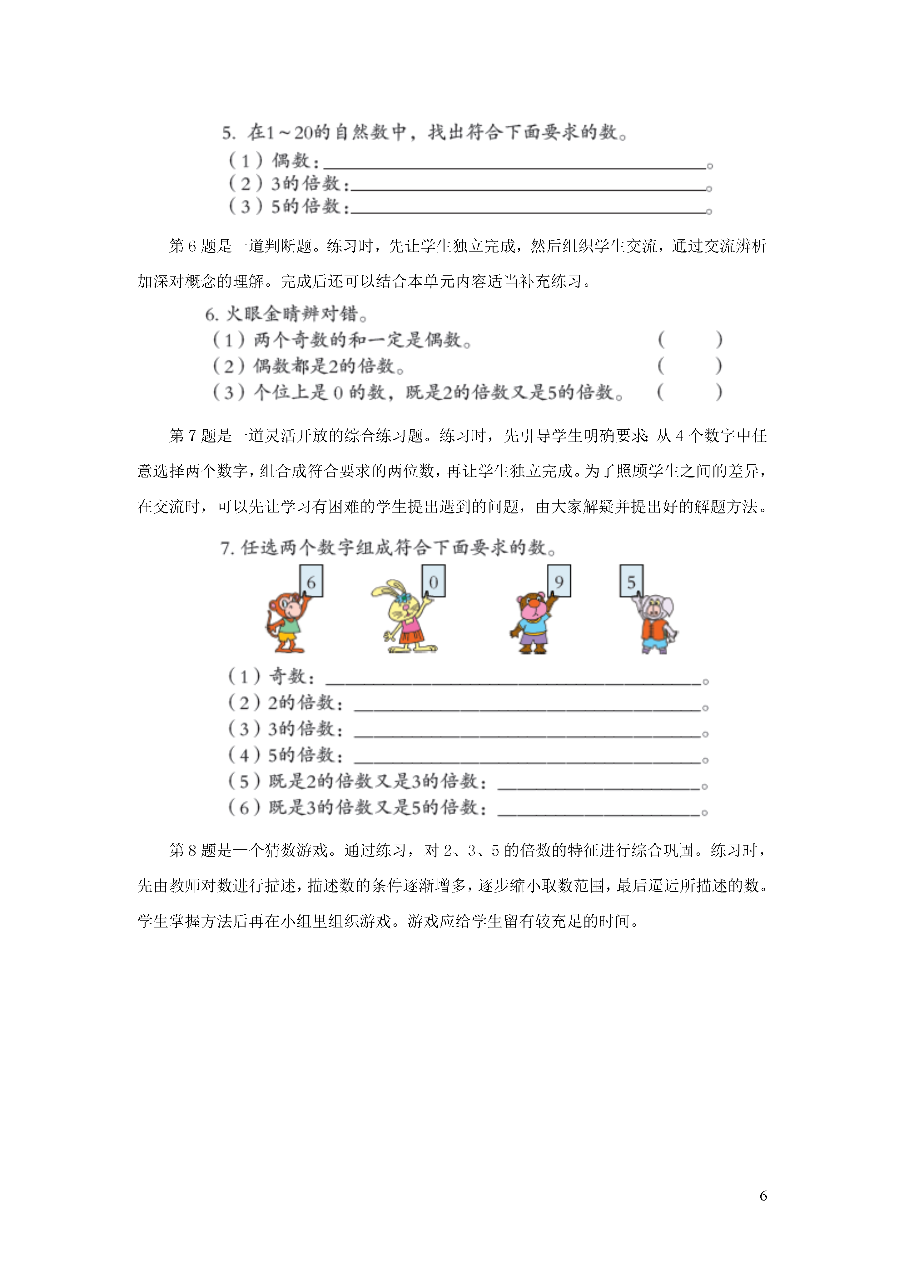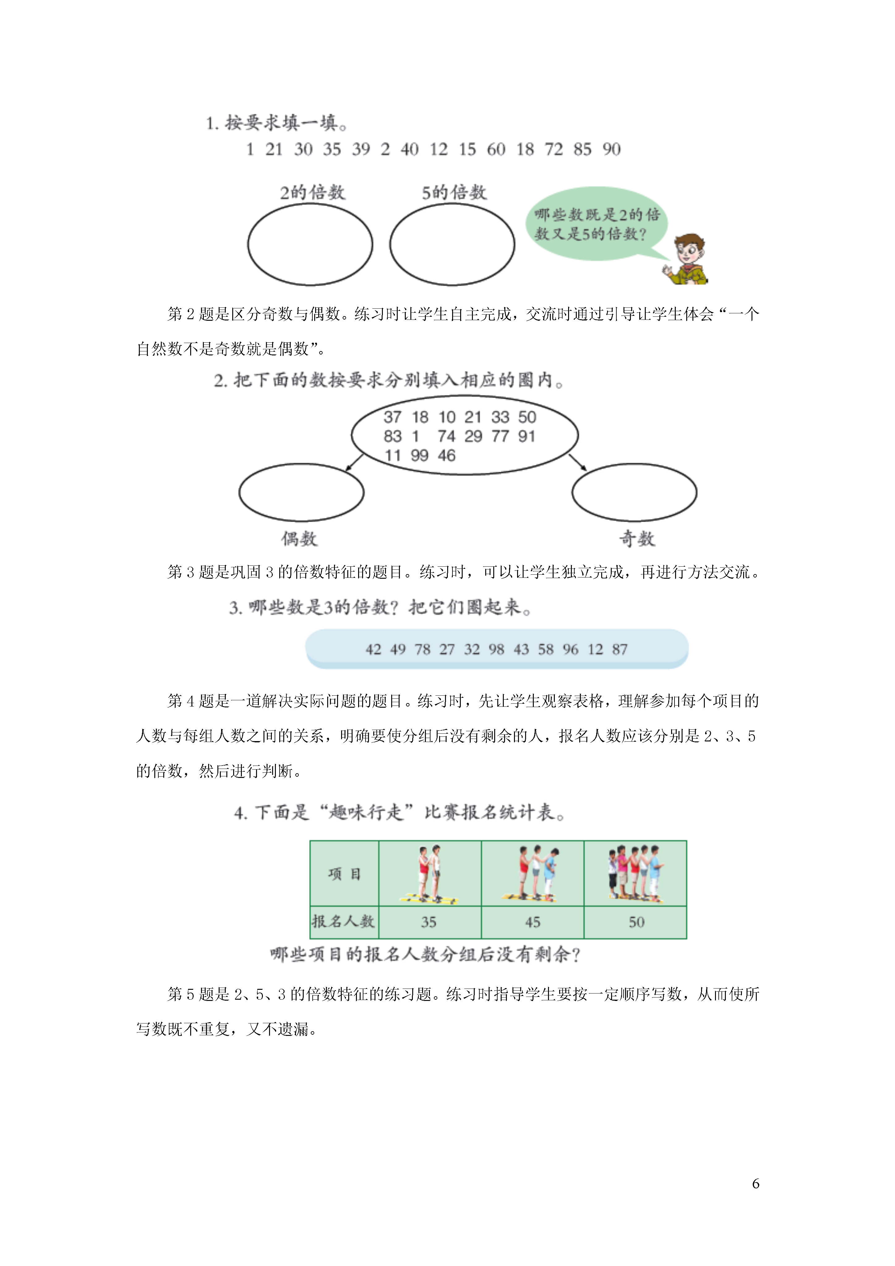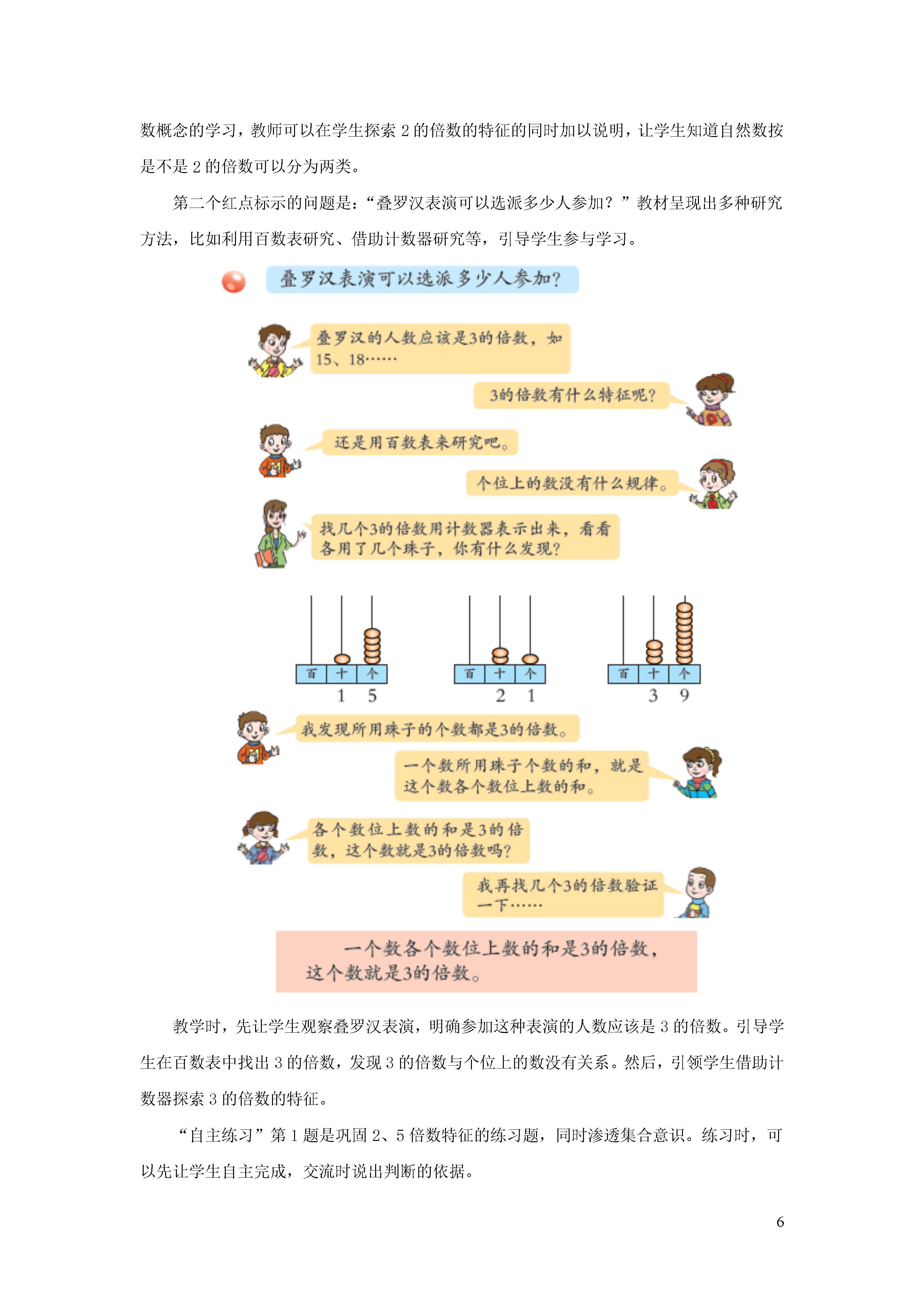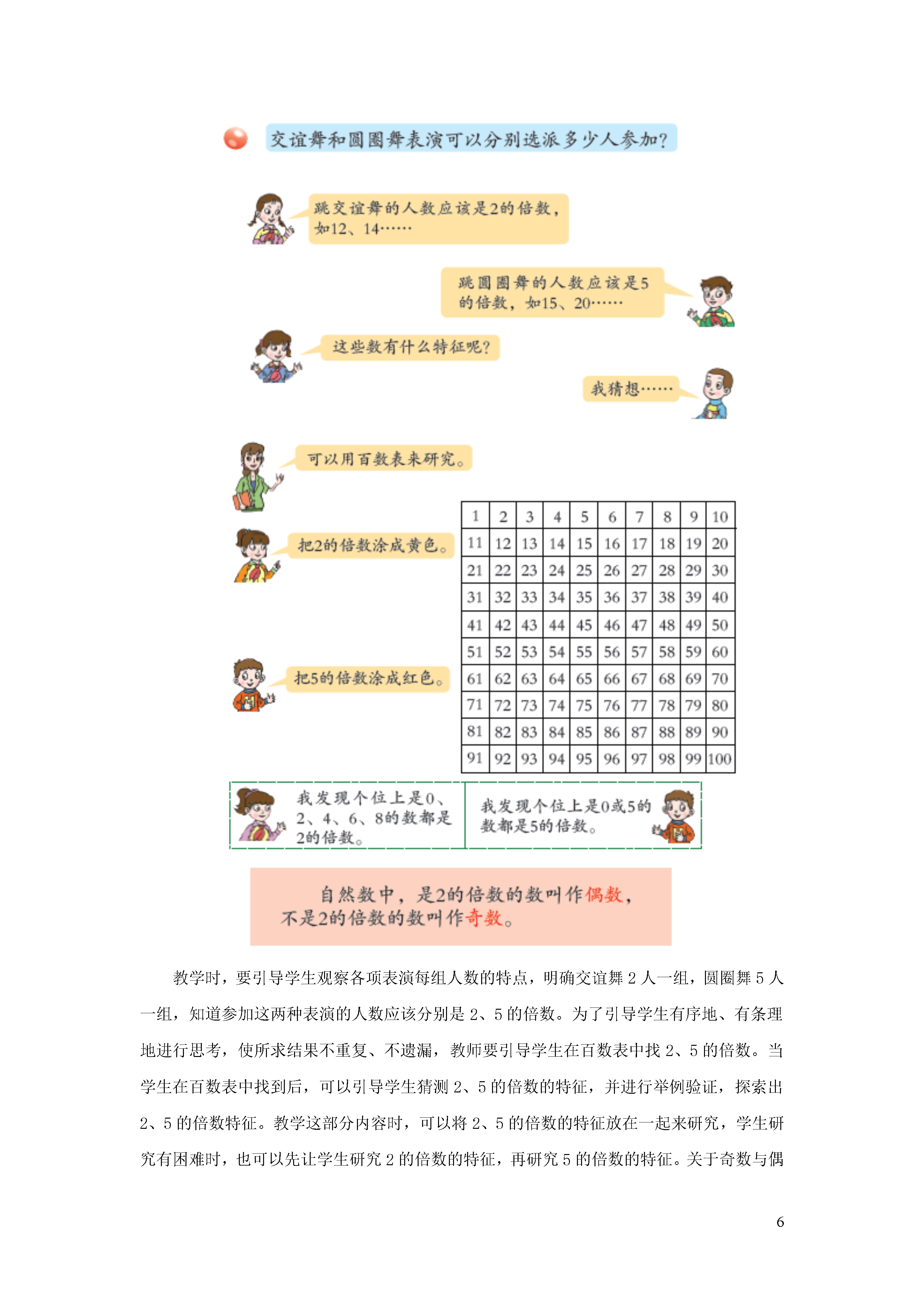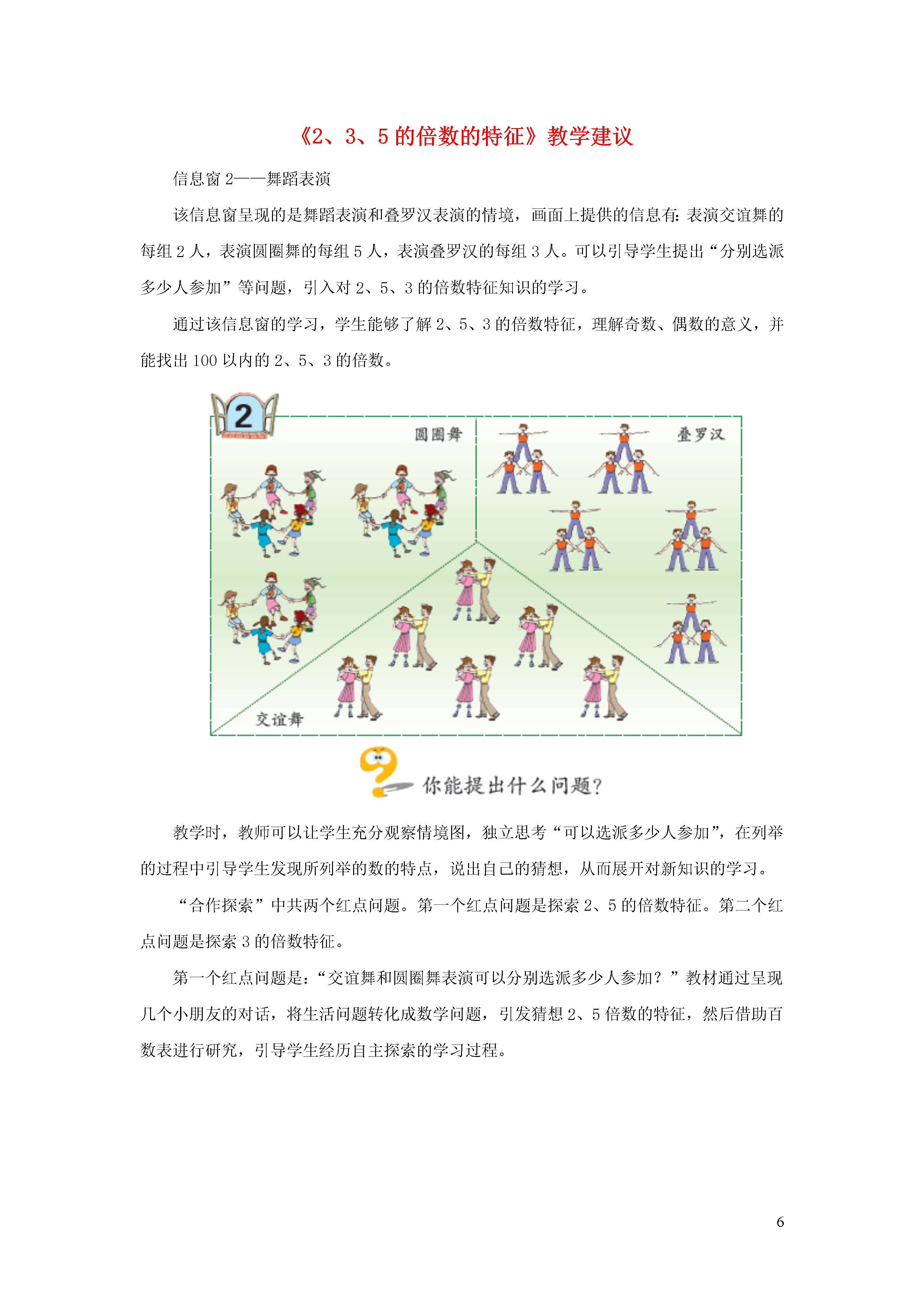 6《2、3、5的倍数的特征》教学建议信息窗2——舞蹈表演该信息窗呈现的是舞蹈表演和叠罗汉表演的情境,画面上提供的信息有:表演交谊舞的每组2人,表演圆圈舞的每组5人,表演叠罗汉的每组3人。可以引导学生提出“分别选派多少人参加”等问题,引入对2、5、3的倍数特征知识的学习。通过该信息窗的学习,学生能够了解2、5、3的倍数特征,理解奇数、偶数的意义,并能找出100以内的2、5、3的倍数。教学时,教师可以让学生充分观察情境图,独立思考“可以选派多少人参加”,在列举的过程中引导学生发现所列举的数的特点,说出自己的猜想,从而展开对新知识的学习。“合作探索”中共两个红点问题。第一个红点问题是探索2、5的倍数特征。第二个红点问题是探索3的倍数特征。第一个红点问题是:“交谊舞和圆圈舞表演可以分别选派多少人参加?”教材通过呈现几个小朋友的对话,将生活问题转化成数学问题,引发猜想2、5倍数的特征,然后借助百数表进行研究,引导学生经历自主探索的学习过程。教学时,要引导学生观察各项表演每组人数的特点,明确交谊舞2人一组,圆圈舞5人一组,知道参加这两种表演的人数应该分别是2、5的倍数。为了引导学生有序地、有条理地进行思考,使所求结果不重复、不遗漏,教师要引导学生在百数表中找2、5的倍数。当学生在百数表中找到后,可以引导学生猜测2、5的倍数的特征,并进行举例验证,探索出2、5的倍数特征。教学这部分内容时,可以将2、5的倍数的特征放在一起来研究,学生研究有困难时,也可以先让学生研究2的倍数的特征,再研究5的倍数的特征。关于奇数与偶数概念的学习,教师可以在学生探索2的倍数的特征的同时加以说明,让学生知道自然数按是不是2的倍数可以分为两类。第二个红点标示的问题是:“叠罗汉表演可以选派多少人参加?”教材呈现出多种研究方法,比如利用百数表研究、借助计数器研究等,引导学生参与学习。教学时,先让学生观察叠罗汉表演,明确参加这种表演的人数应该是3的倍数。引导学生在百数表中找出3的倍数,发现3的倍数与个位上的数没有关系。然后,引领学生借助计数器探索3的倍数的特征。“自主练习”第1题是巩固2、5倍数特征的练习题,同时渗透集合意识。练习时,可以先让学生自主完成,交流时说出判断的依据。第2题是区分奇数与偶数。练习时让学生自主完成,交流时通过引导让学生体会“一个自然数不是奇数就是偶数”。第3题是巩固3的倍数特征的题目。练习时,可以让学生独立完成,再进行方法交流。第4题是一道解决实际问题的题目。练习时,先让学生观察表格,理解参加每个项目的人数与每组人数之间的关系,明确要使分组后没有剩余的人,报名人数应该分别是2、3、5的倍数,然后进行判断。第5题是2、5、3的倍数特征的练习题。练习时指导学生要按一定顺序写数,从而使所写数既不重复,又不遗漏。第6题是一道判断题。练习时,先让学生独立完成,然后组织学生交流,通过交流辨析加深对概念的理解。完成后还可以结合本单元内容适当补充练习。第7题是一道灵活开放的综合练习题。练习时,先引导学生明确要求:从4个数字中任意选择两个数字,组合成符合要求的两位数,再让学生独立完成。为了照顾学生之间的差异,在交流时,可以先让学习有困难的学生提出遇到的问题,由大家解疑并提出好的解题方法。第8题是一个猜数游戏。通过练习,对2、3、5的倍数的特征进行综合巩固。练习时,先由教师对数进行描述,描述数的条件逐渐增多,逐步缩小取数范围,最后逼近所描述的数。学生掌握方法后再在小组里组织游戏。游戏应给学生留有较充足的时间。第9题是一道对2和3的倍数的特征进行扩展的练习题。练习时,可以引导学生先按照题目要求将6的倍数涂上颜色,然后思考6的倍数与2、3的倍数之间的关系,引导学生归纳出“既是2的倍数又是3的倍数的数就是6的倍数”。第10题是一道根据2、3、5的倍数的特征填写数字的开放题。练习时,可以让学生先说说2、3、5的倍数的特征,然后独立填数字。完成后,应组织好交流,在交流中相互学习、相互补充。此题答案不唯一,学生只要答对即可,但要尽可能多说几个,最后还可以让学生说一说□里最大能填几。第11题是一道有趣的思考题。练习时,应先引导学生将生活问题抽象成数学问题——求100以内2和5公有的倍数。明确问题后,可以引导学生利用百数表或列举的方法找到答案。根据2和5的倍数的特征,可知此数个位上是O。然后对个位上是O的数逐一验证,从而得到此题的答案:10、20、30、40、50、60、70、80、90。