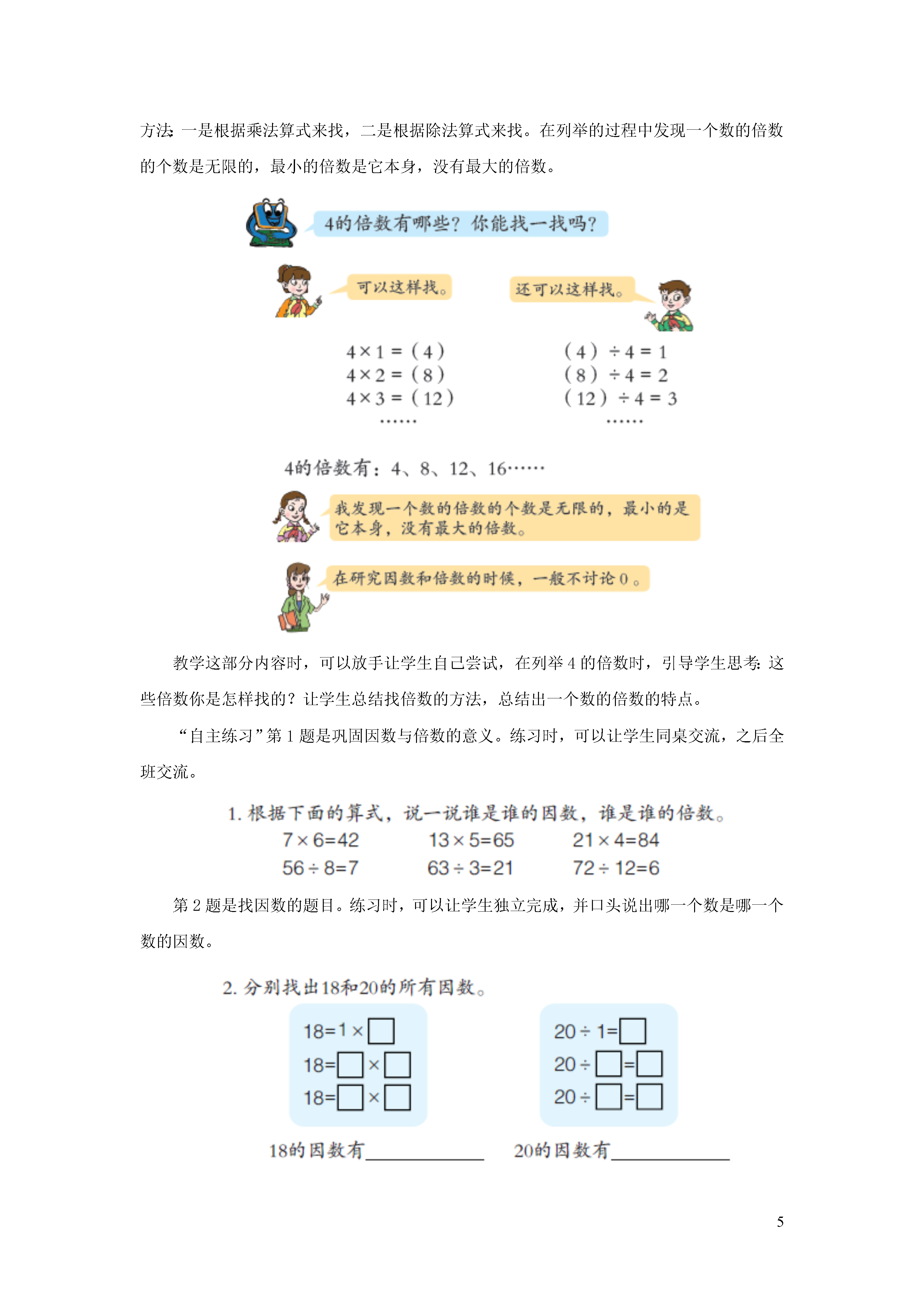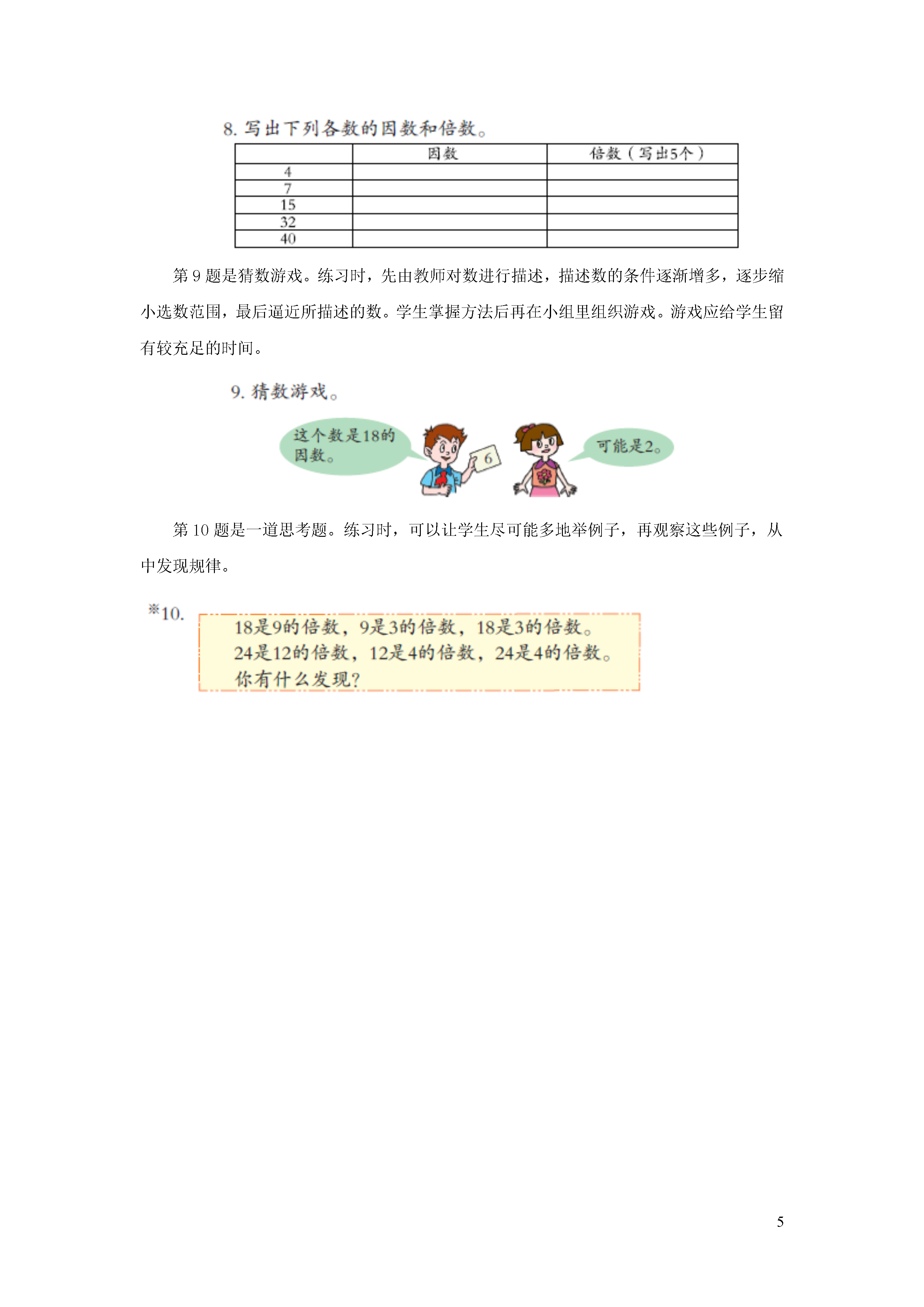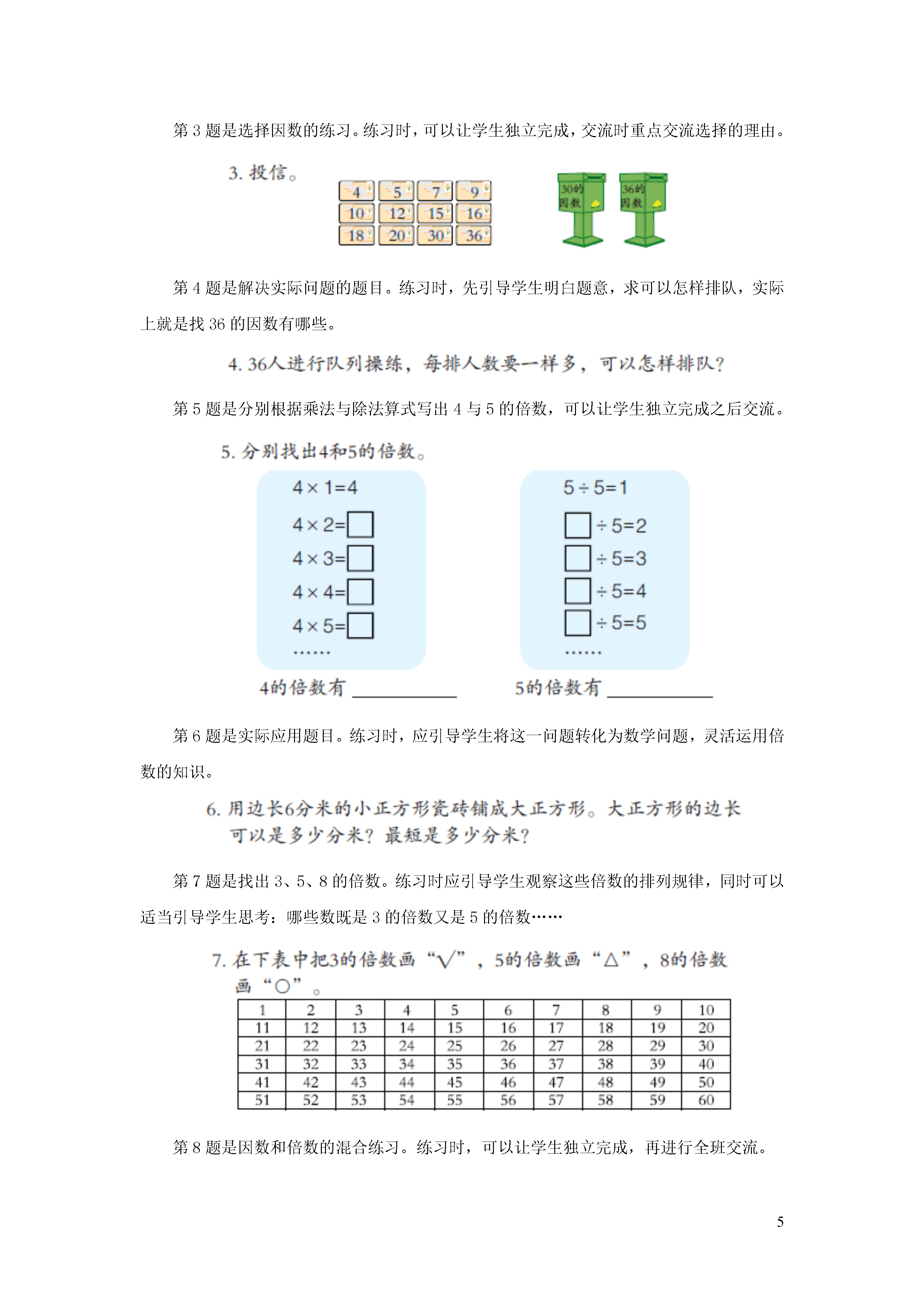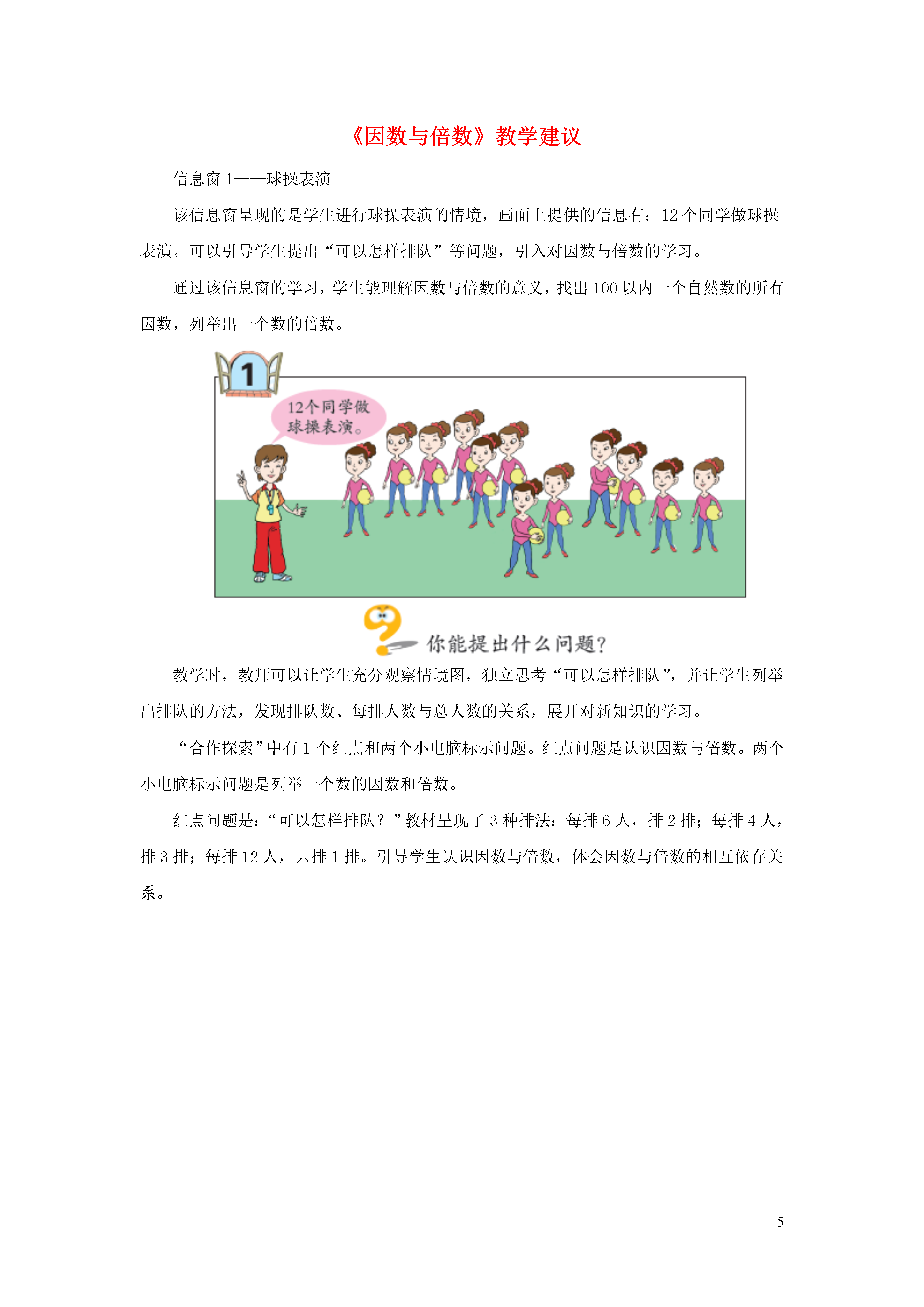5《因数与倍数》教学建议信息窗1——球操表演该信息窗呈现的是学生进行球操表演的情境,画面上提供的信息有:12个同学做球操表演。可以引导学生提出“可以怎样排队”等问题,引入对因数与倍数的学习。通过该信息窗的学习,学生能理解因数与倍数的意义,找出100以内一个自然数的所有因数,列举出一个数的倍数。教学时,教师可以让学生充分观察情境图,独立思考“可以怎样排队”,并让学生列举出排队的方法,发现排队数、每排人数与总人数的关系,展开对新知识的学习。“合作探索”中有1个红点和两个小电脑标示问题。红点问题是认识因数与倍数。两个小电脑标示问题是列举一个数的因数和倍数。红点问题是:“可以怎样排队?”教材呈现了3种排法:每排6人,排2排;每排4人,排3排;每排12人,只排1排。引导学生认识因数与倍数,体会因数与倍数的相互依存关系。教学时,要先引导学生明确每排人数、排数与12的关系,并让学生用列举的方法找出答案。在列举时,要引导学生有序地、有条理地进行思考,使结果不重复、不遗漏,在此基础上引导学生理解因数与倍数的概念。第一个小电脑标示的问题是:“你能找出24的因数吗?”教材呈现了两种思路:一是根据除法算式找24的因数,二是根据乘法算式找24的因数。发现一个数的因数的个数是有限的,最小的因数是1,最大的因数是它本身。在教学这部分内容时,可以放手让学生自己尝试,在找因数的过程中进一步体会因数与倍数的关系,并引导学生有序列举,做到不重复、不遗漏。第二个小电脑标示的问题是:“4的倍数有哪些?你能找一找吗?”教材也呈现了两种方法:一是根据乘法算式来找,二是根据除法算式来找。在列举的过程中发现一个数的倍数的个数是无限的,最小的倍数是它本身,没有最大的倍数。教学这部分内容时,可以放手让学生自己尝试,在列举4的倍数时,引导学生思考:这些倍数你是怎样找的?让学生总结找倍数的方法,总结出一个数的倍数的特点。“自主练习”第1题是巩固因数与倍数的意义。练习时,可以让学生同桌交流,之后全班交流。第2题是找因数的题目。练习时,可以让学生独立完成,并口头说出哪一个数是哪一个数的因数。第3题是选择因数的练习。练习时,可以让学生独立完成,交流时重点交流选择的理由。第4题是解决实际问题的题目。练习时,先引导学生明白题意,求可以怎样排队,实际上就是找36的因数有哪些。第5题是分别根据乘法与除法算式写出4与5的倍数,可以让学生独立完成之后交流。第6题是实际应用题目。练习时,应引导学生将这一问题转化为数学问题,灵活运用倍数的知识。第7题是找出3、5、8的倍数。练习时应引导学生观察这些倍数的排列规律,同时可以适当引导学生思考:哪些数既是3的倍数又是5的倍数……第8题是因数和倍数的混合练习。练习时,可以让学生独立完成,再进行全班交流。第9题是猜数游戏。练习时,先由教师对数进行描述,描述数的条件逐渐增多,逐步缩小选数范围,最后逼近所描述的数。学生掌握方法后再在小组里组织游戏。游戏应给学生留有较充足的时间。第10题是一道思考题。练习时,可以让学生尽可能多地举例子,再观察这些例子,从中发现规律。