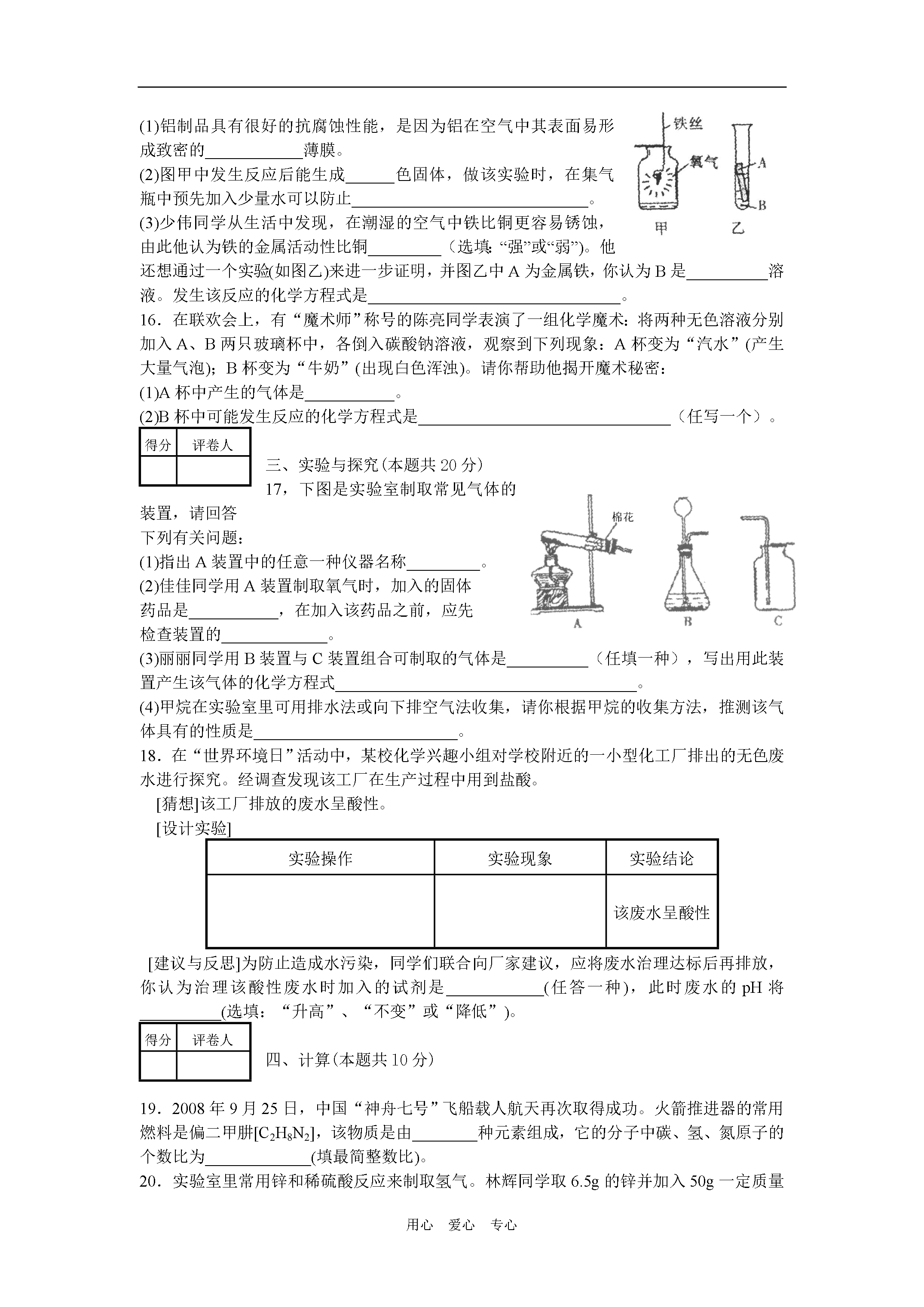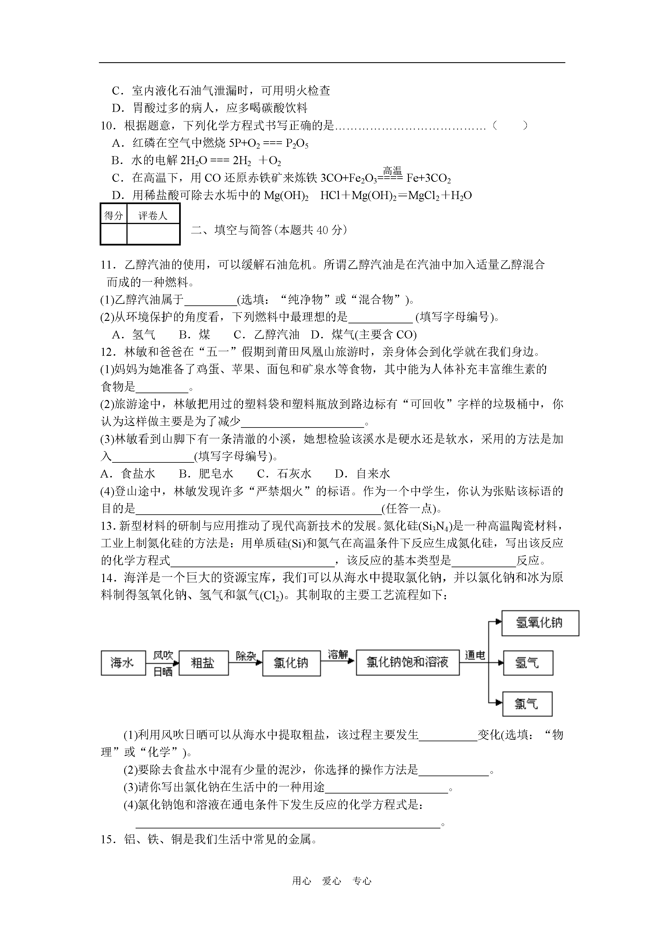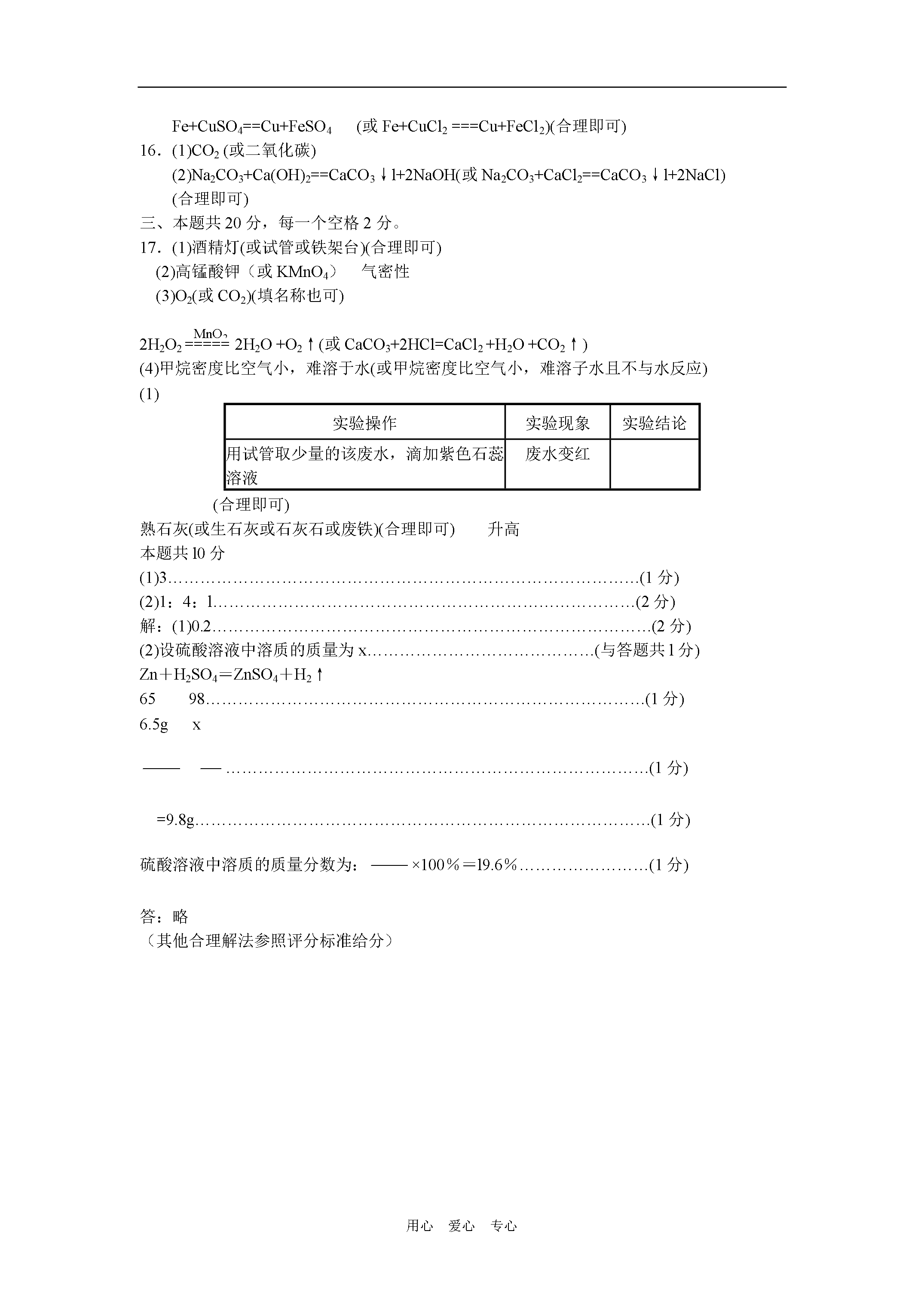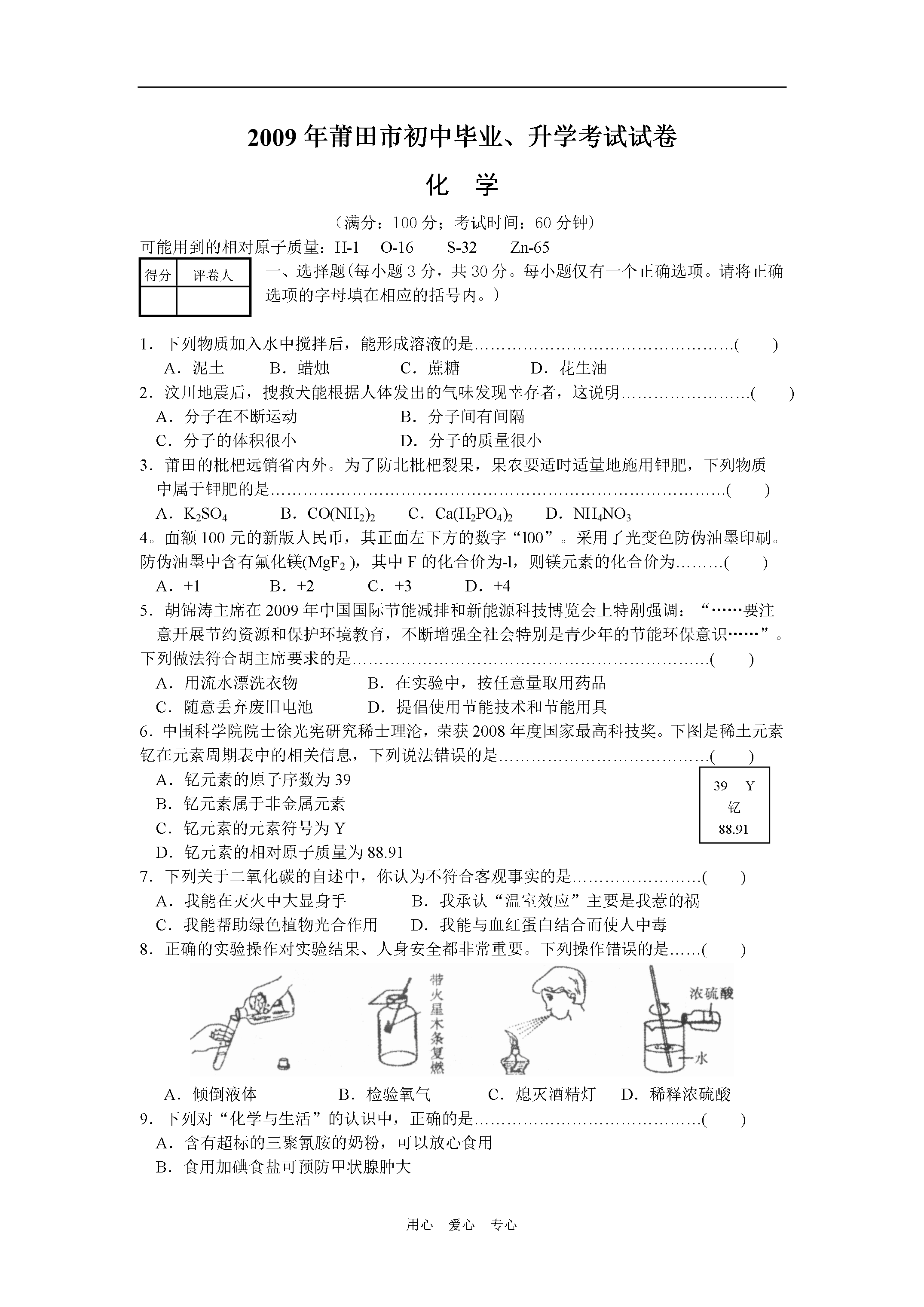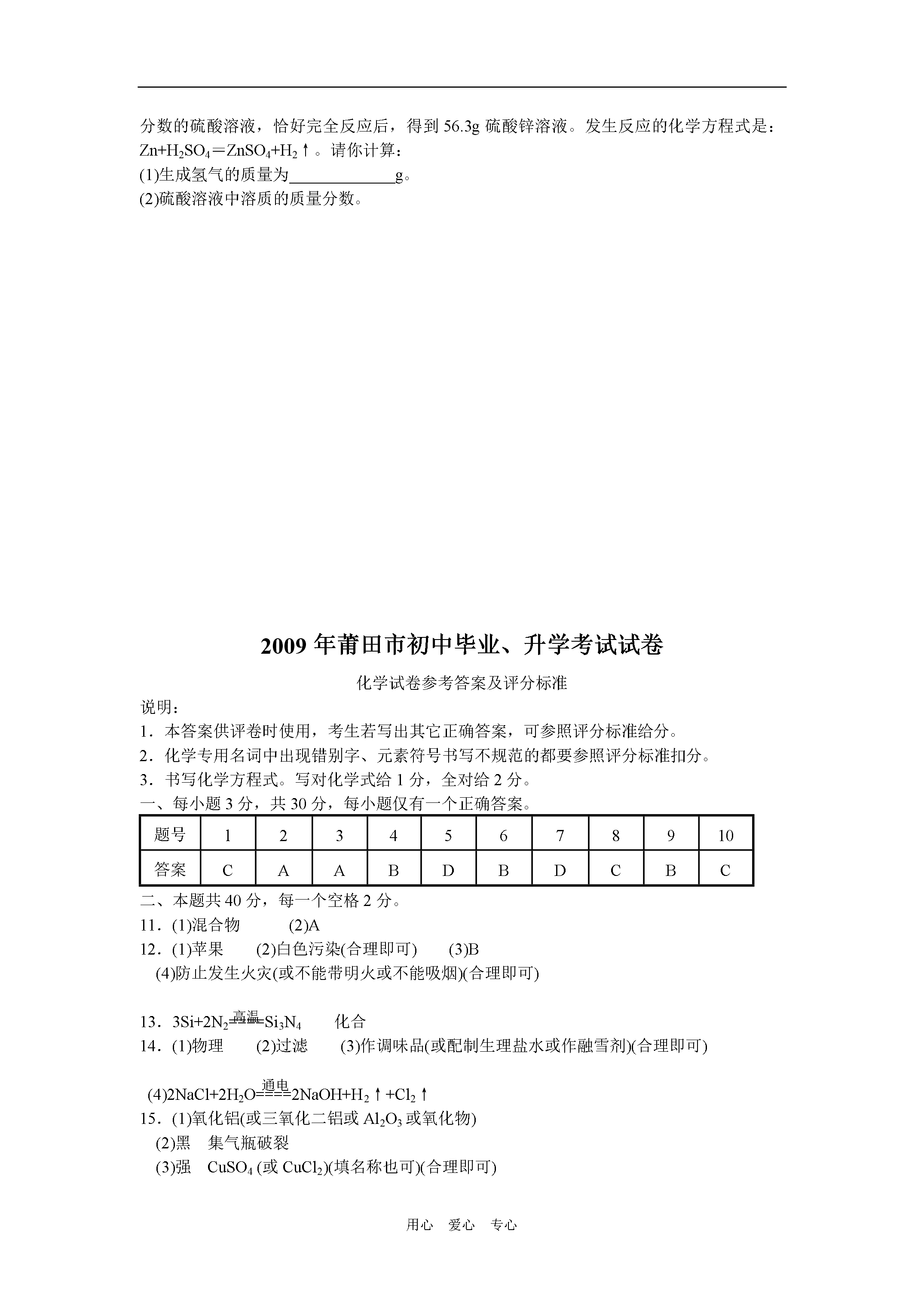用心爱心专心2009年莆田市初中毕业、升学考试试卷化学(满分:l00分;考试时间:60分钟)可能用到的相对原子质量:H-1O-16S-32Zn-65得分评卷人一、选择题(每小题3分,共30分。每小题仅有一个正确选项。请将正确选项的字母填在相应的括号内。)1.下列物质加入水中搅拌后,能形成溶液的是…………………………………………()A.泥土B.蜡烛C.蔗糖D.花生油2.汶川地震后,搜救犬能根据人体发出的气味发现幸存者,这说明……………………()A.分子在不断运动B.分子间有间隔C.分子的体积很小D.分子的质量很小3.莆田的枇杷远销省内外。为了防北枇杷裂果,果农要适时适量地施用钾肥,下列物质中属于钾肥的是…………………………………………………………………………()A.K2SO4B.CO(NH2)2C.Ca(H2PO4)2D.NH4NO34。面额100元的新版人民币,其正面左下方的数字“l00”。采用了光变色防伪油墨印刷。防伪油墨中含有氟化镁(MgF2),其中F的化合价为-l,则镁元素的化合价为………()A.+1B.+2C.+3D.+45.胡锦涛主席在2009年中国国际节能减排和新能源科技博览会上特剐强调:“……要注意开展节约资源和保护环境教育,不断增强全社会特别是青少年的节能环保意识……”。下列做法符合胡主席要求的是…………………………………………………………()A.用流水漂洗衣物B.在实验中,按任意量取用药品C.随意丢弃废旧电池D.提倡使用节能技术和节能用具6.中围科学院院士徐光宪研究稀士理沦,荣获2008年度国家最高科技奖。下图是稀土元素钇在元素周期表中的相关信息,下列说法错误的是…………………………………()39Y钇88.91A.钇元素的原子序数为39B.钇元素属于非金属元素C.钇元素的元素符号为YD.钇元素的相对原子质量为88.917.下列关于二氧化碳的自述中,你认为不符合客观事实的是……………………()A.我能在灭火中大显身手B.我承认“温室效应”主要是我惹的祸C.我能帮助绿色植物光合作用D.我能与血红蛋白结合而使人中毒8.正确的实验操作对实验结果、人身安全都非常重要。下列操作错误的是……()A.倾倒液体B.检验氧气C.熄灭酒精灯D.稀释浓硫酸9.下列对“化学与生活”的认识中,正确的是……………………………………()A.含有超标的三聚氰胺的奶粉,可以放心食用B.食用加碘食盐可预防甲状腺肿大C.室内液化石油气泄漏时,可用明火检查D.胃酸过多的病人,应多喝碳酸饮料10.根据题意,下列化学方程式书写正确的是…………………………………()A.红磷在空气中燃烧5P+O2===P2O5高温B.水的电解2H2O===2H2+O2C.在高温下,用CO还原赤铁矿来炼铁3CO+Fe2O3====Fe+3CO2D.用稀盐酸可除去水垢中的Mg(OH)2HCl+Mg(OH)2=MgCl2+H2O得分评卷人二、填空与简答(本题共40分)11.乙醇汽油的使用,可以缓解石油危机。所谓乙醇汽油是在汽油中加入适量乙醇混合而成的一种燃料。(1)乙醇汽油属于_________(选填:“纯净物”或“混合物”)。(2)从环境保护的角度看,下列燃料中最理想的是___________(填写字母编号)。A.氢气B.煤C.乙醇汽油D.煤气(主要含CO)12.林敏和爸爸在“五一”假期到莆田凤凰山旅游时,亲身体会到化学就在我们身边。(1)妈妈为她准备了鸡蛋、苹果、面包和矿泉水等食物,其中能为人体补充丰富维生素的食物是_________。(2)旅游途中,林敏把用过的塑料袋和塑料瓶放到路边标有“可回收”字样的垃圾桶中,你认为这样做主要是为了减少_____________________。(3)林敏看到山脚下有一条清澈的小溪,她想检验该溪水是硬水还是软水,采用的方法是加入______________(填写字母编号)。A.食盐水B.肥皂水C.石灰水D.自来水(4)登山途中,林敏发现许多“严禁烟火”的标语。作为一个中学生,你认为张贴该标语的目的是__________________________________________(任答一点)。13.新型材料的研制与应用推动了现代高新技术的发展。氮化硅(Si3N4)是一种高温陶瓷材料,工业上制氮化硅的方法是:用单质硅(Si)和氮气在高温条件下反应生成氮化硅,写出该反应的化学方程式____________________________,该反应的基本类型是___________反应。14.海洋是一个巨大的资源宝库,我们可以从海水中提取氯化钠,并以氯化钠和冰为原料制得氢氧化钠、氢气和氯气(Cl2)。其制取的主要工艺流程如下:(1)利用风吹日晒可以从海水中提取粗盐,该过程主要发生__________变化(选填:“物理”或“化学”)。(2)要除去