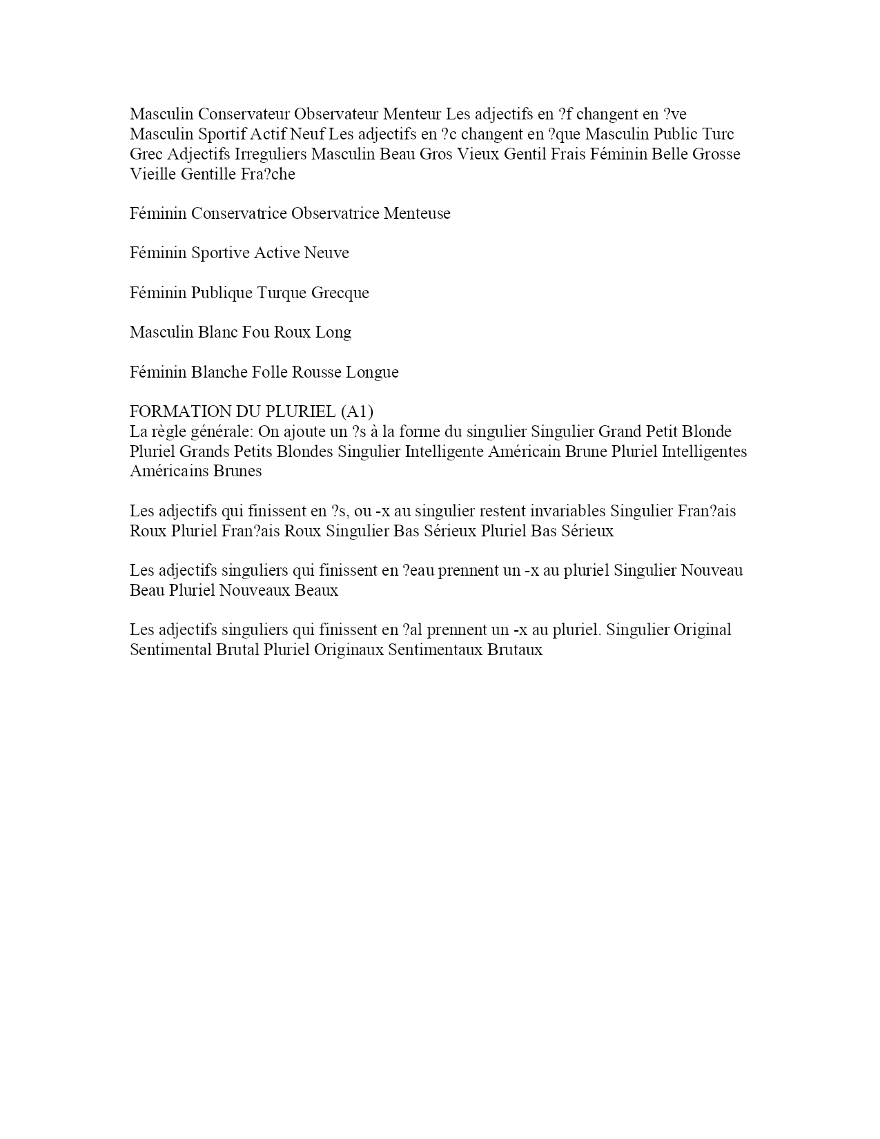 LESADJECTIFSFORMATIONDUF?MININ(A1) Larèglegénérale:Onajouteun?eàlaformedumasculinMasculinGrandPetitBlondBrunFémininGrandePetiteBlondeBruneMasculinVertIntelligentAméricainFémininVerteIntelligenteAméricaine Lesadjectifsquifinissenten?eaumasculinrestentinvariablesMasculinJeuneRougeFémininJeuneRougeMasculinSympathiqueCélibataireFémininSympathiqueCélibataire Lesadjectifsmasculinsquifinissenten?ésuiventlarèglegénéraleMasculinMariéLesadjectifsquifinissenten-enajoutent?neMasculinItalienAncienFémininItalienneAncienneMasculinParisienEuropéenFémininParisienneEuropéenneFémininMariée Lesadjectifsquifinissenten-elajoutent?leMasculinTraditionnelExceptionnelLesadjectifsen?onajoutent-neaussi.MasculinBonMignonBretonLesadjectifsen?ersetransformenten?èreMasculinFierEtrangerCherFémininFièreEtrangèreChèreMasculinAmerPremierFémininAmèrePremièreFémininBonneMignonneBretonneFémininTraditionnelleExceptionnelle Lesadjectifsen?eux/-eurchangenten-euseMasculinHeureuxRêveurSérieuxFémininHeureuseRêveuseSérieuseMasculinNerveuxTravailleurFémininNerveuseTravailleuse Lesadjectifsen-teurchangenten?trice/-teuse MasculinConservateurObservateurMenteurLesadjectifsen?fchangenten?veMasculinSportifActifNeufLesadjectifsen?cchangenten?queMasculinPublicTurcGrecAdjectifsIrreguliersMasculinBeauGrosVieuxGentilFraisFémininBelleGrosseVieilleGentilleFra?che FémininConservatriceObservatriceMenteuse FémininSportiveActiveNeuve FémininPubliqueTurqueGrecque MasculinBlancFouRouxLong FémininBlancheFolleRousseLongue FORMATIONDUPLURIEL(A1) Larèglegénérale:Onajouteun?sàlaformedusingulierSingulierGrandPetitBlondePlurielGrandsPetitsBlondesSingulierIntelligenteAméricainBrunePlurielIntelligentesAméricainsBrunes Lesadjectifsquifinissenten?s,ou-xausingulierrestentinvariablesSingulierFran?aisRouxPlurielFran?aisRouxSingulierBasSérieuxPlurielBasSérieux Lesadjectifssinguliersquifinissenten?eauprennentun-xauplurielSingulierNouveauBeauPlurielNouveauxBeaux Lesadjectifssinguliersquifinissenten?alprennentun-xaupluriel.SingulierO