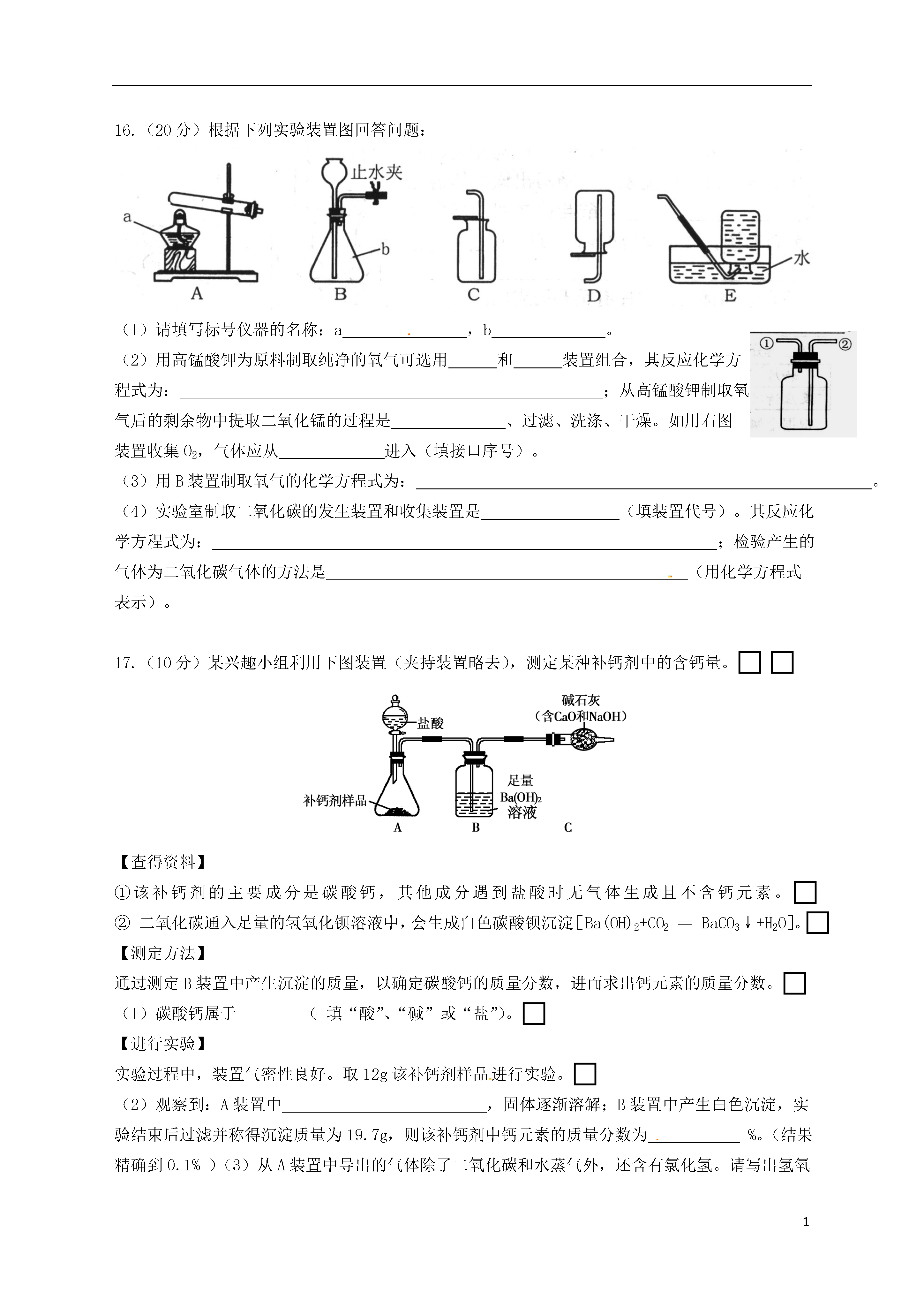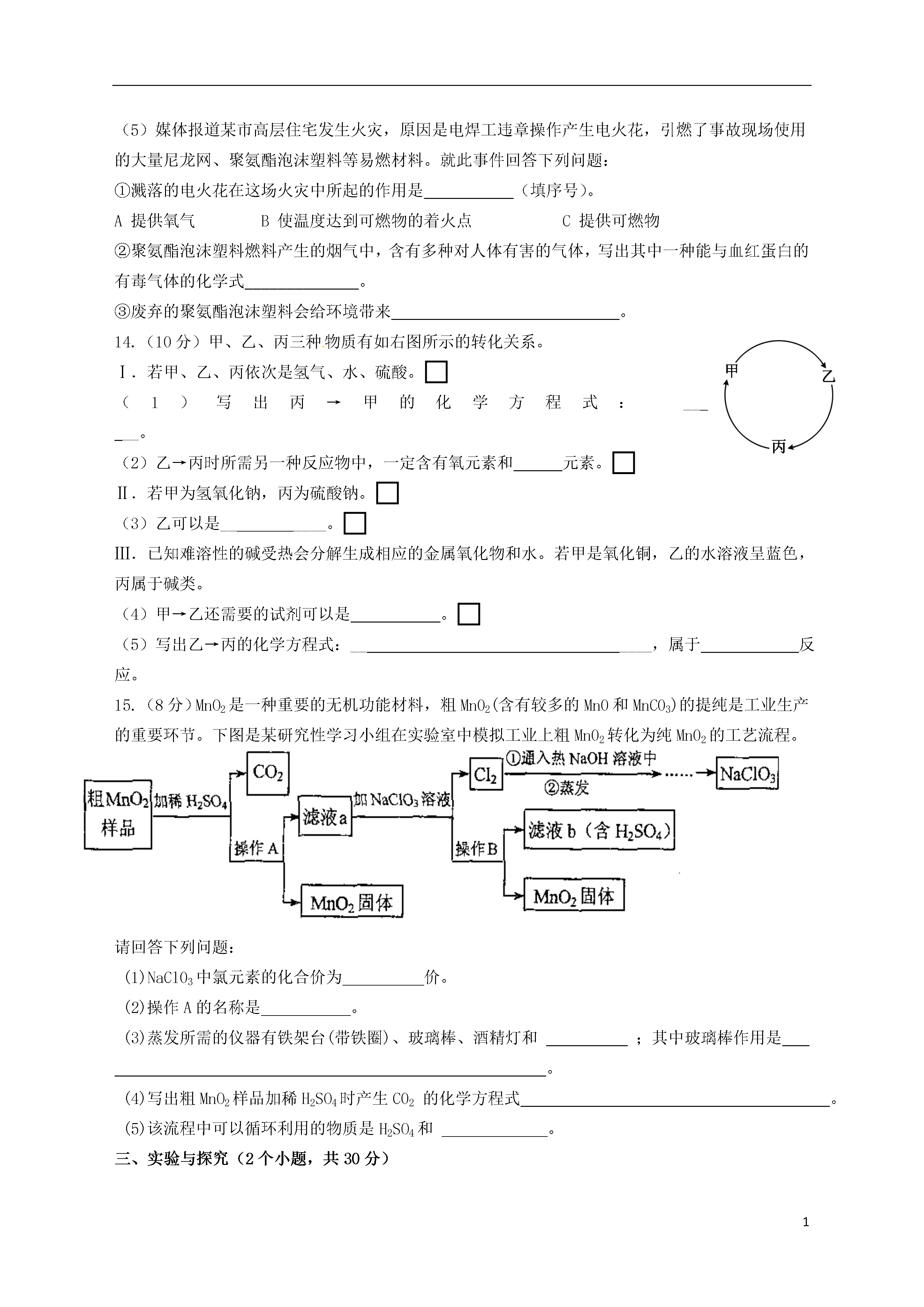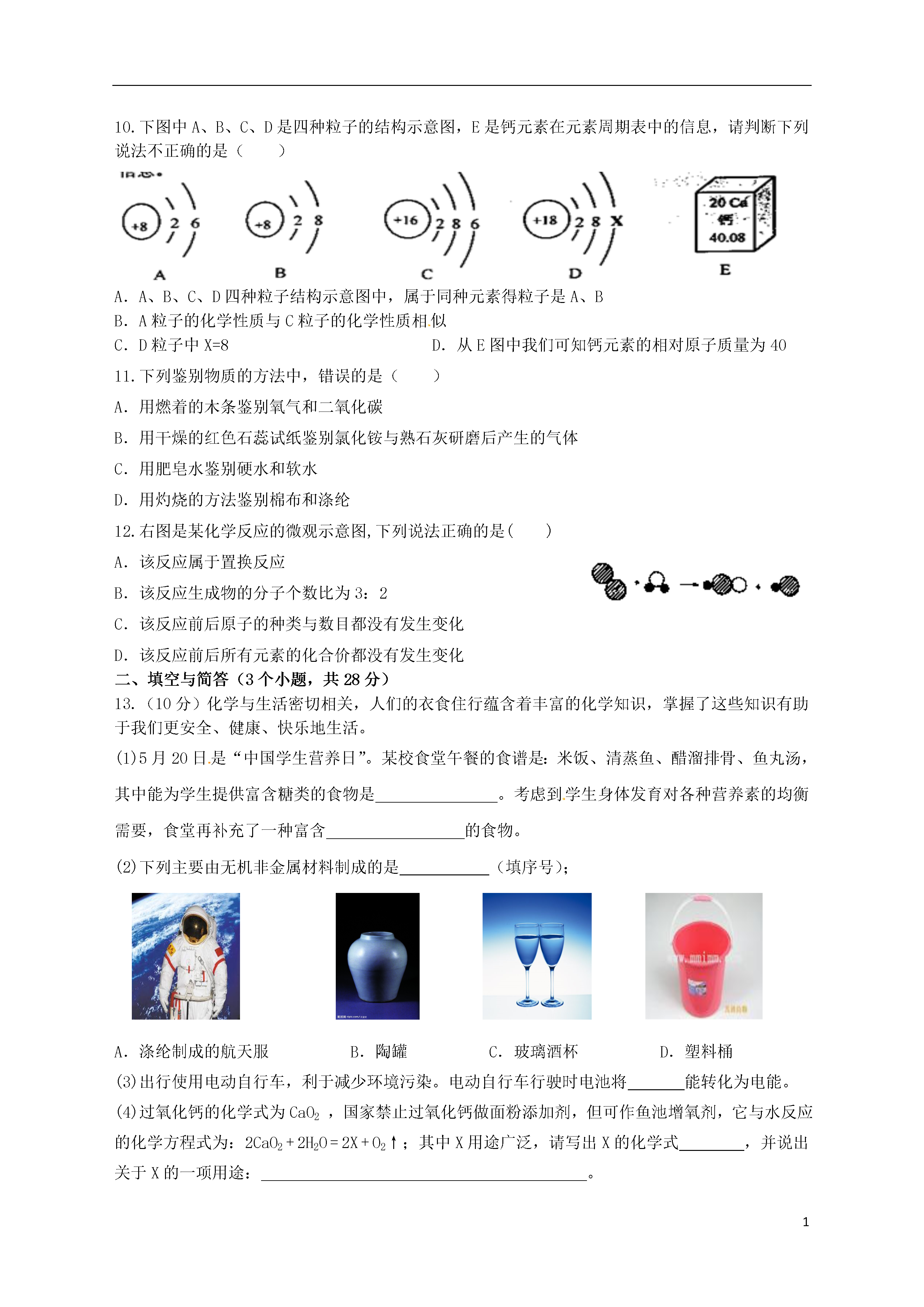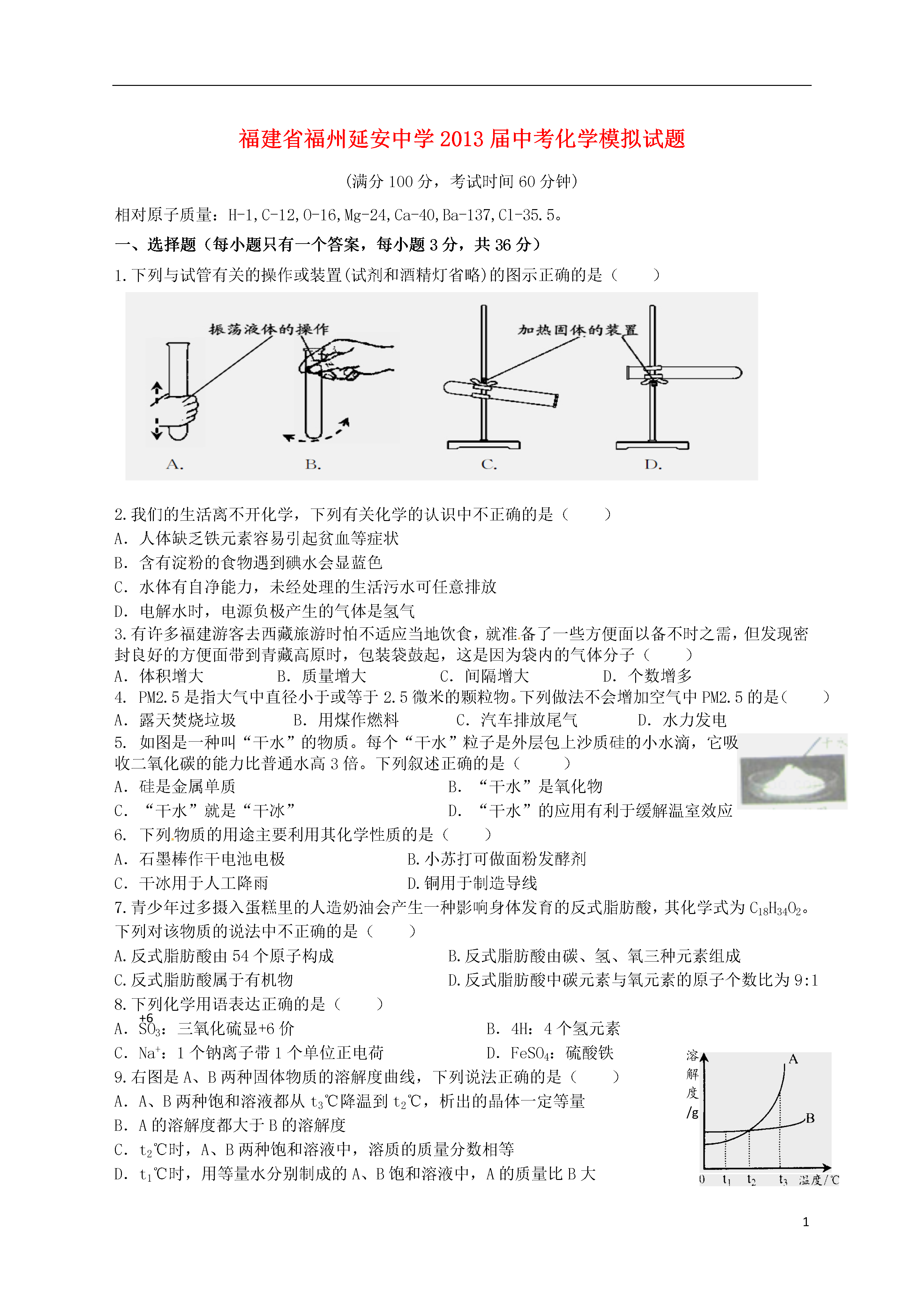 1福建省福州延安中学2013届中考化学模拟试题(满分100分,考试时间60分钟)相对原子质量:H-1,C-12,O-16,Mg-24,Ca-40,Ba-137,Cl-35.5。一、选择题(每小题只有一个答案,每小题3分,共36分)1.下列与试管有关的操作或装置(试剂和酒精灯省略)的图示正确的是()2.我们的生活离不开化学,下列有关化学的认识中不正确的是()A.人体缺乏铁元素容易引起贫血等症状B.含有淀粉的食物遇到碘水会显蓝色C.水体有自净能力,未经处理的生活污水可任意排放D.电解水时,电源负极产生的气体是氢气3.有许多福建游客去西藏旅游时怕不适应当地饮食,就准备了一些方便面以备不时之需,但发现密封良好的方便面带到青藏高原时,包装袋鼓起,这是因为袋内的气体分子()A.体积增大B.质量增大C.间隔增大D.个数增多4.PM2.5是指大气中直径小于或等于2.5微米的颗粒物。下列做法不会增加空气中PM2.5的是()A.露天焚烧垃圾B.用煤作燃料C.汽车排放尾气D.水力发电5.如图是一种叫“干水”的物质。每个“干水”粒子是外层包上沙质硅的小水滴,它吸收二氧化碳的能力比普通水高3倍。下列叙述正确的是()A.硅是金属单质B.“干水”是氧化物C.“干水”就是“干冰”D.“干水”的应用有利于缓解温室效应6.下列物质的用途主要利用其化学性质的是()A.石墨棒作干电池电极B.小苏打可做面粉发酵剂C.干冰用于人工降雨D.铜用于制造导线7.青少年过多摄入蛋糕里的人造奶油会产生一种影响身体发育的反式脂肪酸,其化学式为C18H34O2。下列对该物质的说法中不正确的是()A.反式脂肪酸由54个原子构成B.反式脂肪酸由碳、氢、氧三种元素组成C.反式脂肪酸属于有机物D.反式脂肪酸中碳元素与氧元素的原子个数比为9:1+68.下列化学用语表达正确的是()A.SO3:三氧化硫显+6价B.4H:4个氢元素C.Na+:1个钠离子带1个单位正电荷D.FeSO4:硫酸铁溶解度/g9.右图是A、B两种固体物质的溶解度曲线,下列说法正确的是()A.A、B两种饱和溶液都从t3℃降温到t2℃,析出的晶体一定等量B.A的溶解度都大于B的溶解度C.t2℃时,A、B两种饱和溶液中,溶质的质量分数相等D.t1℃时,用等量水分别制成的A、B饱和溶液中,A的质量比B大10.下图中A、B、C、D是四种粒子的结构示意图,E是钙元素在元素周期表中的信息,请判断下列说法不正确的是()A.A、B、C、D四种粒子结构示意图中,属于同种元素得粒子是A、BB.A粒子的化学性质与C粒子的化学性质相似C.D粒子中X=8D.从E图中我们可知钙元素的相对原子质量为4011.下列鉴别物质的方法中,错误的是()A.用燃着的木条鉴别氧气和二氧化碳B.用干燥的红色石蕊试纸鉴别氯化铵与熟石灰研磨后产生的气体C.用肥皂水鉴别硬水和软水D.用灼烧的方法鉴别棉布和涤纶12.右图是某化学反应的微观示意图,下列说法正确的是()A.该反应属于置换反应B.该反应生成物的分子个数比为3:2C.该反应前后原子的种类与数目都没有发生变化D.该反应前后所有元素的化合价都没有发生变化二、填空与简答(3个小题,共28分)13.(10分)化学与生活密切相关,人们的衣食住行蕴含着丰富的化学知识,掌握了这些知识有助于我们更安全、健康、快乐地生活。(1)5月20日是“中国学生营养日”。某校食堂午餐的食谱是:米饭、清蒸鱼、醋溜排骨、鱼丸汤,其中能为学生提供富含糖类的食物是。考虑到学生身体发育对各种营养素的均衡需要,食堂再补充了一种富含的食物。(2)下列主要由无机非金属材料制成的是(填序号);A.涤纶制成的航天服B.陶罐C.玻璃酒杯D.塑料桶(3)出行使用电动自行车,利于减少环境污染。电动自行车行驶时电池将能转化为电能。(4)过氧化钙的化学式为CaO2,国家禁止过氧化钙做面粉添加剂,但可作鱼池增氧剂,它与水反应的化学方程式为:2CaO2+2H2O=2X+O2↑;其中X用途广泛,请写出X的化学式,并说出关于X的一项用途:。(5)媒体报道某市高层住宅发生火灾,原因是电焊工违章操作产生电火花,引燃了事故现场使用的大量尼龙网、聚氨酯泡沫塑料等易燃材料。就此事件回答下列问题:①溅落的电火花在这场火灾中所起的作用是___________(填序号)。A提供氧气B使温度达到可燃物的着火点C提供可燃物②聚氨酯泡沫塑料燃料产生的烟气中,含有多种对人体有害的气体,写出其中一种能与血红蛋白的有毒气体的化学式______________。③废弃的聚氨酯泡沫塑料会给环境带来。14.(10分)甲、乙、丙三种物质有如右图所示的转