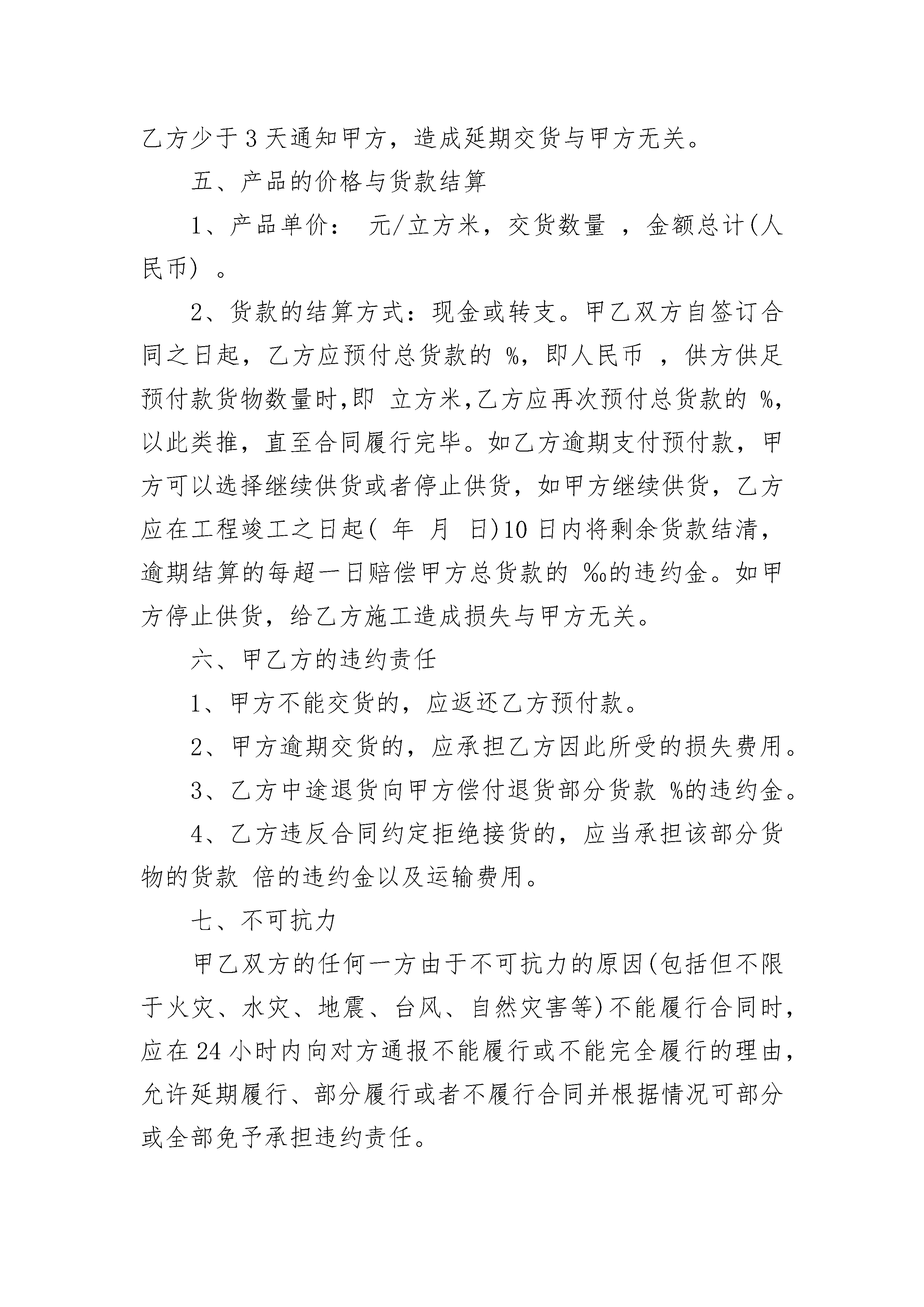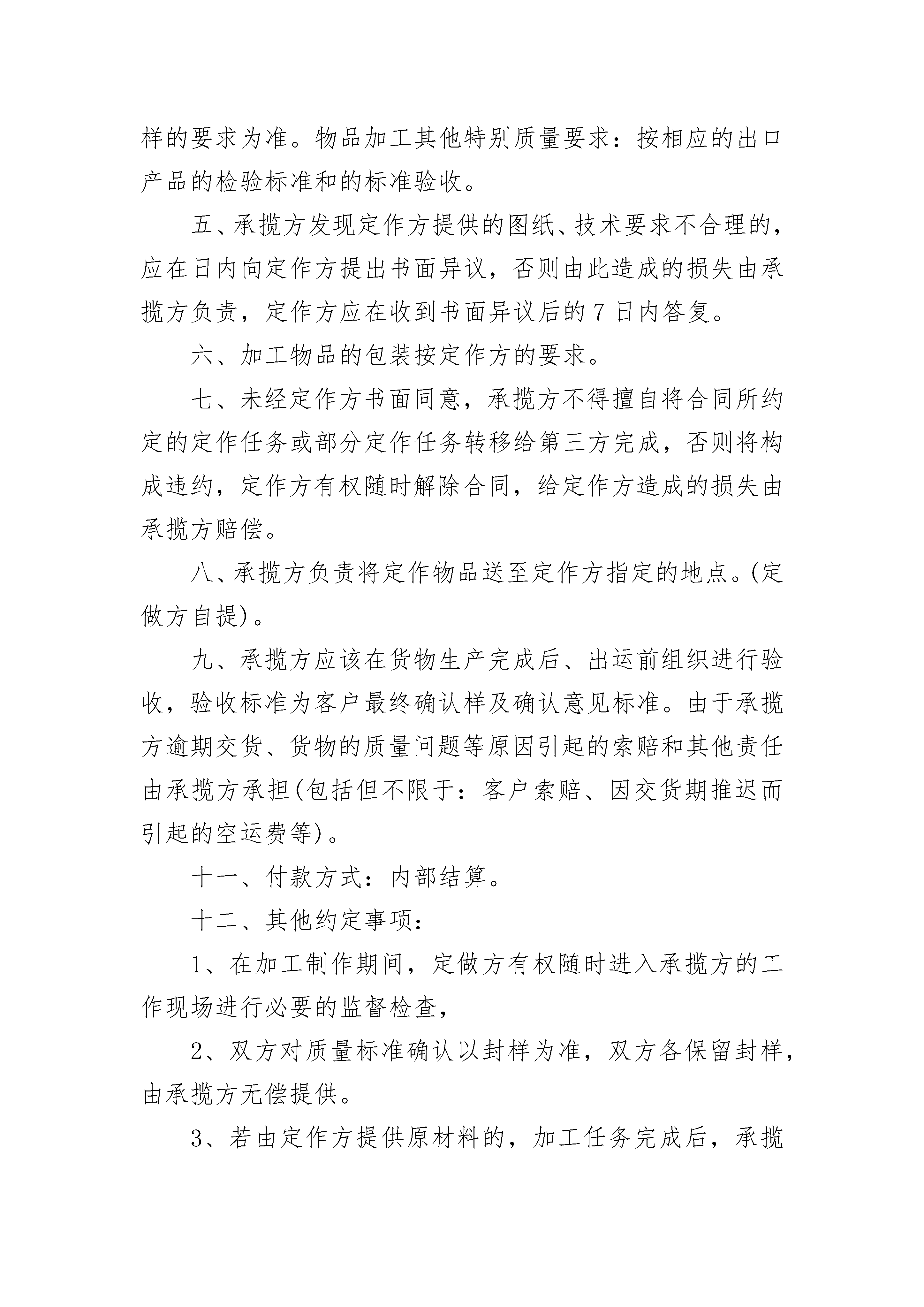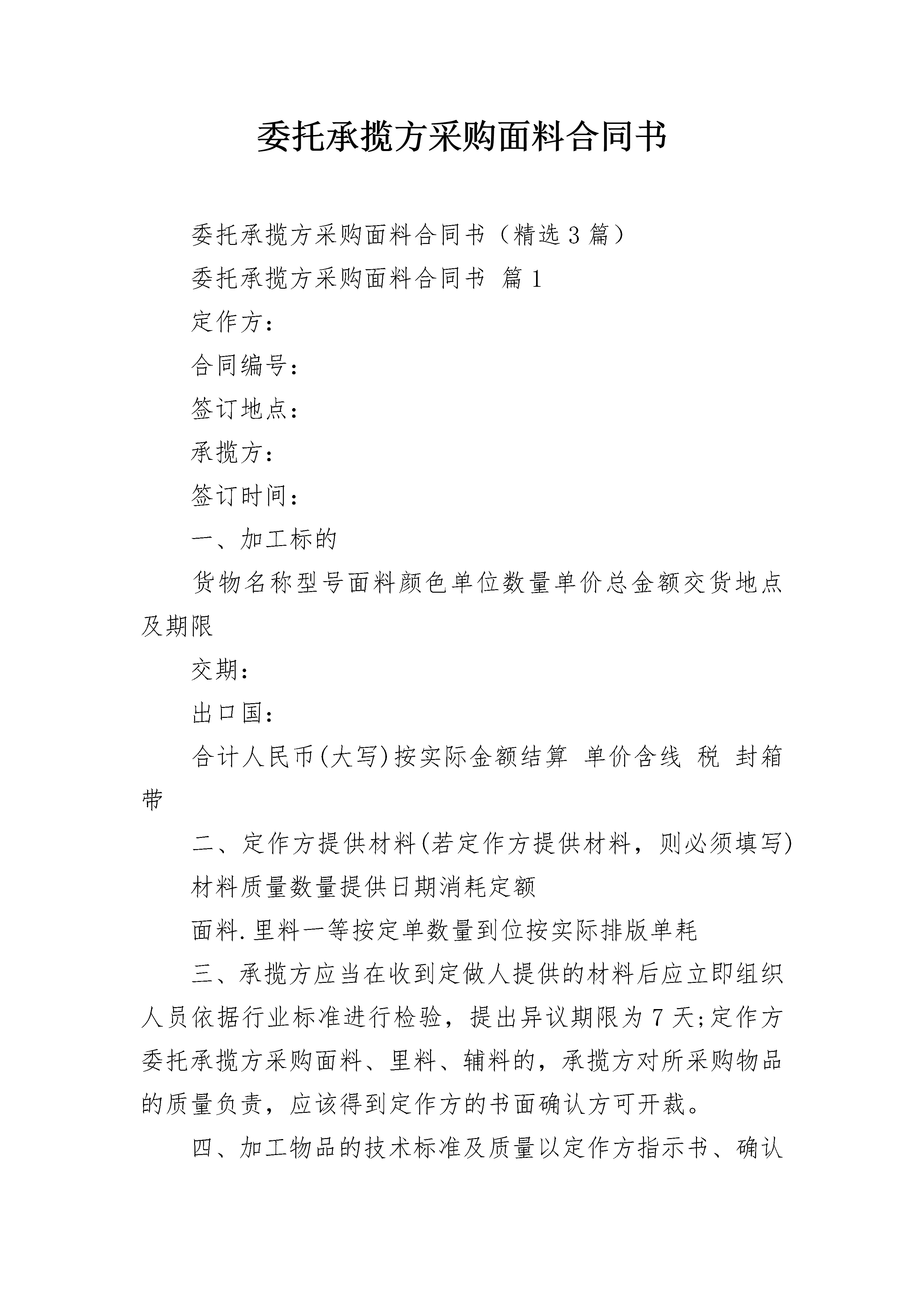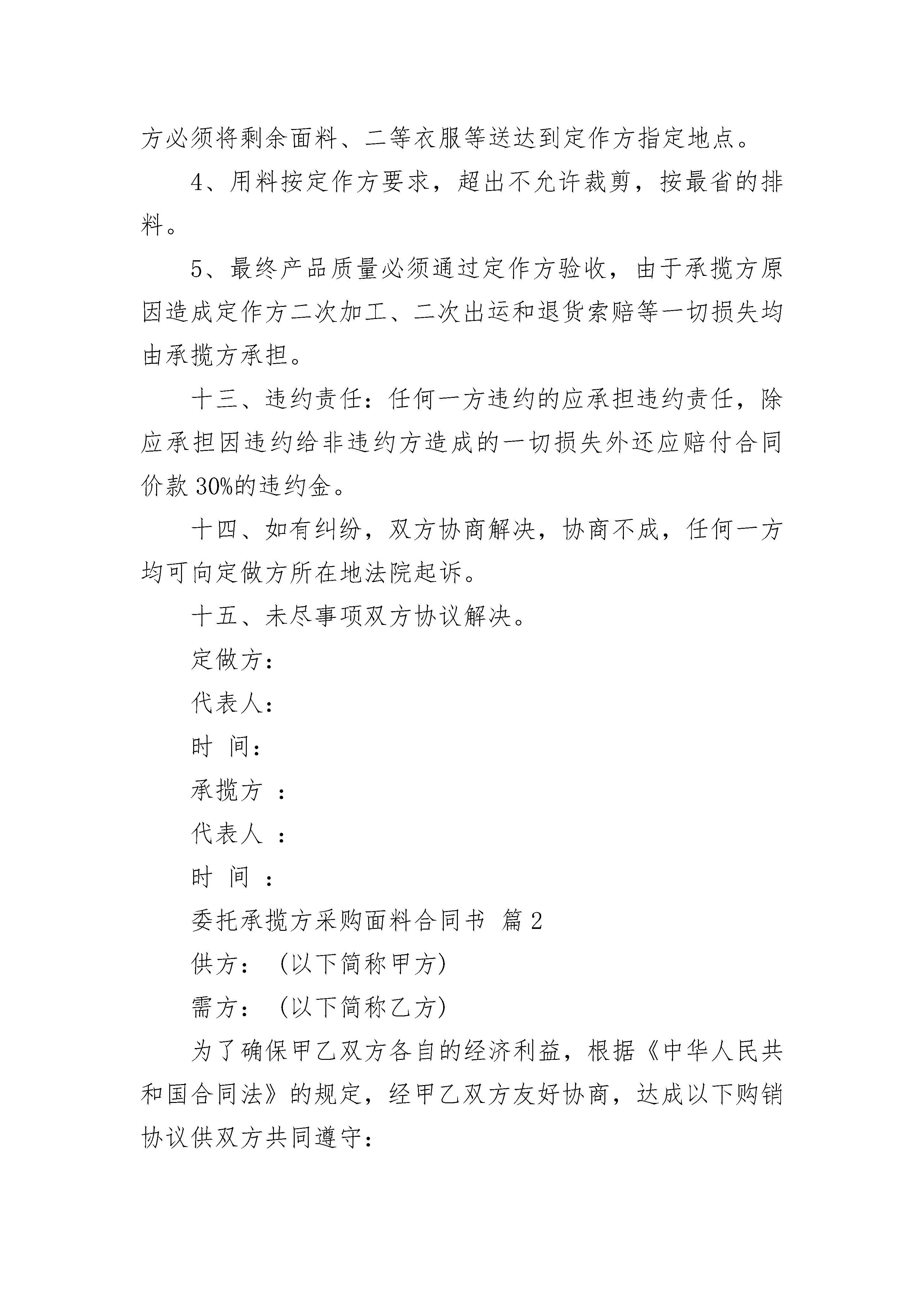 委托承揽方采购面料合同书委托承揽方采购面料合同书(精选3篇)委托承揽方采购面料合同书篇1定作方:合同编号:签订地点:承揽方:签订时间:一、加工标的货物名称型号面料颜色单位数量单价总金额交货地点及期限交期:出口国:合计人民币(大写)按实际金额结算单价含线税封箱带二、定作方提供材料(若定作方提供材料,则必须填写)材料质量数量提供日期消耗定额面料.里料一等按定单数量到位按实际排版单耗三、承揽方应当在收到定做人提供的材料后应立即组织人员依据行业标准进行检验,提出异议期限为7天;定作方委托承揽方采购面料、里料、辅料的,承揽方对所采购物品的质量负责,应该得到定作方的书面确认方可开裁。四、加工物品的技术标准及质量以定作方指示书、确认样的要求为准。物品加工其他特别质量要求:按相应的出口产品的检验标准和的标准验收。五、承揽方发现定作方提供的图纸、技术要求不合理的,应在日内向定作方提出书面异议,否则由此造成的损失由承揽方负责,定作方应在收到书面异议后的7日内答复。六、加工物品的包装按定作方的要求。七、未经定作方书面同意,承揽方不得擅自将合同所约定的定作任务或部分定作任务转移给第三方完成,否则将构成违约,定作方有权随时解除合同,给定作方造成的损失由承揽方赔偿。八、承揽方负责将定作物品送至定作方指定的地点。(定做方自提)。九、承揽方应该在货物生产完成后、出运前组织进行验收,验收标准为客户最终确认样及确认意见标准。由于承揽方逾期交货、货物的质量问题等原因引起的索赔和其他责任由承揽方承担(包括但不限于:客户索赔、因交货期推迟而引起的空运费等)。十一、付款方式:内部结算。十二、其他约定事项:1、在加工制作期间,定做方有权随时进入承揽方的工作现场进行必要的监督检查,2、双方对质量标准确认以封样为准,双方各保留封样,由承揽方无偿提供。3、若由定作方提供原材料的,加工任务完成后,承揽方必须将剩余面料、二等衣服等送达到定作方指定地点。4、用料按定作方要求,超出不允许裁剪,按最省的排料。5、最终产品质量必须通过定作方验收,由于承揽方原因造成定作方二次加工、二次出运和退货索赔等一切损失均由承揽方承担。十三、违约责任:任何一方违约的应承担违约责任,除应承担因违约给非违约方造成的一切损失外还应赔付合同价款30%的违约金。十四、如有纠纷,双方协商解决,协商不成,任何一方均可向定做方所在地法院起诉。十五、未尽事项双方协议解决。定做方:代表人:时间:承揽方:代表人:时间:委托承揽方采购面料合同书篇2供方:(以下简称甲方)需方:(以下简称乙方)为了确保甲乙双方各自的经济利益,根据《中华人民共和国合同法》的规定,经甲乙双方友好协商,达成以下购销协议供双方共同遵守:一、产品的名称、品种、规格和质量标准1、产品名称:苯板2、产品种类:B1型阻燃级苯板。3、产品规格(mm):。4、产品的质量标准:甲方根据乙方对产品标准的要求,为其提供产品,质量符合国家标准(苯板).二、购货数量和计量单位、计量方法。1、购货数量(立方):。2、产品的计量单位、计量方法:长×宽×高=m³3、沿线、异形、特殊型号计量方法:长×宽×高=m³每延长米___元三、产品的交货方法、运输方式、到货地点1、交货方法:甲方负责送货,承担运输费用,货物送到乙方指定施工地点,即汽车能够到达的建筑物,由接货人或其委托接货人在《货物交接单》上签字确认后,货物交接完毕。2、到货地点和接货单位、接货人(委托接货人),如乙方变更交货地点和接货单位,应在合同规定的交货日期前3天通知甲方,以便甲方重新安排运输计划,如果乙方违反该约定,延期交货与甲方无关。3、运输方法。四、产品的交货时间乙方应提前3天通知甲方交货时间,甲方应及时将货物送往交货地点,直至供货结束,不得影响乙方施工进度。如乙方少于3天通知甲方,造成延期交货与甲方无关。五、产品的价格与货款结算1、产品单价:元/立方米,交货数量,金额总计(人民币)。2、货款的结算方式:现金或转支。甲乙双方自签订合同之日起,乙方应预付总货款的%,即人民币,供方供足预付款货物数量时,即立方米,乙方应再次预付总货款的%,以此类推,直至合同履行完毕。如乙方逾期支付预付款,甲方可以选择继续供货或者停止供货,如甲方继续供货,乙方应在工程竣工之日起(年月日)10日内将剩余货款结清,逾期结算的每超一日赔偿甲方总货款的‰的违约金。如甲方停止供货,给乙方施工造成损失与甲方无关。六、甲乙方的违约责任1、甲方不能交货的,应返还乙方预付款。2、甲方逾期交货的,应承担乙方因此所受的损失费用。3、乙方中途退货向甲方偿付退货部分货款%的违约金。4、乙方违反合同约定拒绝接货的,应当承担该部分货物的货款倍的违约金以及运输费用。七、不可抗力甲乙双方的任何一方由于不可抗力的原因(包括但不限于火灾、水灾、地震、台风、自然灾害等)不能履行