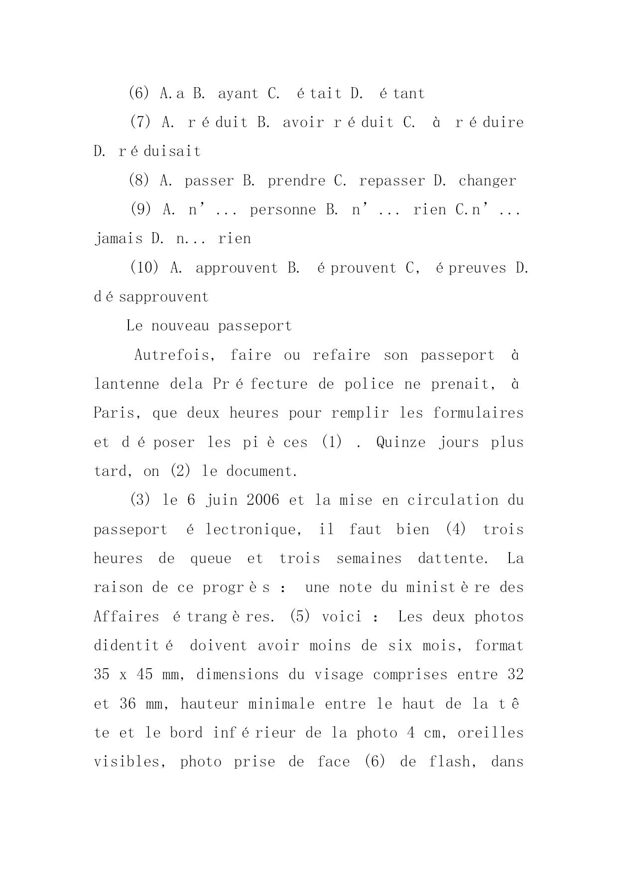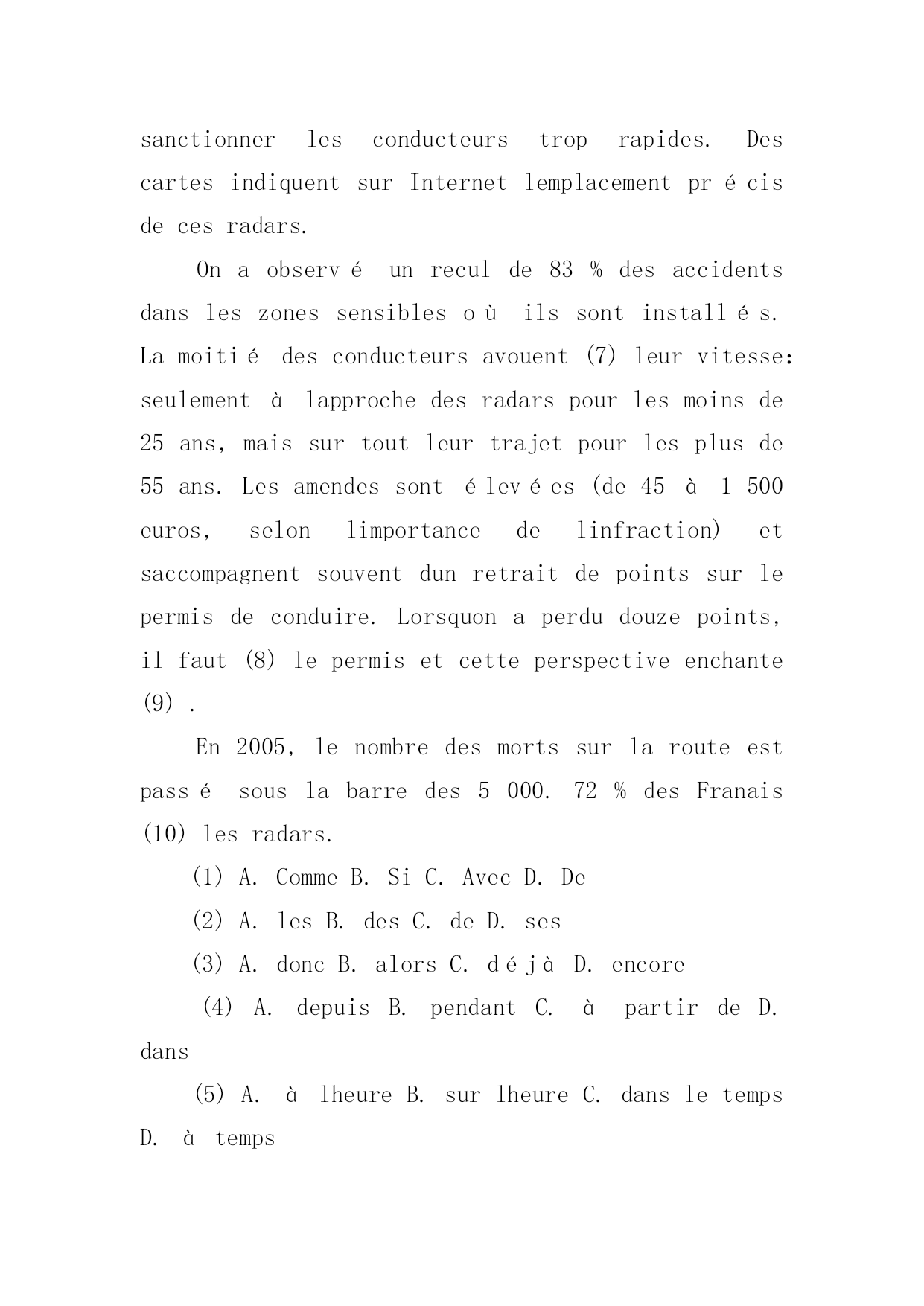 法语翻译资格考试试题及答案 法语翻译资格考试试题及答案在学习和工作中,只要有考核要求,就会有试题,通过试题可以检测参试者所掌握的知识和技能。什么样的试题才是科学规范的试题呢?以下是小编整理的法语翻译资格考试试题及答案,欢迎阅读与收藏。法语翻译资格考试试题及答案1LesradarsLesFranaisroulentbeaucouptropvite.Lannée1972avaitététellementmeurtrière(12000mortssurlesroutes)quelegouvernementavaitinstaurélobligationduportdelaceinturedesécuritéetleslimitationsdevitesse.(1)laceintureaprotégé(2)nombreusesvies(7242mortsen2002),lesFranaisnerespectaientguèreleslimitationsdevitesse.Legouvernementa(3)décidédinstallerdesradarsdansleszonesdangereuses(4)lafin2003.Cesgrossesbotesgrisesphotographientlesvéhiculesquidépassentlavitesseautorisée.Lesautomobilistessontprévenusquelquesmètresplusttparunpanneauafinderalentir(5),lobjectif(6)plusdelimiterlesaccidentsquedesanctionnerlesconducteurstroprapides.DescartesindiquentsurInternetlemplacementprécisdecesradars.Onaobservéunreculde83%desaccidentsdansleszonessensiblesoùilssontinstallés.Lamoitiédesconducteursavouent(7)leurvitesse:seulementàlapprochedesradarspourlesmoinsde25ans,maissurtoutleurtrajetpourlesplusde55ans.Lesamendessontélevées(de45à1500euros,selonlimportancedelinfraction)etsaccompagnentsouventdunretraitdepointssurlepermisdeconduire.Lorsquonaperdudouzepoints,ilfaut(8)lepermisetcetteperspectiveenchante(9).En2005,lenombredesmortssurlarouteestpassésouslabarredes5000.72%desFranais(10)lesradars.(1)A.CommeB.SiC.AvecD.De(2)A.lesB.desC.deD.ses(3)A.doncB.alorsC.déjàD.encore(4)A.depuisB.pendantC.àpartirdeD.dans(5)A.àlheureB.surlheureC.dansletempsD.àtemps(6)A.aB.ayantC.étaitD.étant(7)A.réduitB.avoirréduitC.àréduireD.réduisait(8)A.passerB.prendreC.repasserD.changer(9)A.n’...personneB.n’...rienC.n’...jamaisD.n...rien(10)A.approuventB.éprouventC,épreuvesD.désapprouventLenouveaupasseportAutrefois,faireourefairesonpasseportàlantennedelaPréfecturedepoliceneprenait,àParis,quedeuxheurespourremplirlesformulairesetdéposerlespièces(1).Quinzejoursplustard,on(2)ledocument.(3)le6juin2006etlamiseencirculationdupasseportélectronique,ilfautbien(4)troisheuresdequeueettroissemainesdattente.Laraiso