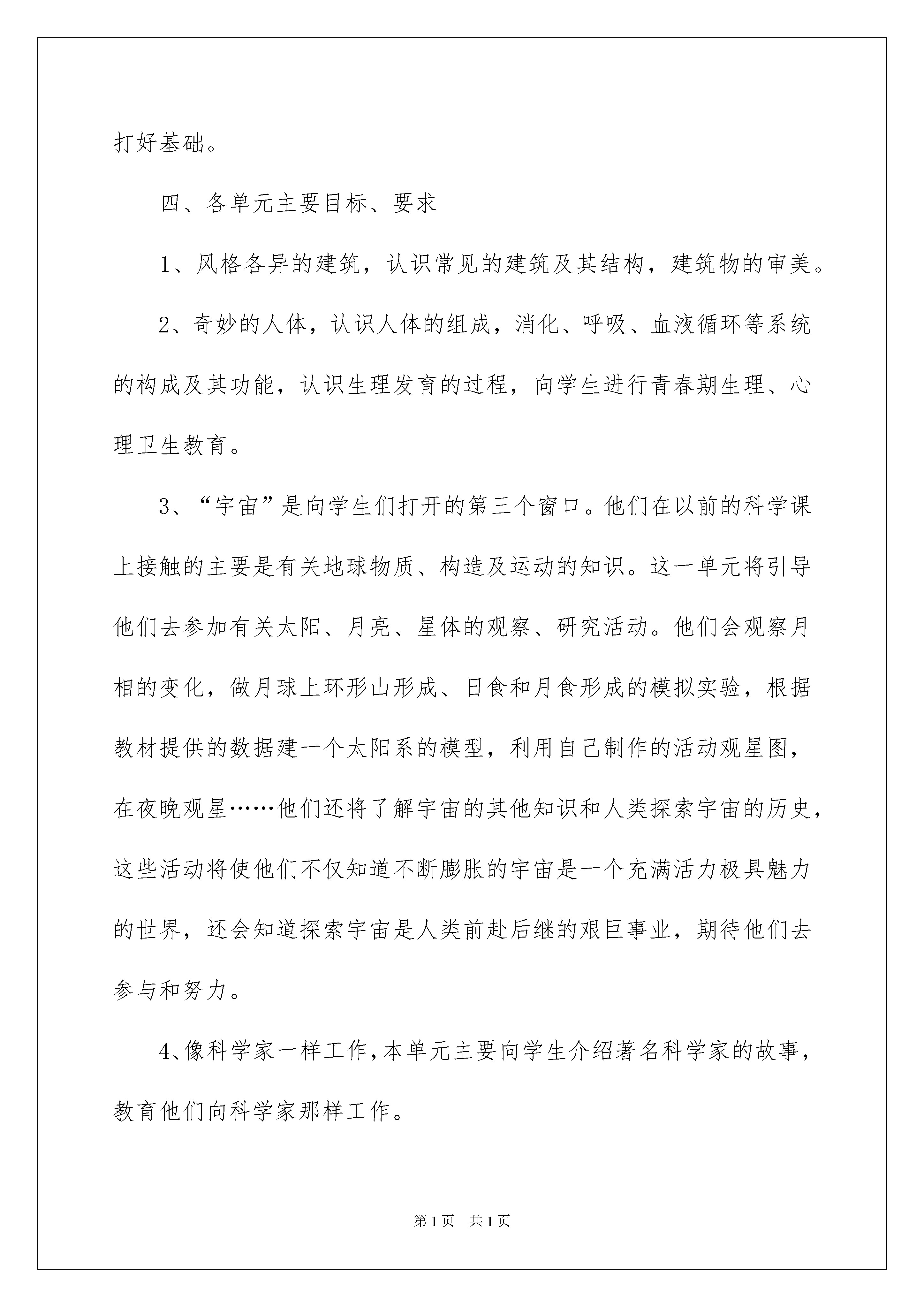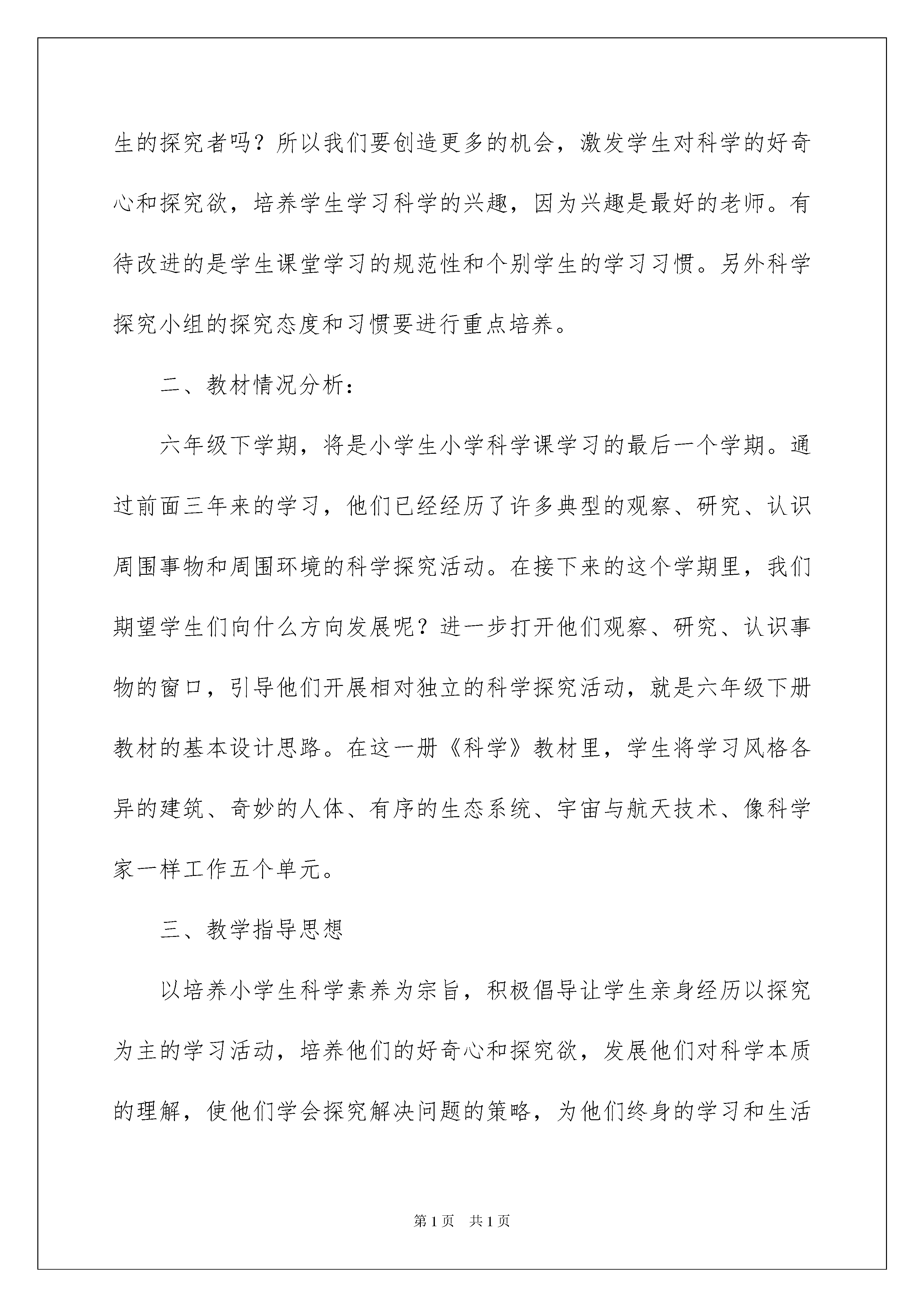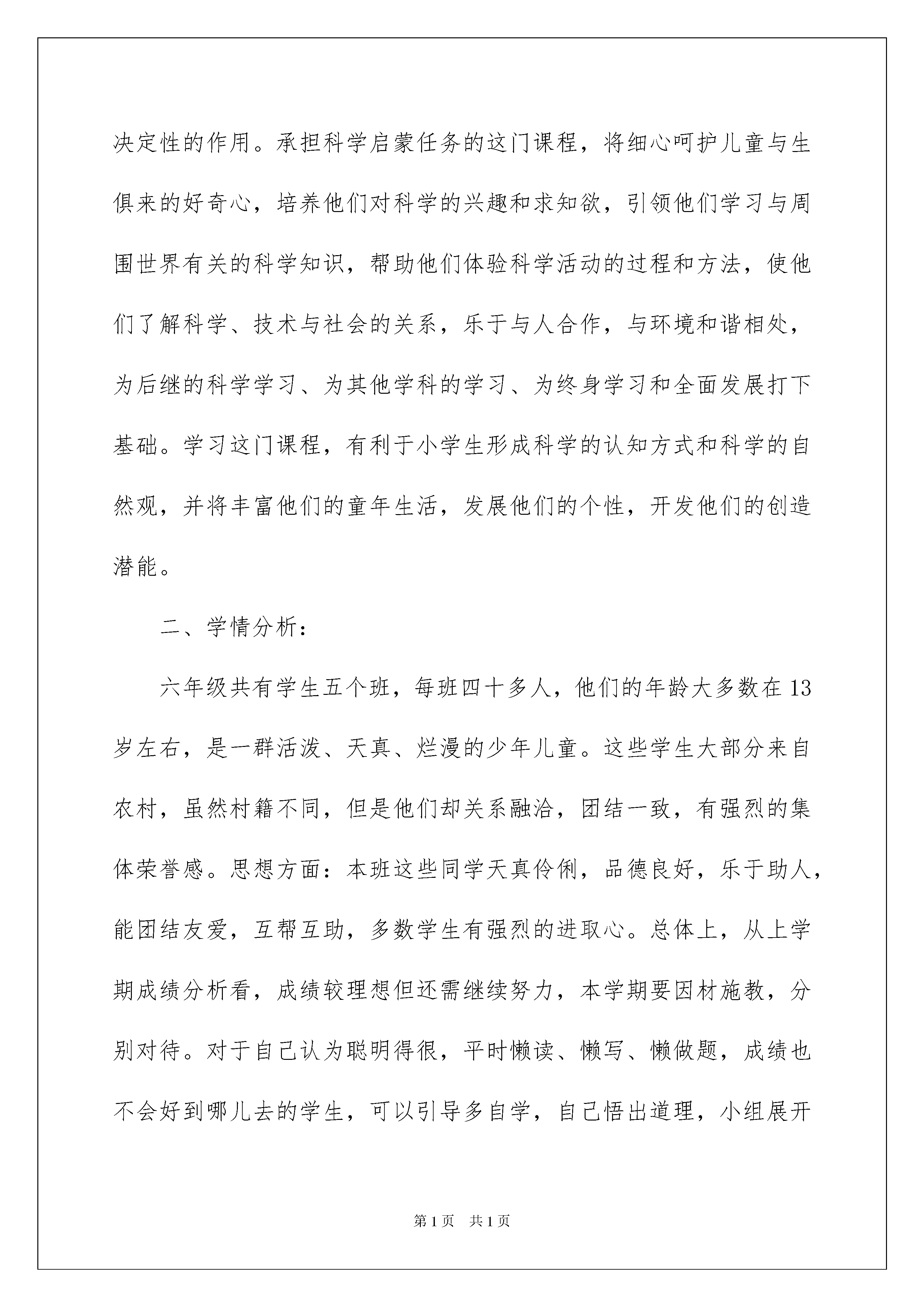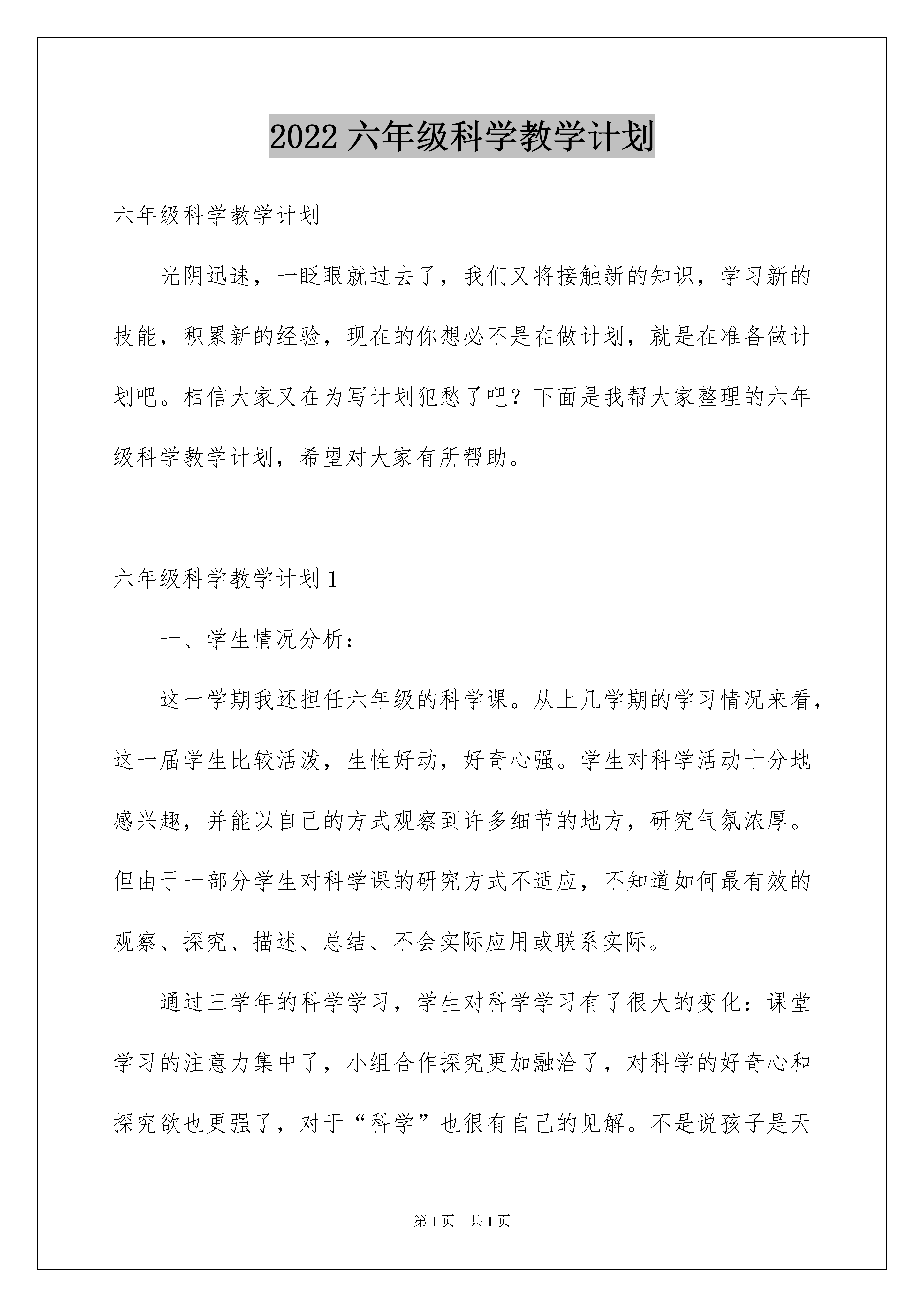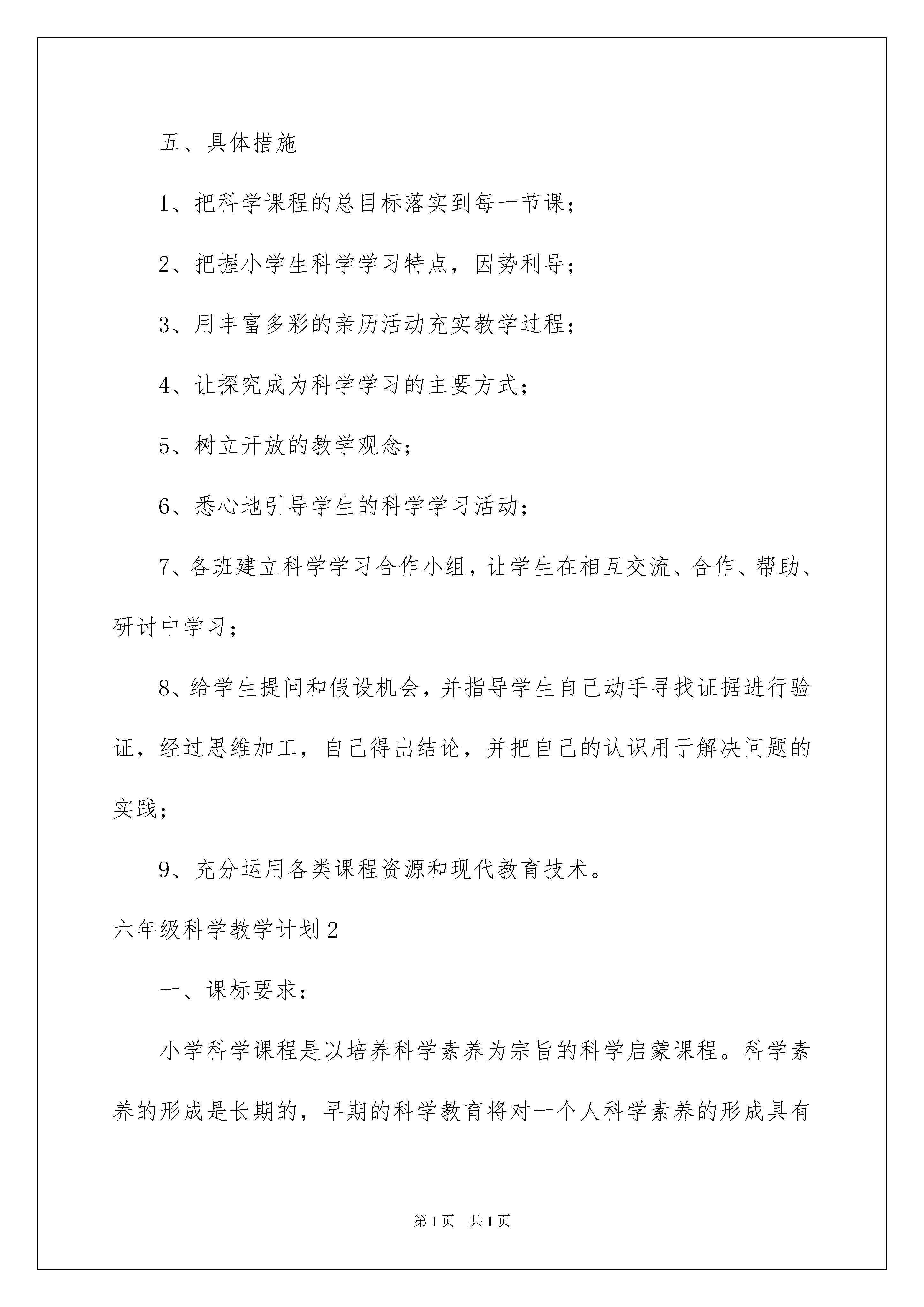 2022六年级科学教学计划六年级科学教学计划光阴迅速,一眨眼就过去了,我们又将接触新的知识,学习新的技能,积累新的经验,现在的你想必不是在做计划,就是在准备做计划吧。相信大家又在为写计划犯愁了吧?下面是我帮大家整理的六年级科学教学计划,希望对大家有所帮助。六年级科学教学计划1一、学生情况分析:这一学期我还担任六年级的科学课。从上几学期的学习情况来看,这一届学生比较活泼,生性好动,好奇心强。学生对科学活动十分地感兴趣,并能以自己的方式观察到许多细节的地方,研究气氛浓厚。但由于一部分学生对科学课的研究方式不适应,不知道如何最有效的观察、探究、描述、总结、不会实际应用或联系实际。通过三学年的科学学习,学生对科学学习有了很大的变化:课堂学习的注意力集中了,小组合作探究更加融洽了,对科学的好奇心和探究欲也更强了,对于“科学”也很有自己的见解。不是说孩子是天生的探究者吗?所以我们要创造更多的机会,激发学生对科学的好奇心和探究欲,培养学生学习科学的兴趣,因为兴趣是最好的老师。有待改进的是学生课堂学习的规范性和个别学生的学习习惯。另外科学探究小组的探究态度和习惯要进行重点培养。二、教材情况分析:六年级下学期,将是小学生小学科学课学习的最后一个学期。通过前面三年来的学习,他们已经经历了许多典型的观察、研究、认识周围事物和周围环境的科学探究活动。在接下来的这个学期里,我们期望学生们向什么方向发展呢?进一步打开他们观察、研究、认识事物的窗口,引导他们开展相对独立的科学探究活动,就是六年级下册教材的基本设计思路。在这一册《科学》教材里,学生将学习风格各异的建筑、奇妙的人体、有序的生态系统、宇宙与航天技术、像科学家一样工作五个单元。三、教学指导思想以培养小学生科学素养为宗旨,积极倡导让学生亲身经历以探究为主的学习活动,培养他们的好奇心和探究欲,发展他们对科学本质的理解,使他们学会探究解决问题的策略,为他们终身的学习和生活打好基础。四、各单元主要目标、要求1、风格各异的建筑,认识常见的建筑及其结构,建筑物的审美。2、奇妙的人体,认识人体的组成,消化、呼吸、血液循环等系统的构成及其功能,认识生理发育的过程,向学生进行青春期生理、心理卫生教育。3、“宇宙”是向学生们打开的第三个窗口。他们在以前的科学课上接触的主要是有关地球物质、构造及运动的知识。这一单元将引导他们去参加有关太阳、月亮、星体的观察、研究活动。他们会观察月相的变化,做月球上环形山形成、日食和月食形成的模拟实验,根据教材提供的数据建一个太阳系的模型,利用自己制作的活动观星图,在夜晚观星……他们还将了解宇宙的其他知识和人类探索宇宙的历史,这些活动将使他们不仅知道不断膨胀的宇宙是一个充满活力极具魅力的世界,还会知道探索宇宙是人类前赴后继的艰巨事业,期待他们去参与和努力。4、像科学家一样工作,本单元主要向学生介绍著名科学家的故事,教育他们向科学家那样工作。五、具体措施1、把科学课程的总目标落实到每一节课;2、把握小学生科学学习特点,因势利导;3、用丰富多彩的亲历活动充实教学过程;4、让探究成为科学学习的主要方式;5、树立开放的教学观念;6、悉心地引导学生的科学学习活动;7、各班建立科学学习合作小组,让学生在相互交流、合作、帮助、研讨中学习;8、给学生提问和假设机会,并指导学生自己动手寻找证据进行验证,经过思维加工,自己得出结论,并把自己的认识用于解决问题的实践;9、充分运用各类课程资源和现代教育技术。六年级科学教学计划2一、课标要求:小学科学课程是以培养科学素养为宗旨的科学启蒙课程。科学素养的形成是长期的,早期的科学教育将对一个人科学素养的形成具有决定性的作用。承担科学启蒙任务的这门课程,将细心呵护儿童与生俱来的好奇心,培养他们对科学的兴趣和求知欲,引领他们学习与周围世界有关的科学知识,帮助他们体验科学活动的过程和方法,使他们了解科学、技术与社会的关系,乐于与人合作,与环境和谐相处,为后继的科学学习、为其他学科的学习、为终身学习和全面发展打下基础。学习这门课程,有利于小学生形成科学的认知方式和科学的自然观,并将丰富他们的童年生活,发展他们的个性,开发他们的创造潜能。二、学情分析:六年级共有学生五个班,每班四十多人,他们的年龄大多数在13岁左右,是一群活泼、天真、烂漫的少年儿童。这些学生大部分来自农村,虽然村籍不同,但是他们却关系融洽,团结一致,有强烈的集体荣誉感。思想方面:本班这些同学天真伶俐,品德良好,乐于助人,能团结友爱,互帮互助,多数学生有强烈的进取心。总体上,从上学期成绩分析看,成绩较理想但还需继续努力,本学期要因材施教,分别对待。对于自己