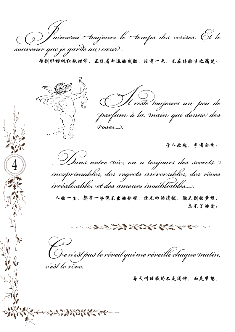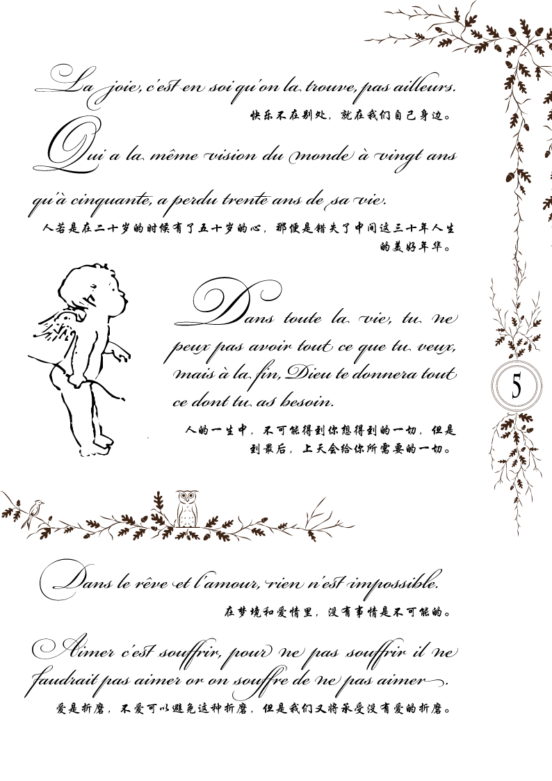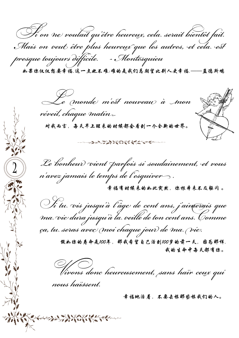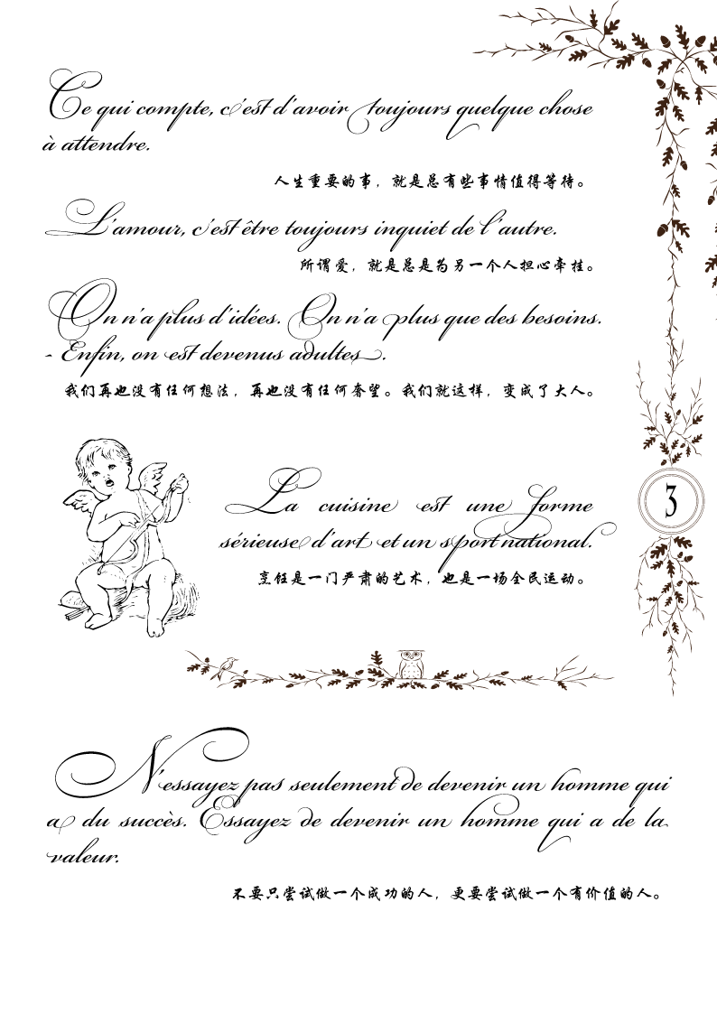 dela Alorsd'unechoseàl'autre,M.Hamelsemità nousparlerdelalanguefrançaise,disantquec'étaitla plusbellelanguedumonde,laplusclaire,laplussolide. -AlphonseDaudet- Sionnevoulaitqu'êtreheureux,celaseraitbientôtfait. Maisonveutêtreplusheureuxquelesautres,etcelaest presque如果你仅仅想要幸福,这一点也不难;难的是我们总期望比别人更幸福.——孟德斯鸠toujoursdifficile.-Montesquieu Lemondem'estnouveauàmon réveil,对我而言,每天早上醒来的时候都会看到一个全新的世界。chaquematin. 2Lebonheurvientparfoissisoudainement,etvous n'avezjamaisletemps幸福有时候来的如此突然,你根本来不及躲闪del'esquiver.。 Situvisjusqu'àl'âgedecentans,j'aimeraisque maviedurajusqu'àlaveilledetoncentans.Comme ça,tu假如你的寿命是100年,那我希望自己活到100岁的前一天,因为那样,serasavecmoichaquejourdemavie. 我的生命中每天都有你。 Vivonsdoncheureusement,sanshaïrceuxqui noushaïssent.幸福地活着,不要去恨那些恨我们的人。 Cequicompte,c'estd'avoirtoujoursquelquechose àattendre.人生重要的事,就是总有些事情值得等待。 L'amour,c'estêtre所谓爱,就是总是为另一个人担心牵挂。toujoursinquietdel'autre. Onn'aplusd'idées.Onn'aplusquedesbesoins. -Enfin,我们再也没有任何想法,再也没有任何奢望。我们就这样,变成了大人。onestdevenusadultes. 3 Lacuisineestuneforme sérieuse烹饪是一门严肃的艺术,也是一场全民运动。d'artetunsportnational. essayezpasseulementdedevenirunhommequi aN'dusuccès.Essayezdedevenirunhommequiadela valeur.不要只尝试做一个成功的人,更要尝试做一个有价值的人。 J'aimeraitoujoursletempsdescerises.Etle souvenir待到那樱桃红艳时节,正视着命运的残酷,没有一天,不在体验生之痛楚。quejegardeaucœur. lrestetoujoursunpeude parfumIàlamainquidonnedes roses. 予人玫瑰,手有余香。 4Dansnotrevie,onatoujoursdessecrets inexprimables,desregretsirréversibles,desrêves irréalisables人的一生,都有一些说不出的秘密,挽不回的遗憾,触不到的梦想,etdesamoursinoubliables. 忘不了的爱。 Cen'estpasleréveilquimeréveillechaquematin, c'estlerêve.每天叫醒我的不是闹钟,而是梦想。 Lajoie,c'estensoiqu'on快乐不在别处,就在我们自己身边。latrouve,pasailleurs. Quialamêmevisiondumondeàvingtans qu'à人若是在二十岁的时候有了五十岁的心,那便是错失了中间这三十年人生cinquante,aperdutrenteansdesavie. 的美好年华。 anstoutelavie,tune peuxDpasavoirtoutcequetuveux, maisàlafin,Dieutedonneratout5 ce人的一生中,不可能得到你想得到的一切,但是donttuasbesoin. 到最后,上天会给你所需要的一切。 Danslerêveetl'amour,在梦境和爱情里,没有事情是不可能的。rienn'estimpossible. Aimerc'estsouffrir,pournepassouffririlne faudrai
