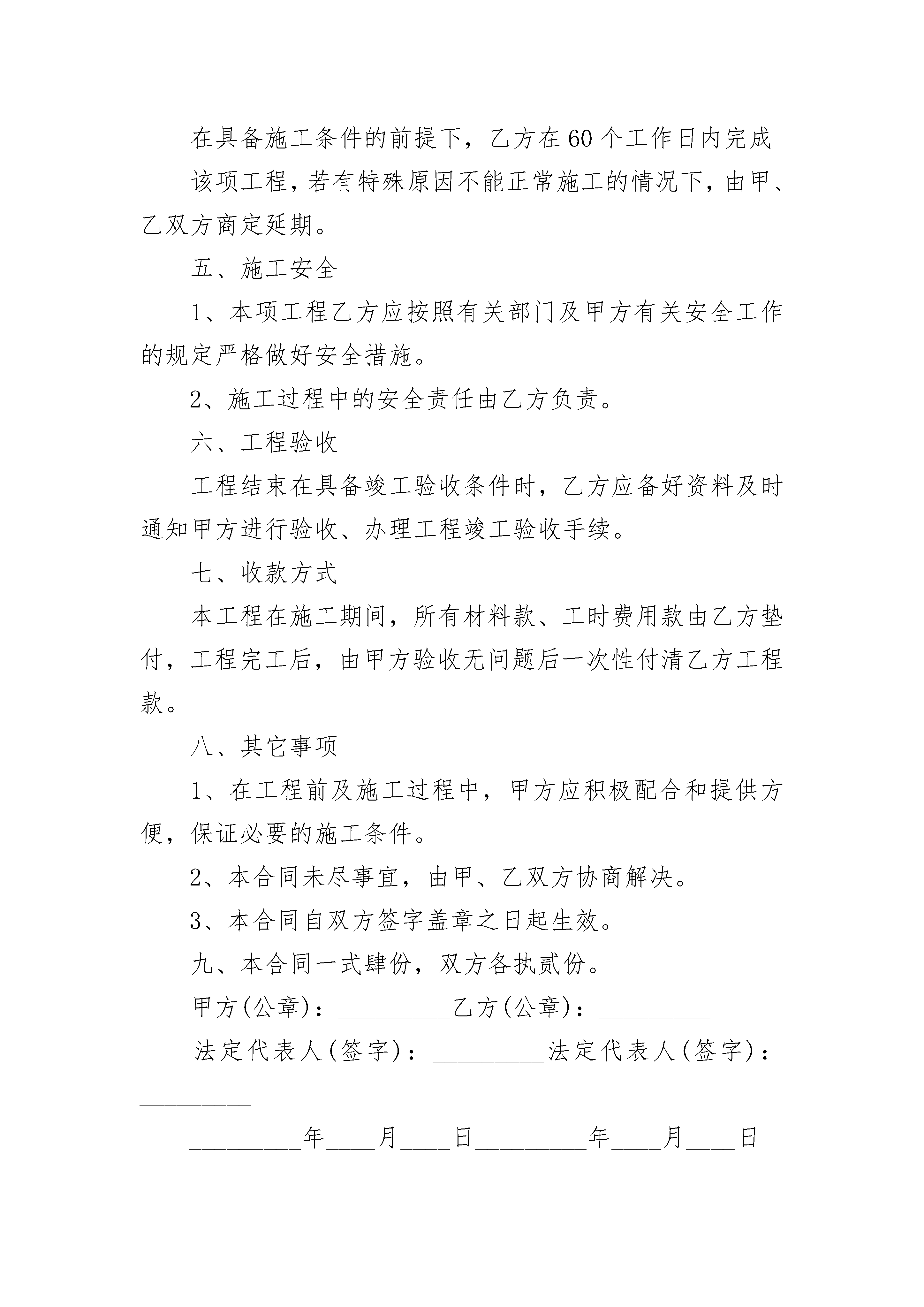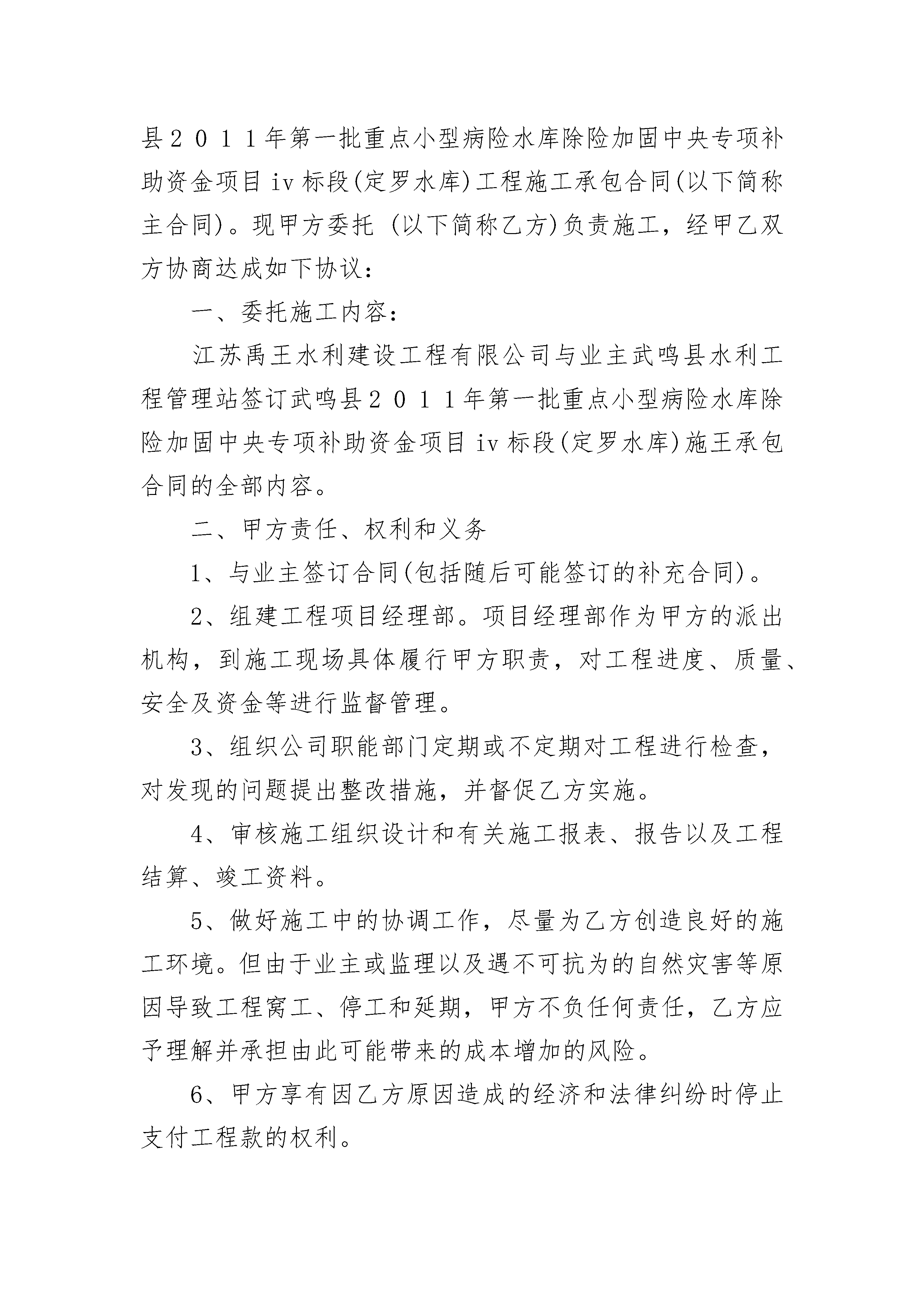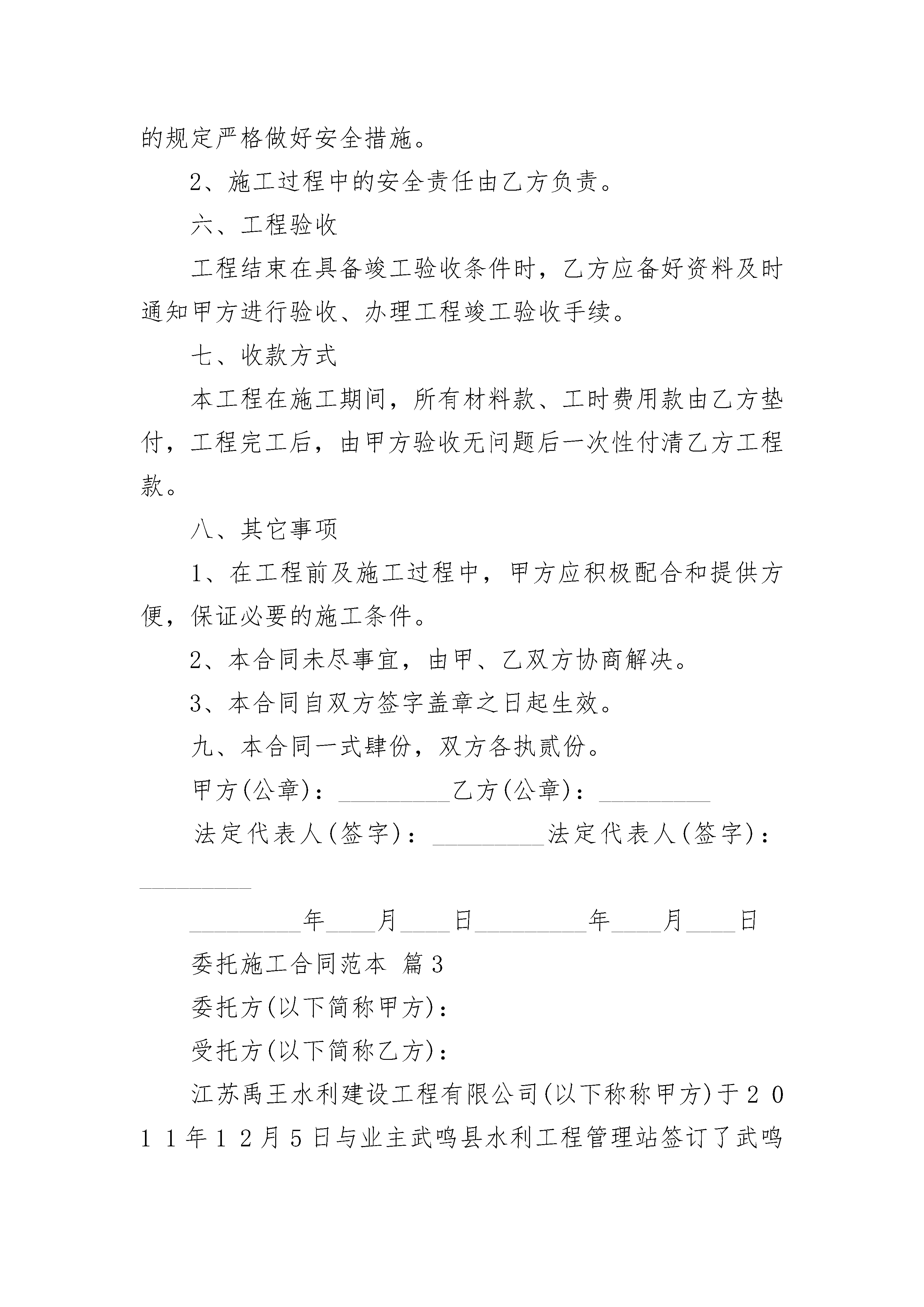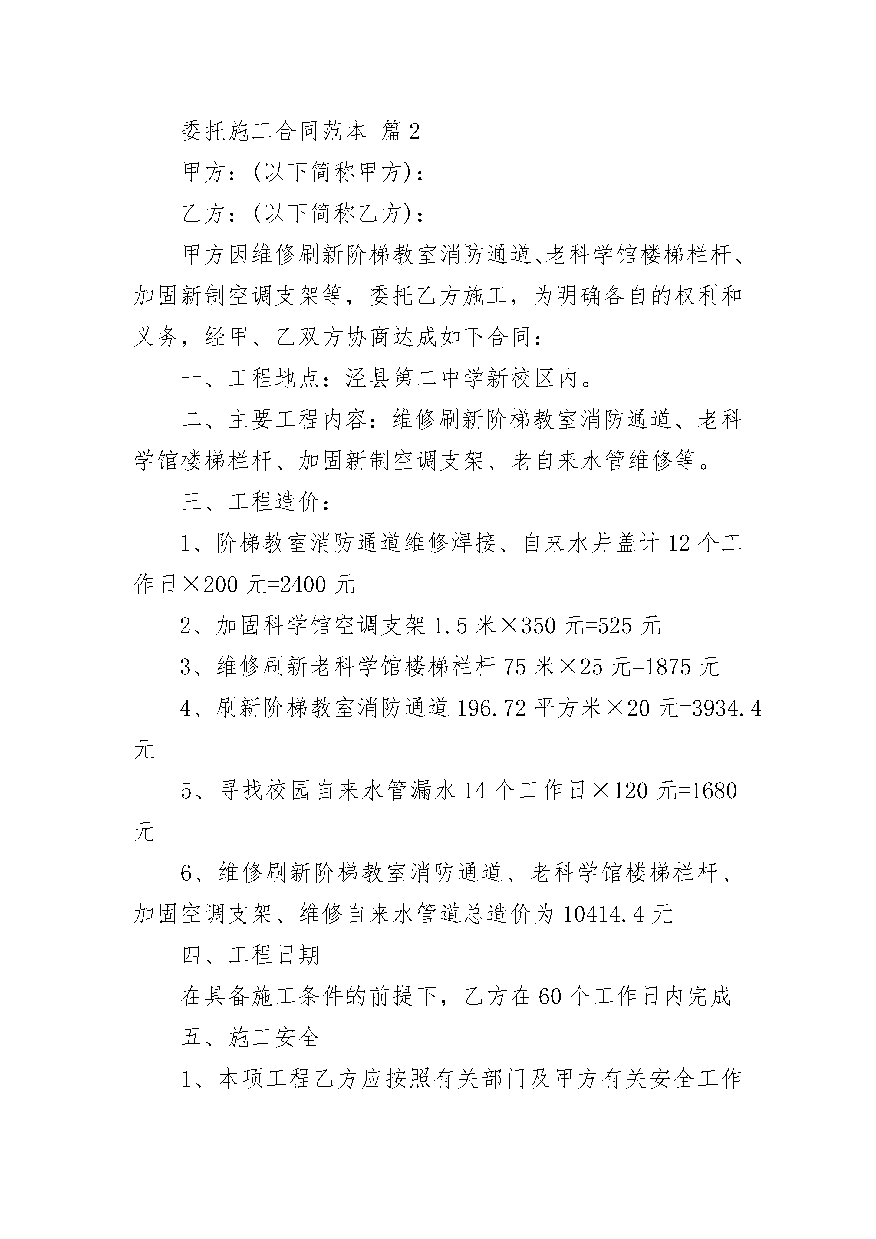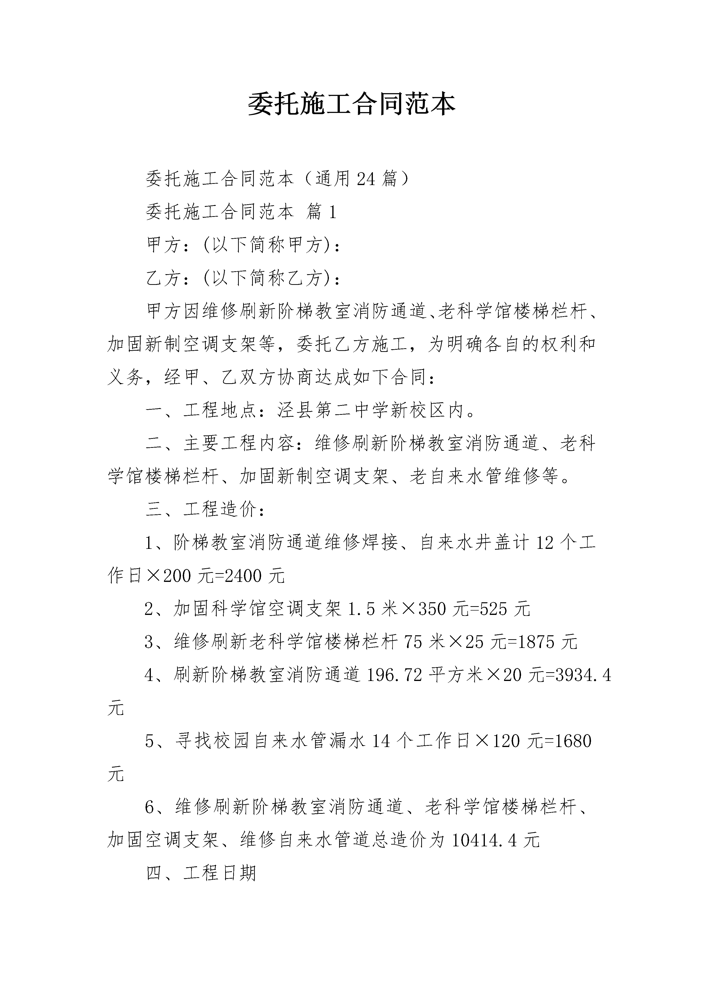 委托施工合同范本委托施工合同范本(通用24篇)委托施工合同范本篇1甲方:(以下简称甲方):乙方:(以下简称乙方):甲方因维修刷新阶梯教室消防通道、老科学馆楼梯栏杆、加固新制空调支架等,委托乙方施工,为明确各自的权利和义务,经甲、乙双方协商达成如下合同:一、工程地点:泾县第二中学新校区内。二、主要工程内容:维修刷新阶梯教室消防通道、老科学馆楼梯栏杆、加固新制空调支架、老自来水管维修等。三、工程造价:1、阶梯教室消防通道维修焊接、自来水井盖计12个工作日×200元=2400元2、加固科学馆空调支架1.5米×350元=525元3、维修刷新老科学馆楼梯栏杆75米×25元=1875元4、刷新阶梯教室消防通道196.72平方米×20元=3934.4元5、寻找校园自来水管漏水14个工作日×120元=1680元6、维修刷新阶梯教室消防通道、老科学馆楼梯栏杆、加固空调支架、维修自来水管道总造价为10414.4元四、工程日期在具备施工条件的前提下,乙方在60个工作日内完成该项工程,若有特殊原因不能正常施工的情况下,由甲、乙双方商定延期。五、施工安全1、本项工程乙方应按照有关部门及甲方有关安全工作的规定严格做好安全措施。2、施工过程中的安全责任由乙方负责。六、工程验收工程结束在具备竣工验收条件时,乙方应备好资料及时通知甲方进行验收、办理工程竣工验收手续。七、收款方式本工程在施工期间,所有材料款、工时费用款由乙方垫付,工程完工后,由甲方验收无问题后一次性付清乙方工程款。八、其它事项1、在工程前及施工过程中,甲方应积极配合和提供方便,保证必要的施工条件。2、本合同未尽事宜,由甲、乙双方协商解决。3、本合同自双方签字盖章之日起生效。九、本合同一式肆份,双方各执贰份。甲方(公章):_________乙方(公章):_________法定代表人(签字):_________法定代表人(签字):__________________年____月____日_________年____月____日委托施工合同范本篇2甲方:(以下简称甲方):乙方:(以下简称乙方):甲方因维修刷新阶梯教室消防通道、老科学馆楼梯栏杆、加固新制空调支架等,委托乙方施工,为明确各自的权利和义务,经甲、乙双方协商达成如下合同:一、工程地点:泾县第二中学新校区内。二、主要工程内容:维修刷新阶梯教室消防通道、老科学馆楼梯栏杆、加固新制空调支架、老自来水管维修等。三、工程造价:1、阶梯教室消防通道维修焊接、自来水井盖计12个工作日×200元=2400元2、加固科学馆空调支架1.5米×350元=525元3、维修刷新老科学馆楼梯栏杆75米×25元=1875元4、刷新阶梯教室消防通道196.72平方米×20元=3934.4元5、寻找校园自来水管漏水14个工作日×120元=1680元6、维修刷新阶梯教室消防通道、老科学馆楼梯栏杆、加固空调支架、维修自来水管道总造价为10414.4元四、工程日期在具备施工条件的前提下,乙方在60个工作日内完成五、施工安全1、本项工程乙方应按照有关部门及甲方有关安全工作的规定严格做好安全措施。2、施工过程中的安全责任由乙方负责。六、工程验收工程结束在具备竣工验收条件时,乙方应备好资料及时通知甲方进行验收、办理工程竣工验收手续。七、收款方式本工程在施工期间,所有材料款、工时费用款由乙方垫付,工程完工后,由甲方验收无问题后一次性付清乙方工程款。八、其它事项1、在工程前及施工过程中,甲方应积极配合和提供方便,保证必要的施工条件。2、本合同未尽事宜,由甲、乙双方协商解决。3、本合同自双方签字盖章之日起生效。九、本合同一式肆份,双方各执贰份。甲方(公章):_________乙方(公章):_________法定代表人(签字):_________法定代表人(签字):__________________年____月____日_________年____月____日委托施工合同范本篇3委托方(以下简称甲方):受托方(以下简称乙方):江苏禹王水利建设工程有限公司(以下称称甲方)于2011年12月5日与业主武鸣县水利工程管理站签订了武鸣县2011年第一批重点小型病险水库除险加固中央专项补助资金项目iv标段(定罗水库)工程施工承包合同(以下简称主合同)。现甲方委托(以下简称乙方)负责施工,经甲乙双方协商达成如下协议:一、委托施工内容:江苏禹王水利建设工程有限公司与业主武鸣县水利工程管理站签订武鸣县2011年第一批重点小型病险水库除险加固中央专项补助资金项目iv标段(定罗水库)施王承包合同的全部内容。二、甲方责任、权利和义务1、与业主签订合同(包括随后可能签订的补充合同)。2、组建工程项目经理部。项目经理部作为甲方的派出机构,到施工现场具体履行甲方职责,对工程进度、质量、安全及资金等进行监督管理。3、组