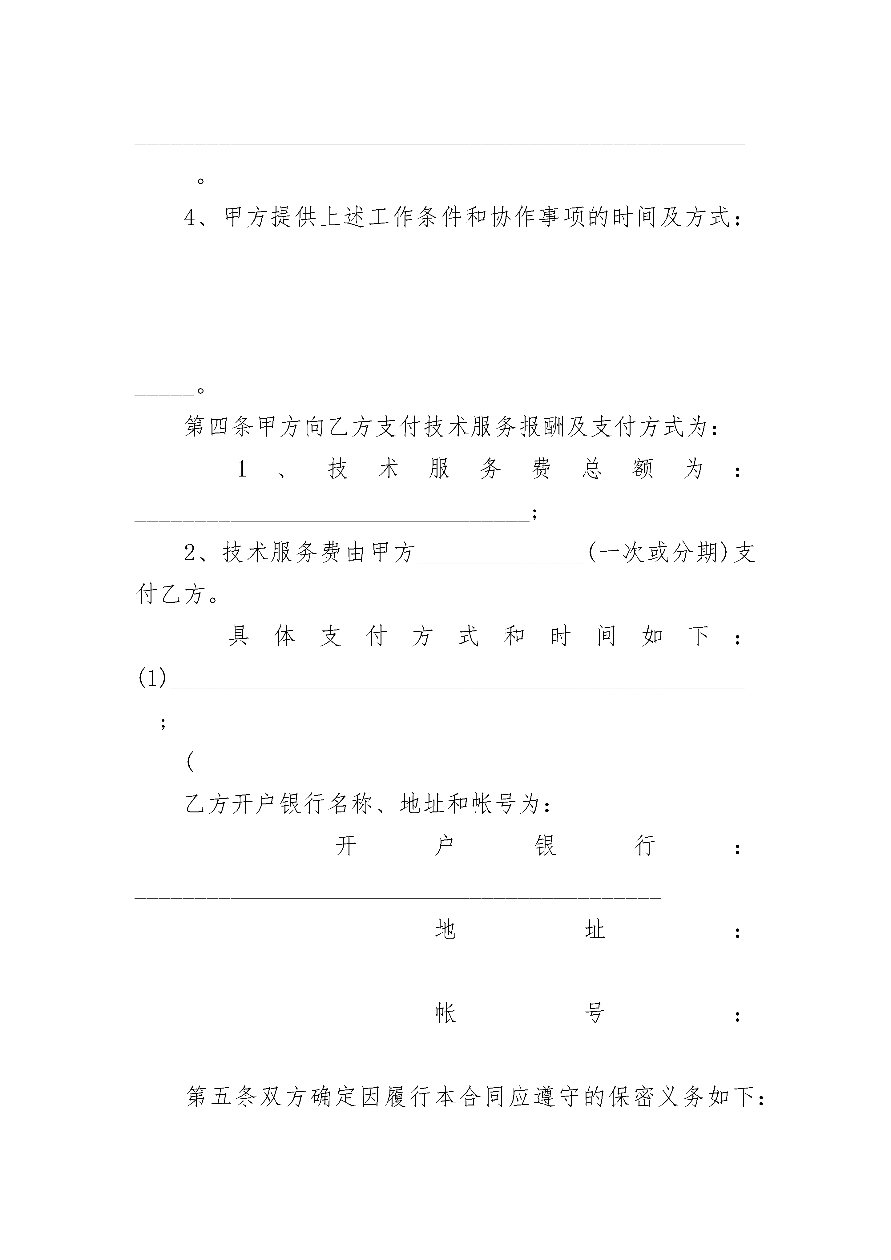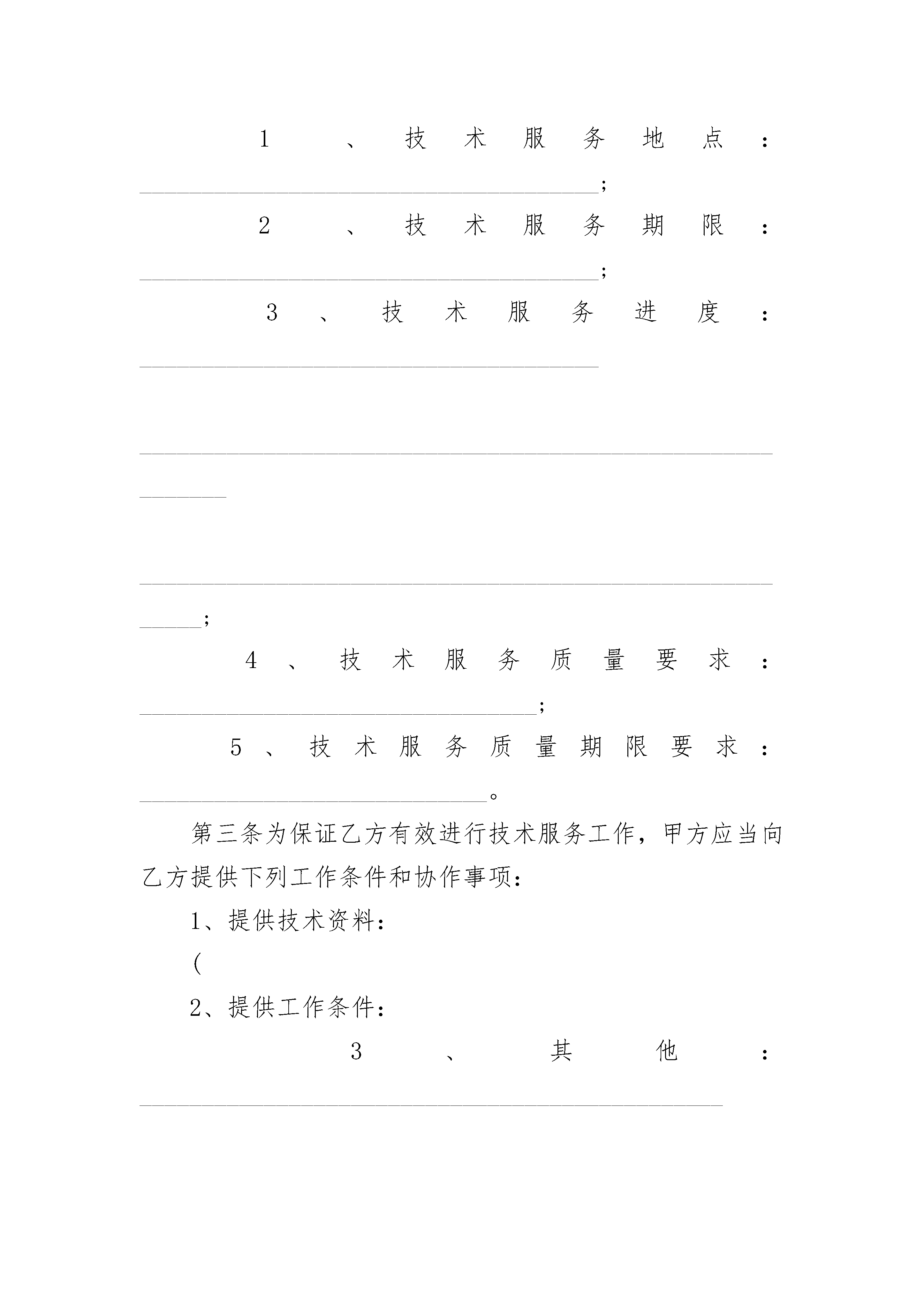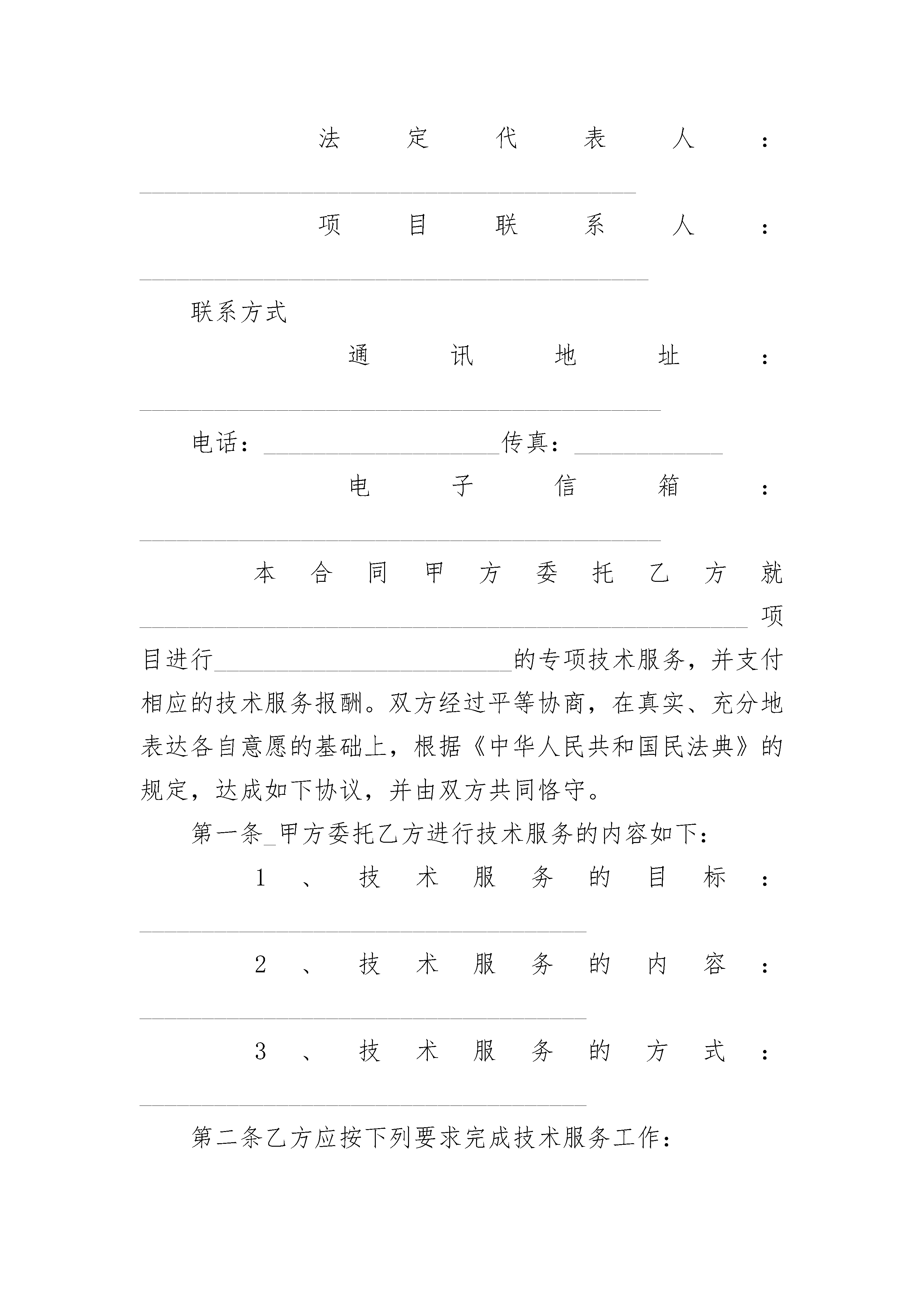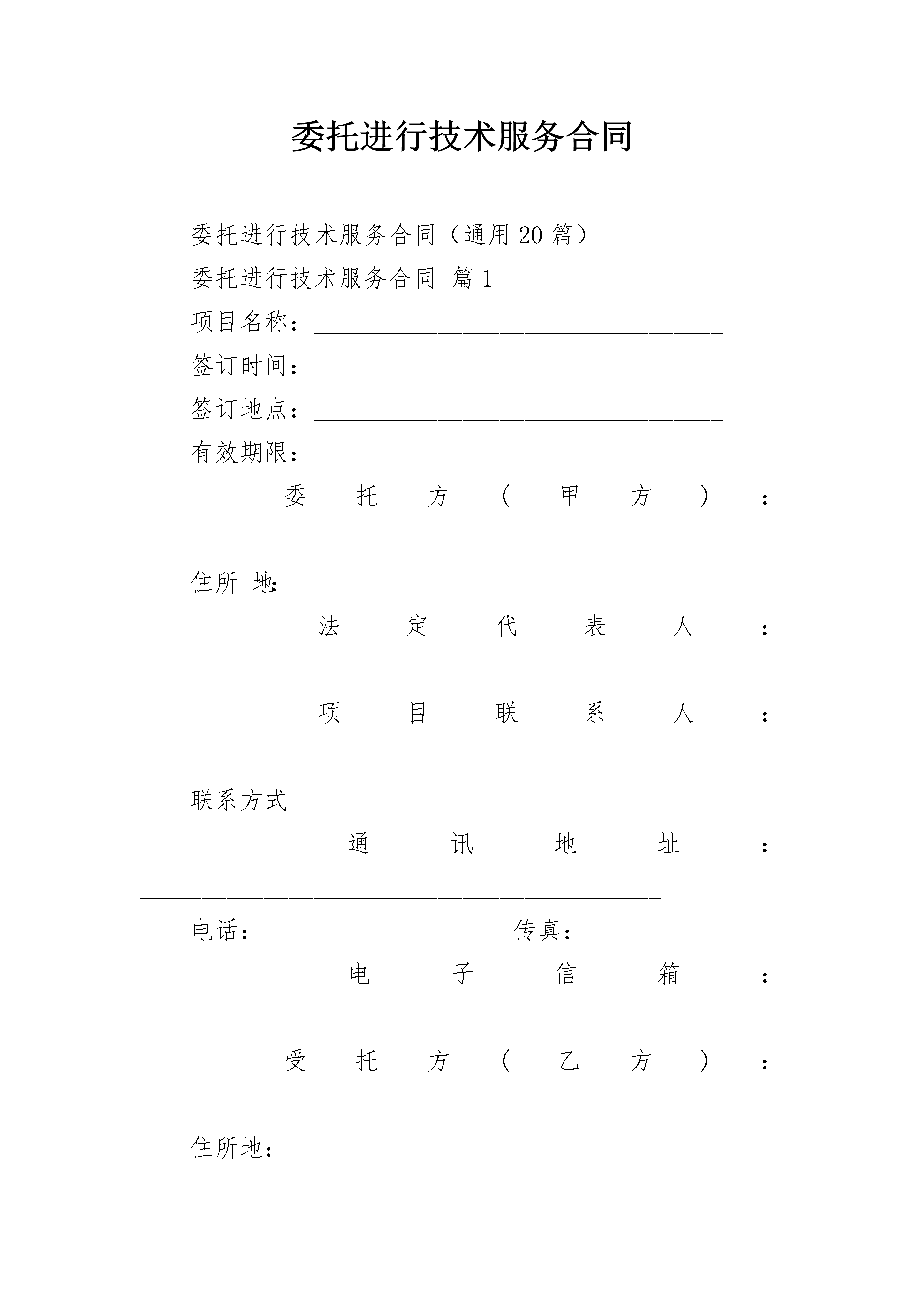 委托进行技术服务合同委托进行技术服务合同(通用20篇)委托进行技术服务合同篇1项目名称:_________________________________签订时间:_________________________________签订地点:_________________________________有效期限:_________________________________委托方(甲方):_______________________________________住所_地:________________________________________法定代表人:________________________________________项目联系人:________________________________________联系方式通讯地址:__________________________________________电话:____________________传真:____________电子信箱:__________________________________________受托方(乙方):_______________________________________住所地:________________________________________法定代表人:________________________________________项目联系人:_________________________________________联系方式通讯地址:__________________________________________电话:___________________传真:____________电子信箱:__________________________________________本合同甲方委托乙方就_________________________________________________项目进行________________________的专项技术服务,并支付相应的技术服务报酬。双方经过平等协商,在真实、充分地表达各自意愿的基础上,根据《中华人民共和国民法典》的规定,达成如下协议,并由双方共同恪守。第一条_甲方委托乙方进行技术服务的内容如下:1、技术服务的目标:____________________________________2、技术服务的内容:____________________________________3、技术服务的方式:____________________________________第二条乙方应按下列要求完成技术服务工作:1、技术服务地点:_____________________________________;2、技术服务期限:_____________________________________;3、技术服务进度:_______________________________________________________________________________________________________________________________________________________;4、技术服务质量要求:________________________________;5、技术服务质量期限要求:____________________________。第三条为保证乙方有效进行技术服务工作,甲方应当向乙方提供下列工作条件和协作事项:1、提供技术资料:(2、提供工作条件:3、其他:_______________________________________________________________________________________________________。4、甲方提供上述工作条件和协作事项的时间及方式:________________________________________________________________。第四条甲方向乙方支付技术服务报酬及支付方式为:1、技术服务费总额为:_________________________________;2、技术服务费由甲方______________(一次或分期)支付乙方。具体支付方式和时间如下:(1)__________________________________________________;(乙方开户银行名称、地址和帐号为:开户银行:_____________________________