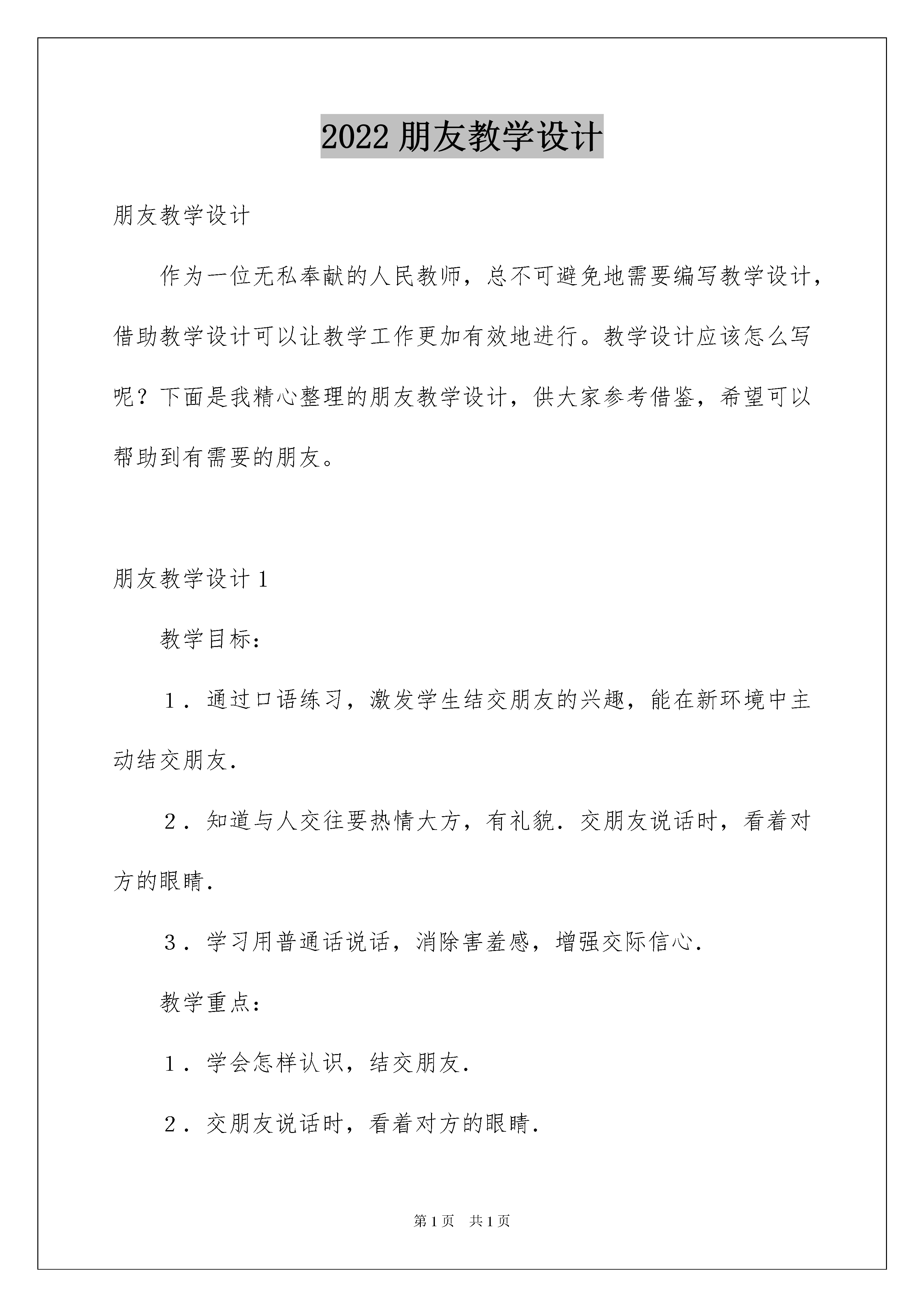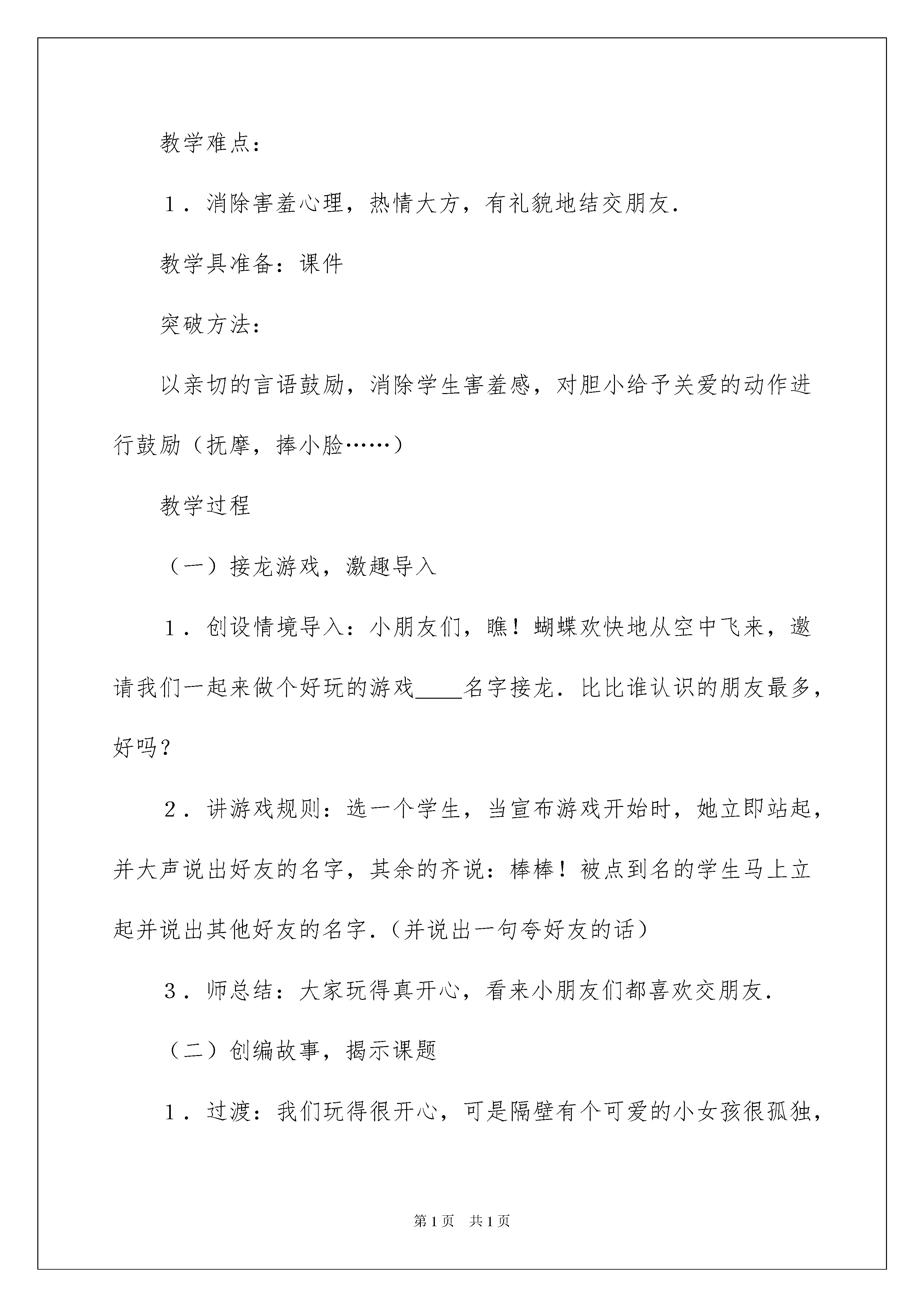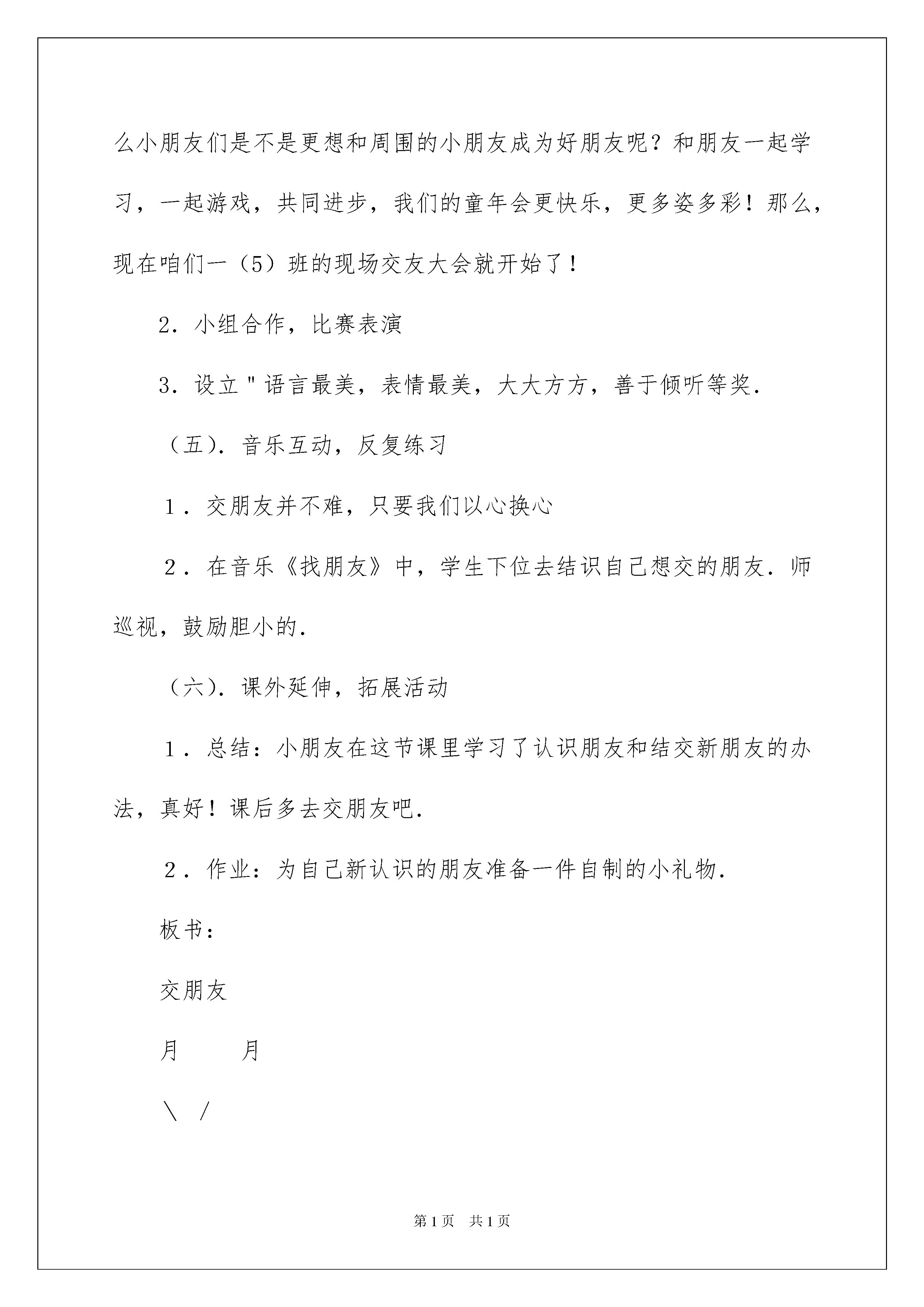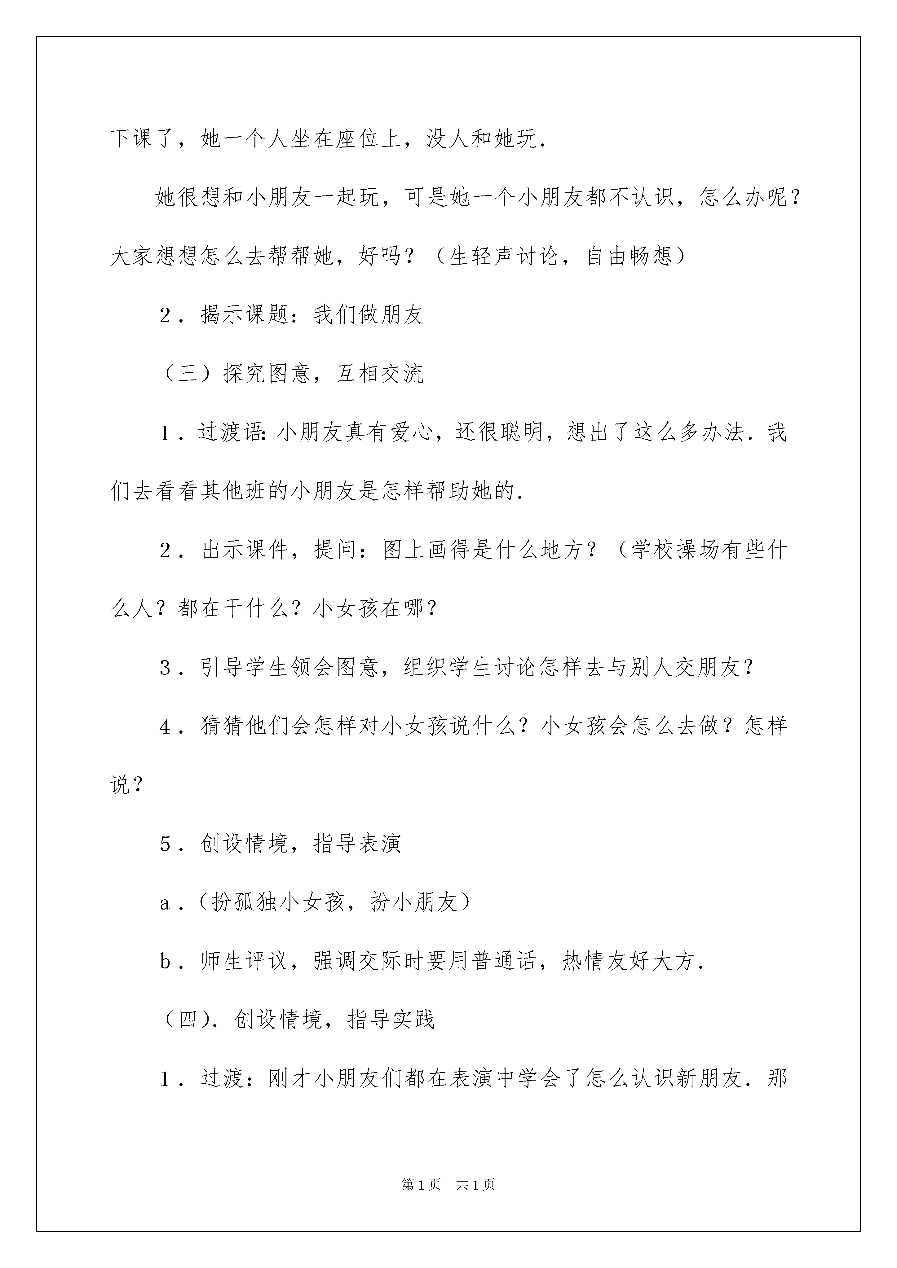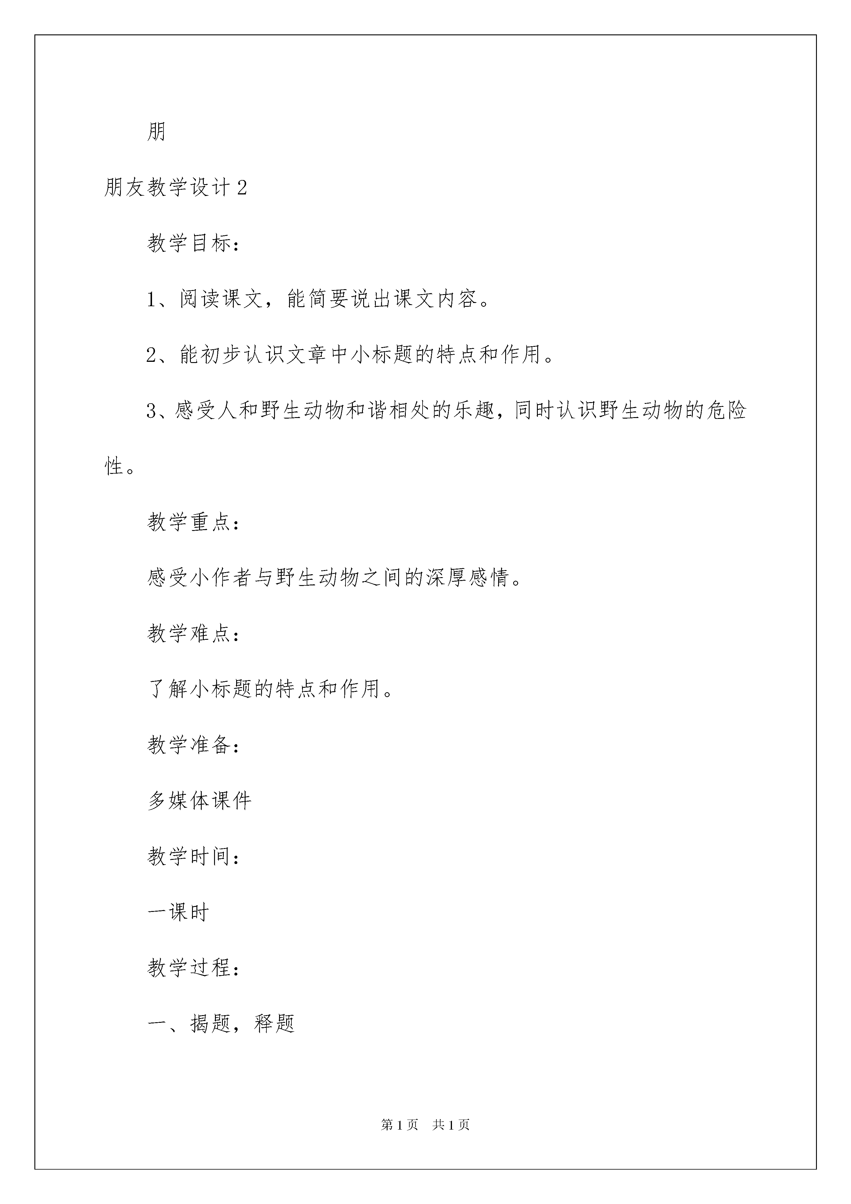 2022朋友教学设计朋友教学设计作为一位无私奉献的人民教师,总不可避免地需要编写教学设计,借助教学设计可以让教学工作更加有效地进行。教学设计应该怎么写呢?下面是我精心整理的朋友教学设计,供大家参考借鉴,希望可以帮助到有需要的朋友。朋友教学设计1教学目标:1.通过口语练习,激发学生结交朋友的兴趣,能在新环境中主动结交朋友.2.知道与人交往要热情大方,有礼貌.交朋友说话时,看着对方的眼睛.3.学习用普通话说话,消除害羞感,增强交际信心.教学重点:1.学会怎样认识,结交朋友.2.交朋友说话时,看着对方的眼睛.教学难点:1.消除害羞心理,热情大方,有礼貌地结交朋友.教学具准备:课件突破方法:以亲切的言语鼓励,消除学生害羞感,对胆小给予关爱的动作进行鼓励(抚摩,捧小脸……)教学过程(一)接龙游戏,激趣导入1.创设情境导入:小朋友们,瞧!蝴蝶欢快地从空中飞来,邀请我们一起来做个好玩的游戏__名字接龙.比比谁认识的朋友最多,好吗?2.讲游戏规则:选一个学生,当宣布游戏开始时,她立即站起,并大声说出好友的名字,其余的齐说:棒棒!被点到名的学生马上立起并说出其他好友的名字.(并说出一句夸好友的话)3.师总结:大家玩得真开心,看来小朋友们都喜欢交朋友.(二)创编故事,揭示课题1.过渡:我们玩得很开心,可是隔壁有个可爱的小女孩很孤独,下课了,她一个人坐在座位上,没人和她玩.她很想和小朋友一起玩,可是她一个小朋友都不认识,怎么办呢?大家想想怎么去帮帮她,好吗?(生轻声讨论,自由畅想)2.揭示课题:我们做朋友(三)探究图意,互相交流1.过渡语:小朋友真有爱心,还很聪明,想出了这么多办法.我们去看看其他班的小朋友是怎样帮助她的.2.出示课件,提问:图上画得是什么地方?(学校操场有些什么人?都在干什么?小女孩在哪?3.引导学生领会图意,组织学生讨论怎样去与别人交朋友?4.猜猜他们会怎样对小女孩说什么?小女孩会怎么去做?怎样说?5.创设情境,指导表演a.(扮孤独小女孩,扮小朋友)b.师生评议,强调交际时要用普通话,热情友好大方.(四).创设情境,指导实践1.过渡:刚才小朋友们都在表演中学会了怎么认识新朋友.那么小朋友们是不是更想和周围的小朋友成为好朋友呢?和朋友一起学习,一起游戏,共同进步,我们的童年会更快乐,更多姿多彩!那么,现在咱们一(5)班的现场交友大会就开始了!2.小组合作,比赛表演3.设立"语言最美,表情最美,大大方方,善于倾听等奖.(五).音乐互动,反复练习1.交朋友并不难,只要我们以心换心2.在音乐《找朋友》中,学生下位去结识自己想交的朋友.师巡视,鼓励胆小的.(六).课外延伸,拓展活动1.总结:小朋友在这节课里学习了认识朋友和结交新朋友的办法,真好!课后多去交朋友吧.2.作业:为自己新认识的朋友准备一件自制的小礼物.板书:交朋友月月\/朋朋友教学设计2教学目标:1、阅读课文,能简要说出课文内容。2、能初步认识文章中小标题的特点和作用。3、感受人和野生动物和谐相处的乐趣,同时认识野生动物的危险性。教学重点:感受小作者与野生动物之间的深厚感情。教学难点:了解小标题的特点和作用。教学准备:多媒体课件教学时间:一课时教学过程:一、揭题,释题1、你对野生动物有什么了解?交流有关野生动物的知识2、想象一下,与野生动物交朋友会怎样?3、大家只是想像,有一位女孩真的拥有许多野生动物朋友。她就是蒂皮。4、(出示书及图片)让学生谈对蒂皮的认识。二、初读课文,了解小标题的作用1、课文介绍了几位我的野生动物朋友?你是怎么知道的?2、回忆上学期所学的《我们家的男子汉》一文中的写作方法,说说小标题的作用。三、再读课文,感受人和野生动物和谐相处的乐趣1、自由读课文,讨论交流:从文中找出作者与野生动物相处的语句?用“()”表示。2、归纳,小结,朗读指导。3、文中写到的三种野生动物的性格各有什么特点?板书:大象:身体庞大,与人友好狒狒:儿时难舍难分,日久不认人豹子:有时伤人,但听蒂皮的话4、说说野生动物的共性?(即通人性,也有危险性)对待它们的正确态度是怎样?(绝不要害怕,但永远要小心)。四、课外拓展1、出示蒂皮写给中国小朋友的一封信,读一读,说说感受。2、作为一名中国小学生,给蒂皮写一封回信。板书设计:大象:身体庞大,与人友好25、我的野生动物朋友狒狒:儿时难舍难分,日久不认人(既通人性,也有危险性)豹子:有时伤人,但听蒂皮的话朋友教学设计3教学目标:1、认识9个字,会写8个字。自主积累词语。2、有感情地朗读课文。3、了解课文内容,感受人与动物的情感。教学重点、难点:1、认识9个字,会写8个字。2、有感情的朗读课文。教