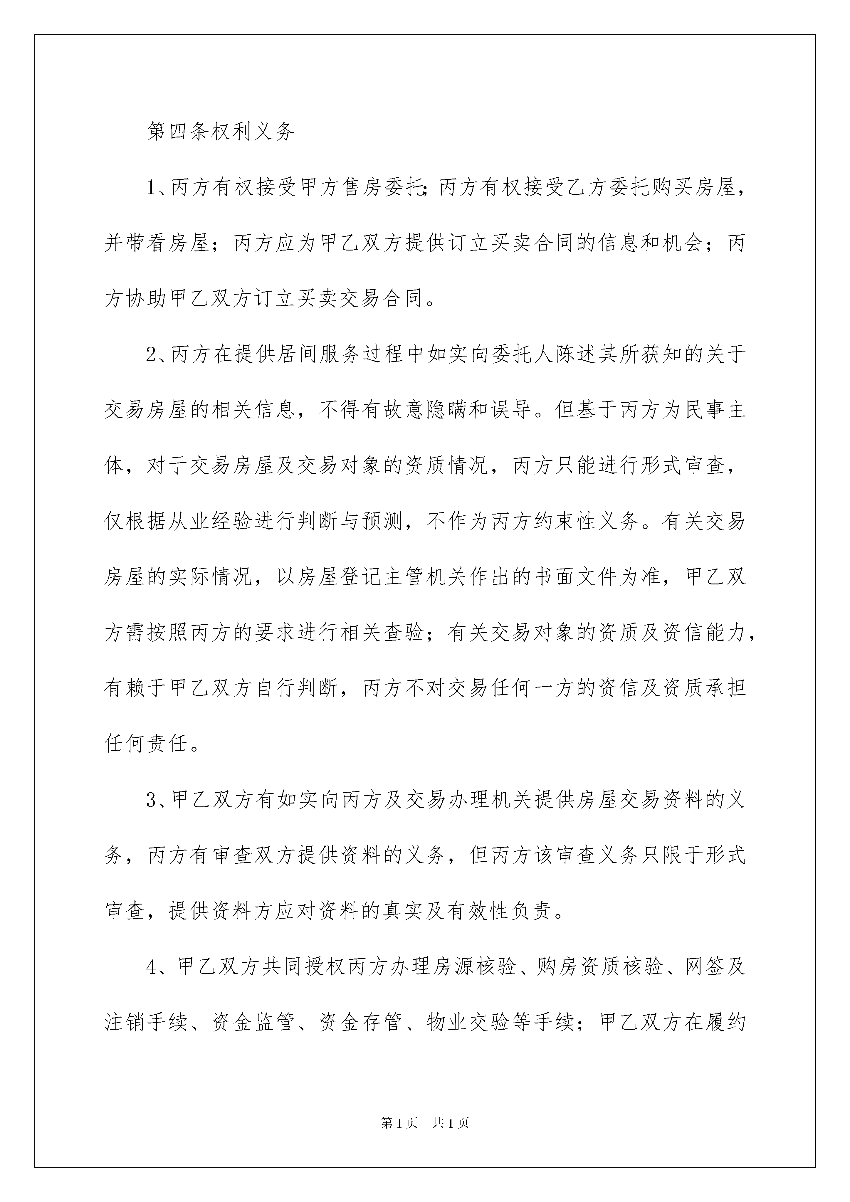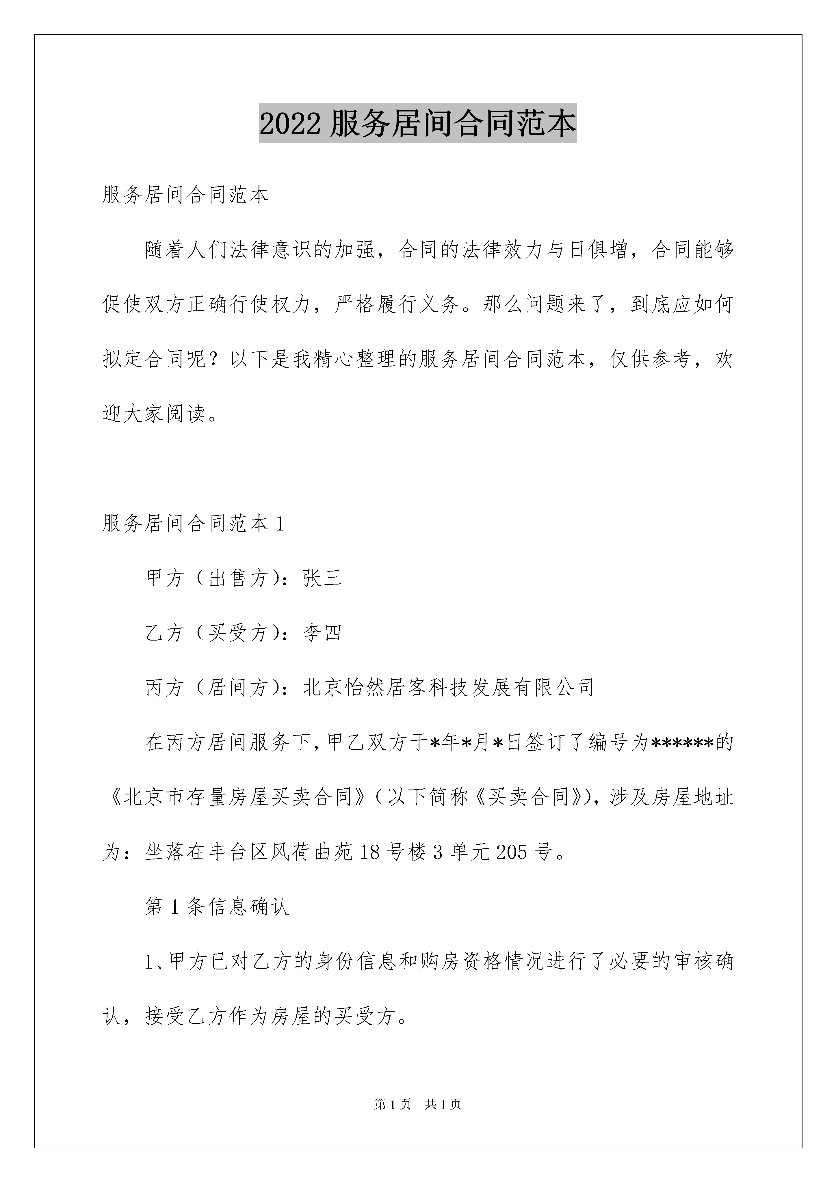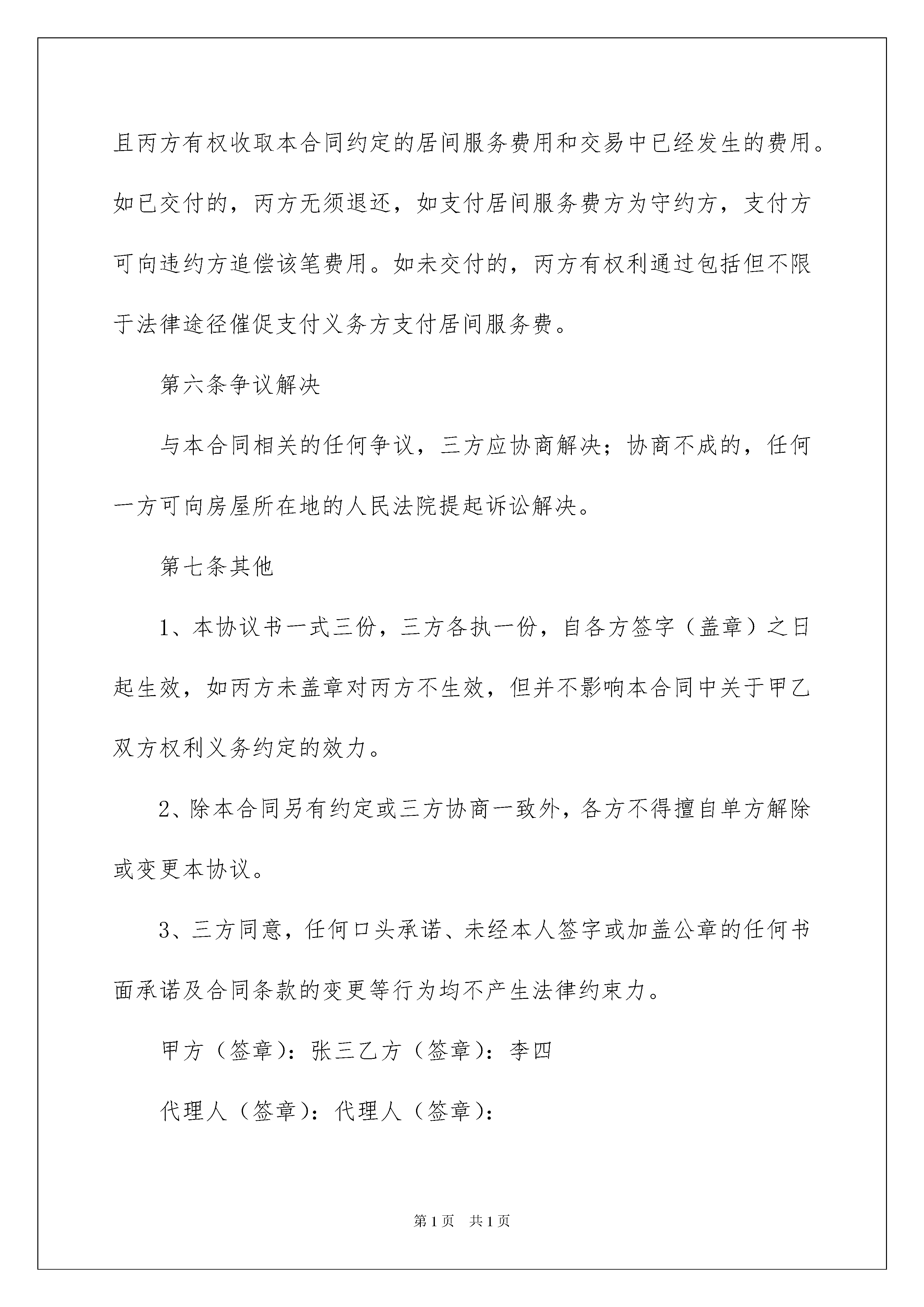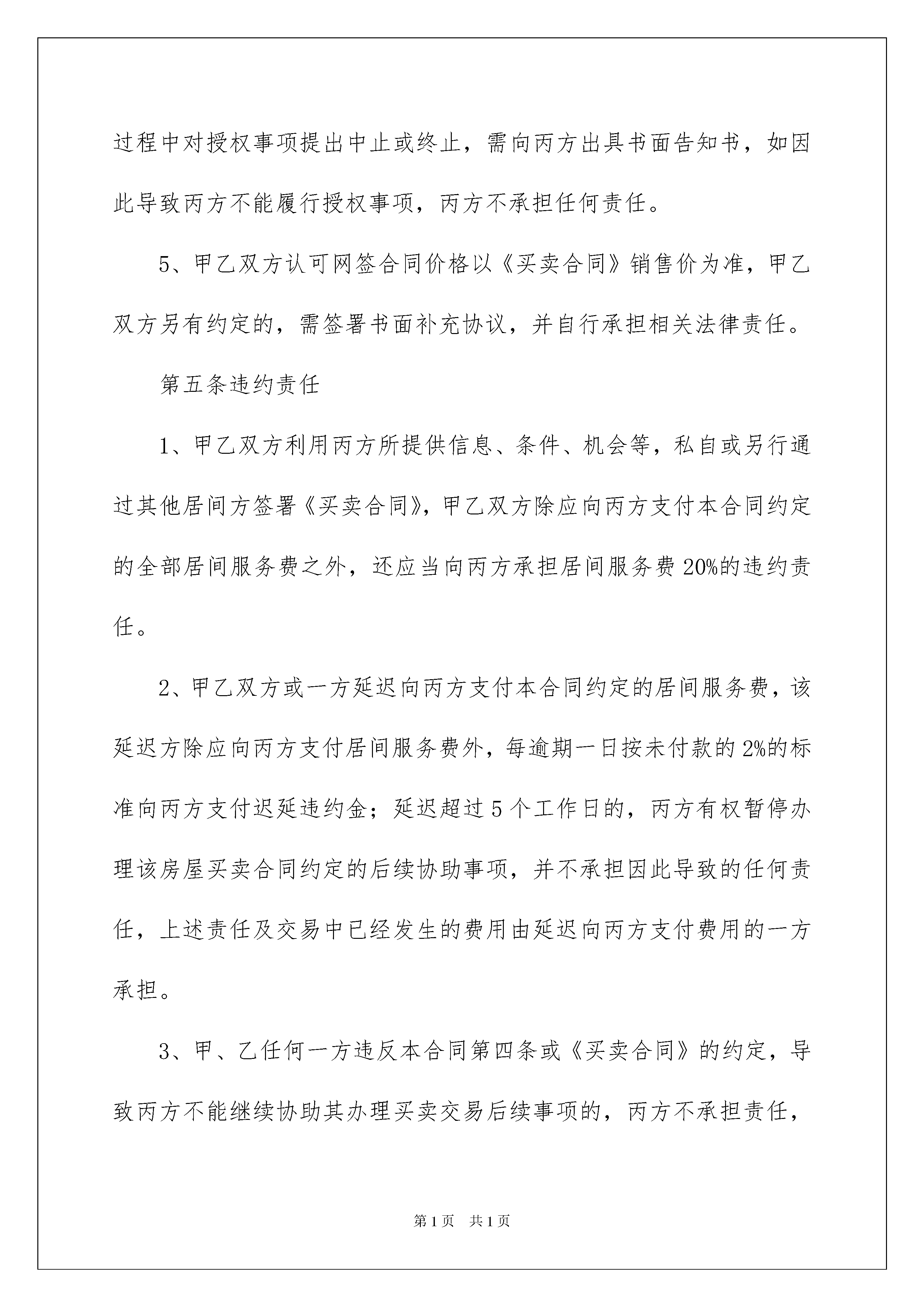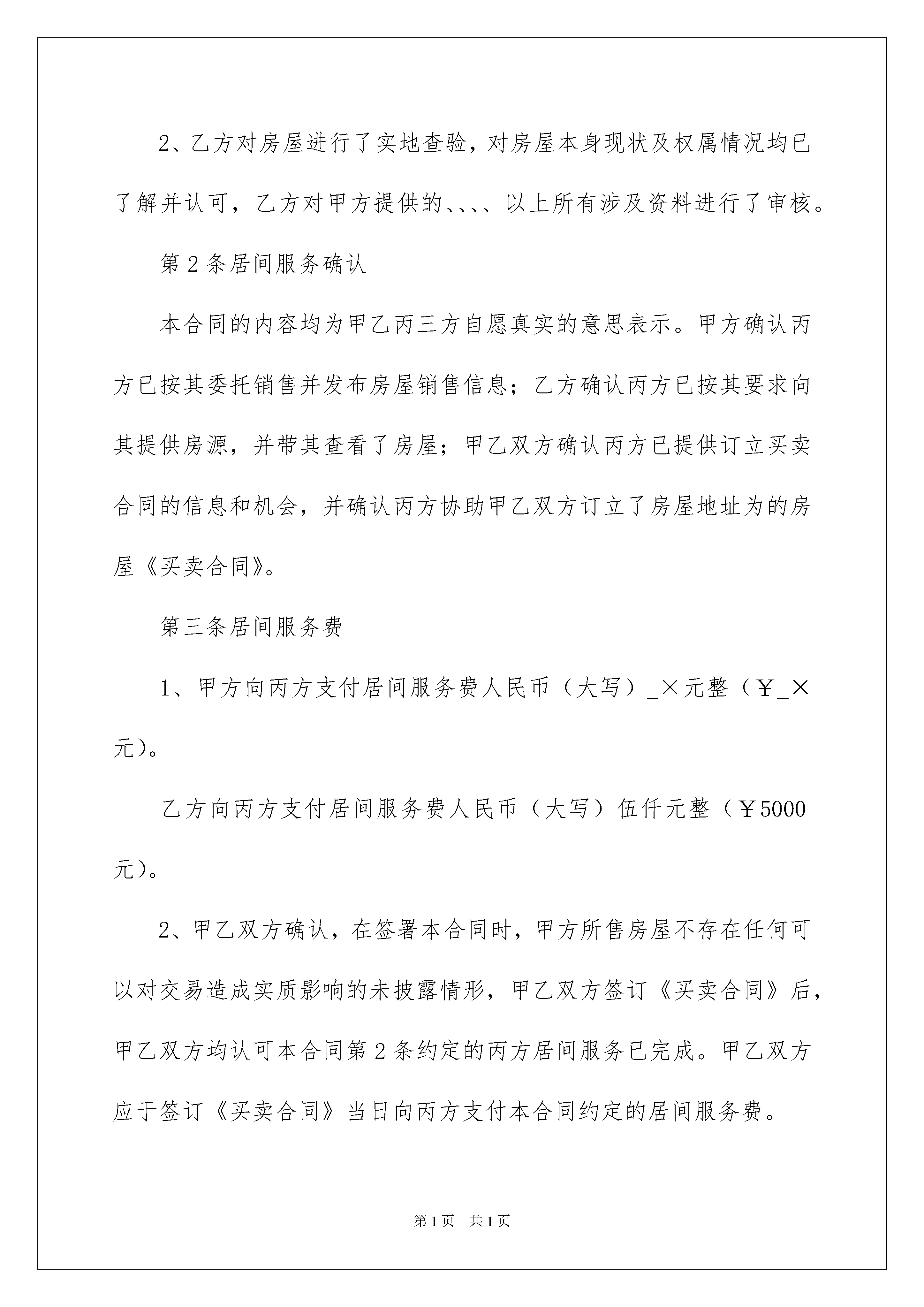 2022服务居间合同范本服务居间合同范本随着人们法律意识的加强,合同的法律效力与日俱增,合同能够促使双方正确行使权力,严格履行义务。那么问题来了,到底应如何拟定合同呢?以下是我精心整理的服务居间合同范本,仅供参考,欢迎大家阅读。服务居间合同范本1甲方(出售方):张三乙方(买受方):李四丙方(居间方):北京怡然居客科技发展有限公司在丙方居间服务下,甲乙双方于*年*月*日签订了编号为******的《北京市存量房屋买卖合同》(以下简称《买卖合同》),涉及房屋地址为:坐落在丰台区风荷曲苑18号楼3单元205号。第1条信息确认1、甲方已对乙方的身份信息和购房资格情况进行了必要的审核确认,接受乙方作为房屋的买受方。2、乙方对房屋进行了实地查验,对房屋本身现状及权属情况均已了解并认可,乙方对甲方提供的、、、、以上所有涉及资料进行了审核。第2条居间服务确认本合同的内容均为甲乙丙三方自愿真实的意思表示。甲方确认丙方已按其委托销售并发布房屋销售信息;乙方确认丙方已按其要求向其提供房源,并带其查看了房屋;甲乙双方确认丙方已提供订立买卖合同的信息和机会,并确认丙方协助甲乙双方订立了房屋地址为的房屋《买卖合同》。第三条居间服务费1、甲方向丙方支付居间服务费人民币(大写)_×元整(¥_×元)。乙方向丙方支付居间服务费人民币(大写)伍仟元整(¥5000元)。2、甲乙双方确认,在签署本合同时,甲方所售房屋不存在任何可以对交易造成实质影响的未披露情形,甲乙双方签订《买卖合同》后,甲乙双方均认可本合同第2条约定的丙方居间服务已完成。甲乙双方应于签订《买卖合同》当日向丙方支付本合同约定的居间服务费。第四条权利义务1、丙方有权接受甲方售房委托;丙方有权接受乙方委托购买房屋,并带看房屋;丙方应为甲乙双方提供订立买卖合同的信息和机会;丙方协助甲乙双方订立买卖交易合同。2、丙方在提供居间服务过程中如实向委托人陈述其所获知的关于交易房屋的相关信息,不得有故意隐瞒和误导。但基于丙方为民事主体,对于交易房屋及交易对象的资质情况,丙方只能进行形式审查,仅根据从业经验进行判断与预测,不作为丙方约束性义务。有关交易房屋的实际情况,以房屋登记主管机关作出的书面文件为准,甲乙双方需按照丙方的要求进行相关查验;有关交易对象的资质及资信能力,有赖于甲乙双方自行判断,丙方不对交易任何一方的资信及资质承担任何责任。3、甲乙双方有如实向丙方及交易办理机关提供房屋交易资料的义务,丙方有审查双方提供资料的义务,但丙方该审查义务只限于形式审查,提供资料方应对资料的真实及有效性负责。4、甲乙双方共同授权丙方办理房源核验、购房资质核验、网签及注销手续、资金监管、资金存管、物业交验等手续;甲乙双方在履约过程中对授权事项提出中止或终止,需向丙方出具书面告知书,如因此导致丙方不能履行授权事项,丙方不承担任何责任。5、甲乙双方认可网签合同价格以《买卖合同》销售价为准,甲乙双方另有约定的,需签署书面补充协议,并自行承担相关法律责任。第五条违约责任1、甲乙双方利用丙方所提供信息、条件、机会等,私自或另行通过其他居间方签署《买卖合同》,甲乙双方除应向丙方支付本合同约定的全部居间服务费之外,还应当向丙方承担居间服务费20%的违约责任。2、甲乙双方或一方延迟向丙方支付本合同约定的居间服务费,该延迟方除应向丙方支付居间服务费外,每逾期一日按未付款的2%的标准向丙方支付迟延违约金;延迟超过5个工作日的,丙方有权暂停办理该房屋买卖合同约定的后续协助事项,并不承担因此导致的任何责任,上述责任及交易中已经发生的费用由延迟向丙方支付费用的一方承担。3、甲、乙任何一方违反本合同第四条或《买卖合同》的约定,导致丙方不能继续协助其办理买卖交易后续事项的,丙方不承担责任,且丙方有权收取本合同约定的居间服务费用和交易中已经发生的费用。如已交付的,丙方无须退还,如支付居间服务费方为守约方,支付方可向违约方追偿该笔费用。如未交付的,丙方有权利通过包括但不限于法律途径催促支付义务方支付居间服务费。第六条争议解决与本合同相关的任何争议,三方应协商解决;协商不成的,任何一方可向房屋所在地的人民法院提起诉讼解决。第七条其他1、本协议书一式三份,三方各执一份,自各方签字(盖章)之日起生效,如丙方未盖章对丙方不生效,但并不影响本合同中关于甲乙双方权利义务约定的效力。2、除本合同另有约定或三方协商一致外,各方不得擅自单方解除或变更本协议。3、三方同意,任何口头承诺、未经本人签字或加盖公章的任何书面承诺及合同条款的变更等行为均不产生法律约束力。甲方(签章):张三乙方(签章):李四代理人(签章):代理人(签章):