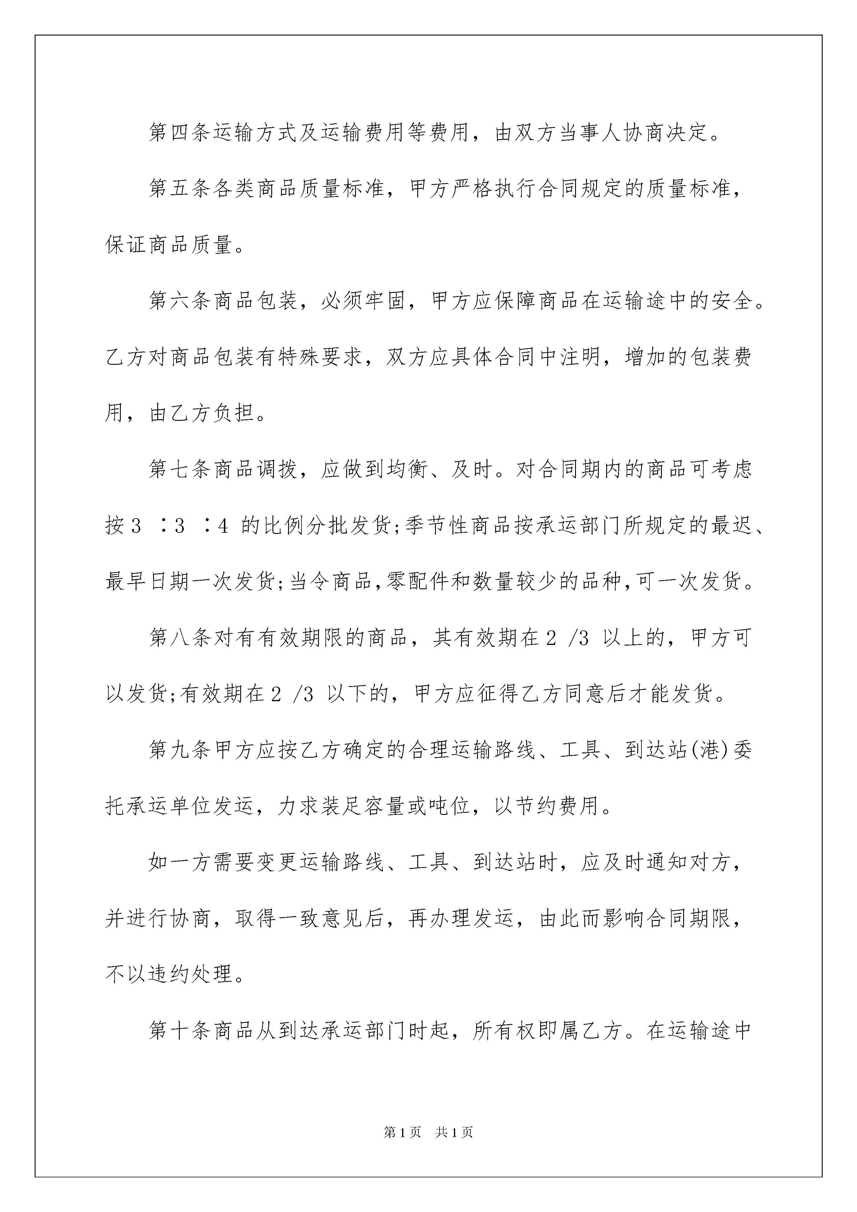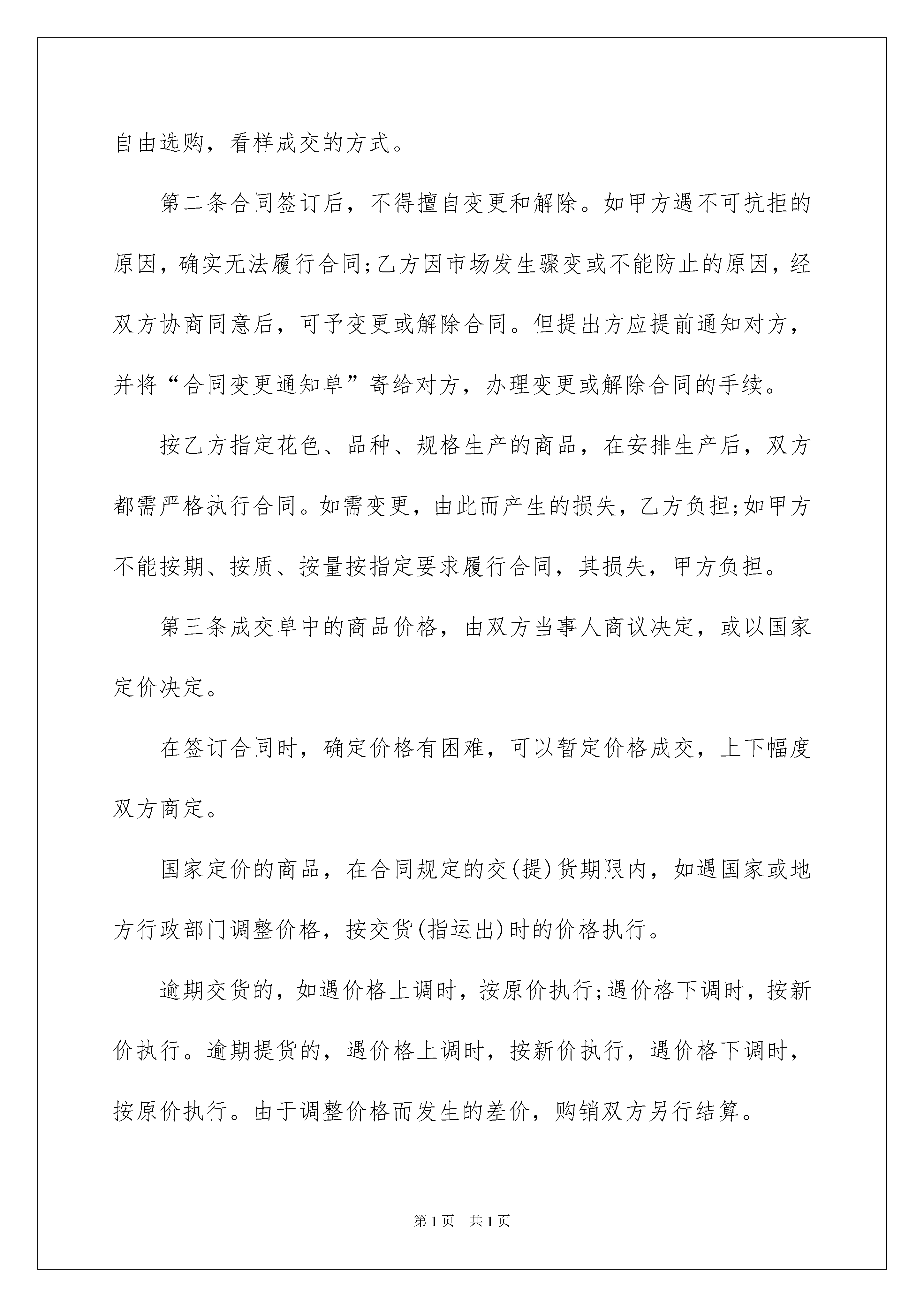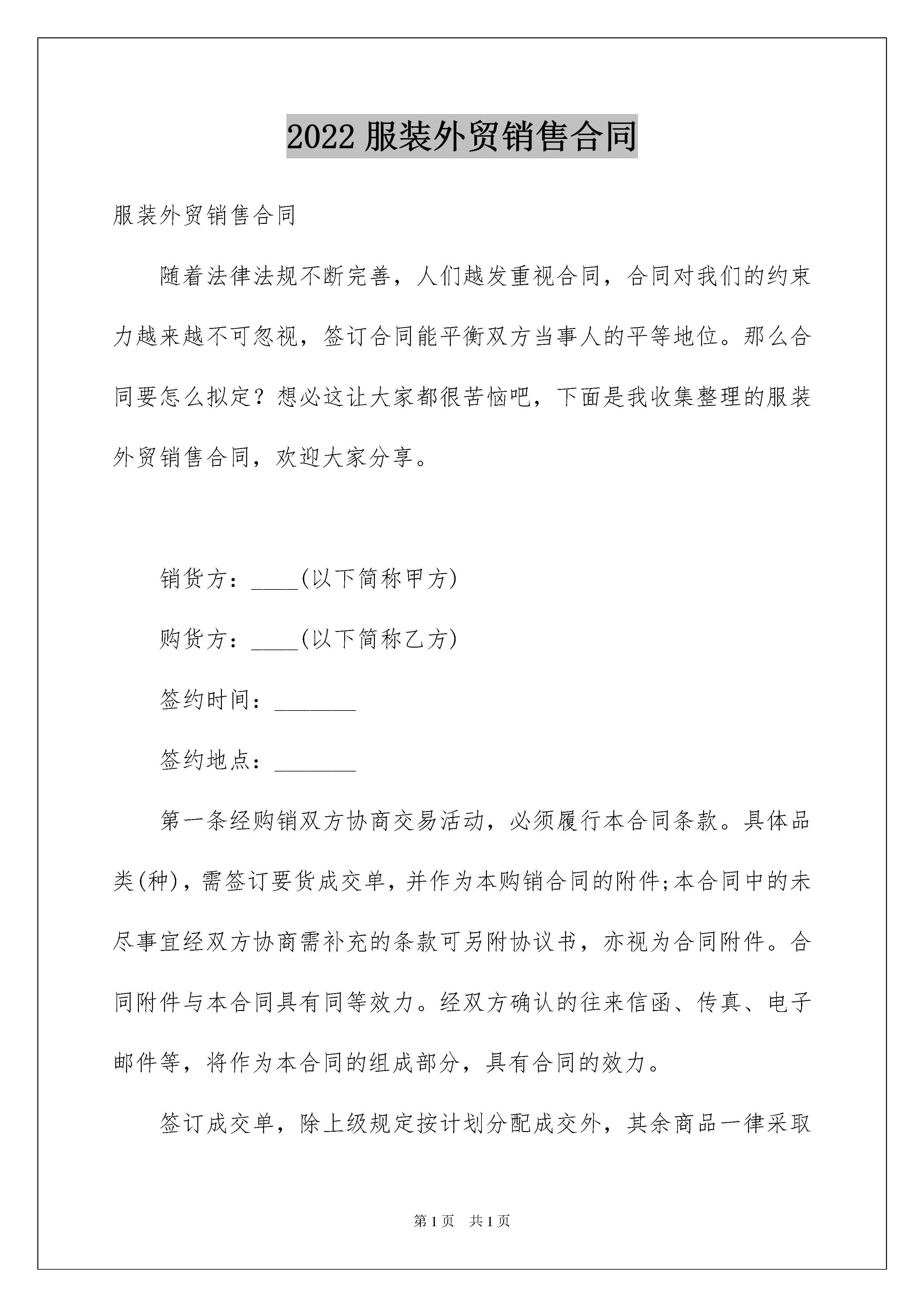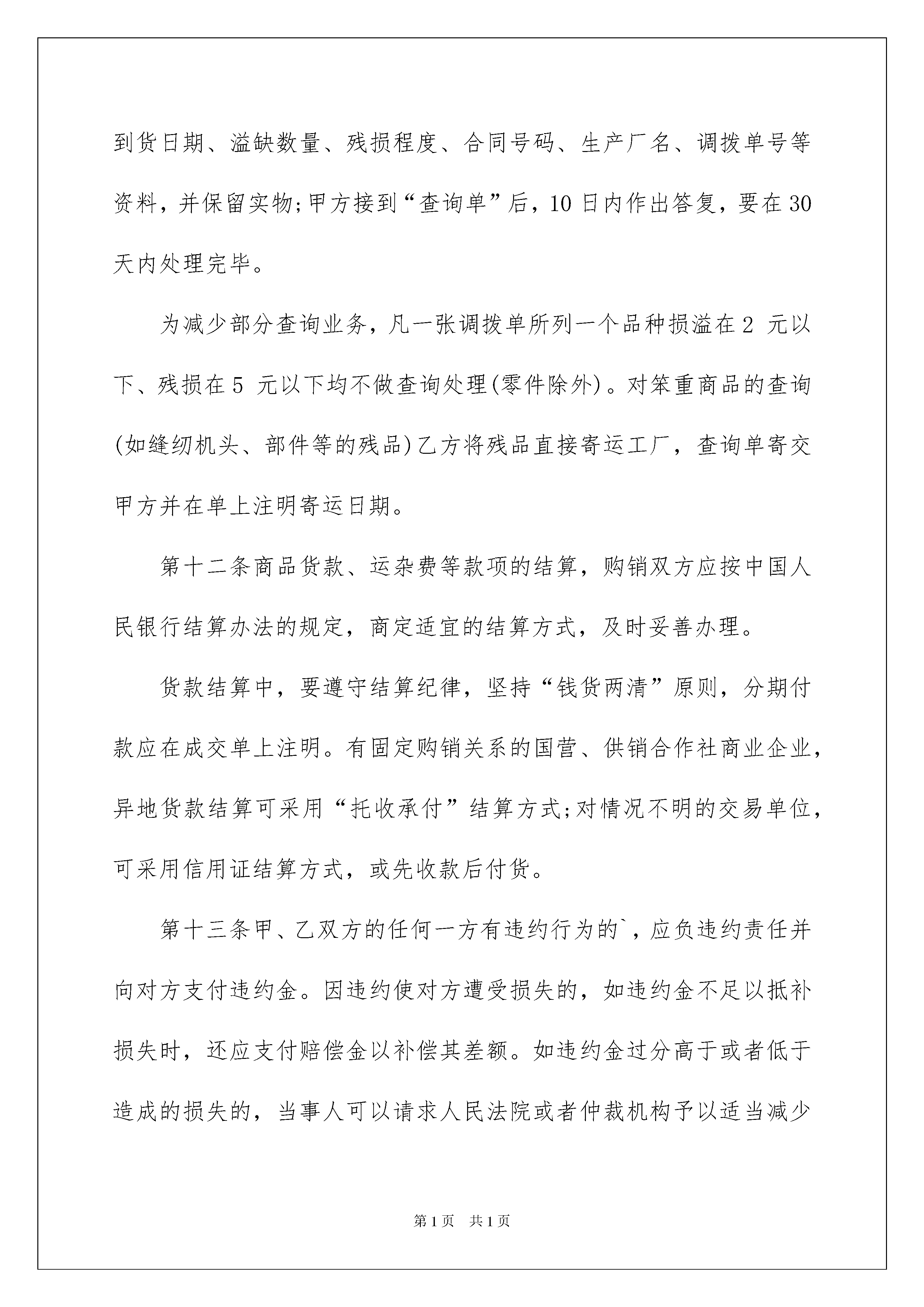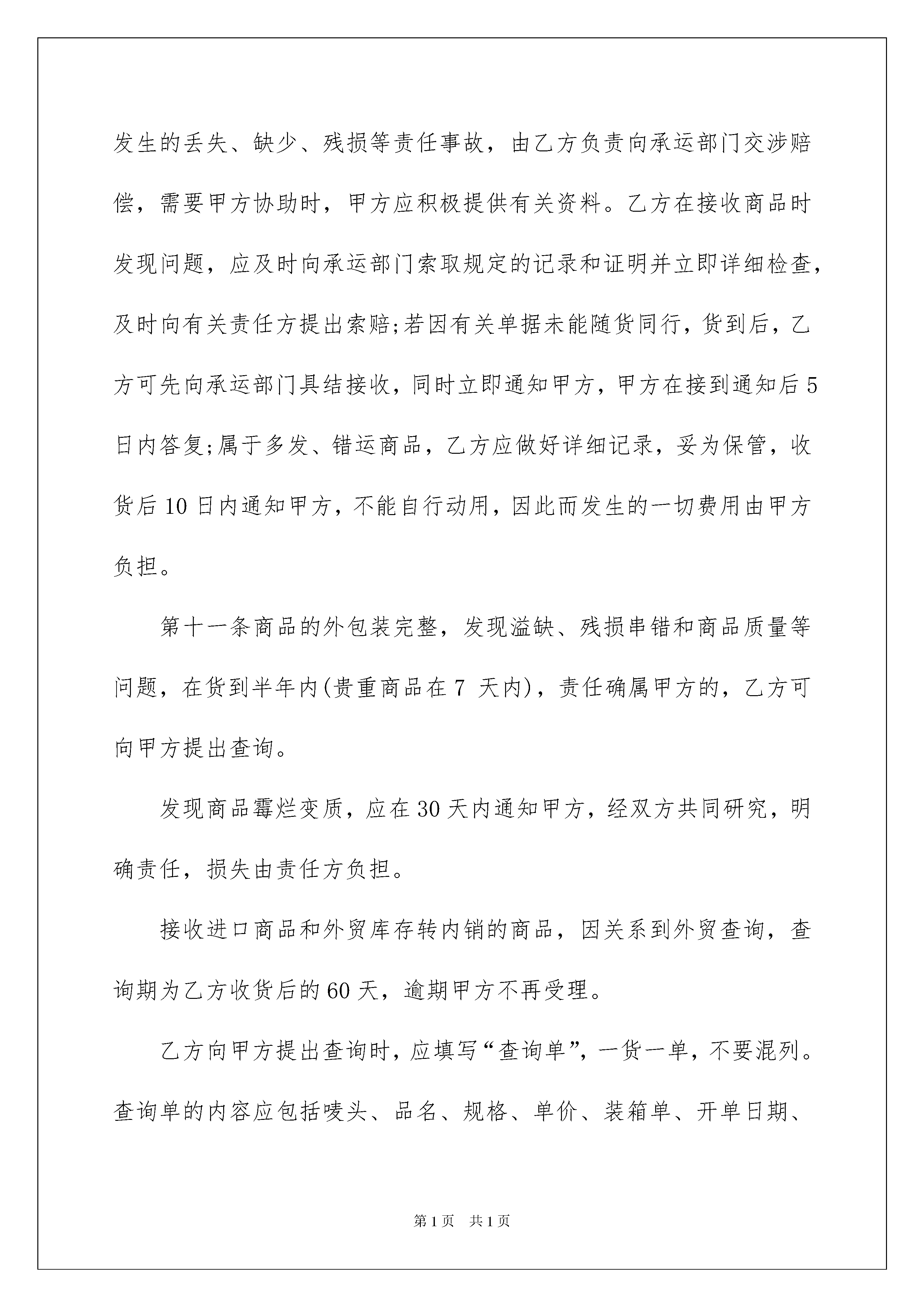 2022服装外贸销售合同服装外贸销售合同随着法律法规不断完善,人们越发重视合同,合同对我们的约束力越来越不可忽视,签订合同能平衡双方当事人的平等地位。那么合同要怎么拟定?想必这让大家都很苦恼吧,下面是我收集整理的服装外贸销售合同,欢迎大家分享。销货方:____(以下简称甲方)购货方:____(以下简称乙方)签约时间:_______签约地点:_______第一条经购销双方协商交易活动,必须履行本合同条款。具体品类(种),需签订要货成交单,并作为本购销合同的附件;本合同中的未尽事宜经双方协商需补充的条款可另附协议书,亦视为合同附件。合同附件与本合同具有同等效力。经双方确认的往来信函、传真、电子邮件等,将作为本合同的组成部分,具有合同的效力。签订成交单,除上级规定按计划分配成交外,其余商品一律采取自由选购,看样成交的方式。第二条合同签订后,不得擅自变更和解除。如甲方遇不可抗拒的原因,确实无法履行合同;乙方因市场发生骤变或不能防止的原因,经双方协商同意后,可予变更或解除合同。但提出方应提前通知对方,并将“合同变更通知单”寄给对方,办理变更或解除合同的手续。按乙方指定花色、品种、规格生产的商品,在安排生产后,双方都需严格执行合同。如需变更,由此而产生的损失,乙方负担;如甲方不能按期、按质、按量按指定要求履行合同,其损失,甲方负担。第三条成交单中的商品价格,由双方当事人商议决定,或以国家定价决定。在签订合同时,确定价格有困难,可以暂定价格成交,上下幅度双方商定。国家定价的商品,在合同规定的交(提)货期限内,如遇国家或地方行政部门调整价格,按交货(指运出)时的价格执行。逾期交货的,如遇价格上调时,按原价执行;遇价格下调时,按新价执行。逾期提货的,遇价格上调时,按新价执行,遇价格下调时,按原价执行。由于调整价格而发生的差价,购销双方另行结算。第四条运输方式及运输费用等费用,由双方当事人协商决定。第五条各类商品质量标准,甲方严格执行合同规定的质量标准,保证商品质量。第六条商品包装,必须牢固,甲方应保障商品在运输途中的安全。乙方对商品包装有特殊要求,双方应具体合同中注明,增加的包装费用,由乙方负担。第七条商品调拨,应做到均衡、及时。对合同期内的商品可考虑按3∶3∶4的比例分批发货;季节性商品按承运部门所规定的最迟、最早日期一次发货;当令商品,零配件和数量较少的品种,可一次发货。第八条对有有效期限的商品,其有效期在2/3以上的,甲方可以发货;有效期在2/3以下的,甲方应征得乙方同意后才能发货。第九条甲方应按乙方确定的合理运输路线、工具、到达站(港)委托承运单位发运,力求装足容量或吨位,以节约费用。如一方需要变更运输路线、工具、到达站时,应及时通知对方,并进行协商,取得一致意见后,再办理发运,由此而影响合同期限,不以违约处理。第十条商品从到达承运部门时起,所有权即属乙方。在运输途中发生的丢失、缺少、残损等责任事故,由乙方负责向承运部门交涉赔偿,需要甲方协助时,甲方应积极提供有关资料。乙方在接收商品时发现问题,应及时向承运部门索取规定的记录和证明并立即详细检查,及时向有关责任方提出索赔;若因有关单据未能随货同行,货到后,乙方可先向承运部门具结接收,同时立即通知甲方,甲方在接到通知后5日内答复;属于多发、错运商品,乙方应做好详细记录,妥为保管,收货后10日内通知甲方,不能自行动用,因此而发生的一切费用由甲方负担。第十一条商品的外包装完整,发现溢缺、残损串错和商品质量等问题,在货到半年内(贵重商品在7天内),责任确属甲方的,乙方可向甲方提出查询。发现商品霉烂变质,应在30天内通知甲方,经双方共同研究,明确责任,损失由责任方负担。接收进口商品和外贸库存转内销的商品,因关系到外贸查询,查询期为乙方收货后的60天,逾期甲方不再受理。乙方向甲方提出查询时,应填写“查询单”,一货一单,不要混列。查询单的内容应包括唛头、品名、规格、单价、装箱单、开单日期、到货日期、溢缺数量、残损程度、合同号码、生产厂名、调拨单号等资料,并保留实物;甲方接到“查询单”后,10日内作出答复,要在30天内处理完毕。为减少部分查询业务,凡一张调拨单所列一个品种损溢在2元以下、残损在5元以下均不做查询处理(零件除外)。对笨重商品的查询(如缝纫机头、部件等的残品)乙方将残品直接寄运工厂,查询单寄交甲方并在单上注明寄运日期。第十二条商品货款、运杂费等款项的结算,购销双方应按中国人民银行结算办法的规定,商定适宜的结算方式,及时妥善办理。货款结算中,要遵守结算纪律,坚持“钱货两清”原则,分期付款应在成交单上注明。有固定购销关系的国营、供销合作社商