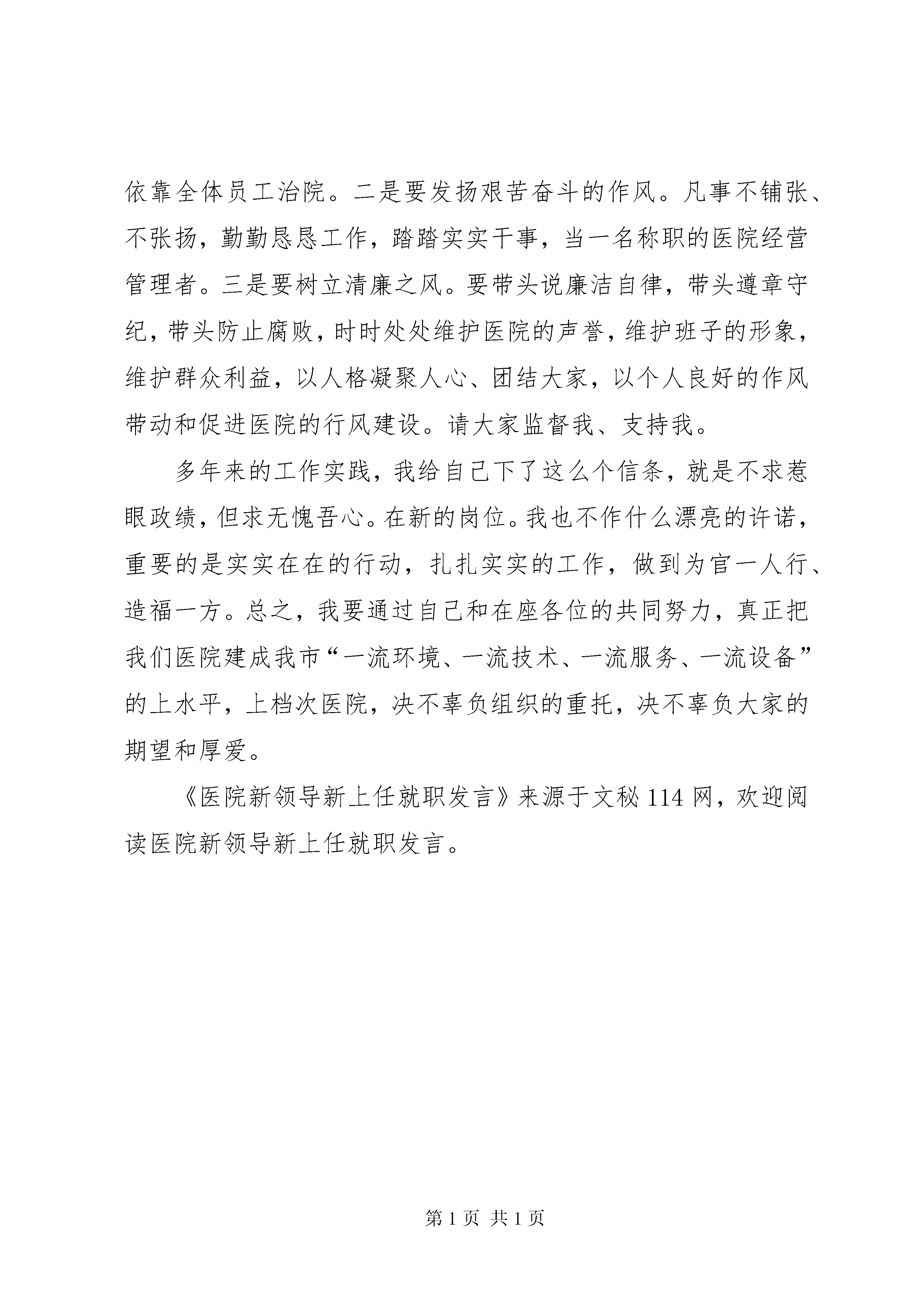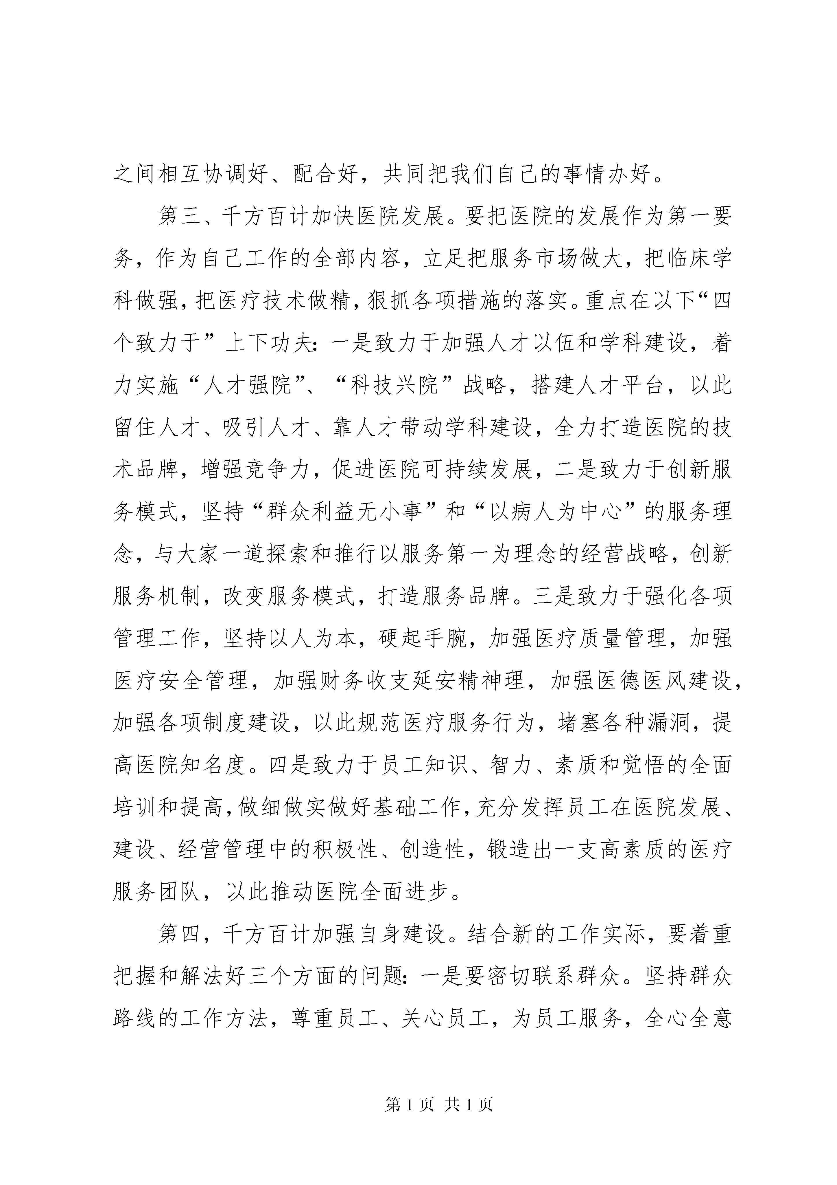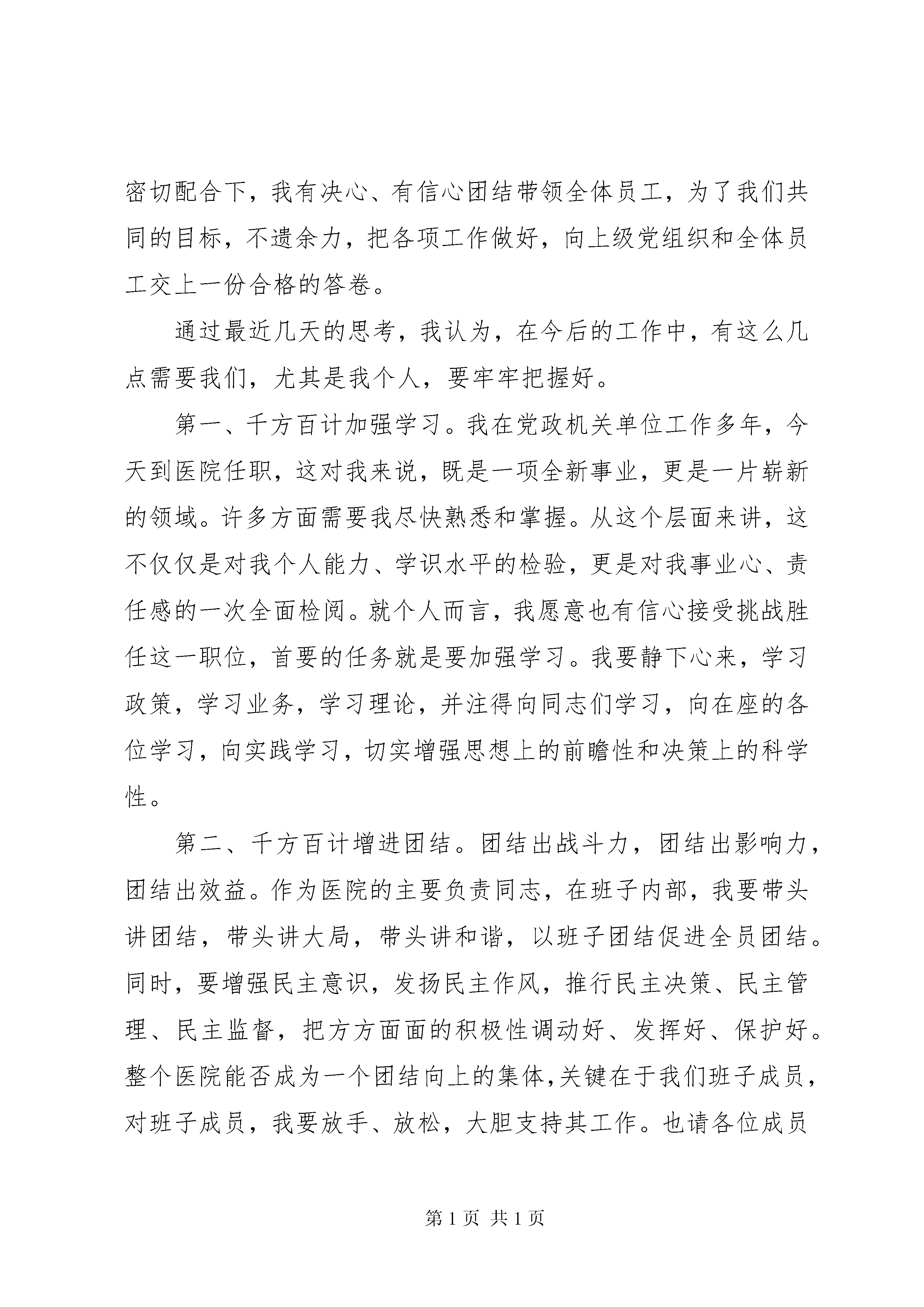 医院新领导新上任就职发言文章标题:医院新领导新上任就职发言各位领导、同志们:根据组织安排,我到咱们市立医院任职主持工作。我深感肩上担子的份量和责任的重大。今天与班子见面,各项工作也就全面进入了正轨。借此机会,谈几点感性认识和一些想法,与大家结共勉,不当之处,请各位领导、班子成员指正。作为全市医疗机构的龙头,多年来,在市委、市政府的正确领导下,在历届领导班子打下坚实基础上,我们医院无论是整体外观形象还是内部建设,无论是基础设施改善还是医疗水平提高,无论是学科建设还是医德医风树立,各方面都有了长足进步。在我市来讲,其医疗和服务水平,勿容置疑;其地位和作用,不可替代;其设施和技术,无可比拟。悬壶济世,救死扶伤,是我们医院工作的天职。作为一个特殊的单位,我认为,我们的各项工作,必须紧紧围绕达到“三个基本文秘114网满意”,即让领导基本满意,让职工基本满意,让群众基本满意。实现这“三个基本满意”,需要我们领导班子和全体员工真正树立起主人翁意识,同心协力,同舟共济。人人尽一份努力,人人做一份贡献。作为班长,在任职期限内,在市委、市政府的坚强领导下,在卫生局的大力支持下,在同志们的密切配合下,我有决心、有信心团结带领全体员工,为了我们共同的目标,不遗余力,把各项工作做好,向上级党组织和全体员工交上一份合格的答卷。通过最近几天的思考,我认为,在今后的工作中,有这么几点需要我们,尤其是我个人,要牢牢把握好。第一、千方百计加强学习。我在党政机关单位工作多年,今天到医院任职,这对我来说,既是一项全新事业,更是一片崭新的领域。许多方面需要我尽快熟悉和掌握。从这个层面来讲,这不仅仅是对我个人能力、学识水平的检验,更是对我事业心、责任感的一次全面检阅。就个人而言,我愿意也有信心接受挑战胜任这一职位,首要的任务就是要加强学习。我要静下心来,学习政策,学习业务,学习理论,并注得向同志们学习,向在座的各位学习,向实践学习,切实增强思想上的前瞻性和决策上的科学性。第二、千方百计增进团结。团结出战斗力,团结出影响力,团结出效益。作为医院的主要负责同志,在班子内部,我要带头讲团结,带头讲大局,带头讲和谐,以班子团结促进全员团结。同时,要增强民主意识,发扬民主作风,推行民主决策、民主管理、民主监督,把方方面面的积极性调动好、发挥好、保护好。整个医院能否成为一个团结向上的集体,关键在于我们班子成员,对班子成员,我要放手、放松,大胆支持其工作。也请各位成员之间相互协调好、配合好,共同把我们自己的事情办好。第三、千方百计加快医院发展。要把医院的发展作为第一要务,作为自己工作的全部内容,立足把服务市场做大,把临床学科做强,把医疗技术做精,狠抓各项措施的落实。重点在以下“四个致力于”上下功夫:一是致力于加强人才以伍和学科建设,着力实施“人才强院”、“科技兴院”战略,搭建人才平台,以此留住人才、吸引人才、靠人才带动学科建设,全力打造医院的技术品牌,增强竞争力,促进医院可持续发展,二是致力于创新服务模式,坚持“群众利益无小事”和“以病人为中心”的服务理念,与大家一道探索和推行以服务第一为理念的经营战略,创新服务机制,改变服务模式,打造服务品牌。三是致力于强化各项管理工作,坚持以人为本,硬起手腕,加强医疗质量管理,加强医疗安全管理,加强财务收支延安精神理,加强医德医风建设,加强各项制度建设,以此规范医疗服务行为,堵塞各种漏洞,提高医院知名度。四是致力于员工知识、智力、素质和觉悟的全面培训和提高,做细做实做好基础工作,充分发挥员工在医院发展、建设、经营管理中的积极性、创造性,锻造出一支高素质的医疗服务团队,以此推动医院全面进步。第四,千方百计加强自身建设。结合新的工作实际,要着重把握和解法好三个方面的问题:一是要密切联系群众。坚持群众路线的工作方法,尊重员工、关心员工,为员工服务,全心全意依靠全体员工治院。二是要发扬艰苦奋斗的作风。凡事不铺张、不张扬,勤勤恳恳工作,踏踏实实干事,当一名称职的医院经营管理者。三是要树立清廉之风。要带头说廉洁自律,带头遵章守纪,带头防止腐败,时时处处维护医院的声誉,维护班子的形象,维护群众利益,以人格凝聚人心、团结大家,以个人良好的作风带动和促进医院的行风建设。请大家监督我、支持我。多年来的工作实践,我给自己下了这么个信条,就是不求惹眼政绩,但求无愧吾心。在新的岗位。我也不作什么漂亮的许诺,重要的是实实在在的行动,扎扎实实的工作,做到为官一人行、造福一方。总之,我要通过自己和在座各位的共同努力,真正把我们医院建成我市“一流环境、一流技术、一流服务、一流设备”的上水平,上档次医院,决不辜负组织的重托,决不辜负大家的期望和厚爱。《医院新领导新上任就职发言》来源于文秘114网,欢迎阅读医院新领导新上任就职发言。
