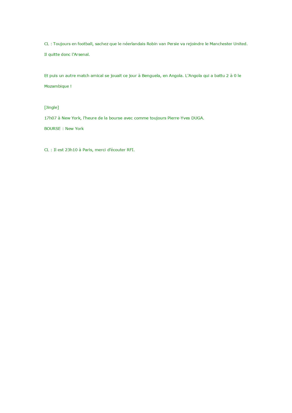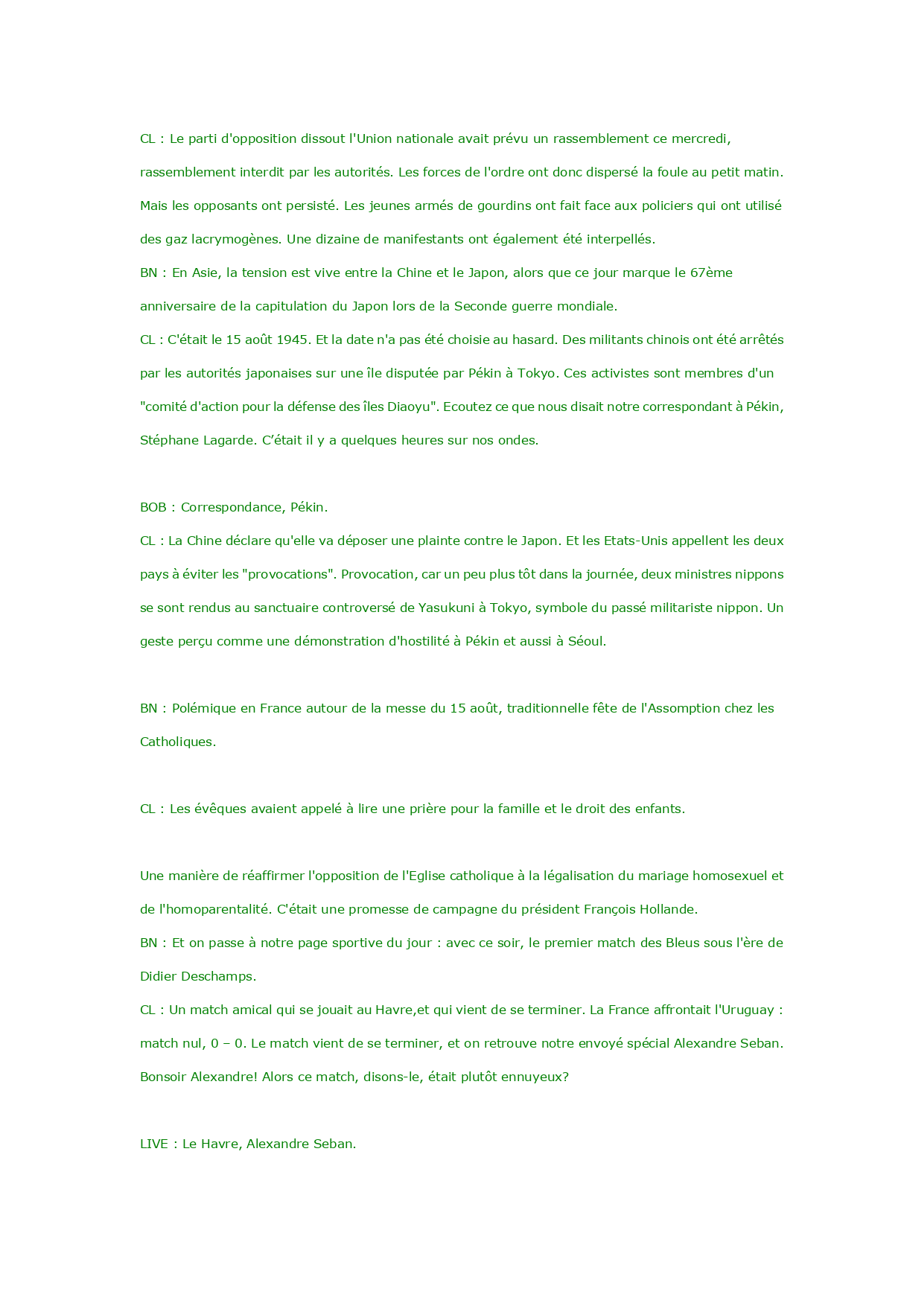 Editiondu15/08/201221:00 23hàParis 21henTU 5hàPékin Mercid'écouterRFI [Jingle]CécileLeclerc Bonsoiretbienvenuesivousnousrejoignezpourcetteéditiondujournalenfrançaisfacile. Journalprésentéavecvous,BernardNageotte.BonsoirBernard. BernardNageotte:BonsoirCécileetbonsoiràtous. CécileLeclerc:Ausommairedecetteédition,laSyrie:l'ONUaccuselerégimedeBacharAlAssaddecrimescontrel'humanité,etlesrebellesdecrimesdeguerre. BN:TensionsentrelaChineetleJapon.Lesdeuxpaysontmultipliélesprovocationsencejourd'anniversairedelacapitulationdeTokyoen1945.LesEtats-Unisappellentaucalme. CL:EtpuislepremiermatchdesBleussousl'èredeDidierDeschampss'estjouécesoir:FranceUruguay-matchnul:0à0. [Jingle] BN:L'OrganisationdesNationsUniesapubliéunnouveaurapportaccablantpourleprésidentsyrienBacharAlAssad. CL:LaCommissiond'enquêtedel'ONUmandatéeparleconseildesdroitsdel'Hommeaccuselesforcesgouvernementalesetsesmilicesd'avoircommisdescrimescontrel'humanité.Maisellen'épargnepaslesrebelles,commenousl'expliquenotrecorrespondantàGenève,LaurentMossu. BOB:Correspondance,Genève. CL:Lesviolencessurlescivilseneffetcemercrediencore:unraiddel'arméecontrelavilled'Azazdanslenorddupaysafaitplusde80morts,selonunmédecinenpostesurplace. BN:AuGabon,plusieurspersonnesontétéblesséesdansdesaffrontementsentrepoliciersetpartisansd'AndréMbaObame. CL:Lepartid'oppositiondissoutl'Unionnationaleavaitprévuunrassemblementcemercredi,rassemblementinterditparlesautorités.Lesforcesdel'ordreontdoncdispersélafouleaupetitmatin.Maislesopposantsontpersisté.Lesjeunesarmésdegourdinsontfaitfaceauxpoliciersquiontutilisédesgazlacrymogènes.Unedizainedemanifestantsontégalementétéinterpellés. BN:EnAsie,latensionestviveentrelaChineetleJapon,alorsquecejourmarquele67èmeanniversairedelacapitulationduJaponlorsdelaSecondeguerremondiale. CL:C'étaitle15août1945.Etladaten'apasétéchoisieauhasard.DesmilitantschinoisontétéarrêtésparlesautoritésjaponaisessuruneîledisputéeparPékinàTokyo.Cesactivistessontmembresd'un"comitéd'actionpourladéfensedesîlesDiaoyu".Ecoutezc