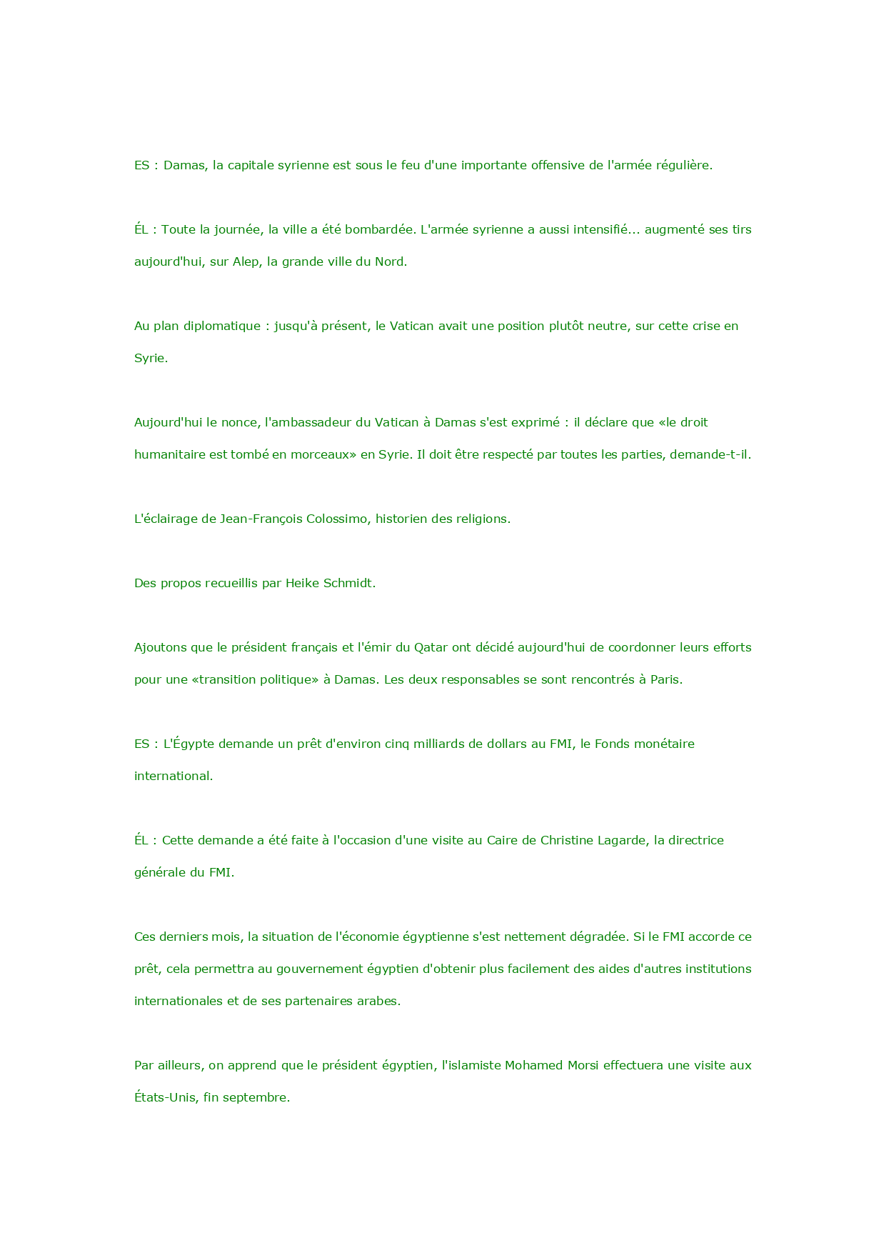 Editiondu22/08/201222:00 Mercid'écouterRFI.Ilest23hiciàParis,21hentempsuniversel. ÉlodieLargenton:Bonsoiretbienvenuedanslejournalenfrançaisfacile.Uneéditionquejevousprésente,cesoir,avecEdmondSadaka.BonsoirEdmond. EdmondSadaka:BonsoirÉlodie,bonsoiràtous. ÉL:ÀlaUne,cesoir:l'AfriqueduSudseprépareàrendrehommageauxquarante-quatremortsdelaminedeMarikana.Descérémoniessontprévuesdemain. ES:Lacréationd'untribunalspécialpourjugerl'ancienprésidenttchadienHissèneHabré,àDakar.LeSénégaletl'Unionafricaineontsigné,cesoir,unaccordencesens. ÉL:Etpuis,enSyrie,l'arméeintensifieencoresesraidssurDamasetAlep.ParisetWashingtonrépètentqu'ilsveulentledépartrapideduprésidentBacharal-Assad. ES:L’AfriqueduSudrendrahommagedemain,jeudi,auxquarante-quatrepersonnesdécédéeslasemainedernière,lorsd'affrontementsàlaminedeplatinedeMarikana. ÉL:Aujourd'huileprésidentsud-africain,JacobZuma,estalléàlarencontredesmineurs,prèsdulieudelafusillade.C'estlàqu'ilsserassemblenttouslesjours.Larencontreaététendue. LereportagedeSophieRibstein,àMarikana. ES:LeSénégaletl'Unionafricaineontsigné,cesoir,àDakar,unaccordsurlacréationd'untribunalspécialpourjugerHissèneHabré. ÉL:Lescontoursdecetribunalavaientétédéfinisilyaunmois,lorsd'uneréuniond'expertsjuridiquesdeDakaretdel'Unionafriciaine.Deschambresafricainesextraordinairesvontêtrecrééesauseindesjuridictionssénégalaisesenvuedeceprocès.L'ancienprésidenttchadienestréfugiéàDakardepuis1990.Ilestpoursuivipourcrimescontrel'humanité.HissèneHabrédevraitdoncêtrejugé,vingt-deuxansaprèslachutedesonrégime. ES:Damas,lacapitalesyrienneestsouslefeud'uneimportanteoffensivedel'arméerégulière. ÉL:Toutelajournée,lavilleaétébombardée.L'arméesyrienneaaussiintensifié...augmentésestirsaujourd'hui,surAlep,lagrandevilleduNord. Auplandiplomatique:jusqu'àprésent,leVaticanavaitunepositionplutôtneutre,surcettecriseenSyrie. Aujourd'huilenonce,l'ambassadeurduVaticanàDamass'estexprimé:ildéclareque«ledroithumanitaireesttombéenmorceaux»enSyrie.Ildoitêtrerespectépartouteslesparties,demande-t-i