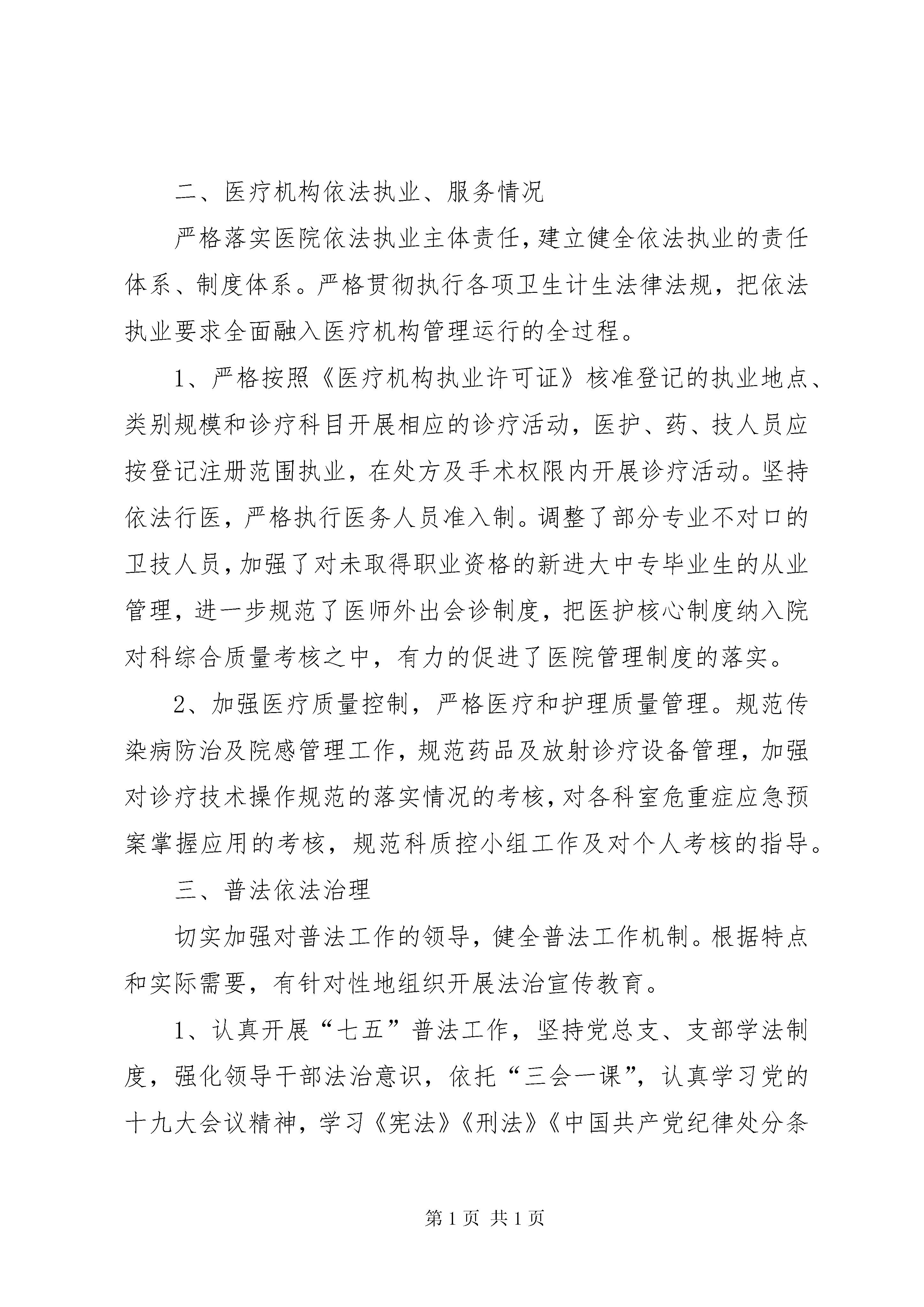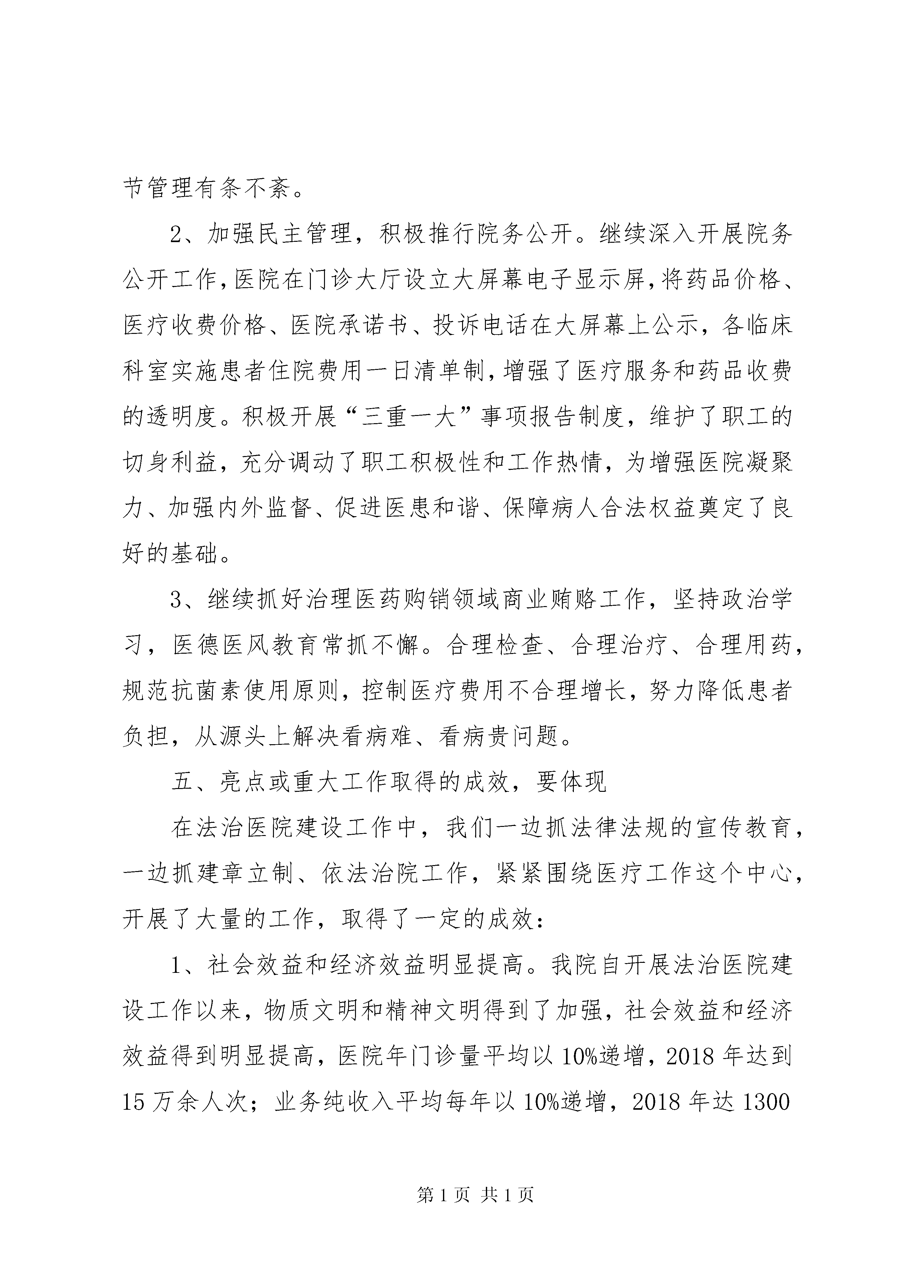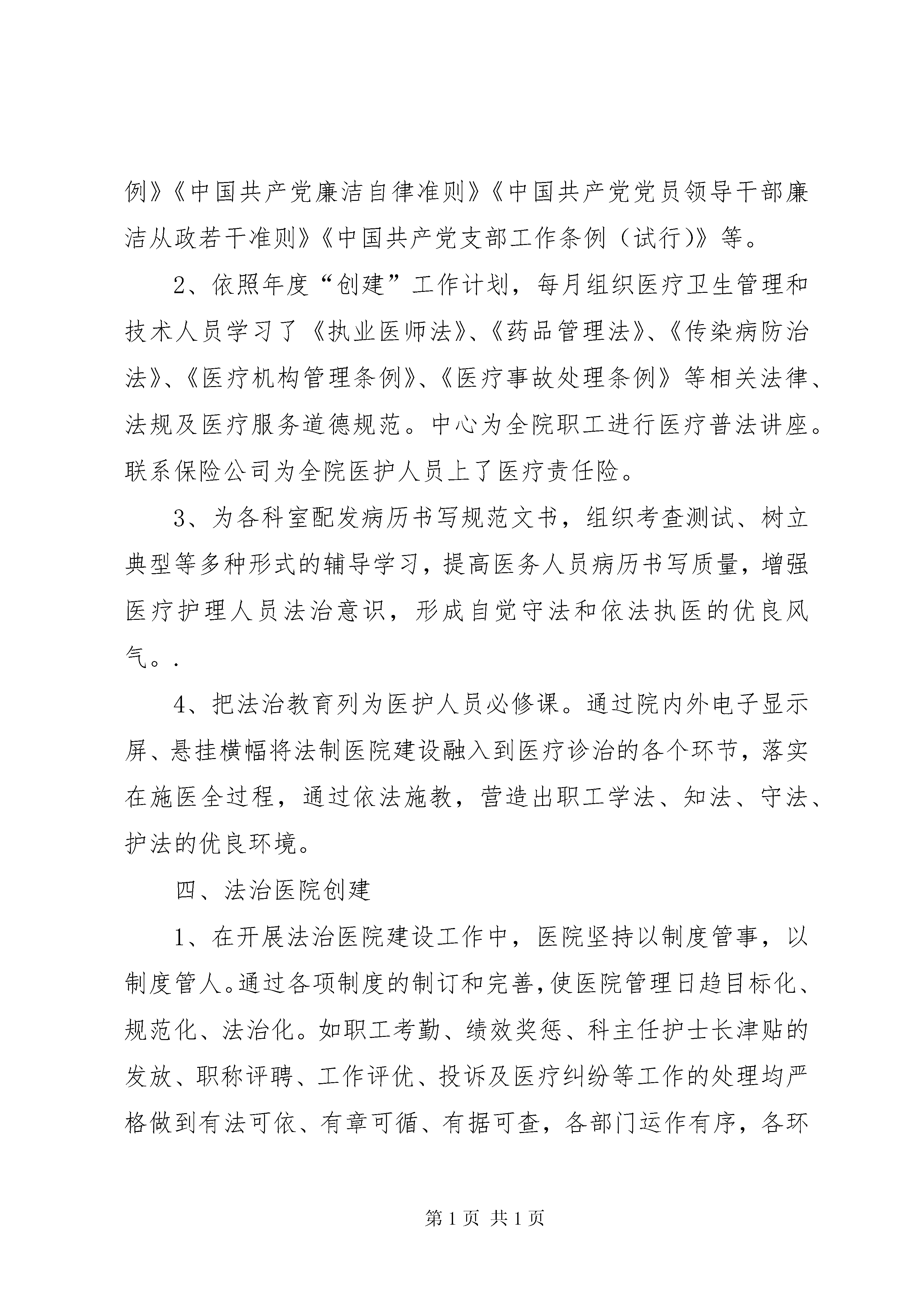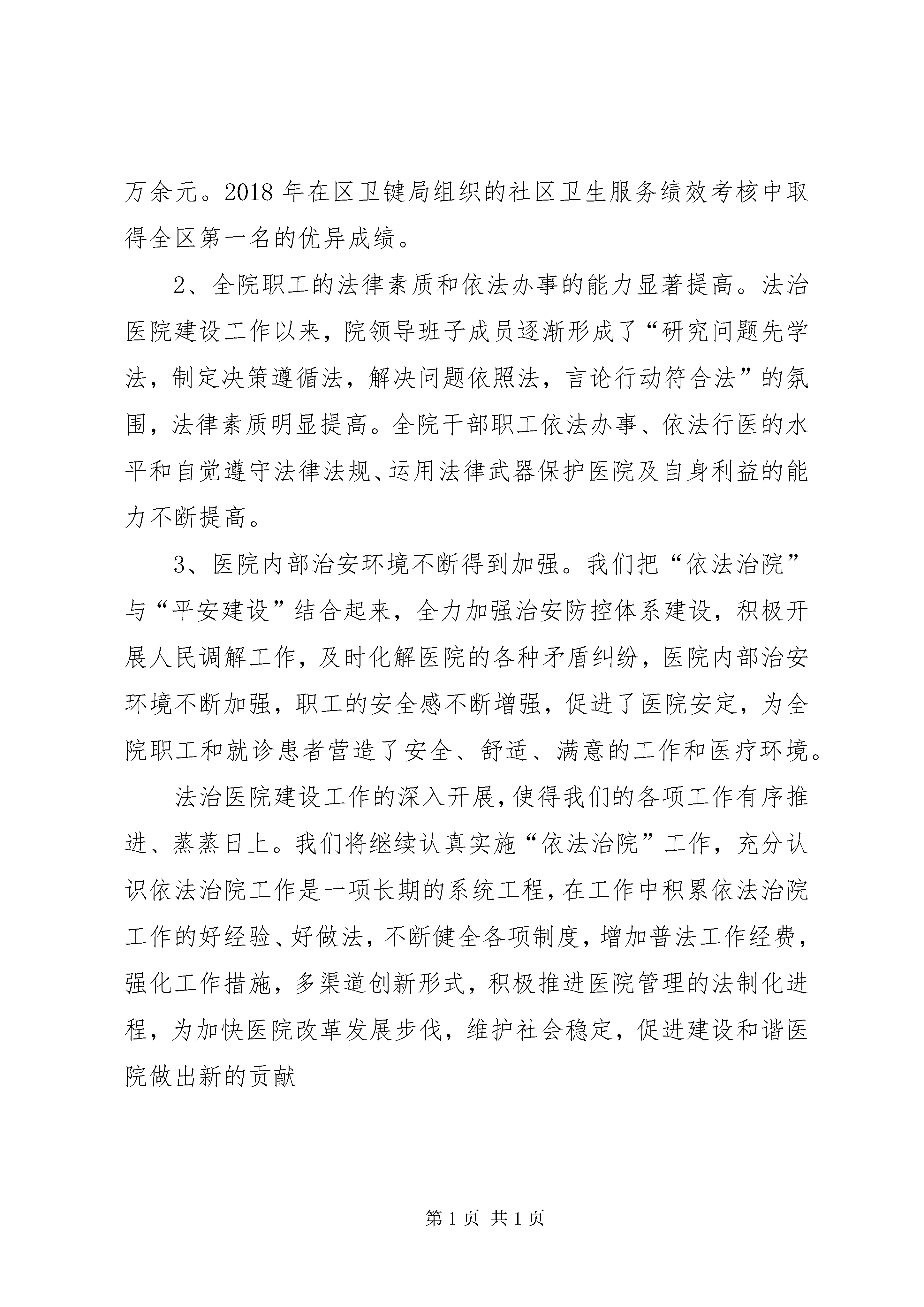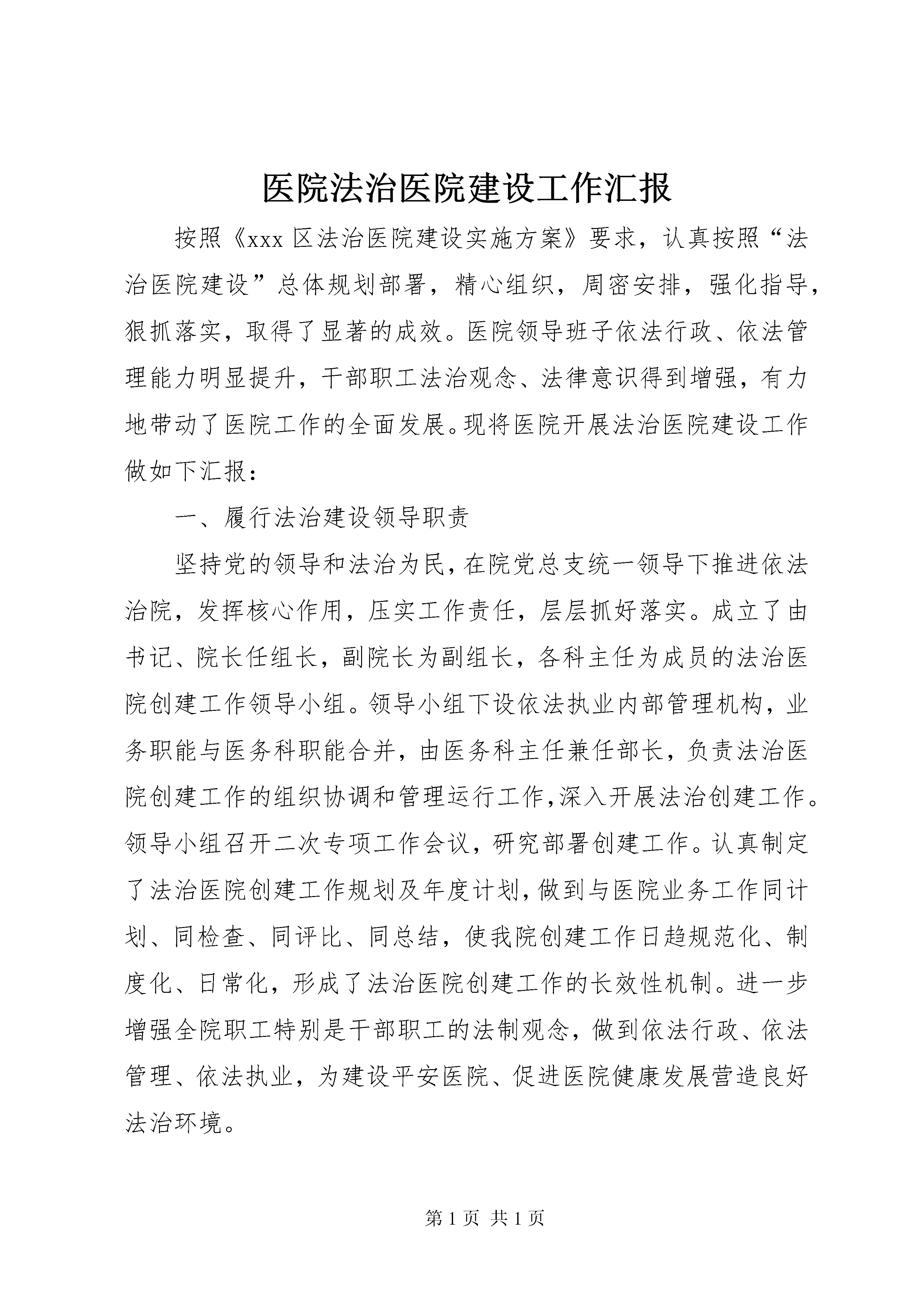 医院法治医院建设工作汇报按照《xxx区法治医院建设实施方案》要求,认真按照“法治医院建设”总体规划部署,精心组织,周密安排,强化指导,狠抓落实,取得了显著的成效。医院领导班子依法行政、依法管理能力明显提升,干部职工法治观念、法律意识得到增强,有力地带动了医院工作的全面发展。现将医院开展法治医院建设工作做如下汇报:一、履行法治建设领导职责坚持党的领导和法治为民,在院党总支统一领导下推进依法治院,发挥核心作用,压实工作责任,层层抓好落实。成立了由书记、院长任组长,副院长为副组长,各科主任为成员的法治医院创建工作领导小组。领导小组下设依法执业内部管理机构,业务职能与医务科职能合并,由医务科主任兼任部长,负责法治医院创建工作的组织协调和管理运行工作,深入开展法治创建工作。领导小组召开二次专项工作会议,研究部署创建工作。认真制定了法治医院创建工作规划及年度计划,做到与医院业务工作同计划、同检查、同评比、同总结,使我院创建工作日趋规范化、制度化、日常化,形成了法治医院创建工作的长效性机制。进一步增强全院职工特别是干部职工的法制观念,做到依法行政、依法管理、依法执业,为建设平安医院、促进医院健康发展营造良好法治环境。二、医疗机构依法执业、服务情况严格落实医院依法执业主体责任,建立健全依法执业的责任体系、制度体系。严格贯彻执行各项卫生计生法律法规,把依法执业要求全面融入医疗机构管理运行的全过程。1、严格按照《医疗机构执业许可证》核准登记的执业地点、类别规模和诊疗科目开展相应的诊疗活动,医护、药、技人员应按登记注册范围执业,在处方及手术权限内开展诊疗活动。坚持依法行医,严格执行医务人员准入制。调整了部分专业不对口的卫技人员,加强了对未取得职业资格的新进大中专毕业生的从业管理,进一步规范了医师外出会诊制度,把医护核心制度纳入院对科综合质量考核之中,有力的促进了医院管理制度的落实。2、加强医疗质量控制,严格医疗和护理质量管理。规范传染病防治及院感管理工作,规范药品及放射诊疗设备管理,加强对诊疗技术操作规范的落实情况的考核,对各科室危重症应急预案掌握应用的考核,规范科质控小组工作及对个人考核的指导。三、普法依法治理切实加强对普法工作的领导,健全普法工作机制。根据特点和实际需要,有针对性地组织开展法治宣传教育。1、认真开展“七五”普法工作,坚持党总支、支部学法制度,强化领导干部法治意识,依托“三会一课”,认真学习党的十九大会议精神,学习《宪法》《刑法》《中国共产党纪律处分条例》《中国共产党廉洁自律准则》《中国共产党党员领导干部廉洁从政若干准则》《中国共产党支部工作条例(试行)》等。2、依照年度“创建”工作计划,每月组织医疗卫生管理和技术人员学习了《执业医师法》、《药品管理法》、《传染病防治法》、《医疗机构管理条例》、《医疗事故处理条例》等相关法律、法规及医疗服务道德规范。中心为全院职工进行医疗普法讲座。联系保险公司为全院医护人员上了医疗责任险。3、为各科室配发病历书写规范文书,组织考查测试、树立典型等多种形式的辅导学习,提高医务人员病历书写质量,增强医疗护理人员法治意识,形成自觉守法和依法执医的优良风气。.4、把法治教育列为医护人员必修课。通过院内外电子显示屏、悬挂横幅将法制医院建设融入到医疗诊治的各个环节,落实在施医全过程,通过依法施教,营造出职工学法、知法、守法、护法的优良环境。四、法治医院创建1、在开展法治医院建设工作中,医院坚持以制度管事,以制度管人。通过各项制度的制订和完善,使医院管理日趋目标化、规范化、法治化。如职工考勤、绩效奖惩、科主任护士长津贴的发放、职称评聘、工作评优、投诉及医疗纠纷等工作的处理均严格做到有法可依、有章可循、有据可查,各部门运作有序,各环节管理有条不紊。2、加强民主管理,积极推行院务公开。继续深入开展院务公开工作,医院在门诊大厅设立大屏幕电子显示屏,将药品价格、医疗收费价格、医院承诺书、投诉电话在大屏幕上公示,各临床科室实施患者住院费用一日清单制,增强了医疗服务和药品收费的透明度。积极开展“三重一大”事项报告制度,维护了职工的切身利益,充分调动了职工积极性和工作热情,为增强医院凝聚力、加强内外监督、促进医患和谐、保障病人合法权益奠定了良好的基础。3、继续抓好治理医药购销领域商业贿赂工作,坚持政治学习,医德医风教育常抓不懈。合理检查、合理治疗、合理用药,规范抗菌素使用原则,控制医疗费用不合理增长,努力降低患者负担,从源头上解决看病难、看病贵问题。五、亮点或重大工作取得的成效,要体现在法治医院建设工作中,我们一边抓法律法规的宣传教育,一边抓建章立制、依法治院工作,紧紧围绕医疗工作这个中心,开展了大量的工作,取得了一定的成效:1、社会效益和经济效益明显提高。我院自开展法治医院建设工作以来,物质文明和