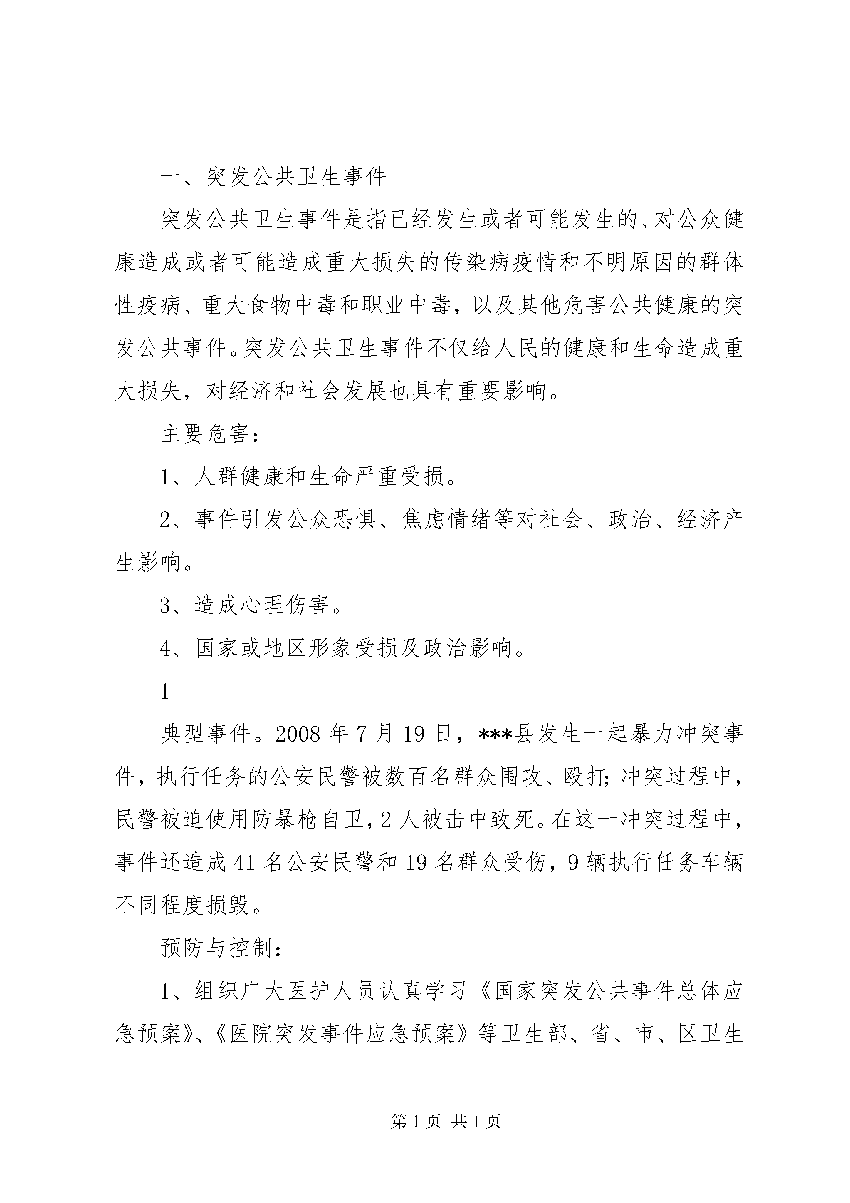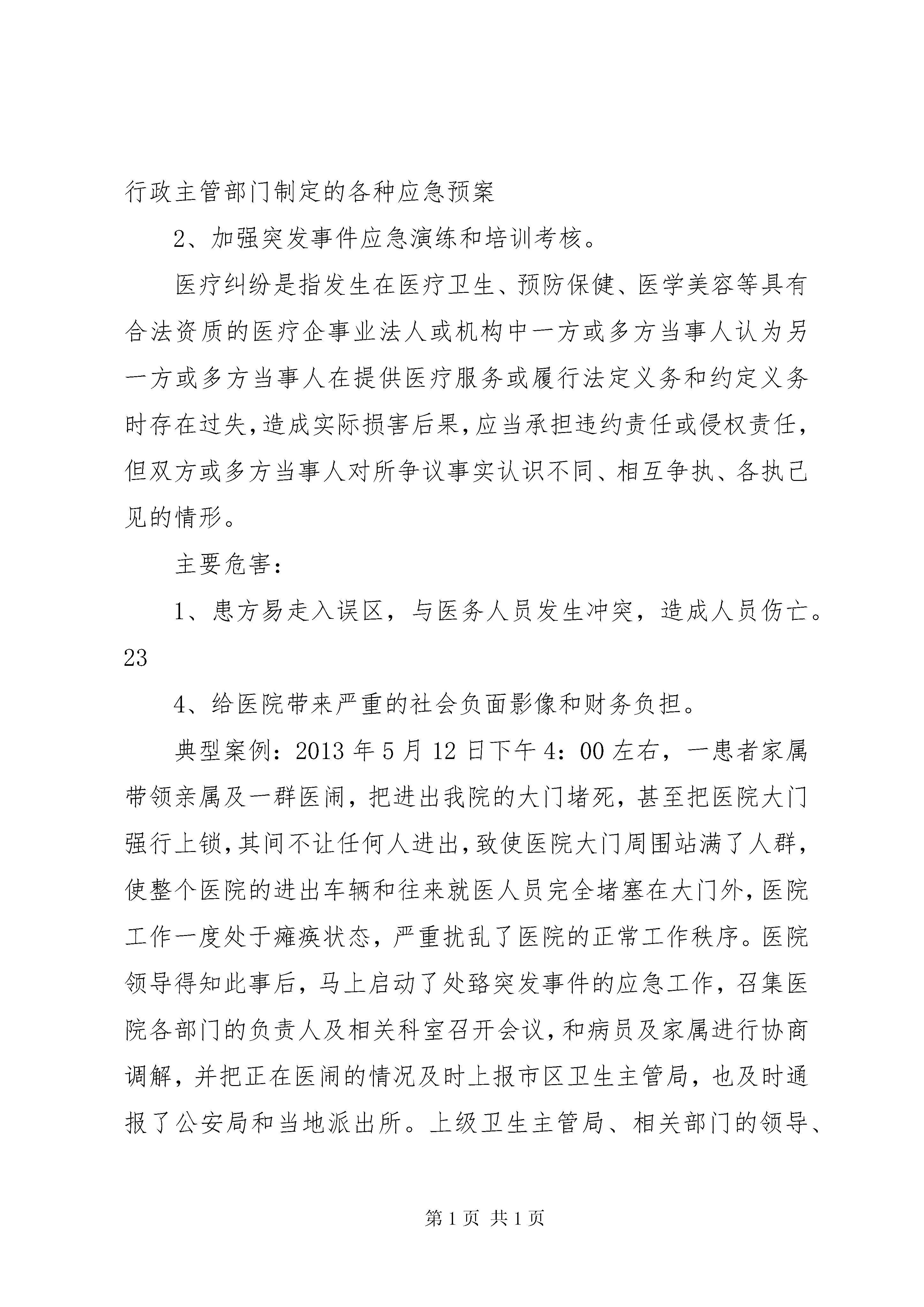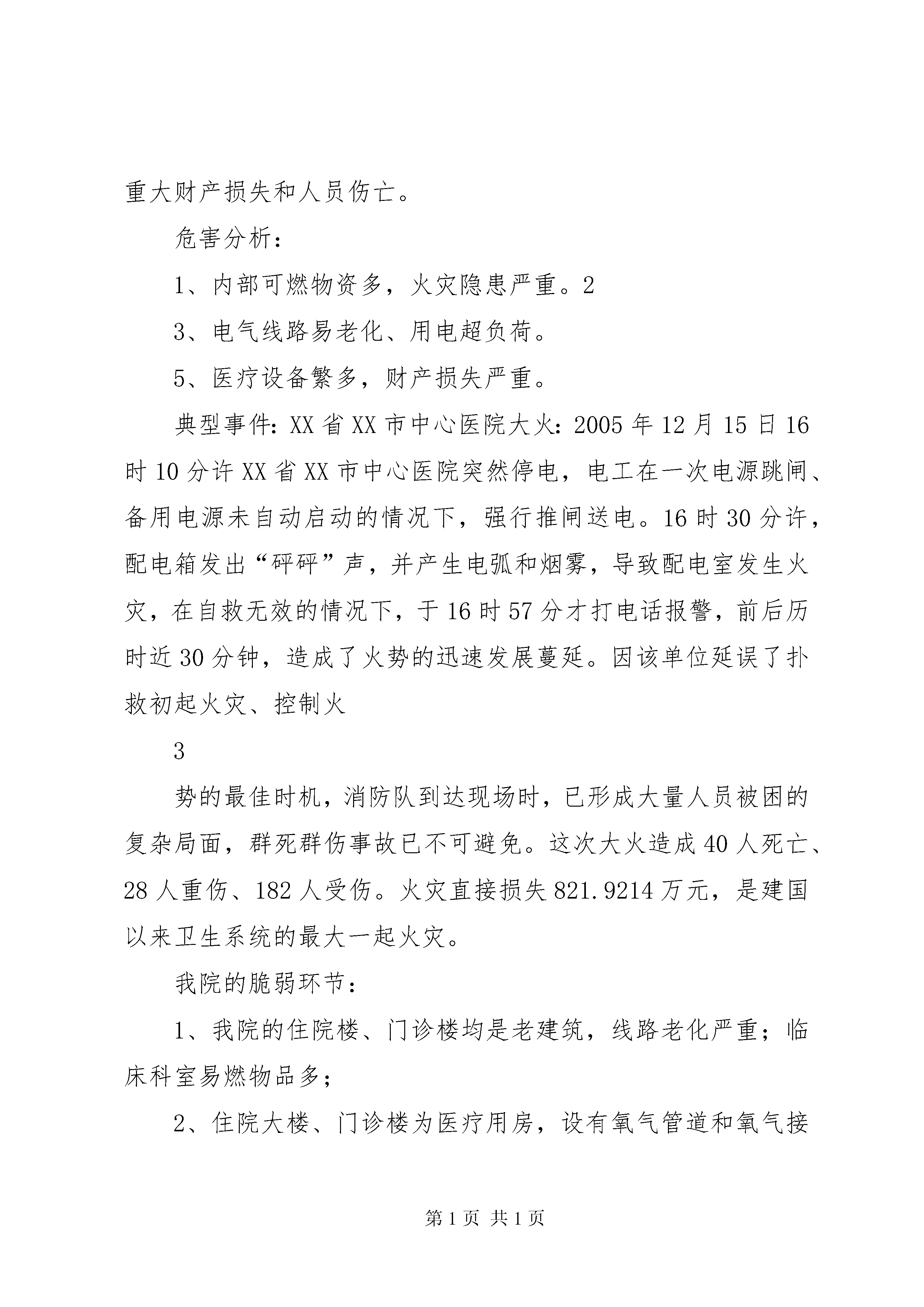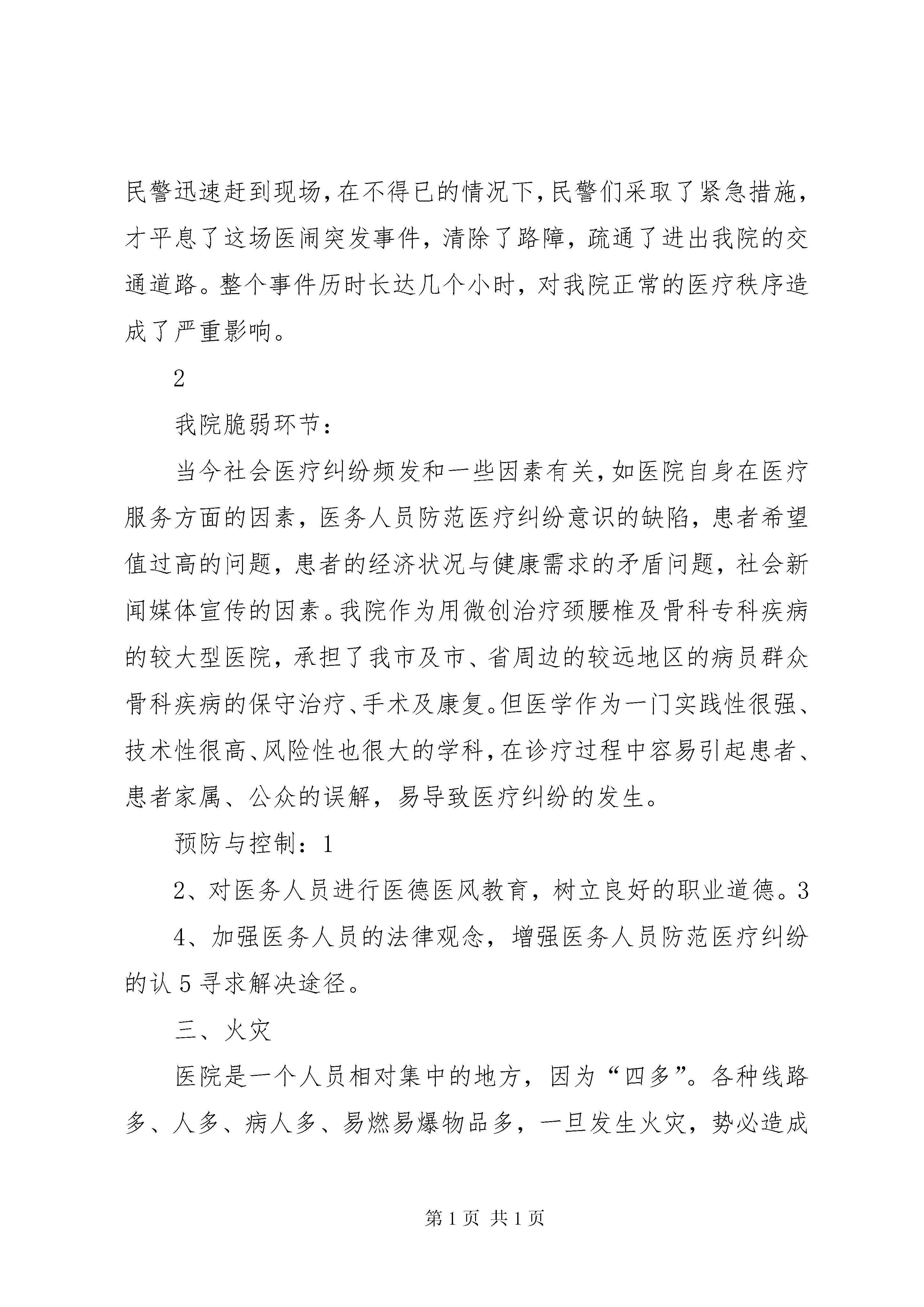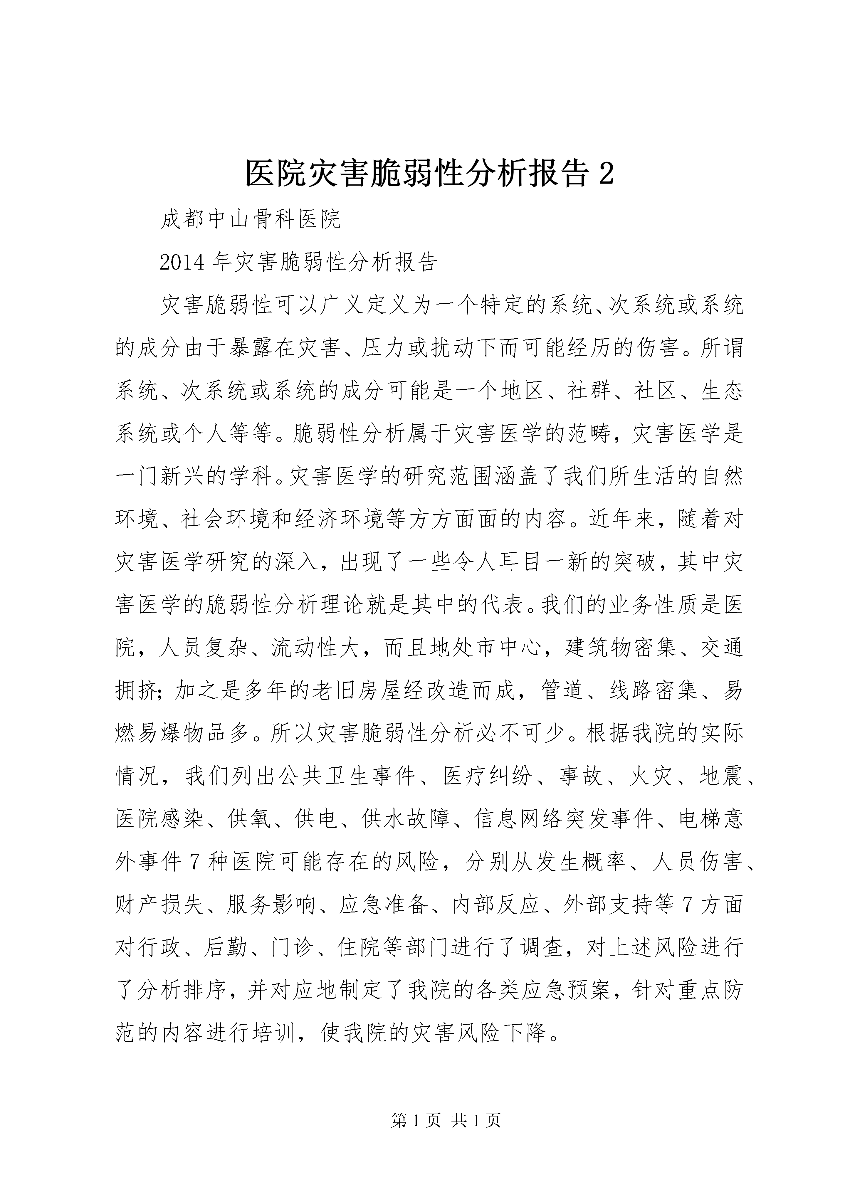 医院灾害脆弱性分析报告2成都中山骨科医院2014年灾害脆弱性分析报告灾害脆弱性可以广义定义为一个特定的系统、次系统或系统的成分由于暴露在灾害、压力或扰动下而可能经历的伤害。所谓系统、次系统或系统的成分可能是一个地区、社群、社区、生态系统或个人等等。脆弱性分析属于灾害医学的范畴,灾害医学是一门新兴的学科。灾害医学的研究范围涵盖了我们所生活的自然环境、社会环境和经济环境等方方面面的内容。近年来,随着对灾害医学研究的深入,出现了一些令人耳目一新的突破,其中灾害医学的脆弱性分析理论就是其中的代表。我们的业务性质是医院,人员复杂、流动性大,而且地处市中心,建筑物密集、交通拥挤;加之是多年的老旧房屋经改造而成,管道、线路密集、易燃易爆物品多。所以灾害脆弱性分析必不可少。根据我院的实际情况,我们列出公共卫生事件、医疗纠纷、事故、火灾、地震、医院感染、供氧、供电、供水故障、信息网络突发事件、电梯意外事件7种医院可能存在的风险,分别从发生概率、人员伤害、财产损失、服务影响、应急准备、内部反应、外部支持等7方面对行政、后勤、门诊、住院等部门进行了调查,对上述风险进行了分析排序,并对应地制定了我院的各类应急预案,针对重点防范的内容进行培训,使我院的灾害风险下降。一、突发公共卫生事件突发公共卫生事件是指已经发生或者可能发生的、对公众健康造成或者可能造成重大损失的传染病疫情和不明原因的群体性疫病、重大食物中毒和职业中毒,以及其他危害公共健康的突发公共事件。突发公共卫生事件不仅给人民的健康和生命造成重大损失,对经济和社会发展也具有重要影响。主要危害:1、人群健康和生命严重受损。2、事件引发公众恐惧、焦虑情绪等对社会、政治、经济产生影响。3、造成心理伤害。4、国家或地区形象受损及政治影响。1典型事件。2008年7月19日,***县发生一起暴力冲突事件,执行任务的公安民警被数百名群众围攻、殴打;冲突过程中,民警被迫使用防暴枪自卫,2人被击中致死。在这一冲突过程中,事件还造成41名公安民警和19名群众受伤,9辆执行任务车辆不同程度损毁。预防与控制:1、组织广大医护人员认真学习《国家突发公共事件总体应急预案》、《医院突发事件应急预案》等卫生部、省、市、区卫生行政主管部门制定的各种应急预案2、加强突发事件应急演练和培训考核。医疗纠纷是指发生在医疗卫生、预防保健、医学美容等具有合法资质的医疗企事业法人或机构中一方或多方当事人认为另一方或多方当事人在提供医疗服务或履行法定义务和约定义务时存在过失,造成实际损害后果,应当承担违约责任或侵权责任,但双方或多方当事人对所争议事实认识不同、相互争执、各执己见的情形。主要危害:1、患方易走入误区,与医务人员发生冲突,造成人员伤亡。234、给医院带来严重的社会负面影像和财务负担。典型案例:2013年5月12日下午4:00左右,一患者家属带领亲属及一群医闹,把进出我院的大门堵死,甚至把医院大门强行上锁,其间不让任何人进出,致使医院大门周围站满了人群,使整个医院的进出车辆和往来就医人员完全堵塞在大门外,医院工作一度处于瘫痪状态,严重扰乱了医院的正常工作秩序。医院领导得知此事后,马上启动了处臵突发事件的应急工作,召集医院各部门的负责人及相关科室召开会议,和病员及家属进行协商调解,并把正在医闹的情况及时上报市区卫生主管局,也及时通报了公安局和当地派出所。上级卫生主管局、相关部门的领导、民警迅速赶到现场,在不得已的情况下,民警们采取了紧急措施,才平息了这场医闹突发事件,清除了路障,疏通了进出我院的交通道路。整个事件历时长达几个小时,对我院正常的医疗秩序造成了严重影响。2我院脆弱环节:当今社会医疗纠纷频发和一些因素有关,如医院自身在医疗服务方面的因素,医务人员防范医疗纠纷意识的缺陷,患者希望值过高的问题,患者的经济状况与健康需求的矛盾问题,社会新闻媒体宣传的因素。我院作为用微创治疗颈腰椎及骨科专科疾病的较大型医院,承担了我市及市、省周边的较远地区的病员群众骨科疾病的保守治疗、手术及康复。但医学作为一门实践性很强、技术性很高、风险性也很大的学科,在诊疗过程中容易引起患者、患者家属、公众的误解,易导致医疗纠纷的发生。预防与控制:12、对医务人员进行医德医风教育,树立良好的职业道德。34、加强医务人员的法律观念,增强医务人员防范医疗纠纷的认5寻求解决途径。三、火灾医院是一个人员相对集中的地方,因为“四多”。各种线路多、人多、病人多、易燃易爆物品多,一旦发生火灾,势必造成重大财产损失和人员伤亡。危害分析:1、内部可燃物资多,火灾隐患严重。23、电气线路易老化、用电超负荷。5、医疗设备繁多,财产损失严重。典型事件:XX省XX市中心医院大火:2005年12月15日16时10分许XX省XX市中心医院突然停电,电工在一次电源跳闸、备