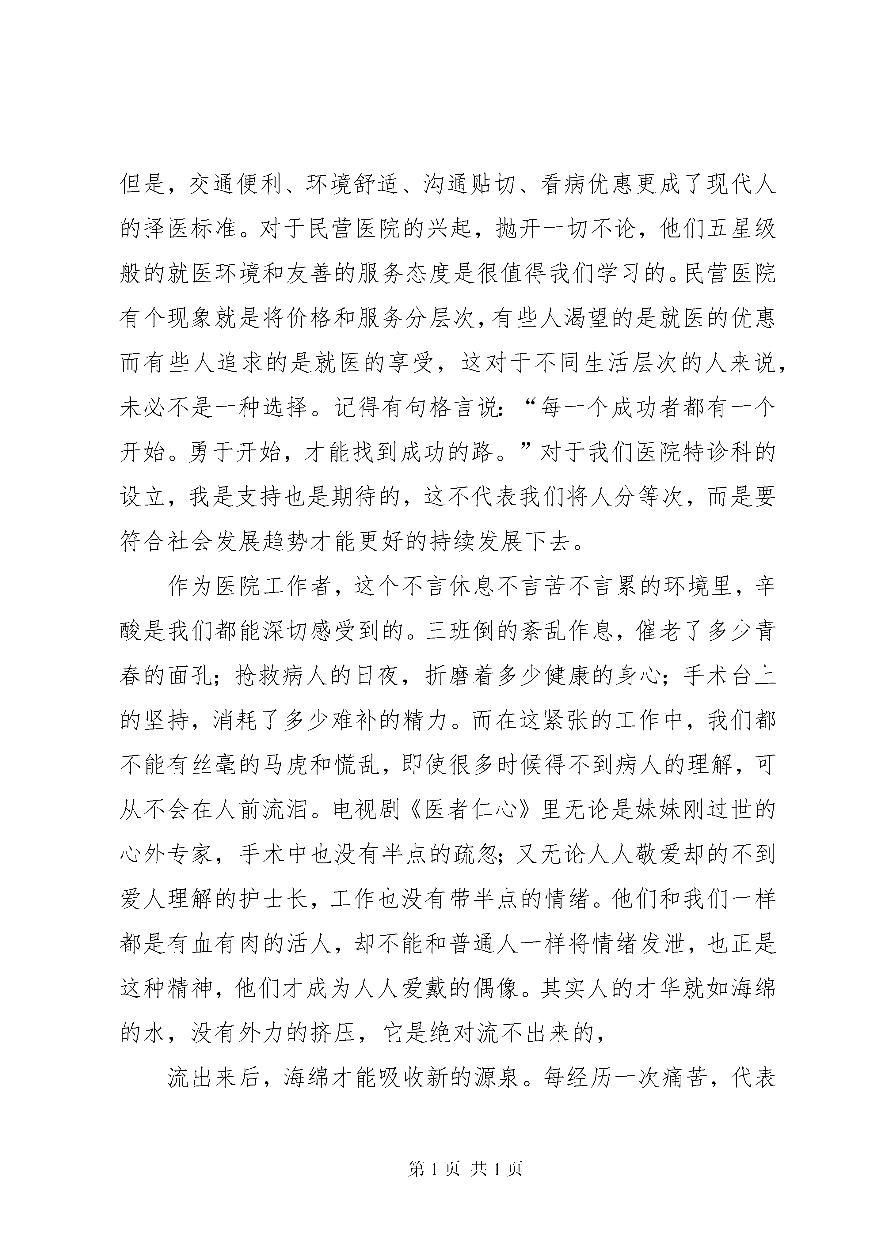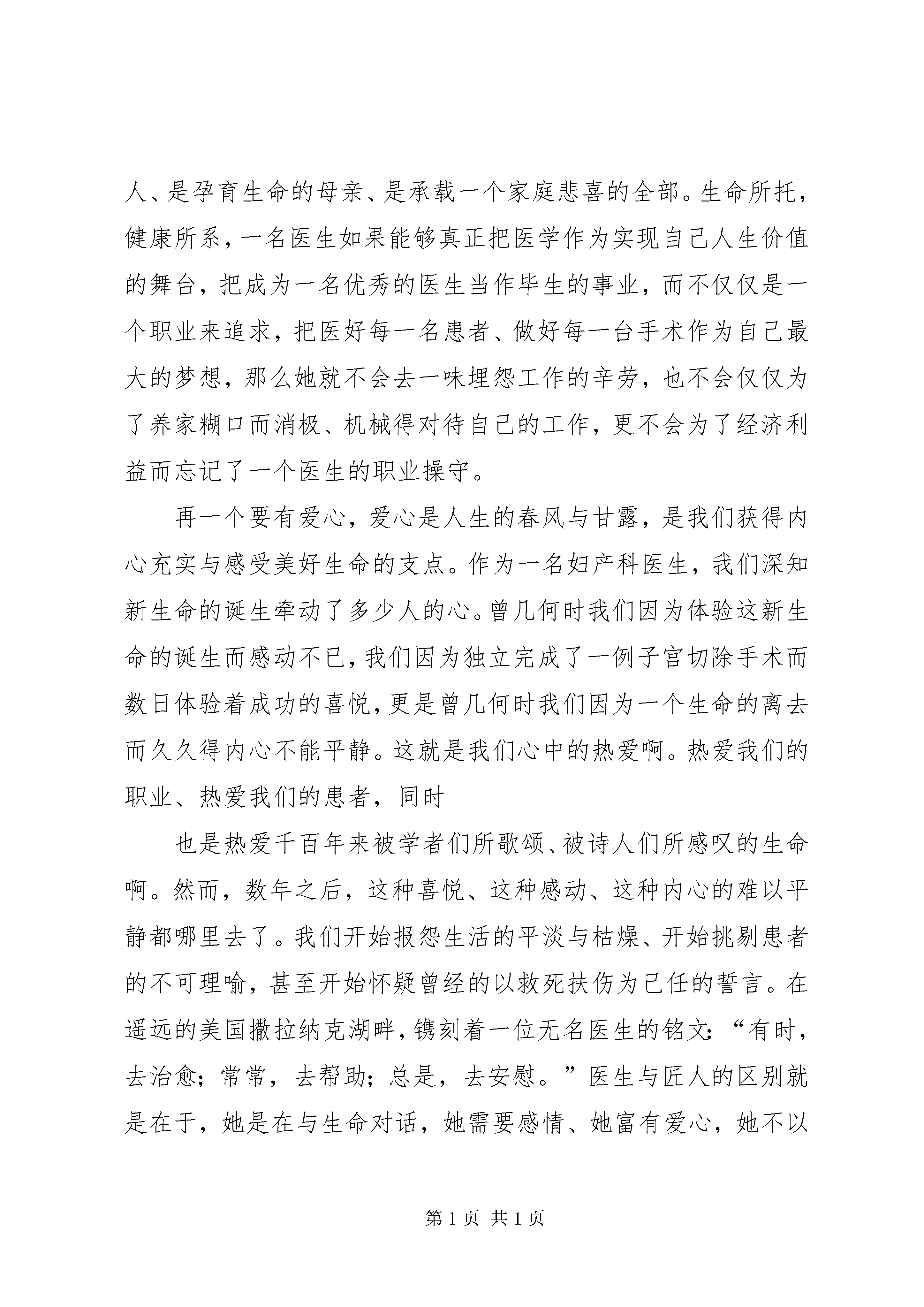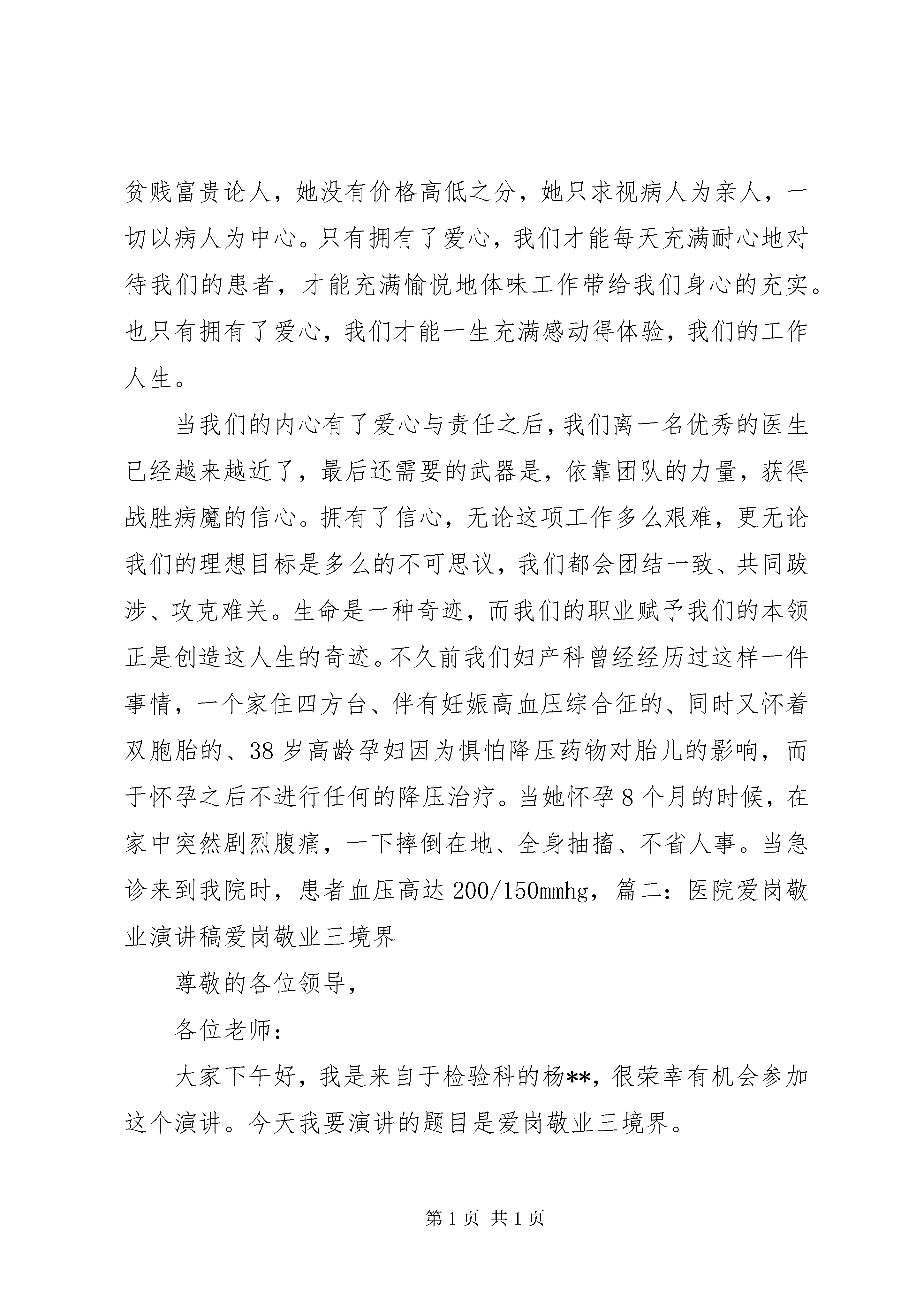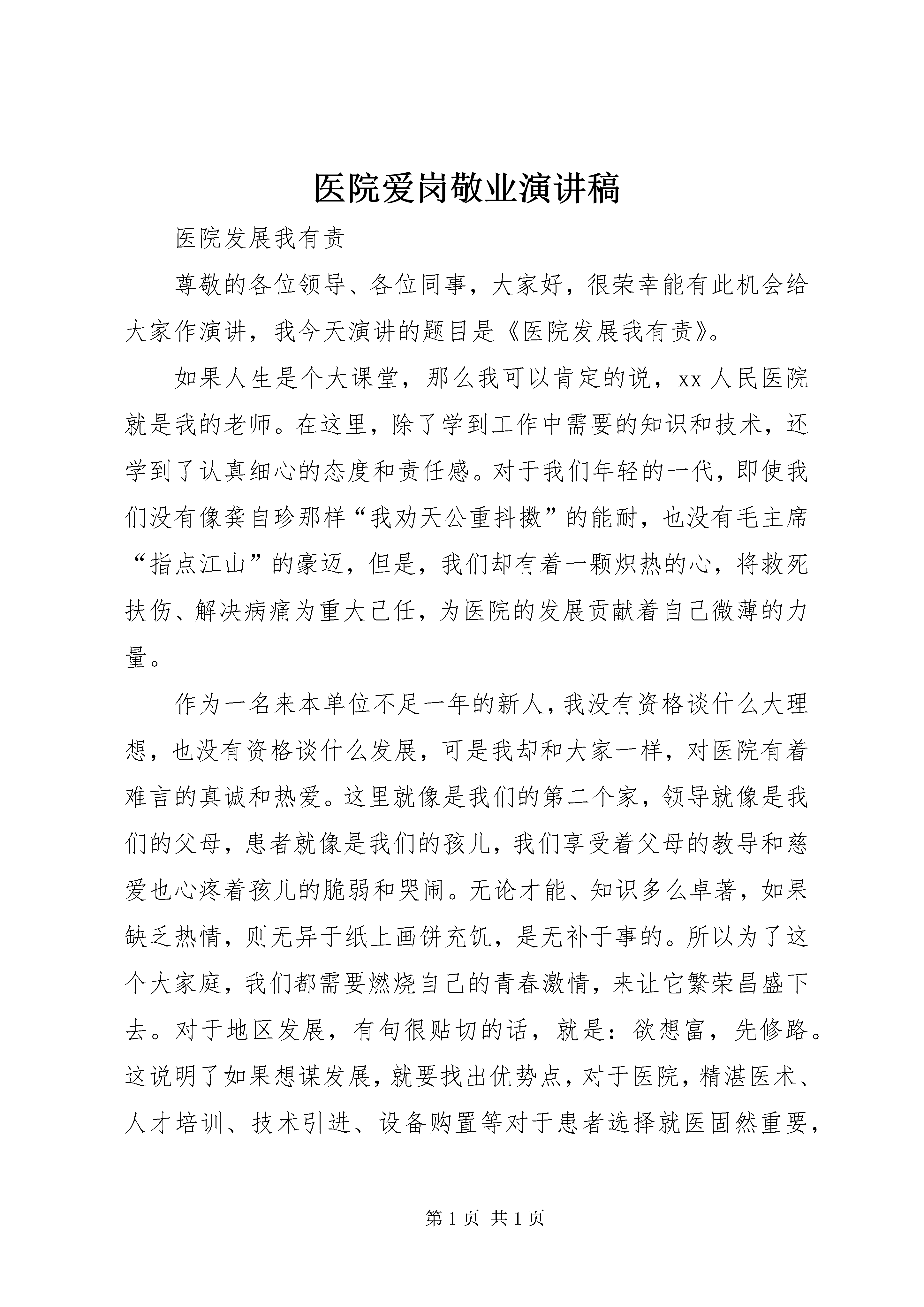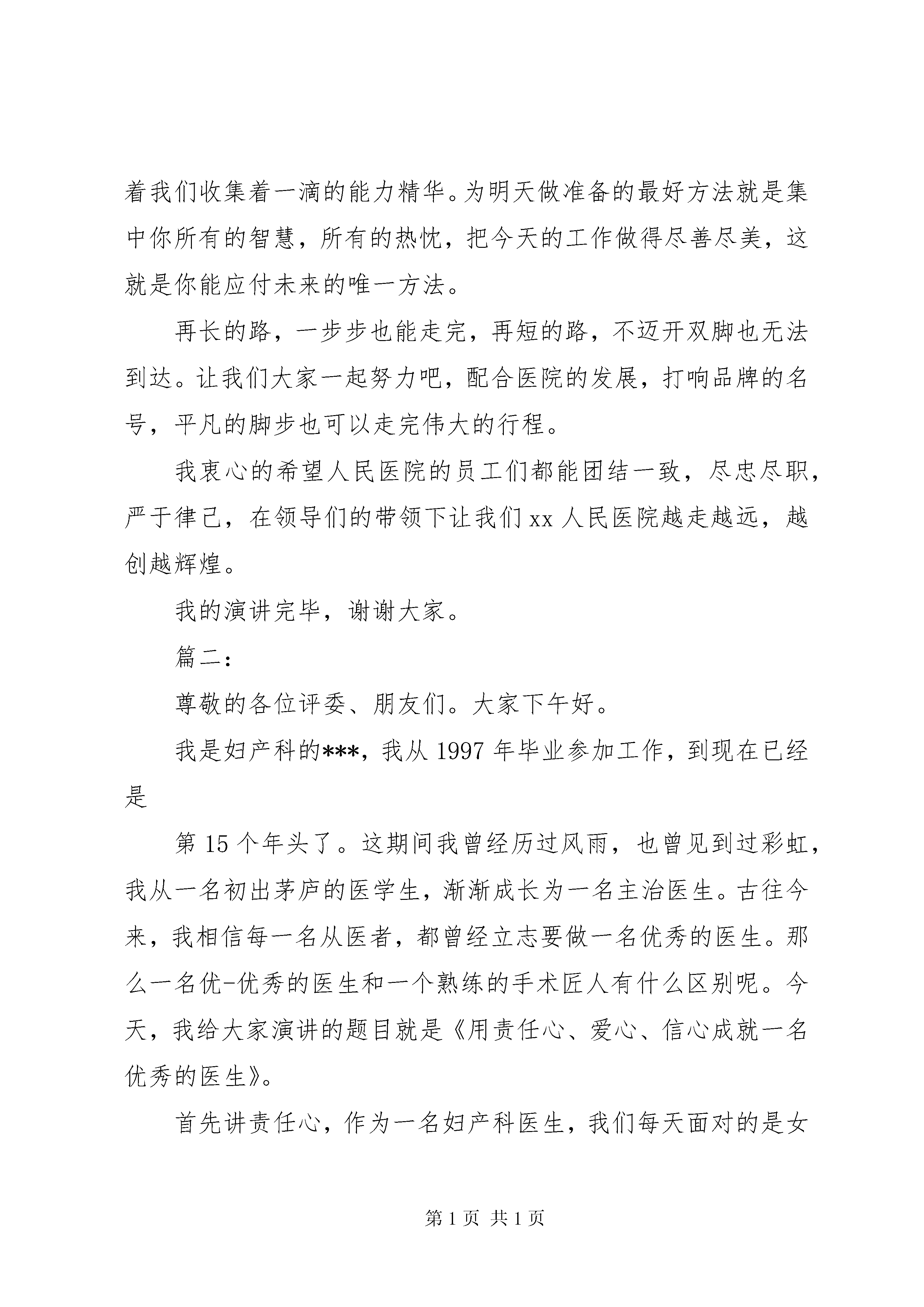 医院爱岗敬业演讲稿医院发展我有责尊敬的各位领导、各位同事,大家好,很荣幸能有此机会给大家作演讲,我今天演讲的题目是《医院发展我有责》。如果人生是个大课堂,那么我可以肯定的说,xx人民医院就是我的老师。在这里,除了学到工作中需要的知识和技术,还学到了认真细心的态度和责任感。对于我们年轻的一代,即使我们没有像龚自珍那样“我劝天公重抖擞”的能耐,也没有毛主席“指点江山”的豪迈,但是,我们却有着一颗炽热的心,将救死扶伤、解决病痛为重大己任,为医院的发展贡献着自己微薄的力量。作为一名来本单位不足一年的新人,我没有资格谈什么大理想,也没有资格谈什么发展,可是我却和大家一样,对医院有着难言的真诚和热爱。这里就像是我们的第二个家,领导就像是我们的父母,患者就像是我们的孩儿,我们享受着父母的教导和慈爱也心疼着孩儿的脆弱和哭闹。无论才能、知识多么卓著,如果缺乏热情,则无异于纸上画饼充饥,是无补于事的。所以为了这个大家庭,我们都需要燃烧自己的青春激情,来让它繁荣昌盛下去。对于地区发展,有句很贴切的话,就是:欲想富,先修路。这说明了如果想谋发展,就要找出优势点,对于医院,精湛医术、人才培训、技术引进、设备购置等对于患者选择就医固然重要,但是,交通便利、环境舒适、沟通贴切、看病优惠更成了现代人的择医标准。对于民营医院的兴起,抛开一切不论,他们五星级般的就医环境和友善的服务态度是很值得我们学习的。民营医院有个现象就是将价格和服务分层次,有些人渴望的是就医的优惠而有些人追求的是就医的享受,这对于不同生活层次的人来说,未必不是一种选择。记得有句格言说:“每一个成功者都有一个开始。勇于开始,才能找到成功的路。”对于我们医院特诊科的设立,我是支持也是期待的,这不代表我们将人分等次,而是要符合社会发展趋势才能更好的持续发展下去。作为医院工作者,这个不言休息不言苦不言累的环境里,辛酸是我们都能深切感受到的。三班倒的紊乱作息,催老了多少青春的面孔;抢救病人的日夜,折磨着多少健康的身心;手术台上的坚持,消耗了多少难补的精力。而在这紧张的工作中,我们都不能有丝毫的马虎和慌乱,即使很多时候得不到病人的理解,可从不会在人前流泪。电视剧《医者仁心》里无论是妹妹刚过世的心外专家,手术中也没有半点的疏忽;又无论人人敬爱却的不到爱人理解的护士长,工作也没有带半点的情绪。他们和我们一样都是有血有肉的活人,却不能和普通人一样将情绪发泄,也正是这种精神,他们才成为人人爱戴的偶像。其实人的才华就如海绵的水,没有外力的挤压,它是绝对流不出来的,流出来后,海绵才能吸收新的源泉。每经历一次痛苦,代表着我们收集着一滴的能力精华。为明天做准备的最好方法就是集中你所有的智慧,所有的热忱,把今天的工作做得尽善尽美,这就是你能应付未来的唯一方法。再长的路,一步步也能走完,再短的路,不迈开双脚也无法到达。让我们大家一起努力吧,配合医院的发展,打响品牌的名号,平凡的脚步也可以走完伟大的行程。我衷心的希望人民医院的员工们都能团结一致,尽忠尽职,严于律己,在领导们的带领下让我们xx人民医院越走越远,越创越辉煌。我的演讲完毕,谢谢大家。篇二:尊敬的各位评委、朋友们。大家下午好。我是妇产科的***,我从1997年毕业参加工作,到现在已经是第15个年头了。这期间我曾经历过风雨,也曾见到过彩虹,我从一名初出茅庐的医学生,渐渐成长为一名主治医生。古往今来,我相信每一名从医者,都曾经立志要做一名优秀的医生。那么一名优-优秀的医生和一个熟练的手术匠人有什么区别呢。今天,我给大家演讲的题目就是《用责任心、爱心、信心成就一名优秀的医生》。首先讲责任心,作为一名妇产科医生,我们每天面对的是女人、是孕育生命的母亲、是承载一个家庭悲喜的全部。生命所托,健康所系,一名医生如果能够真正把医学作为实现自己人生价值的舞台,把成为一名优秀的医生当作毕生的事业,而不仅仅是一个职业来追求,把医好每一名患者、做好每一台手术作为自己最大的梦想,那么她就不会去一味埋怨工作的辛劳,也不会仅仅为了养家糊口而消极、机械得对待自己的工作,更不会为了经济利益而忘记了一个医生的职业操守。再一个要有爱心,爱心是人生的春风与甘露,是我们获得内心充实与感受美好生命的支点。作为一名妇产科医生,我们深知新生命的诞生牵动了多少人的心。曾几何时我们因为体验这新生命的诞生而感动不已,我们因为独立完成了一例子宫切除手术而数日体验着成功的喜悦,更是曾几何时我们因为一个生命的离去而久久得内心不能平静。这就是我们心中的热爱啊。热爱我们的职业、热爱我们的患者,同时也是热爱千百年来被学者们所歌颂、被诗人们所感叹的生命啊。然而,数年之后,这种喜悦、这种感动、这种内心的难以平静都哪里去了。我们开始报怨生活的平淡与枯燥、开始挑剔患者的不可理喻,甚至开始怀疑曾经的以救死扶伤为己任