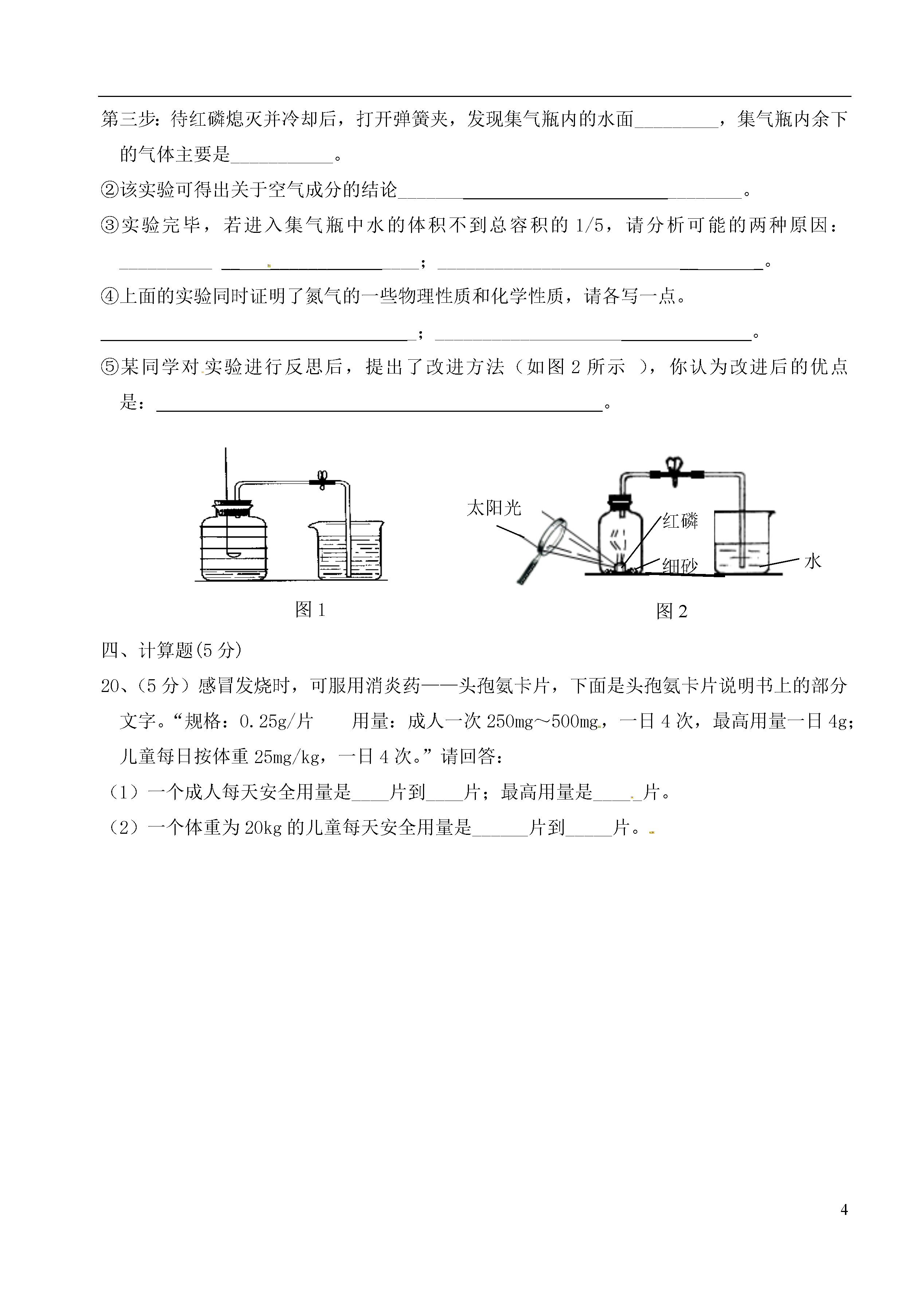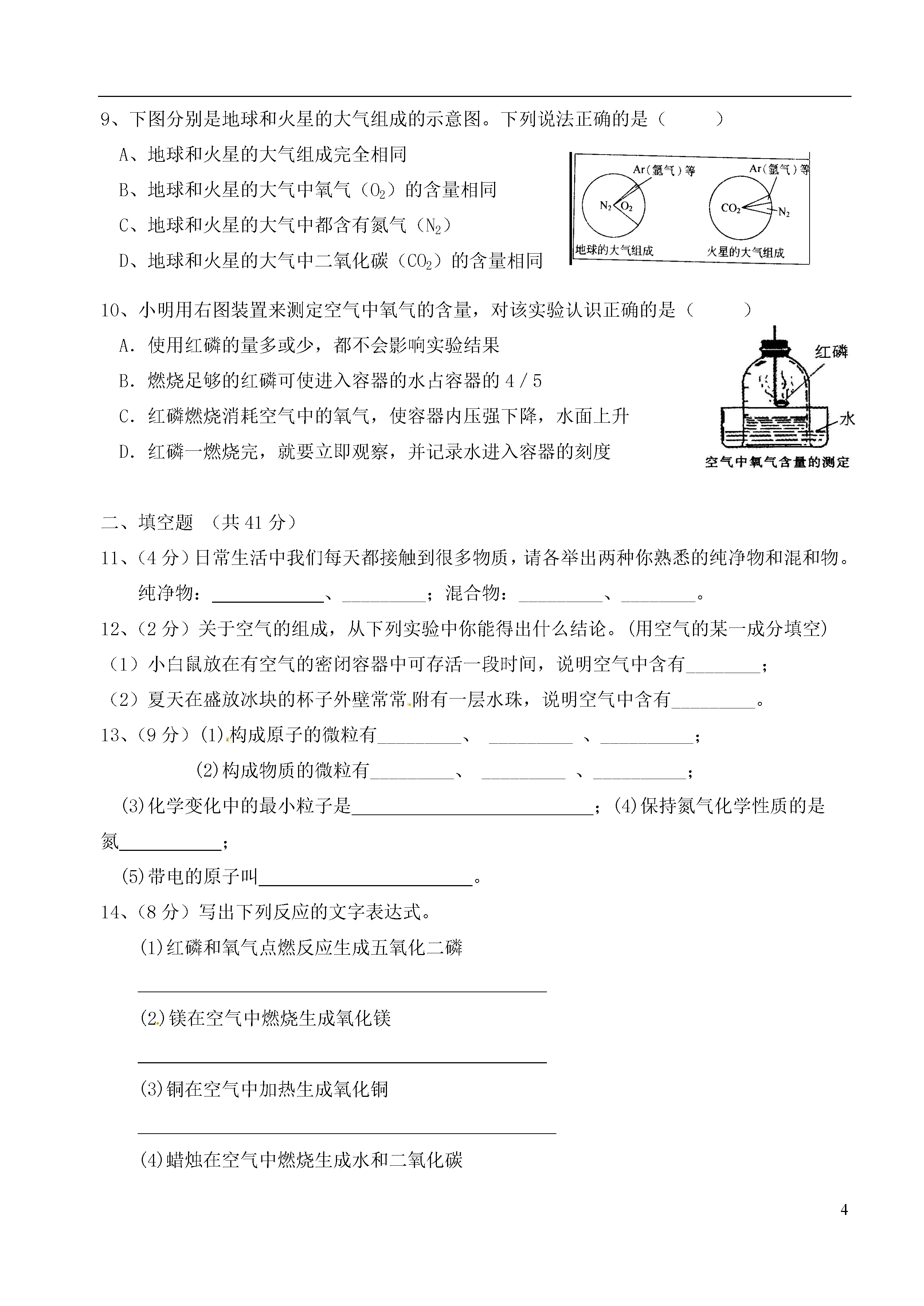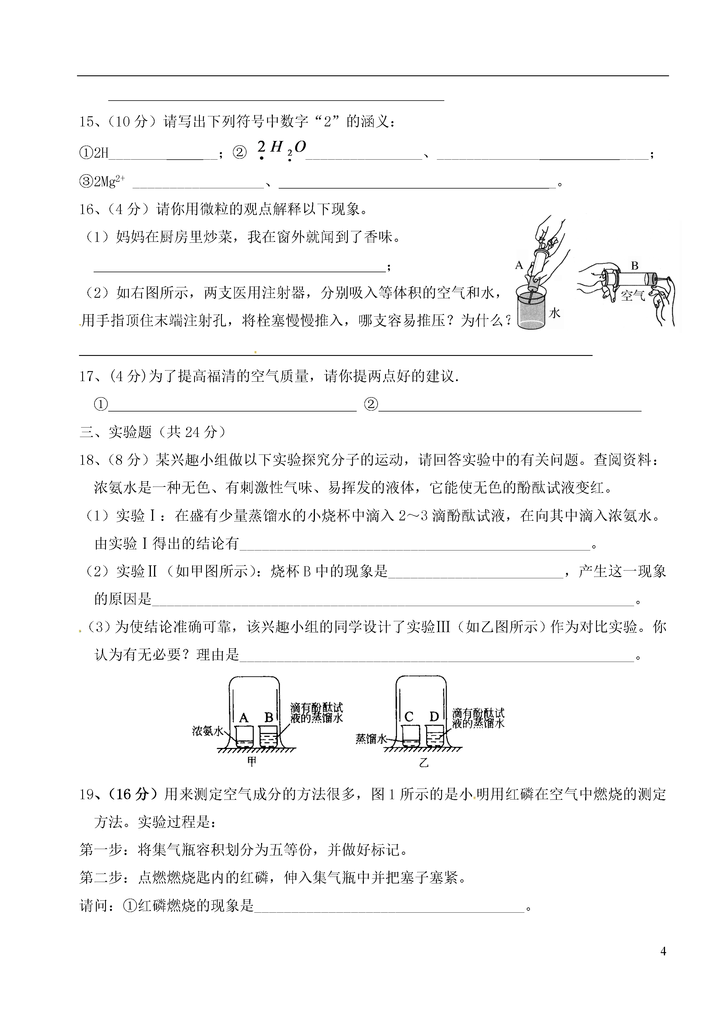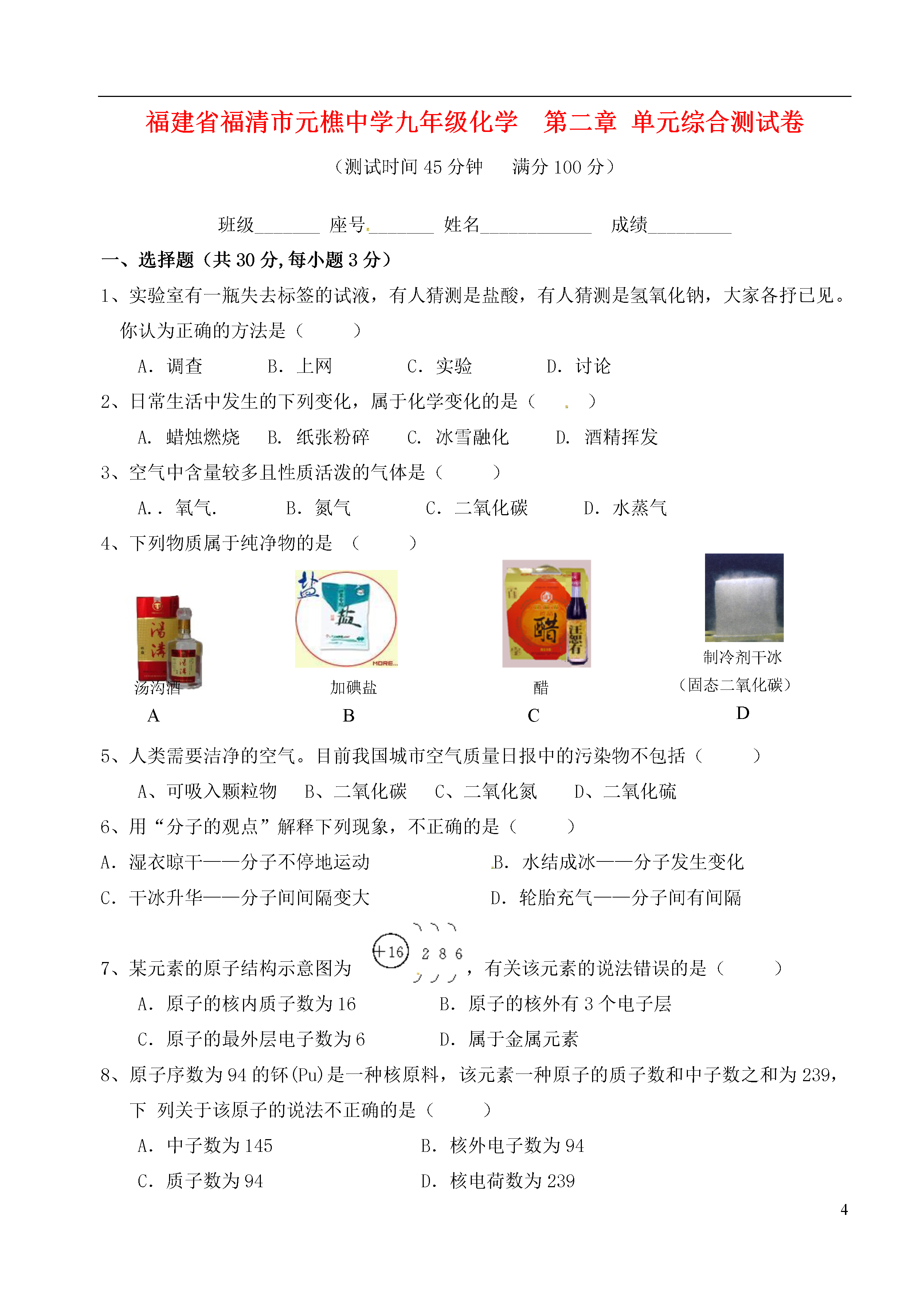 4福建省福清市元樵中学九年级化学第二章单元综合测试卷(测试时间45分钟满分100分)班级_______座号_______姓名____________成绩_________一、选择题(共30分,每小题3分)1、实验室有一瓶失去标签的试液,有人猜测是盐酸,有人猜测是氢氧化钠,大家各抒已见。你认为正确的方法是()A.调查B.上网C.实验D.讨论2、日常生活中发生的下列变化,属于化学变化的是()A.蜡烛燃烧B.纸张粉碎C.冰雪融化D.酒精挥发3、空气中含量较多且性质活泼的气体是()A..氧气.B.氮气C.二氧化碳D.水蒸气4、下列物质属于纯净物的是()制冷剂干冰(固态二氧化碳)D醋C加碘盐B汤沟酒A5、人类需要洁净的空气。目前我国城市空气质量日报中的污染物不包括()A、可吸入颗粒物B、二氧化碳C、二氧化氮D、二氧化硫6、用“分子的观点”解释下列现象,不正确的是()A.湿衣晾干——分子不停地运动B.水结成冰——分子发生变化C.干冰升华——分子间间隔变大D.轮胎充气——分子间有间隔7、某元素的原子结构示意图为,有关该元素的说法错误的是()A.原子的核内质子数为16B.原子的核外有3个电子层C.原子的最外层电子数为6D.属于金属元素8、原子序数为94的钚(Pu)是一种核原料,该元素一种原子的质子数和中子数之和为239,下列关于该原子的说法不正确的是()A.中子数为145B.核外电子数为94C.质子数为94D.核电荷数为2399、下图分别是地球和火星的大气组成的示意图。下列说法正确的是()A、地球和火星的大气组成完全相同B、地球和火星的大气中氧气(O2)的含量相同C、地球和火星的大气中都含有氮气(N2)D、地球和火星的大气中二氧化碳(CO2)的含量相同10、小明用右图装置来测定空气中氧气的含量,对该实验认识正确的是()A.使用红磷的量多或少,都不会影响实验结果B.燃烧足够的红磷可使进入容器的水占容器的4/5C.红磷燃烧消耗空气中的氧气,使容器内压强下降,水面上升D.红磷一燃烧完,就要立即观察,并记录水进入容器的刻度二、填空题(共41分)11、(4分)日常生活中我们每天都接触到很多物质,请各举出两种你熟悉的纯净物和混和物。纯净物:________、_________;混合物:_________、________。12、(2分)关于空气的组成,从下列实验中你能得出什么结论。(用空气的某一成分填空)(1)小白鼠放在有空气的密闭容器中可存活一段时间,说明空气中含有________;(2)夏天在盛放冰块的杯子外壁常常附有一层水珠,说明空气中含有_________。13、(9分)(1)构成原子的微粒有_________、_________、__________;(2)构成物质的微粒有_________、_________、__________;(3)化学变化中的最小粒子是;(4)保持氮气化学性质的是氮;(5)带电的原子叫。14、(8分)写出下列反应的文字表达式。(1)红磷和氧气点燃反应生成五氧化二磷(2)镁在空气中燃烧生成氧化镁(3)铜在空气中加热生成氧化铜(4)蜡烛在空气中燃烧生成水和二氧化碳15、(10分)请写出下列符号中数字“2”的涵义:①2H_____________;②________________、__________________;③2Mg2+__________________、__________________。16、(4分)请你用微粒的观点解释以下现象。(1)妈妈在厨房里炒菜,我在窗外就闻到了香味。;(2)如右图所示,两支医用注射器,分别吸入等体积的空气和水,用手指顶住末端注射孔,将栓塞慢慢推入,哪支容易推压?为什么?17、(4分)为了提高福清的空气质量,请你提两点好的建议.①②三、实验题(共24分)18、(8分)某兴趣小组做以下实验探究分子的运动,请回答实验中的有关问题。查阅资料:浓氨水是一种无色、有刺激性气味、易挥发的液体,它能使无色的酚酞试液变红。(1)实验Ⅰ:在盛有少量蒸馏水的小烧杯中滴入2~3滴酚酞试液,在向其中滴入浓氨水。由实验Ⅰ得出的结论有________________________________________________。(2)实验Ⅱ(如甲图所示):烧杯B中的现象是________________________,产生这一现象的原因是__________________________________________________________________。(3)为使结论准确可靠,该