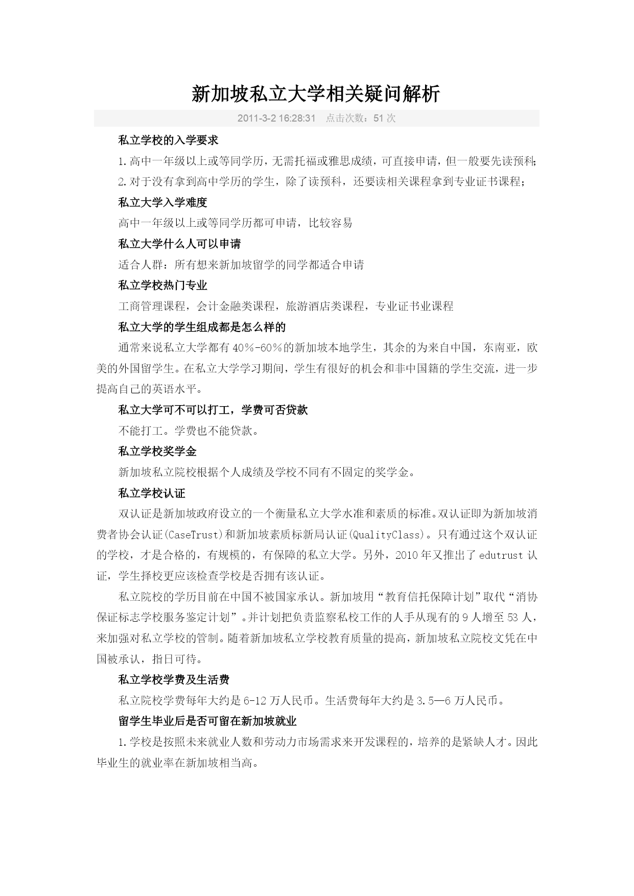 新加坡私立大学相关疑问解析 2011-3-216:28:31点击次数:51次 私立学校的入学要求 1.高中一年级以上或等同学历,无需托福或雅思成绩,可直接申请,但一般要先读预科; 2.对于没有拿到高中学历的学生,除了读预科,还要读相关课程拿到专业证书课程; 私立大学入学难度 高中一年级以上或等同学历都可申请,比较容易 私立大学什么人可以申请 适合人群:所有想来新加坡留学的同学都适合申请 私立学校热门专业 工商管理课程,会计金融类课程,旅游酒店类课程,专业证书业课程 私立大学的学生组成都是怎么样的 通常来说私立大学都有40%-60%的新加坡本地学生,其余的为来自中国,东南亚,欧美的外国留学生。在私立大学学习期间,学生有很好的机会和非中国籍的学生交流,进一步提高自己的英语水平。 私立大学可不可以打工,学费可否贷款 不能打工。学费也不能贷款。 私立学校奖学金 新加坡私立院校根据个人成绩及学校不同有不固定的奖学金。 私立学校认证 双认证是新加坡政府设立的一个衡量私立大学水准和素质的标准。双认证即为新加坡消费者协会认证(CaseTrust)和新加坡素质标新局认证(QualityClass)。只有通过这个双认证的学校,才是合格的,有规模的,有保障的私立大学。另外,2010年又推出了edutrust认证,学生择校更应该检查学校是否拥有该认证。 私立院校的学历目前在中国不被国家承认。新加坡用“教育信托保障计划”取代“消协保证标志学校服务鉴定计划”。并计划把负责监察私校工作的人手从现有的9人增至53人,来加强对私立学校的管制。随着新加坡私立学校教育质量的提高,新加坡私立院校文凭在中国被承认,指日可待。 私立学校学费及生活费 私立院校学费每年大约是6-12万人民币。生活费每年大约是3.5—6万人民币。 留学生毕业后是否可留在新加坡就业 1.学校是按照未来就业人数和劳动力市场需求来开发课程的,培养的是紧缺人才。因此毕业生的就业率在新加坡相当高。 2.新加坡是一个开放的国家,学生毕业后,不会受到国籍和种族的排斥,公司会根据学生的成绩和能力决定要不要聘请这个学生,找到工作后,学生准证转为工作准证,继而可以申请永久居留权,再进一步申请成为新加坡公民。 私立大学毕业后是否可以在新加坡工作移民 私立大学毕业后,学生选择留在新加坡工作,半年以上,根据学生的学历,薪水,在新年限等情况不同,可申请新加坡绿卡,成为新加坡公民。