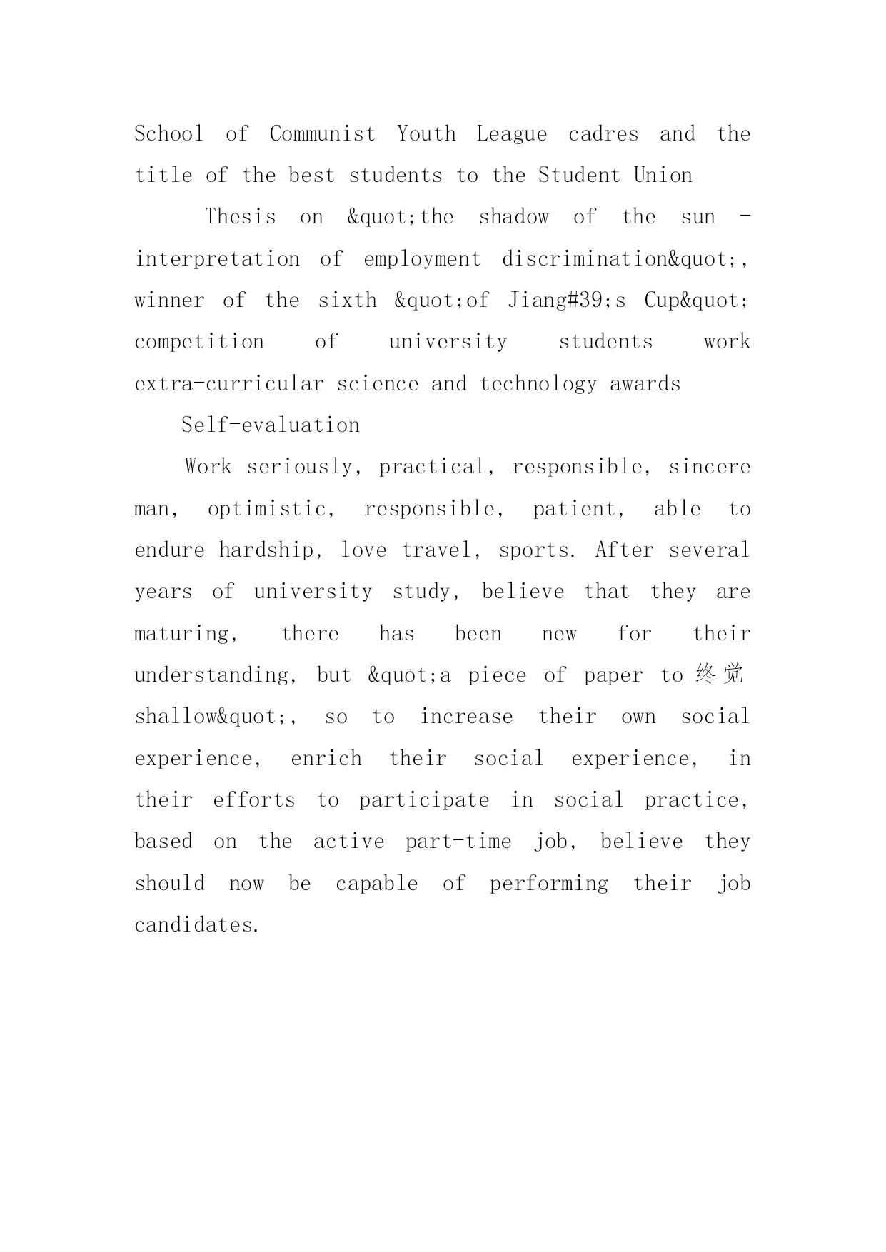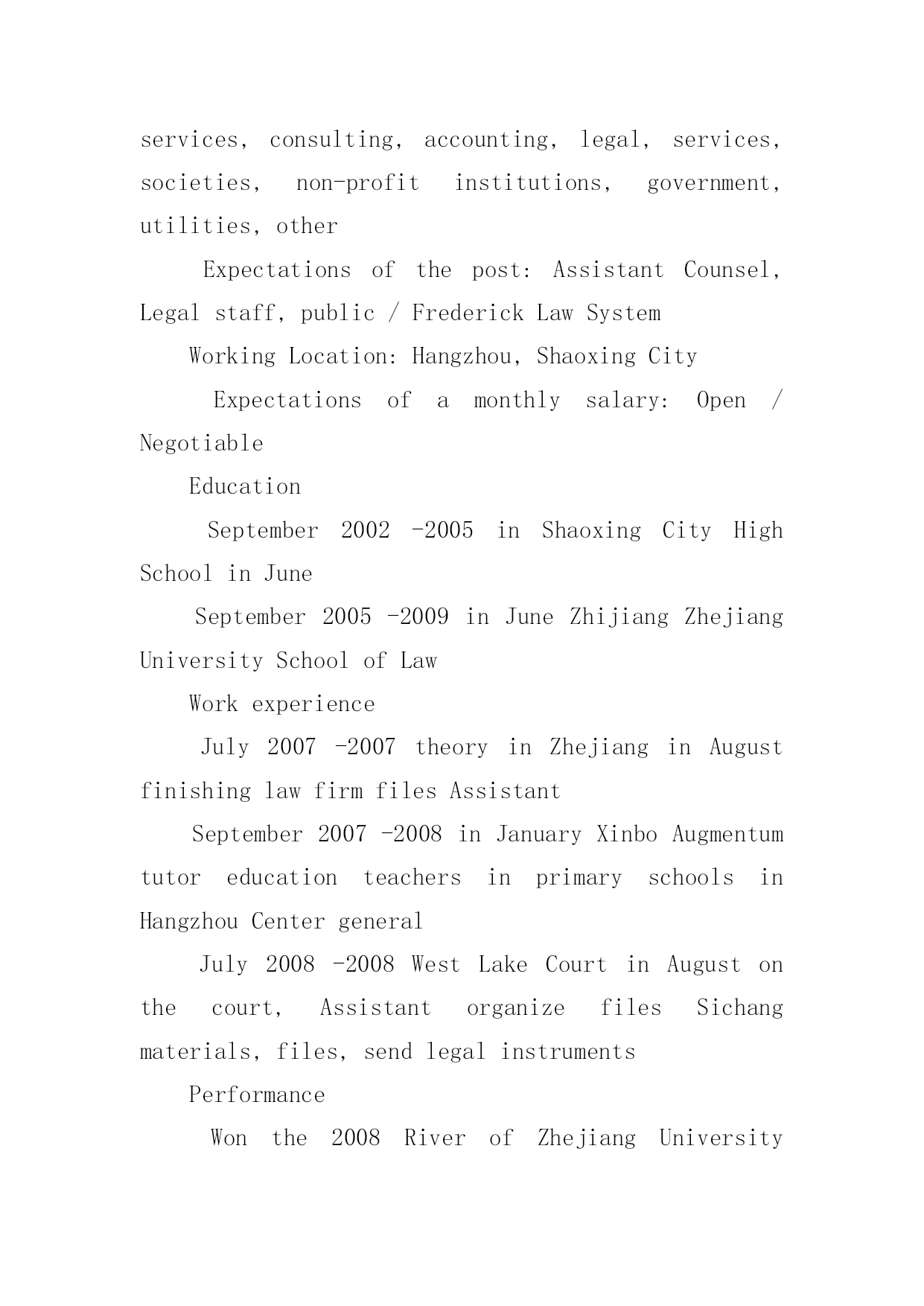法语专业英文简历 2016法语专业英文简历Name:Mr.CenSex:MaleNational:HanPoliticallandscape:membersDateofBirth:June1986Account:ShaoxingCityMaritalstatus:unmarriedEducation:UndergraduateGraduateinstitution:ZhejiangUniversitySchoolofJiangGraduationTime:June2009Specialties:LawLanguage:English(proficiency)Computerlevel:skilledWorkExperience:oneyearContact:xxJobintentionsWorkType:AllNatureofunits:openExpectationsoftheindustry:professionalservices,consulting,accounting,legal,services,societies,non-profitinstitutions,government,utilities,otherExpectationsofthepost:AssistantCounsel,Legalstaff,public/FrederickLawSystemWorkingLocation:Hangzhou,ShaoxingCityExpectationsofamonthlysalary:Open/NegotiableEducationSeptember2002-2005inShaoxingCityHighSchoolinJuneSeptember2005-2009inJuneZhijiangZhejiangUniversitySchoolofLawWorkexperienceJuly2007-2007theoryinZhejianginAugustfinishinglawfirmfilesAssistantSeptember2007-2008inJanuaryXinboAugmentumtutoreducationteachersinprimaryschoolsinHangzhouCentergeneralJuly2008-2008WestLakeCourtinAugustonthecourt,AssistantorganizefilesSichangmaterials,files,sendlegalinstrumentsPerformanceWonthe2008RiverofZhejiangUniversitySchoolofCommunistYouthLeaguecadresandthetitleofthebeststudentstotheStudentUnionThesison"theshadowofthesun-interpretationofemploymentdiscrimination",winnerofthesixth"ofJiang#39;sCup"competitionofuniversitystudentsworkextra-curricularscienceandtechnologyawardsSelf-evaluationWorkseriously,practical,responsible,sincereman,optimistic,responsible,patient,abletoendurehardship,lovetravel,sports.Afterseveralyearsofuniversitystudy,believethattheyarematuring,therehasbeennewfortheirunderstanding,but"apieceofpaperto终觉shallow",sotoincreasetheirownsocialexperience,enrichtheirsocialexperience,intheireffortstoparticipateinsocialpractice,basedontheactivepart-timejob,believetheyshouldnowbecapableofperformingtheirjobcandidates.