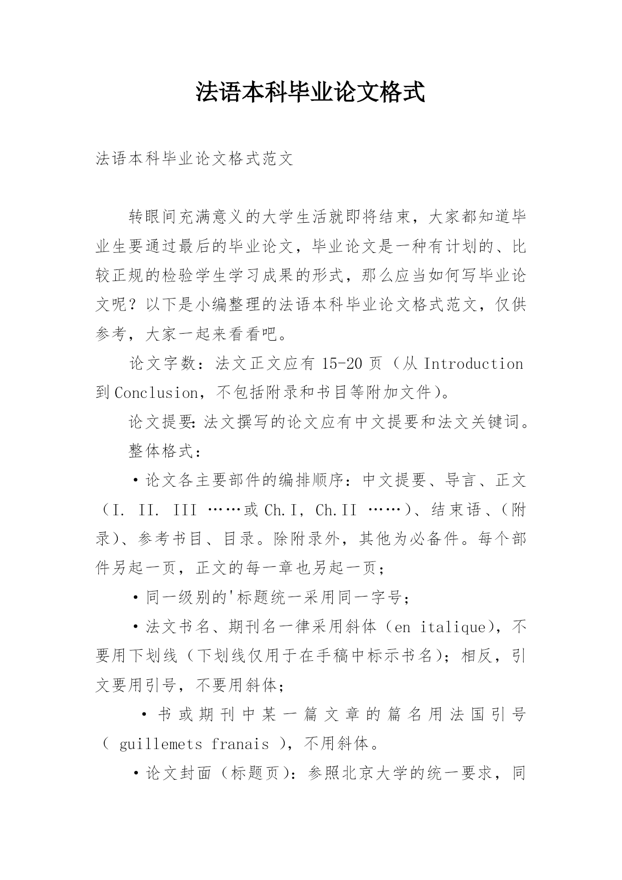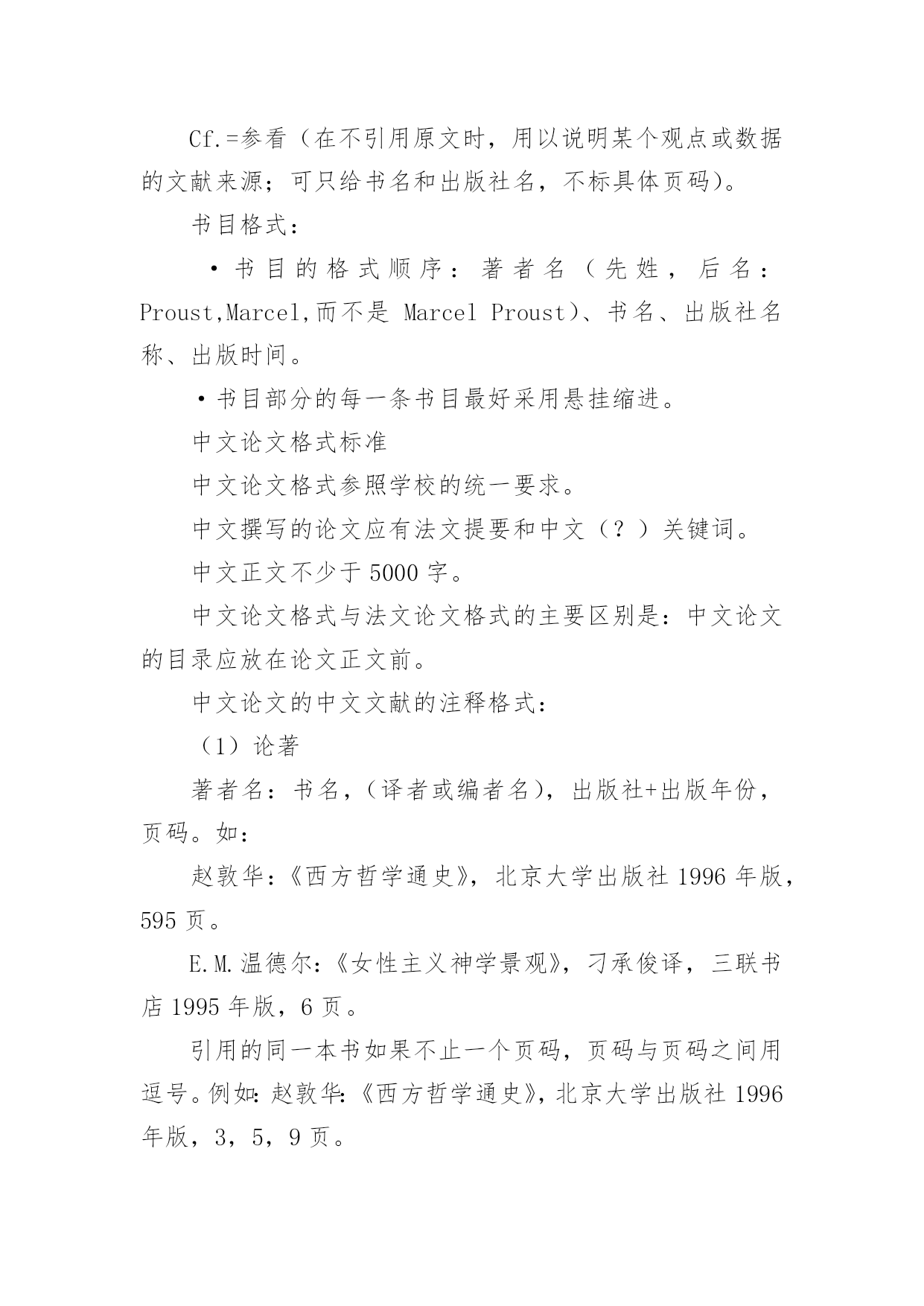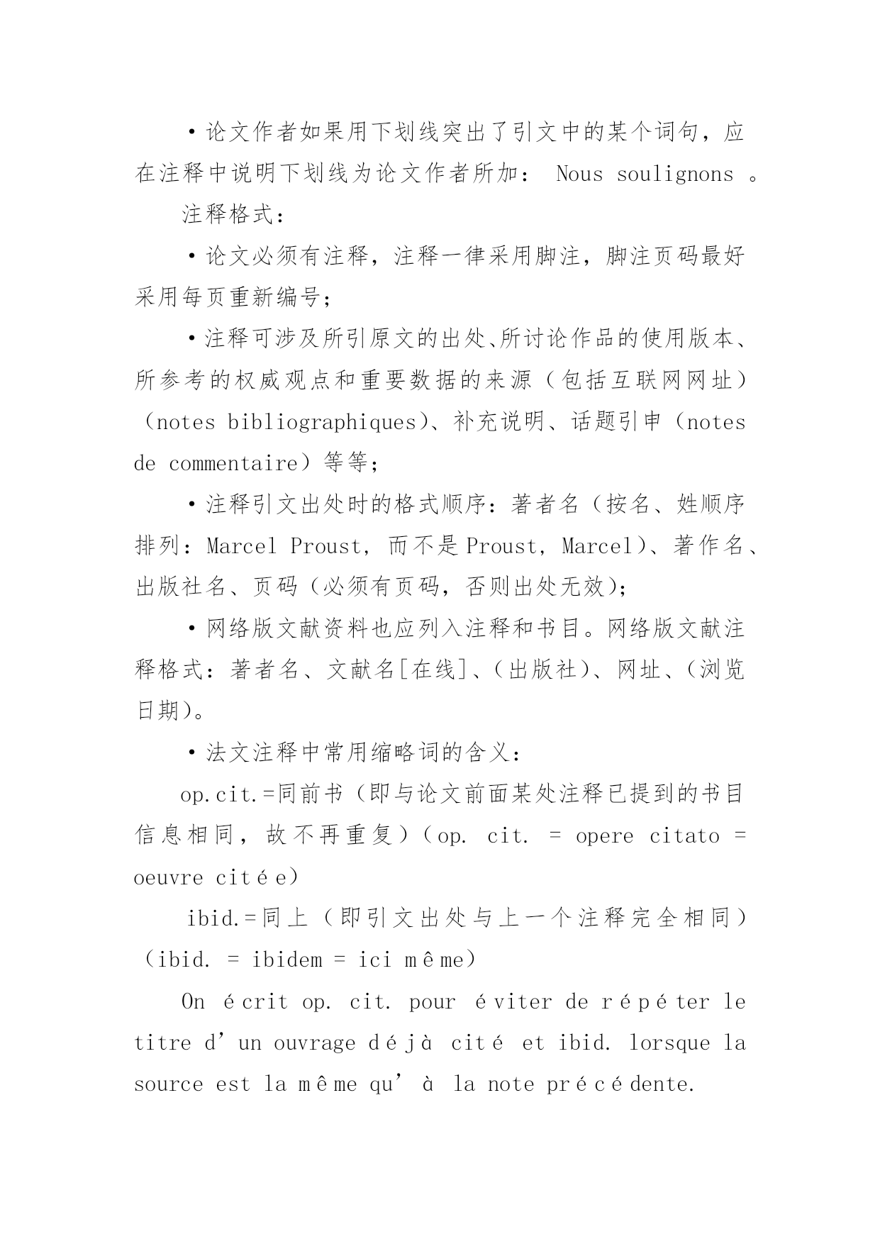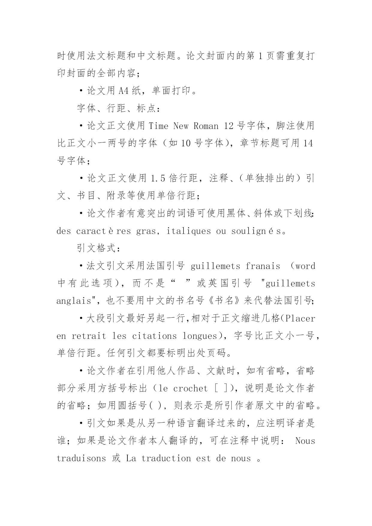法语本科毕业论文格式 法语本科毕业论文格式范文转眼间充满意义的大学生活就即将结束,大家都知道毕业生要通过最后的毕业论文,毕业论文是一种有计划的、比较正规的检验学生学习成果的形式,那么应当如何写毕业论文呢?以下是小编整理的法语本科毕业论文格式范文,仅供参考,大家一起来看看吧。论文字数:法文正文应有15-20页(从Introduction到Conclusion,不包括附录和书目等附加文件)。论文提要:法文撰写的论文应有中文提要和法文关键词。整体格式:·论文各主要部件的编排顺序:中文提要、导言、正文(I.II.III……或Ch.I,Ch.II……)、结束语、(附录)、参考书目、目录。除附录外,其他为必备件。每个部件另起一页,正文的每一章也另起一页;·同一级别的'标题统一采用同一字号;·法文书名、期刊名一律采用斜体(enitalique),不要用下划线(下划线仅用于在手稿中标示书名);相反,引文要用引号,不要用斜体;·书或期刊中某一篇文章的篇名用法国引号(guillemetsfranais),不用斜体。·论文封面(标题页):参照北京大学的统一要求,同时使用法文标题和中文标题。论文封面内的需重复打印封面的全部内容;·论文用A4纸,单面打印。字体、行距、标点:·论文正文使用TimeNewRoman12号字体,脚注使用比正文小一两号的字体(如10号字体),章节标题可用14号字体;·论文正文使用1.5倍行距,注释、(单独排出的)引文、书目、附录等使用单倍行距;·论文作者有意突出的词语可使用黑体、斜体或下划线:descaractèresgras,italiquesousoulignés。引文格式:·法文引文采用法国引号guillemetsfranais(word中有此选项),而不是“”或英国引号"guillemetsanglais",也不要用中文的书名号《书名》来代替法国引号;·大段引文最好另起一行,相对于正文缩进几格(Placerenretraitlescitationslongues),字号比正文小一号,单倍行距。任何引文都要标明出处页码。·论文作者在引用他人作品、文献时,如有省略,省略部分采用方括号标出(lecrochet[]),说明是论文作者的省略;如用圆括号(),则表示是所引作者原文中的省略。·引文如果是从另一种语言翻译过来的,应注明译者是谁;如果是论文作者本人翻译的,可在注释中说明:Noustraduisons或Latraductionestdenous。·论文作者如果用下划线突出了引文中的某个词句,应在注释中说明下划线为论文作者所加:Noussoulignons。注释格式:·论文必须有注释,注释一律采用脚注,脚注页码最好采用每页重新编号;·注释可涉及所引原文的出处、所讨论作品的使用版本、所参考的权威观点和重要数据的来源(包括互联网网址)(notesbibliographiques)、补充说明、话题引申(notesdecommentaire)等等;·注释引文出处时的格式顺序:著者名(按名、姓顺序排列:MarcelProust,而不是Proust,Marcel)、著作名、出版社名、页码(必须有页码,否则出处无效);·网络版文献资料也应列入注释和书目。网络版文献注释格式:著者名、文献名[在线]、(出版社)、网址、(浏览日期)。·法文注释中常用缩略词的含义:op.cit.=同前书(即与论文前面某处注释已提到的书目信息相同,故不再重复)(op.cit.=operecitato=oeuvrecitée)ibid.=同上(即引文出处与上一个注释完全相同)(ibid.=ibidem=icimême)Onécritop.cit.pouréviterderépéterletitred’unouvragedéjàcitéetibid.lorsquelasourceestlamêmequ’àlanoteprécédente.Cf.=参看(在不引用原文时,用以说明某个观点或数据的文献来源;可只给书名和出版社名,不标具体页码)。书目格式:·书目的格式顺序:著者名(先姓,后名:Proust,Marcel,而不是MarcelProust)、书名、出版社名称、出版时间。·书目部分的每一条书目最好采用悬挂缩进。中文论文格式标准中文论文格式参照学校的统一要求。中文撰写的论文应有法文提要和中文(?)关键词。中文正文不少于5000字。中文论文格式与法文论文格式的主要区别是:中文论文的目录应放在论文正文前。中文论文的中文文献的注释格式:(1)论著著者名:书名,(译者或编者名),出版社+出版年份,页码。如:赵敦华:《西方哲学通史》,北京大学出版社1996年版,595页。E.M.温德尔:《女性主义神学景观》,刁承俊译,三联书店1995年版,6页。引用的同一本书如果不止一个页码
