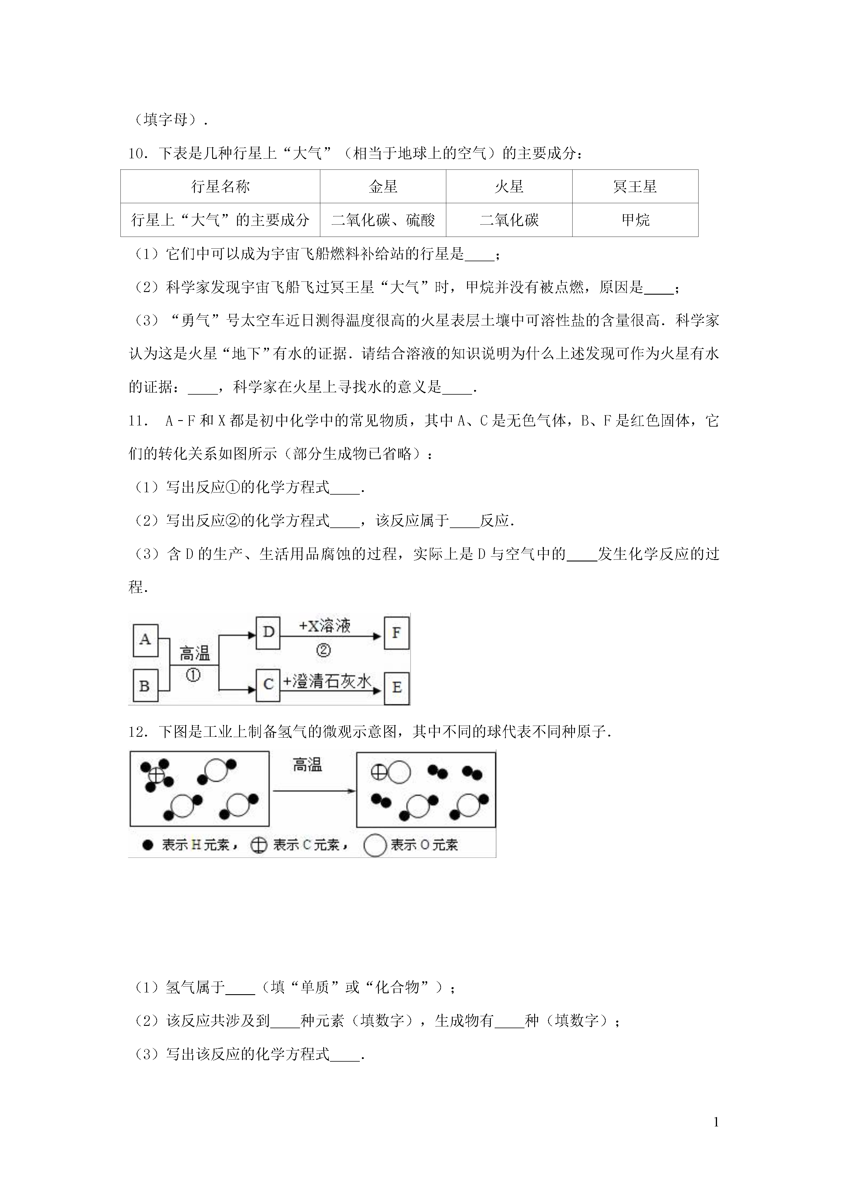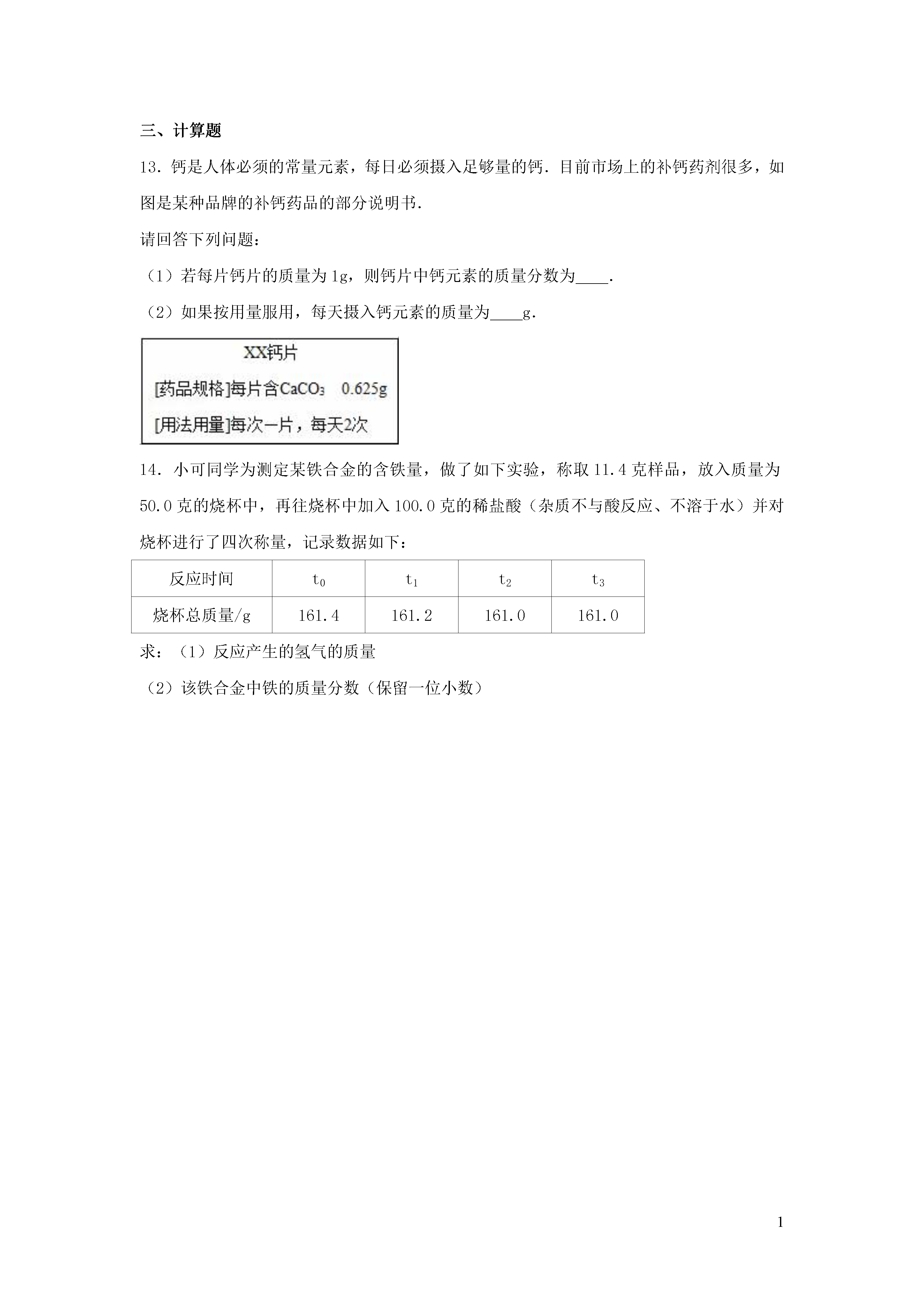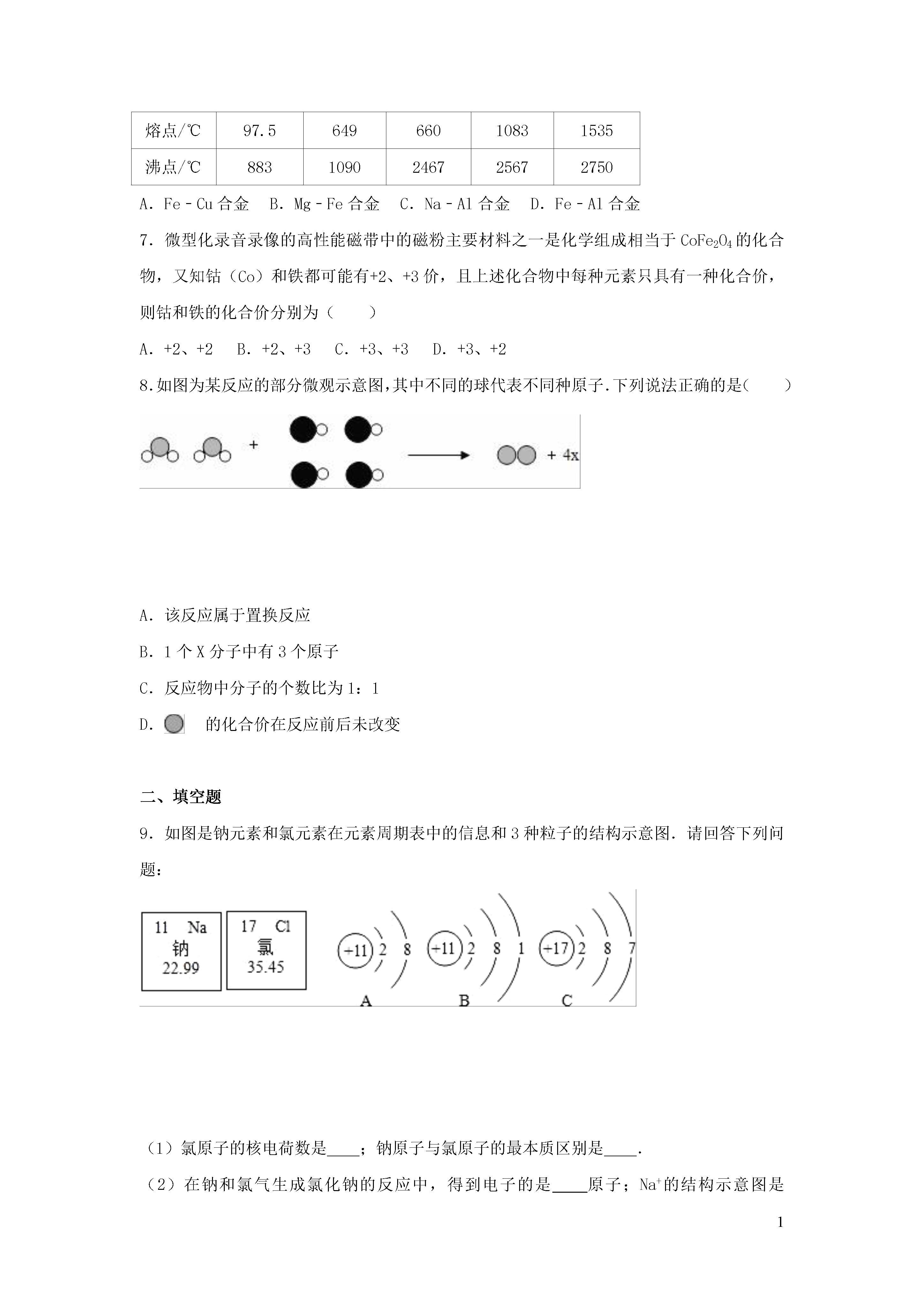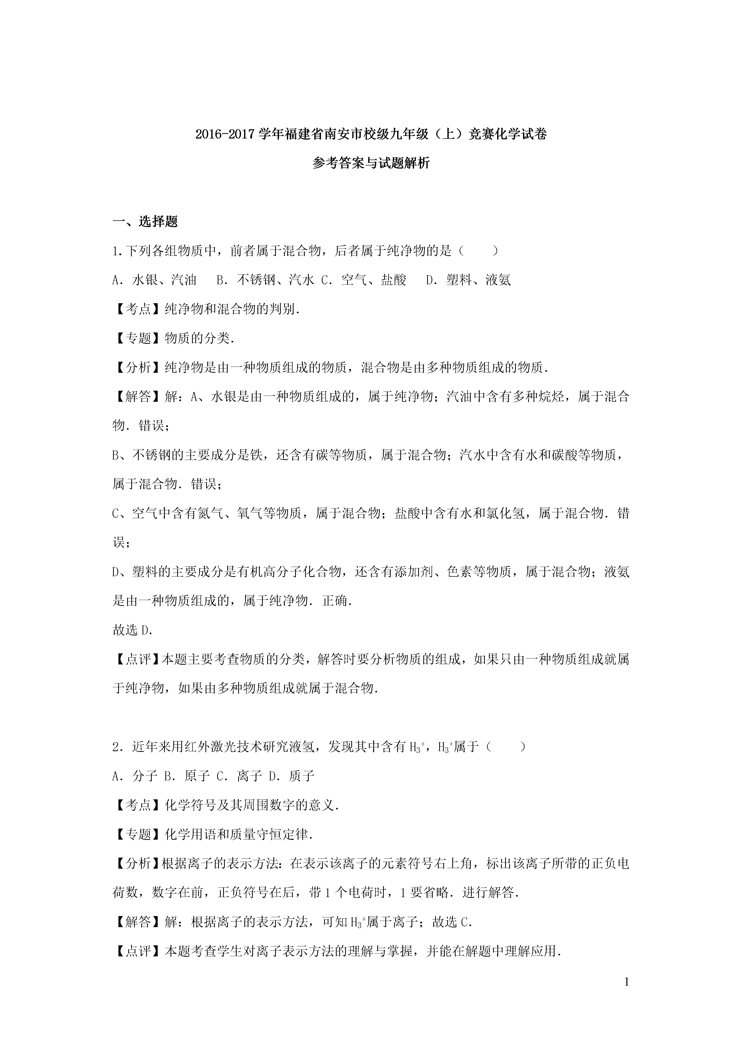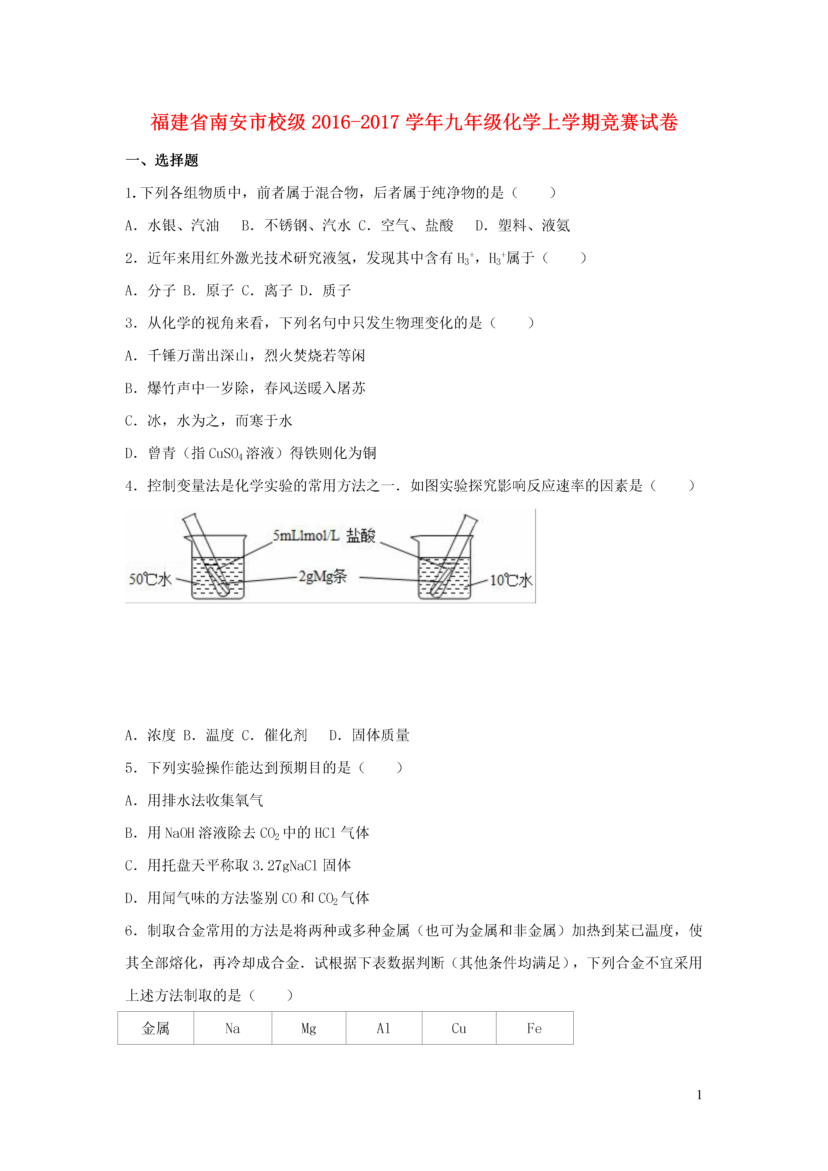 1福建省南安市校级2016-2017学年九年级化学上学期竞赛试卷一、选择题1.下列各组物质中,前者属于混合物,后者属于纯净物的是()A.水银、汽油B.不锈钢、汽水C.空气、盐酸D.塑料、液氨2.近年来用红外激光技术研究液氢,发现其中含有H3+,H3+属于()A.分子B.原子C.离子D.质子3.从化学的视角来看,下列名句中只发生物理变化的是()A.千锤万凿出深山,烈火焚烧若等闲B.爆竹声中一岁除,春风送暖入屠苏C.冰,水为之,而寒于水D.曾青(指CuSO4溶液)得铁则化为铜4.控制变量法是化学实验的常用方法之一.如图实验探究影响反应速率的因素是()A.浓度B.温度C.催化剂D.固体质量5.下列实验操作能达到预期目的是()A.用排水法收集氧气B.用NaOH溶液除去CO2中的HCl气体C.用托盘天平称取3.27gNaCl固体D.用闻气味的方法鉴别CO和CO2气体6.制取合金常用的方法是将两种或多种金属(也可为金属和非金属)加热到某已温度,使其全部熔化,再冷却成合金.试根据下表数据判断(其他条件均满足),下列合金不宜采用上述方法制取的是()金属NaMgAlCuFe熔点/℃97.564966010831535沸点/℃8831090246725672750A.Fe﹣Cu合金B.Mg﹣Fe合金C.Na﹣Al合金D.Fe﹣Al合金7.微型化录音录像的高性能磁带中的磁粉主要材料之一是化学组成相当于CoFe2O4的化合物,又知钴(Co)和铁都可能有+2、+3价,且上述化合物中每种元素只具有一种化合价,则钴和铁的化合价分别为()A.+2、+2B.+2、+3C.+3、+3D.+3、+28.如图为某反应的部分微观示意图,其中不同的球代表不同种原子.下列说法正确的是()A.该反应属于置换反应B.1个X分子中有3个原子C.反应物中分子的个数比为1:1D.的化合价在反应前后未改变二、填空题9.如图是钠元素和氯元素在元素周期表中的信息和3种粒子的结构示意图.请回答下列问题:(1)氯原子的核电荷数是;钠原子与氯原子的最本质区别是.(2)在钠和氯气生成氯化钠的反应中,得到电子的是原子;Na+的结构示意图是(填字母).10.下表是几种行星上“大气”(相当于地球上的空气)的主要成分:行星名称金星火星冥王星行星上“大气”的主要成分二氧化碳、硫酸二氧化碳甲烷(1)它们中可以成为宇宙飞船燃料补给站的行星是;(2)科学家发现宇宙飞船飞过冥王星“大气”时,甲烷并没有被点燃,原因是;(3)“勇气”号太空车近日测得温度很高的火星表层土壤中可溶性盐的含量很高.科学家认为这是火星“地下”有水的证据.请结合溶液的知识说明为什么上述发现可作为火星有水的证据:,科学家在火星上寻找水的意义是.11.A﹣F和X都是初中化学中的常见物质,其中A、C是无色气体,B、F是红色固体,它们的转化关系如图所示(部分生成物已省略):(1)写出反应①的化学方程式.(2)写出反应②的化学方程式,该反应属于反应.(3)含D的生产、生活用品腐蚀的过程,实际上是D与空气中的发生化学反应的过程.12.下图是工业上制备氢气的微观示意图,其中不同的球代表不同种原子.(1)氢气属于(填“单质”或“化合物”);(2)该反应共涉及到种元素(填数字),生成物有种(填数字);(3)写出该反应的化学方程式.三、计算题13.钙是人体必须的常量元素,每日必须摄入足够量的钙.目前市场上的补钙药剂很多,如图是某种品牌的补钙药品的部分说明书.请回答下列问题:(1)若每片钙片的质量为1g,则钙片中钙元素的质量分数为.(2)如果按用量服用,每天摄入钙元素的质量为g.14.小可同学为测定某铁合金的含铁量,做了如下实验,称取11.4克样品,放入质量为50.0克的烧杯中,再往烧杯中加入100.0克的稀盐酸(杂质不与酸反应、不溶于水)并对烧杯进行了四次称量,记录数据如下:反应时间t0t1t2t3烧杯总质量/g161.4161.2161.0161.0求:(1)反应产生的氢气的质量(2)该铁合金中铁的质量分数(保留一位小数)2016-2017学年福建省南安市校级九年级(上)竞赛化学试卷参考答案与试题解析一、选择题1.下列各组物质中,前者属于混合物,后者属于纯净物的是()A.水银、汽油B.不锈钢、汽水C.空气、盐酸D.塑料、液氨【考点】纯净物和混合物的判别.【专题】物质的分类.【分析】纯净物是由一种物质组成的物质,混合物是由多种物质组成的物质.【解答】解:A、水银是由一种物质组成的,属于纯净物;汽油中含有多种烷烃,属于混合物.错误;B、不锈钢的主要成分是铁,还含有碳等物质,属于混合物;汽水中含有水和碳酸等物质,属