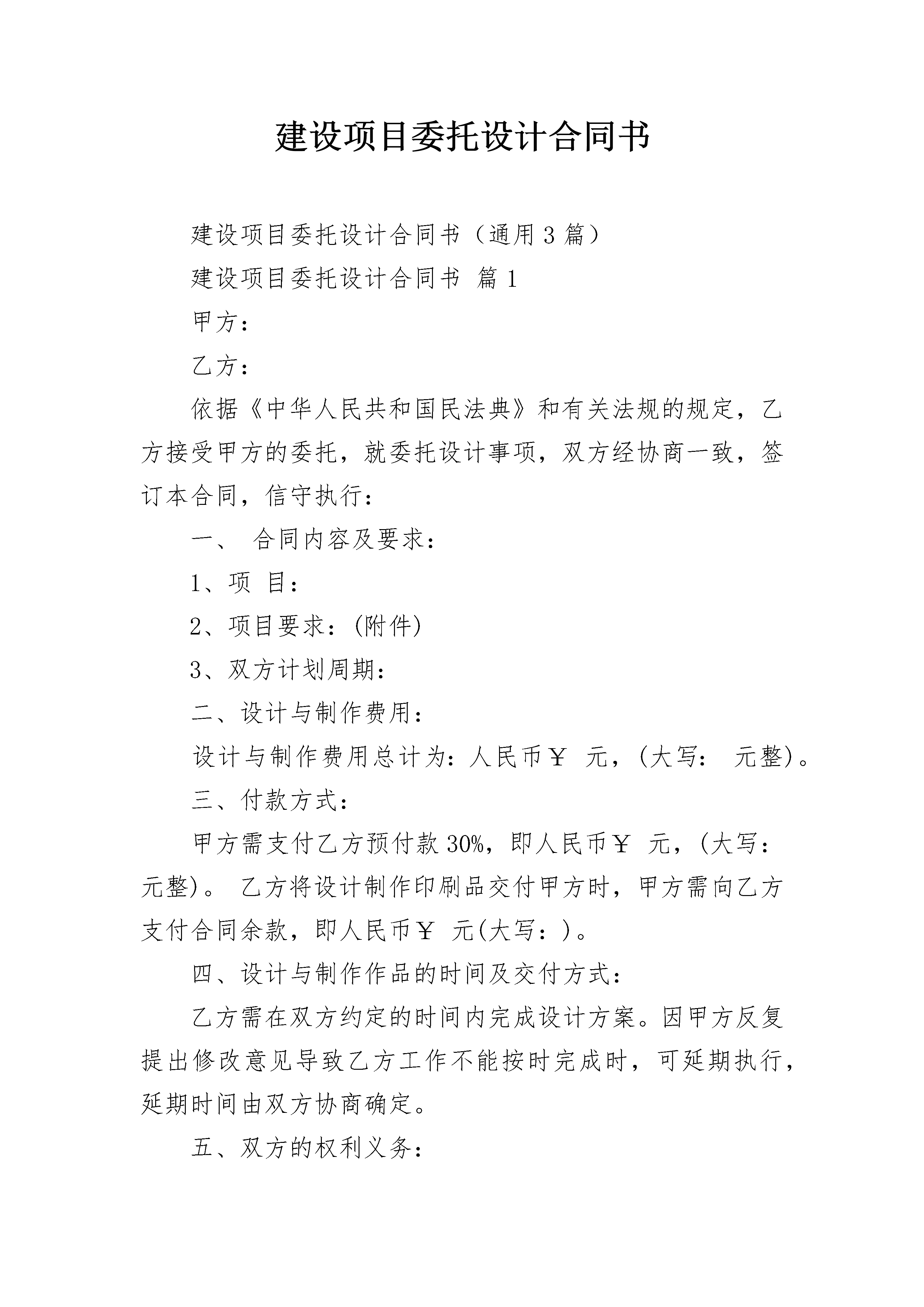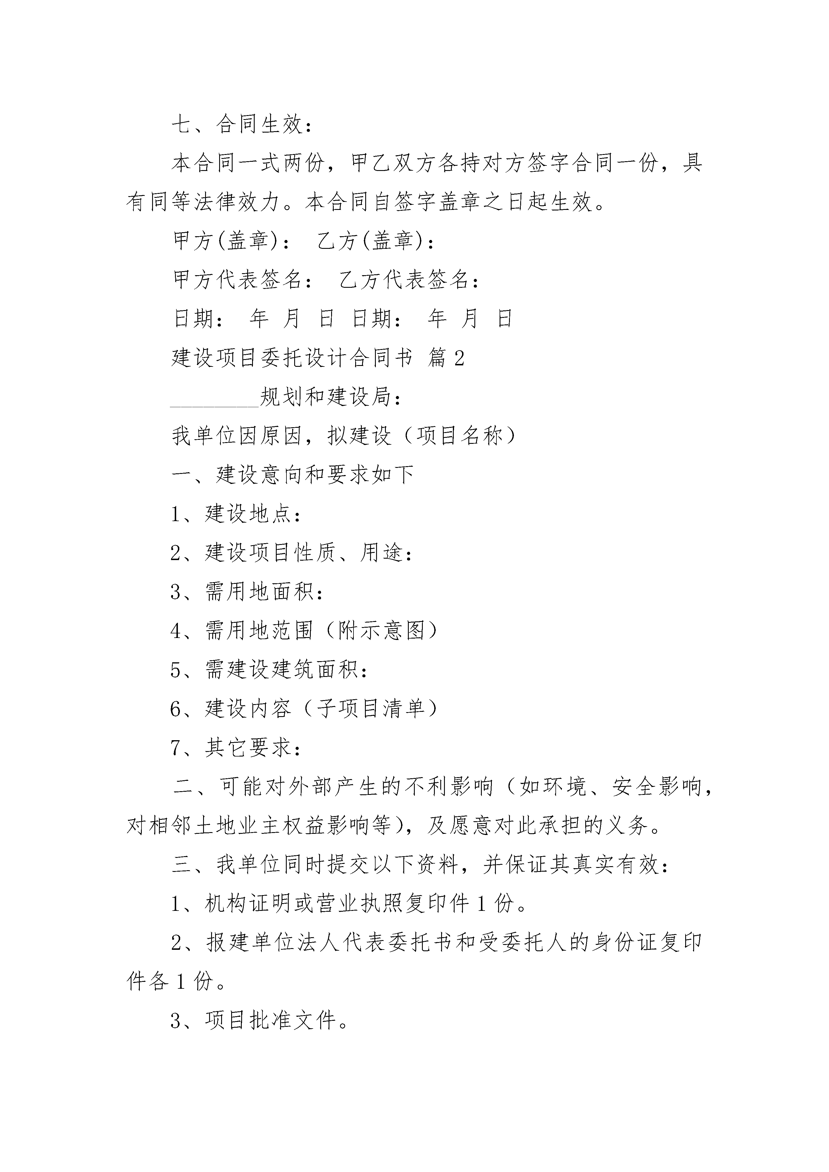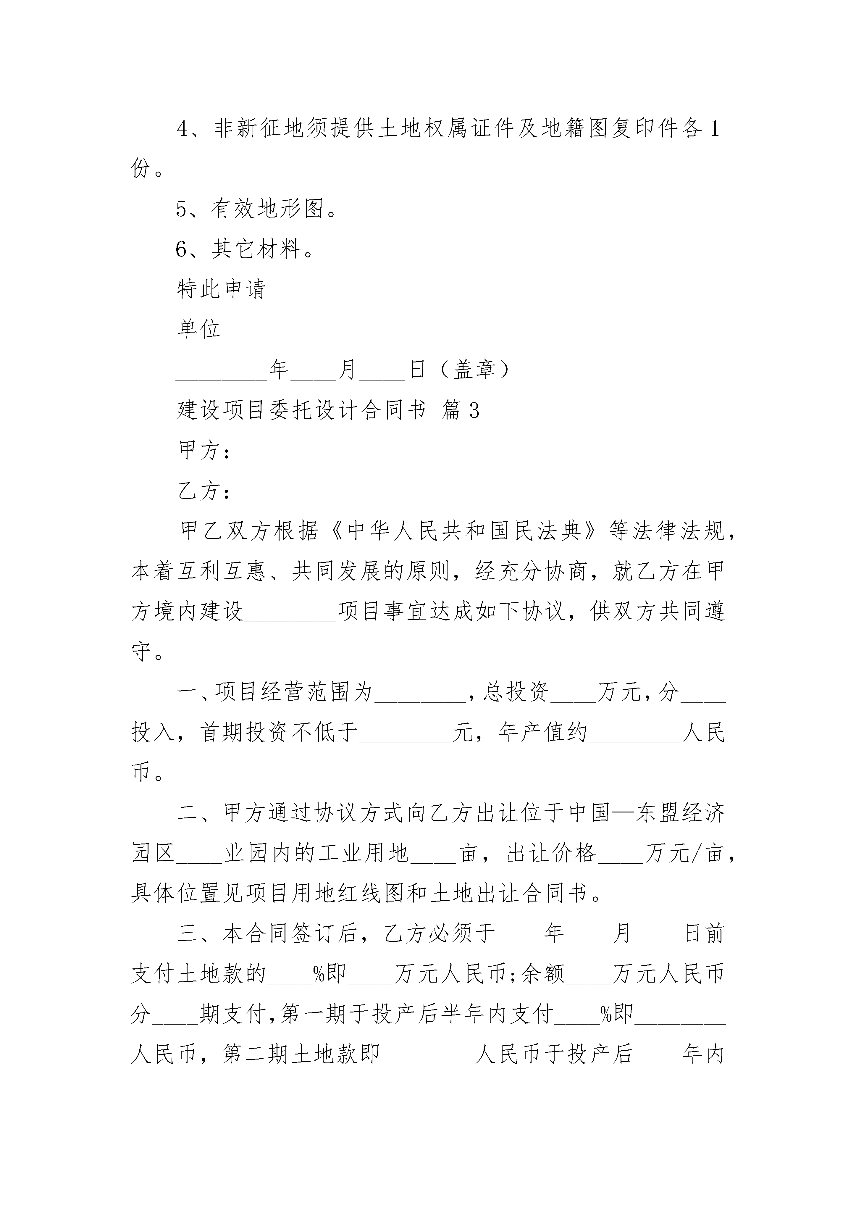 建设项目委托设计合同书建设项目委托设计合同书(通用3篇)建设项目委托设计合同书篇1甲方:乙方:依据《中华人民共和国民法典》和有关法规的规定,乙方接受甲方的委托,就委托设计事项,双方经协商一致,签订本合同,信守执行:一、合同内容及要求:1、项目:2、项目要求:(附件)3、双方计划周期:二、设计与制作费用:设计与制作费用总计为:人民币¥元,(大写:元整)。三、付款方式:甲方需支付乙方预付款30%,即人民币¥元,(大写:元整)。乙方将设计制作印刷品交付甲方时,甲方需向乙方支付合同余款,即人民币¥元(大写:)。四、设计与制作作品的时间及交付方式:乙方需在双方约定的时间内完成设计方案。因甲方反复提出修改意见导致乙方工作不能按时完成时,可延期执行,延期时间由双方协商确定。五、双方的权利义务:甲方权利:1、甲方有权对乙方的设计提出建议和思路,以使乙方设计的作品更符合甲方企业文化内涵。2、甲方有权对乙方所设计的作品提出修改意见;3、甲方在付清所有设计费用后享有设计作品的所有权、使用权和修改权;甲方义务:1、甲方有义务按照合同约定支付相关费用;2、甲方有义务提供有关企业资料或其他有关资料给乙方;乙方权利:1、乙方有权要求甲方提供有关企业资料供乙方设计参考;2、乙方有权要求甲方按照合同约定支付相应款项;3、乙方对设计作品享有著作权,有权要求甲方在未付清款项之前不得使用该设计作品:乙方义务:1、乙方需按照甲方的要求进行作品设计与制作。2、乙方需按照合同约定按时交付设计制作作品。六、违约责任:1、甲方在设计作品初稿完成前终止合同,其预付的费用无权要求退回;甲方在乙方作品初稿完成后终止合同的,应当支付全额的设计费用。2、乙方如无正当理由提前终止合同,所收取的费用应当全部退回给甲方。七、合同生效:本合同一式两份,甲乙双方各持对方签字合同一份,具有同等法律效力。本合同自签字盖章之日起生效。甲方(盖章):乙方(盖章):甲方代表签名:乙方代表签名:日期:年月日日期:年月日建设项目委托设计合同书篇2________规划和建设局:我单位因原因,拟建设(项目名称)一、建设意向和要求如下1、建设地点:2、建设项目性质、用途:3、需用地面积:4、需用地范围(附示意图)5、需建设建筑面积:6、建设内容(子项目清单)7、其它要求:二、可能对外部产生的不利影响(如环境、安全影响,对相邻土地业主权益影响等),及愿意对此承担的义务。三、我单位同时提交以下资料,并保证其真实有效:1、机构证明或营业执照复印件1份。2、报建单位法人代表委托书和受委托人的身份证复印件各1份。3、项目批准文件。4、非新征地须提供土地权属证件及地籍图复印件各1份。5、有效地形图。6、其它材料。特此申请单位________年____月____日(盖章)建设项目委托设计合同书篇3甲方:乙方:____________________甲乙双方根据《中华人民共和国民法典》等法律法规,本着互利互惠、共同发展的原则,经充分协商,就乙方在甲方境内建设________项目事宜达成如下协议,供双方共同遵守。一、项目经营范围为________,总投资____万元,分____投入,首期投资不低于________元,年产值约________人民币。二、甲方通过协议方式向乙方出让位于中国—东盟经济园区____业园内的工业用地____亩,出让价格____万元/亩,具体位置见项目用地红线图和土地出让合同书。三、本合同签订后,乙方必须于____年____月____日前支付土地款的____%即____万元人民币;余额____万元人民币分____期支付,第一期于投产后半年内支付____%即________人民币,第二期土地款即________人民币于投产后____年内付清。四、按照甲方经济发展的要求和乙方项目推进的可能性,本项目应于__________年____月前竣工投产。五、甲方保证建设用地符合甲方的总体规划,并保证周边没有土地纠纷,有良好的社会治安环境,并积极为乙方提供项目建设的一切便利条件。六、甲方将本项目作为对外招商引资项目看待,项目报批及建设所需要的手续由甲方指派管委会的相关部门和专人办理,乙方负责提供所需的资料文件及费用。七、甲方承诺乙方享受国家规定的沿海开放城市和西部大开发的税费优惠政策及其他与本项目相关的税费政策。八、甲方负责将水、电接至乙方厂区红线图边。九、甲方承诺积极协助乙方为本项目申请高新技术企业认证。十、甲方承诺积极向乙方推荐客户,协助拓展社会资源和公共关系。十一、甲方承诺积极协助、配合乙方办理土地使用权证工作。十二、甲方在本合同签订后____个工作日内作出该项目用地红线图,乙方拿到红线图须交纳10万元履约保证金,待项目开工建设____后甲方退还该履约保证金。十三、乙方负责厂区红线图内排水、排污设施的建设并达到国家