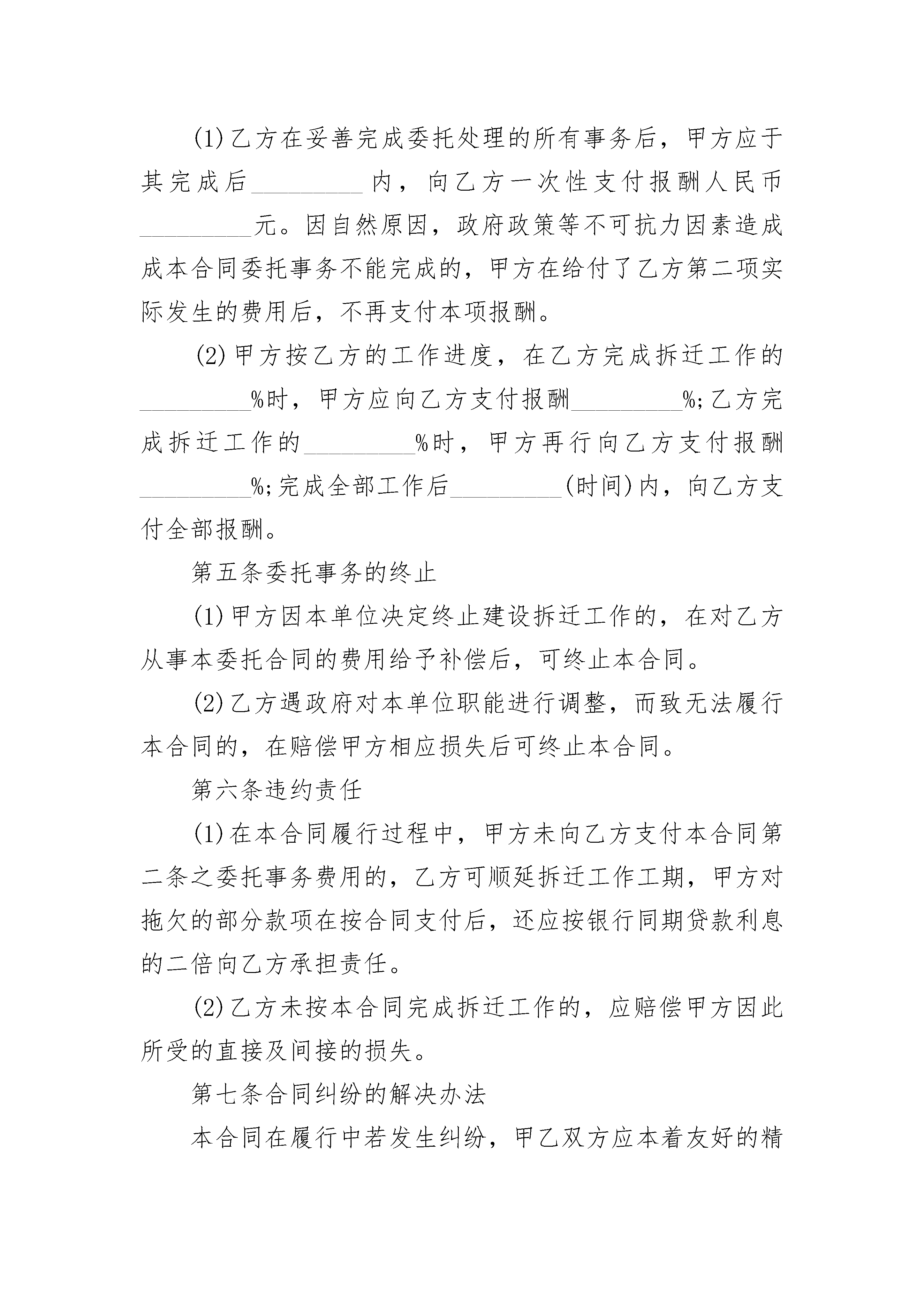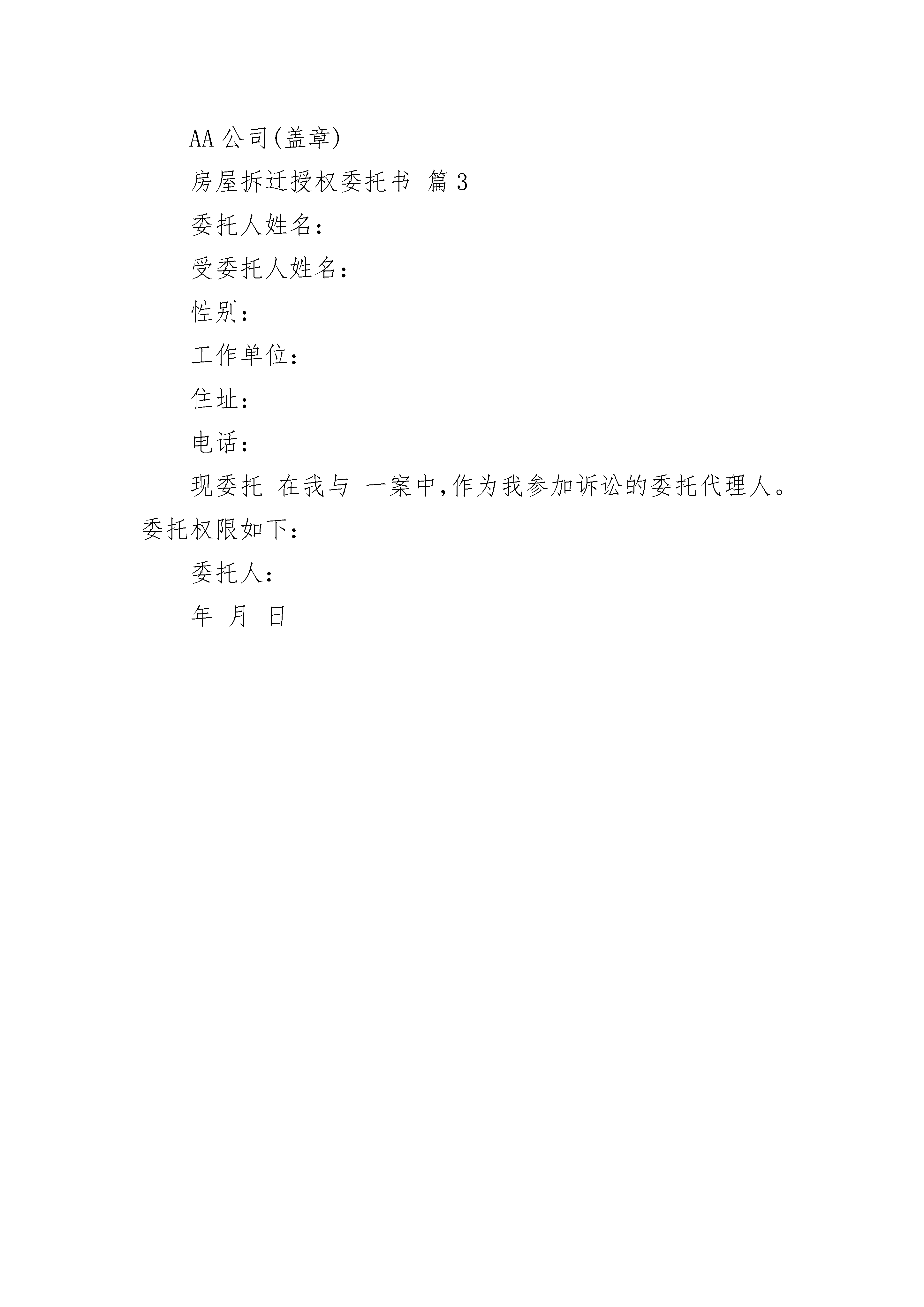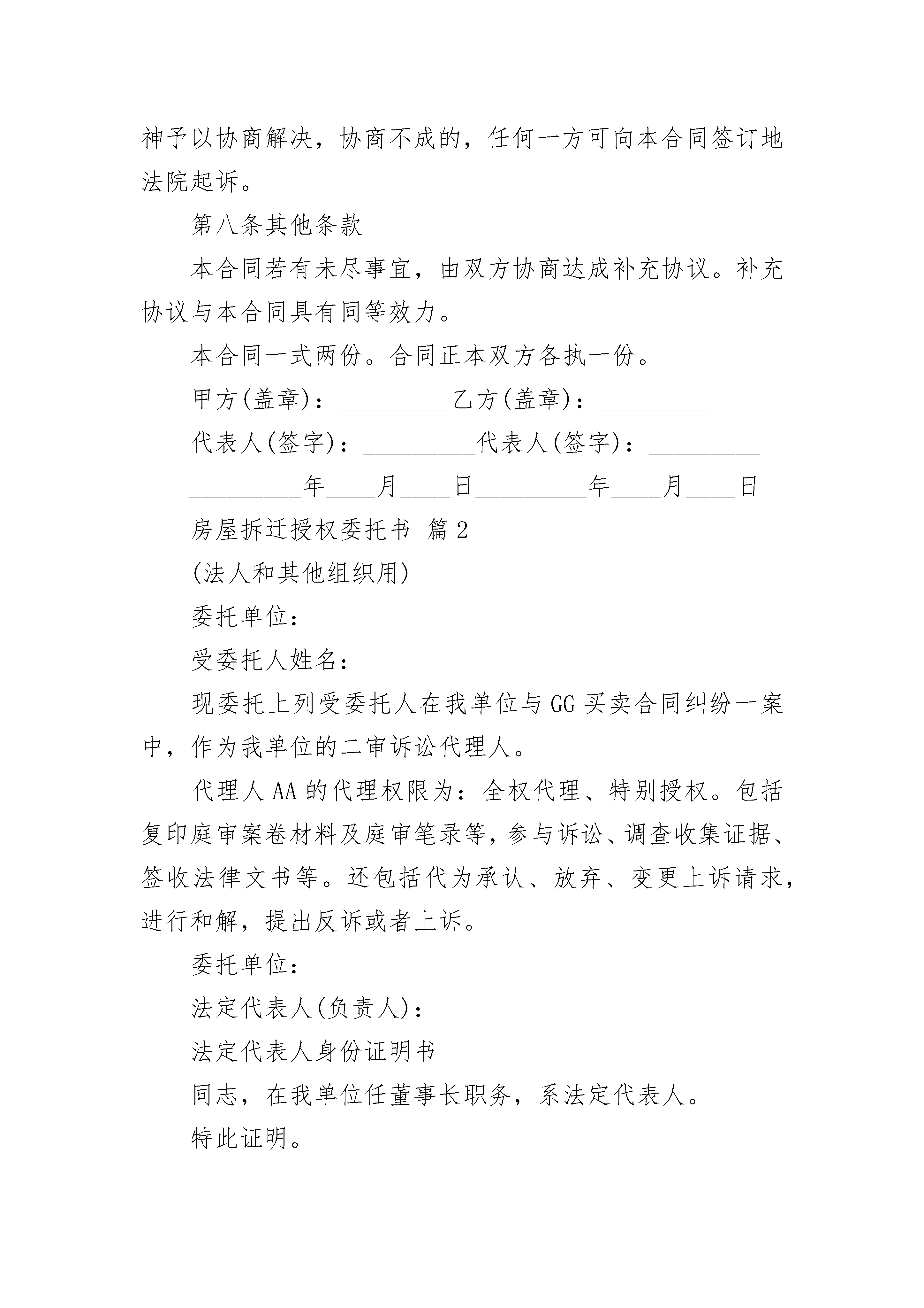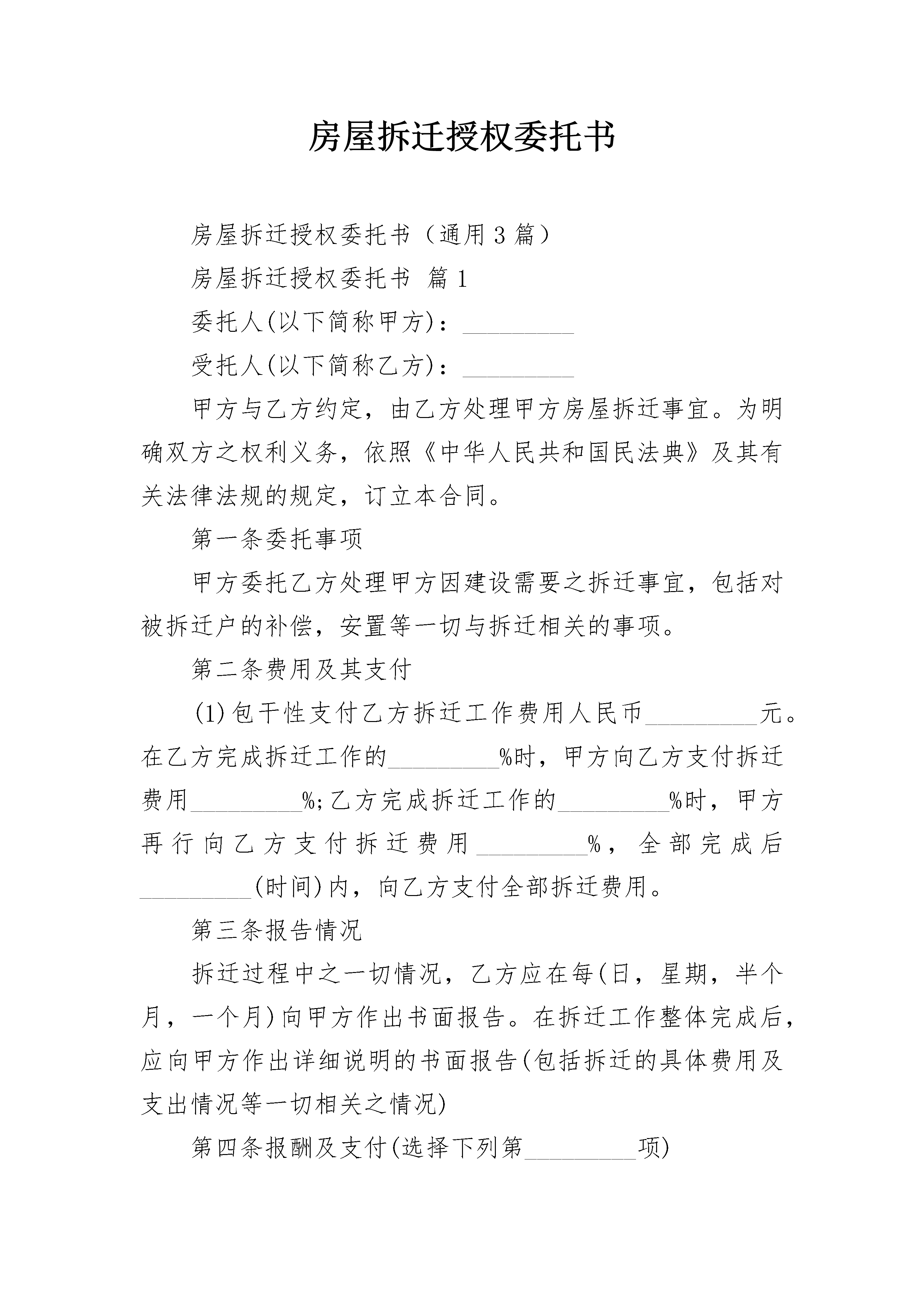 房屋拆迁授权委托书房屋拆迁授权委托书(通用3篇)房屋拆迁授权委托书篇1委托人(以下简称甲方):_________受托人(以下简称乙方):_________甲方与乙方约定,由乙方处理甲方房屋拆迁事宜。为明确双方之权利义务,依照《中华人民共和国民法典》及其有关法律法规的规定,订立本合同。第一条委托事项甲方委托乙方处理甲方因建设需要之拆迁事宜,包括对被拆迁户的补偿,安置等一切与拆迁相关的事项。第二条费用及其支付(1)包干性支付乙方拆迁工作费用人民币_________元。在乙方完成拆迁工作的_________%时,甲方向乙方支付拆迁费用_________%;乙方完成拆迁工作的_________%时,甲方再行向乙方支付拆迁费用_________%,全部完成后_________(时间)内,向乙方支付全部拆迁费用。第三条报告情况拆迁过程中之一切情况,乙方应在每(日,星期,半个月,一个月)向甲方作出书面报告。在拆迁工作整体完成后,应向甲方作出详细说明的书面报告(包括拆迁的具体费用及支出情况等一切相关之情况)第四条报酬及支付(选择下列第_________项)(1)乙方在妥善完成委托处理的所有事务后,甲方应于其完成后_________内,向乙方一次性支付报酬人民币_________元。因自然原因,政府政策等不可抗力因素造成成本合同委托事务不能完成的,甲方在给付了乙方第二项实际发生的费用后,不再支付本项报酬。(2)甲方按乙方的工作进度,在乙方完成拆迁工作的_________%时,甲方应向乙方支付报酬_________%;乙方完成拆迁工作的_________%时,甲方再行向乙方支付报酬_________%;完成全部工作后_________(时间)内,向乙方支付全部报酬。第五条委托事务的终止(1)甲方因本单位决定终止建设拆迁工作的,在对乙方从事本委托合同的费用给予补偿后,可终止本合同。(2)乙方遇政府对本单位职能进行调整,而致无法履行本合同的,在赔偿甲方相应损失后可终止本合同。第六条违约责任(1)在本合同履行过程中,甲方未向乙方支付本合同第二条之委托事务费用的,乙方可顺延拆迁工作工期,甲方对拖欠的部分款项在按合同支付后,还应按银行同期贷款利息的二倍向乙方承担责任。(2)乙方未按本合同完成拆迁工作的,应赔偿甲方因此所受的直接及间接的损失。第七条合同纠纷的解决办法本合同在履行中若发生纠纷,甲乙双方应本着友好的精神予以协商解决,协商不成的,任何一方可向本合同签订地法院起诉。第八条其他条款本合同若有未尽事宜,由双方协商达成补充协议。补充协议与本合同具有同等效力。本合同一式两份。合同正本双方各执一份。甲方(盖章):_________乙方(盖章):_________代表人(签字):_________代表人(签字):__________________年____月____日_________年____月____日房屋拆迁授权委托书篇2(法人和其他组织用)委托单位:受委托人姓名:现委托上列受委托人在我单位与GG买卖合同纠纷一案中,作为我单位的二审诉讼代理人。代理人AA的代理权限为:全权代理、特别授权。包括复印庭审案卷材料及庭审笔录等,参与诉讼、调查收集证据、签收法律文书等。还包括代为承认、放弃、变更上诉请求,进行和解,提出反诉或者上诉。委托单位:法定代表人(负责人):法定代表人身份证明书同志,在我单位任董事长职务,系法定代表人。特此证明。AA公司(盖章)房屋拆迁授权委托书篇3委托人姓名:受委托人姓名:性别:工作单位:住址:电话:现委托在我与一案中,作为我参加诉讼的委托代理人。委托权限如下:委托人:年月日