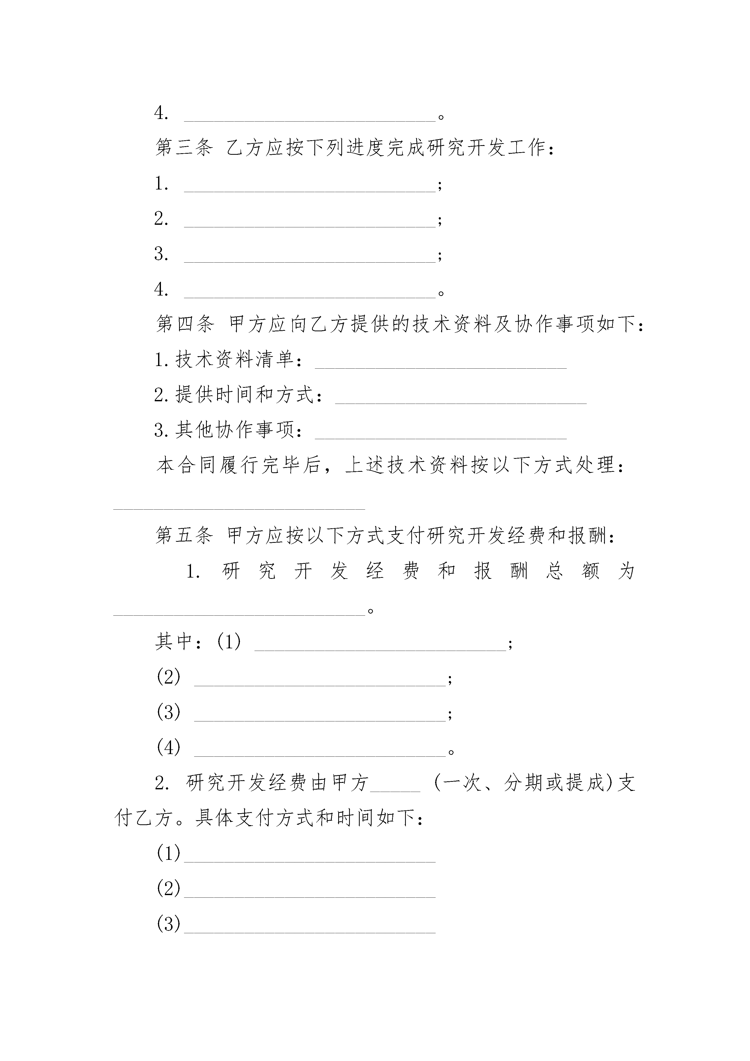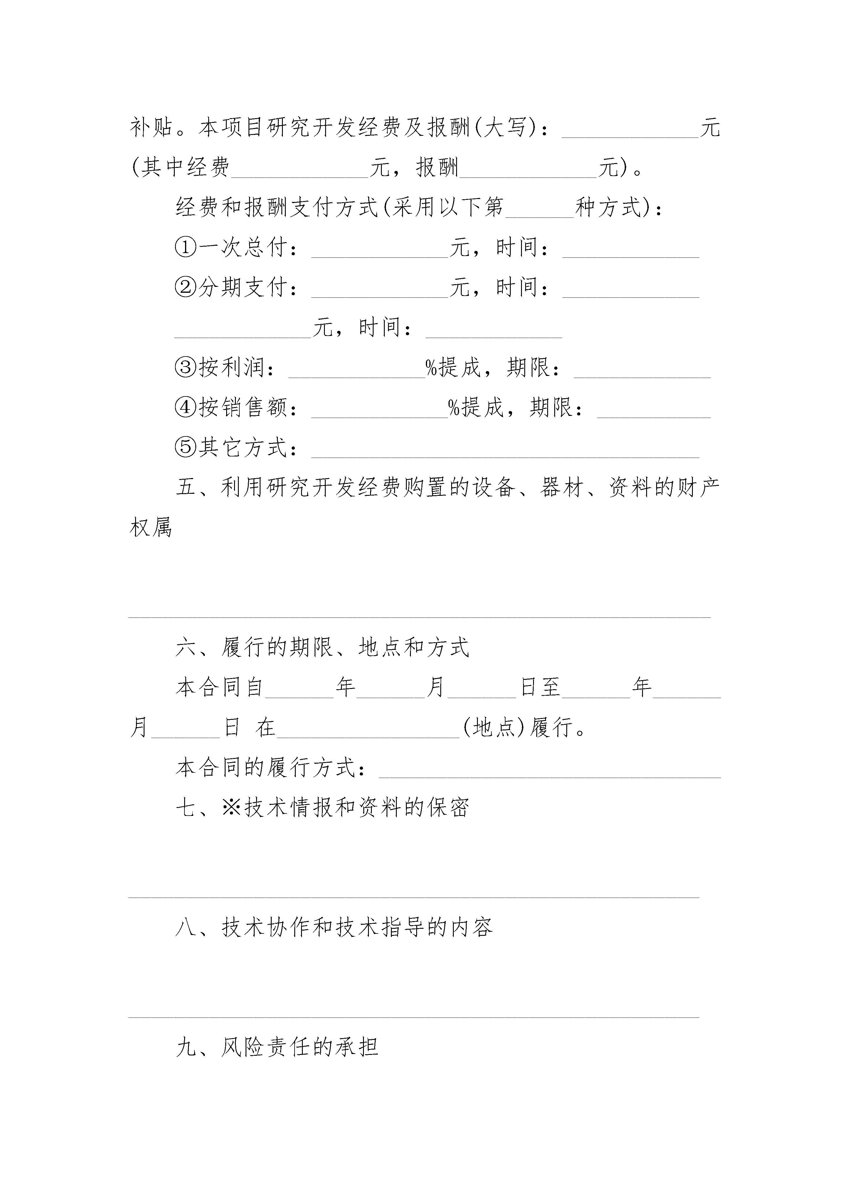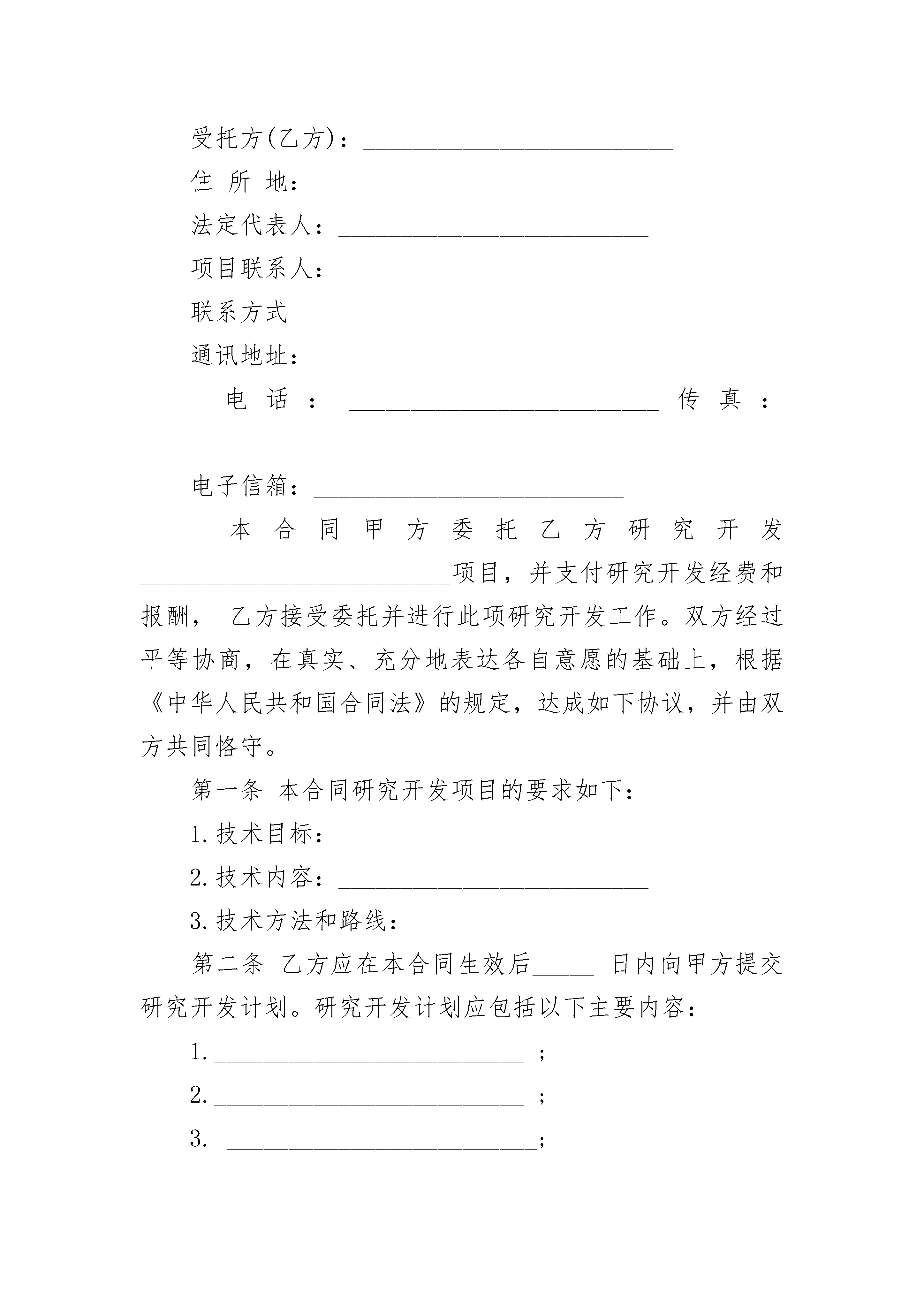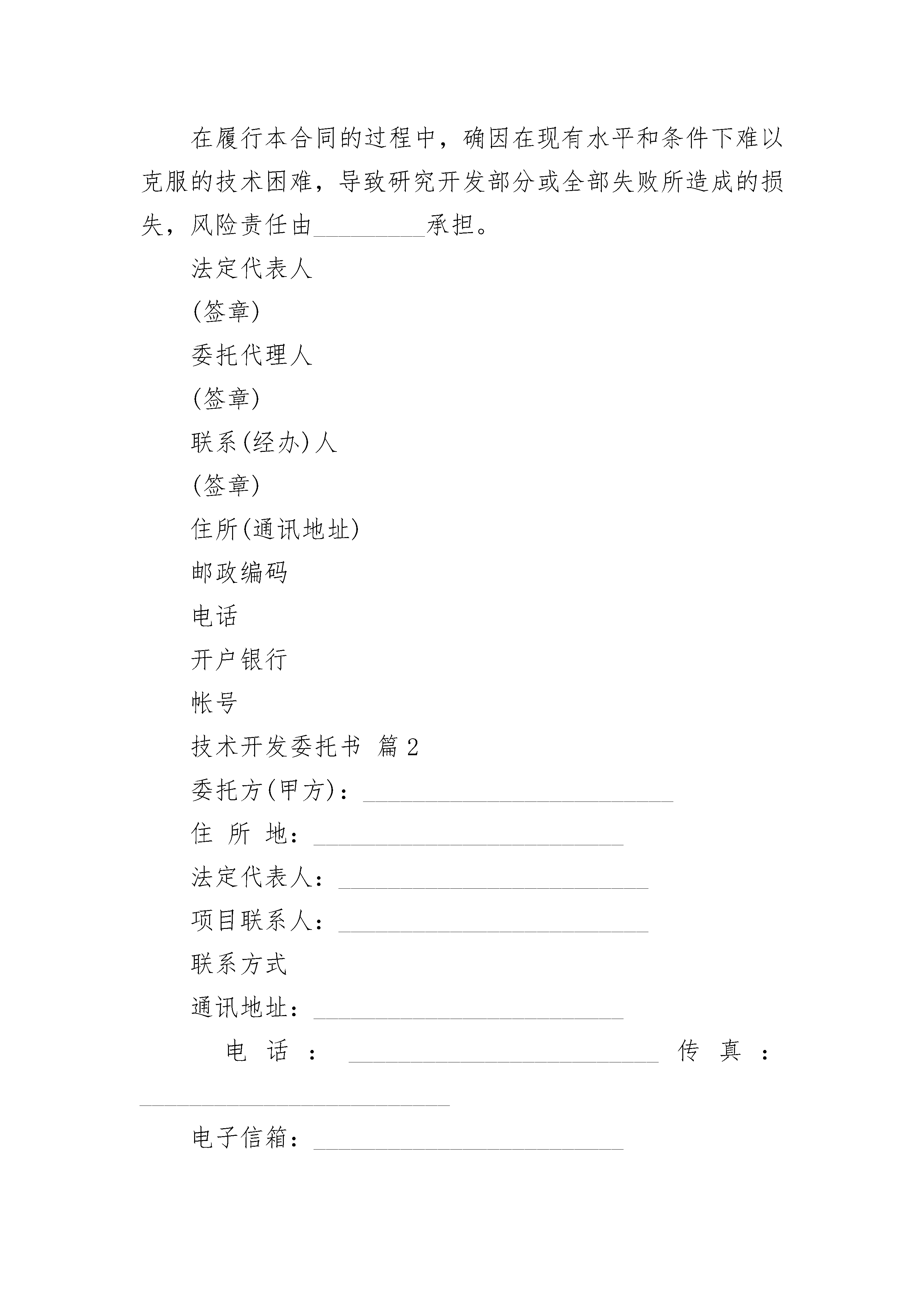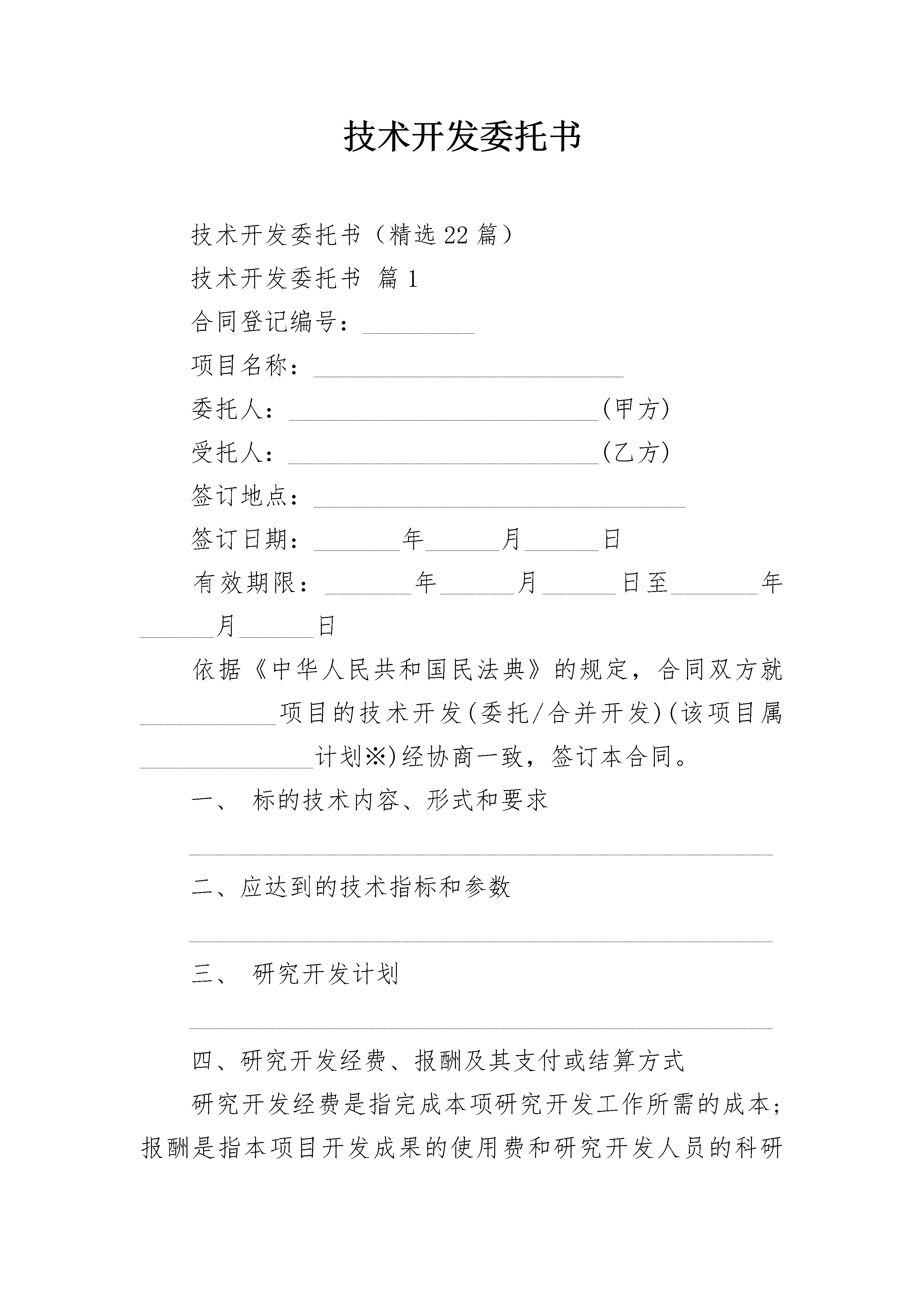 技术开发委托书技术开发委托书(精选22篇)技术开发委托书篇1合同登记编号:_________项目名称:_________________________委托人:_________________________(甲方)受托人:_________________________(乙方)签订地点:______________________________签订日期:_______年______月______日有效期限:_______年______月______日至_______年______月______日依据《中华人民共和国民法典》的规定,合同双方就___________项目的技术开发(委托/合并开发)(该项目属______________计划※)经协商一致,签订本合同。一、标的技术内容、形式和要求_______________________________________________二、应达到的技术指标和参数_______________________________________________三、研究开发计划_______________________________________________四、研究开发经费、报酬及其支付或结算方式研究开发经费是指完成本项研究开发工作所需的成本;报酬是指本项目开发成果的使用费和研究开发人员的科研补贴。本项目研究开发经费及报酬(大写):____________元(其中经费____________元,报酬____________元)。经费和报酬支付方式(采用以下第______种方式):①一次总付:____________元,时间:____________②分期支付:____________元,时间:________________________元,时间:____________③按利润:____________%提成,期限:____________④按销售额:____________%提成,期限:__________⑤其它方式:__________________________________五、利用研究开发经费购置的设备、器材、资料的财产权属___________________________________________________六、履行的期限、地点和方式本合同自______年______月______日至______年______月______日在________________(地点)履行。本合同的履行方式:______________________________七、※技术情报和资料的保密__________________________________________________八、技术协作和技术指导的内容__________________________________________________九、风险责任的承担在履行本合同的过程中,确因在现有水平和条件下难以克服的技术困难,导致研究开发部分或全部失败所造成的损失,风险责任由_________承担。法定代表人(签章)委托代理人(签章)联系(经办)人(签章)住所(通讯地址)邮政编码电话开户银行帐号技术开发委托书篇2委托方(甲方):_________________________住所地:_________________________法定代表人:_________________________项目联系人:_________________________联系方式通讯地址:_________________________电话:_________________________传真:_________________________电子信箱:_________________________受托方(乙方):_________________________住所地:_________________________法定代表人:_________________________项目联系人:_________________________联系方式通讯地址:_________________________电话:_________________________传真:_________________________电子信箱:_________________________本合同甲方委托乙方研究开发_________________________项目,并支付研究开发经费和报酬,乙方接受委托并进行此项研究开发工作。双方经过平等协商,在真实、充分地表达各自意愿的基础上,根据《中华人民共和国合同法》的规定,达成如下协议,并由双方共同恪守。第一条本合同研究开发项目的要求如下:1.技术目标: