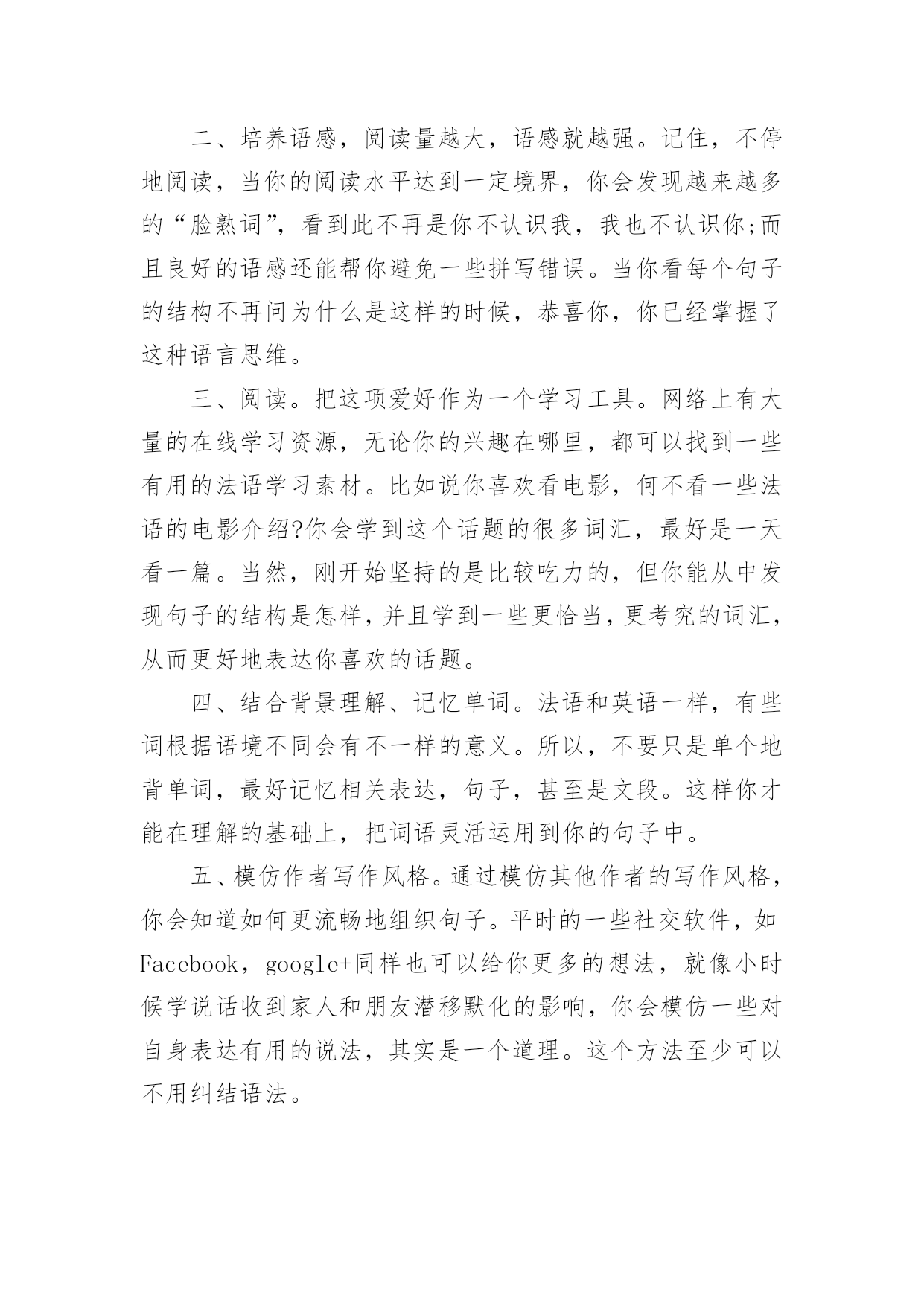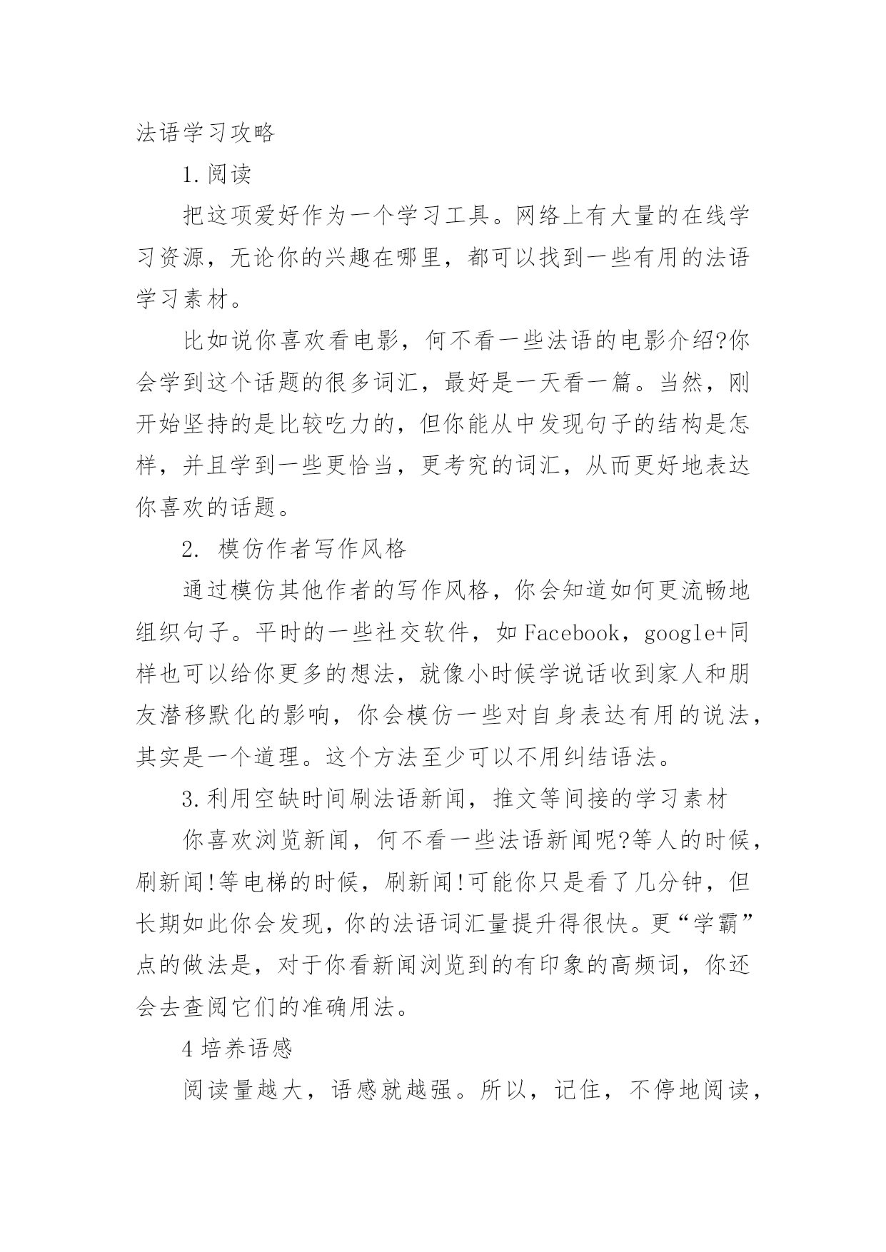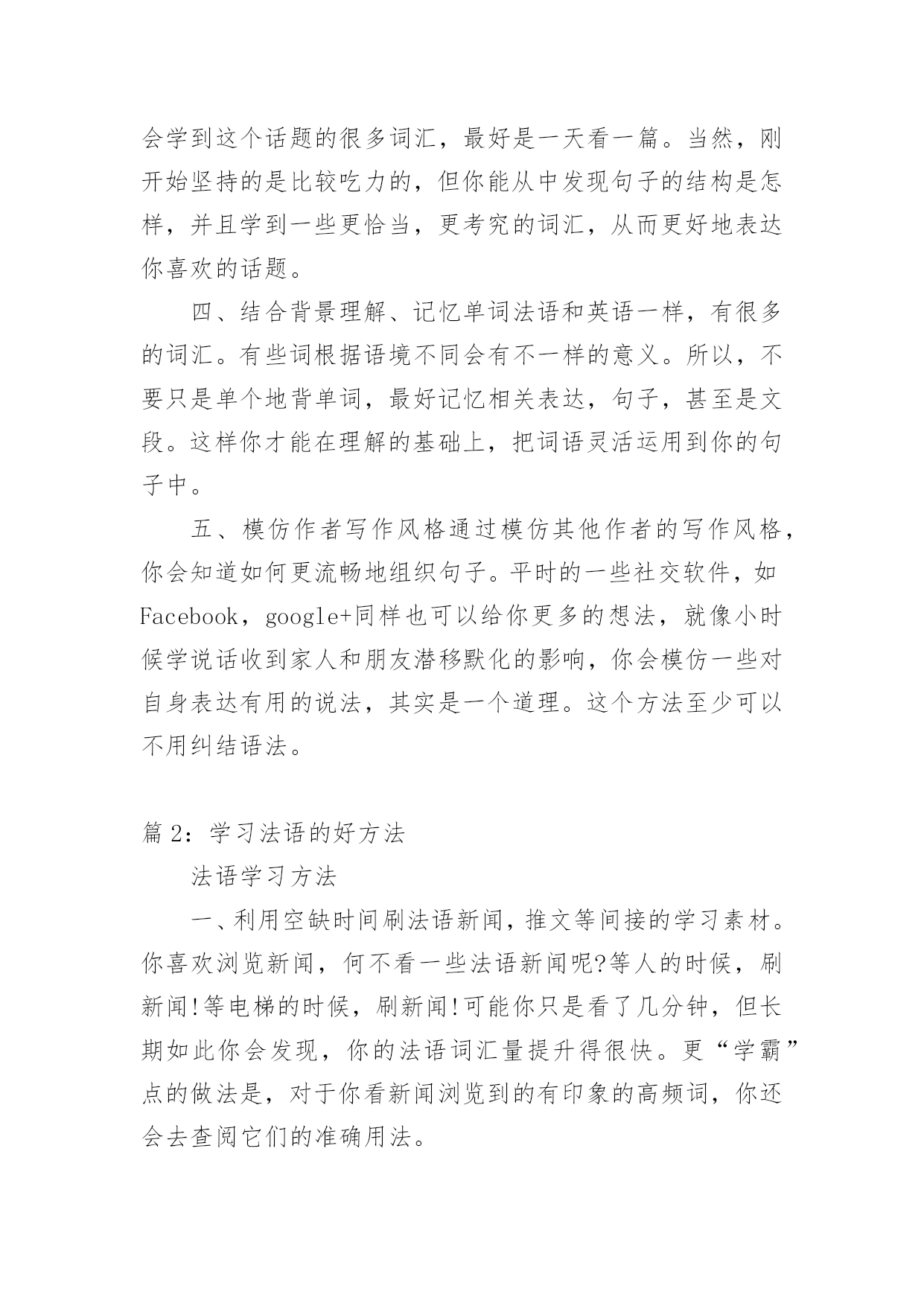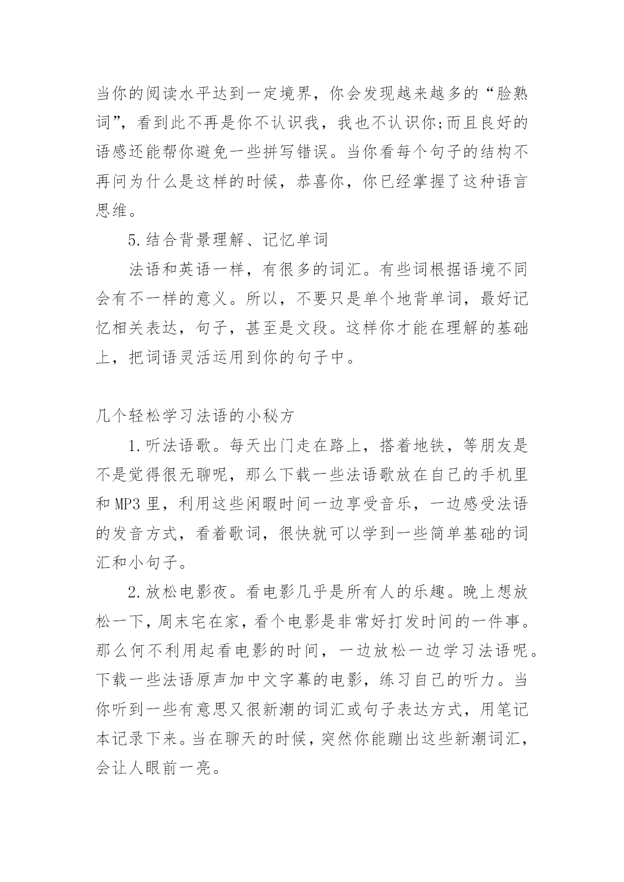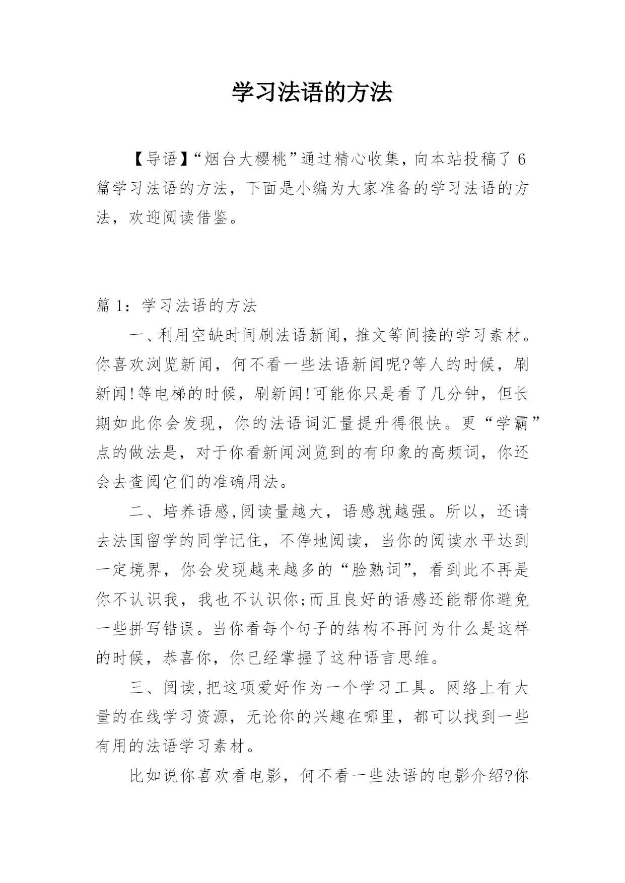 学习法语的方法 【导语】“烟台大樱桃”通过精心收集,向本站投稿了6篇学习法语的方法,下面是小编为大家准备的学习法语的方法,欢迎阅读借鉴。篇1:学习法语的方法一、利用空缺时间刷法语新闻,推文等间接的学习素材。你喜欢浏览新闻,何不看一些法语新闻呢?等人的时候,刷新闻!等电梯的时候,刷新闻!可能你只是看了几分钟,但长期如此你会发现,你的法语词汇量提升得很快。更“学霸”点的做法是,对于你看新闻浏览到的有印象的高频词,你还会去查阅它们的准确用法。二、培养语感,阅读量越大,语感就越强。所以,还请去法国留学的同学记住,不停地阅读,当你的阅读水平达到一定境界,你会发现越来越多的“脸熟词”,看到此不再是你不认识我,我也不认识你;而且良好的语感还能帮你避免一些拼写错误。当你看每个句子的结构不再问为什么是这样的时候,恭喜你,你已经掌握了这种语言思维。三、阅读,把这项爱好作为一个学习工具。网络上有大量的在线学习资源,无论你的兴趣在哪里,都可以找到一些有用的法语学习素材。比如说你喜欢看电影,何不看一些法语的电影介绍?你会学到这个话题的很多词汇,最好是一天看一篇。当然,刚开始坚持的是比较吃力的,但你能从中发现句子的结构是怎样,并且学到一些更恰当,更考究的词汇,从而更好地表达你喜欢的话题。四、结合背景理解、记忆单词法语和英语一样,有很多的词汇。有些词根据语境不同会有不一样的意义。所以,不要只是单个地背单词,最好记忆相关表达,句子,甚至是文段。这样你才能在理解的基础上,把词语灵活运用到你的句子中。五、模仿作者写作风格通过模仿其他作者的写作风格,你会知道如何更流畅地组织句子。平时的一些社交软件,如Facebook,google+同样也可以给你更多的想法,就像小时候学说话收到家人和朋友潜移默化的影响,你会模仿一些对自身表达有用的说法,其实是一个道理。这个方法至少可以不用纠结语法。篇2:学习法语的好方法法语学习方法一、利用空缺时间刷法语新闻,推文等间接的学习素材。你喜欢浏览新闻,何不看一些法语新闻呢?等人的时候,刷新闻!等电梯的时候,刷新闻!可能你只是看了几分钟,但长期如此你会发现,你的法语词汇量提升得很快。更“学霸”点的做法是,对于你看新闻浏览到的有印象的高频词,你还会去查阅它们的准确用法。二、培养语感,阅读量越大,语感就越强。记住,不停地阅读,当你的阅读水平达到一定境界,你会发现越来越多的“脸熟词”,看到此不再是你不认识我,我也不认识你;而且良好的语感还能帮你避免一些拼写错误。当你看每个句子的结构不再问为什么是这样的时候,恭喜你,你已经掌握了这种语言思维。三、阅读。把这项爱好作为一个学习工具。网络上有大量的在线学习资源,无论你的兴趣在哪里,都可以找到一些有用的法语学习素材。比如说你喜欢看电影,何不看一些法语的电影介绍?你会学到这个话题的很多词汇,最好是一天看一篇。当然,刚开始坚持的是比较吃力的,但你能从中发现句子的结构是怎样,并且学到一些更恰当,更考究的词汇,从而更好地表达你喜欢的话题。四、结合背景理解、记忆单词。法语和英语一样,有些词根据语境不同会有不一样的意义。所以,不要只是单个地背单词,最好记忆相关表达,句子,甚至是文段。这样你才能在理解的基础上,把词语灵活运用到你的句子中。五、模仿作者写作风格。通过模仿其他作者的写作风格,你会知道如何更流畅地组织句子。平时的一些社交软件,如Facebook,google+同样也可以给你更多的想法,就像小时候学说话收到家人和朋友潜移默化的影响,你会模仿一些对自身表达有用的说法,其实是一个道理。这个方法至少可以不用纠结语法。法语学习攻略1.阅读把这项爱好作为一个学习工具。网络上有大量的在线学习资源,无论你的兴趣在哪里,都可以找到一些有用的法语学习素材。比如说你喜欢看电影,何不看一些法语的电影介绍?你会学到这个话题的很多词汇,最好是一天看一篇。当然,刚开始坚持的是比较吃力的,但你能从中发现句子的结构是怎样,并且学到一些更恰当,更考究的词汇,从而更好地表达你喜欢的话题。2.模仿作者写作风格通过模仿其他作者的写作风格,你会知道如何更流畅地组织句子。平时的一些社交软件,如Facebook,google+同样也可以给你更多的想法,就像小时候学说话收到家人和朋友潜移默化的影响,你会模仿一些对自身表达有用的说法,其实是一个道理。这个方法至少可以不用纠结语法。3.利用空缺时间刷法语新闻,推文等间接的学习素材你喜欢浏览新闻,何不看一些法语新闻呢?等人的时候,刷新闻!等电梯的时候,刷新闻!可能你只是看了几分钟,但长期如此你会发现,你的法语词汇量提升得很快。更“学霸”点的做法是,对于你看新闻浏览到的有印象的高频词,你还会去查阅它们的准确用法。4培养语感阅读量越大,语感就越强。所以,记住,不停地阅读,当你的阅读水平达到一定境界,你会发现越来越多