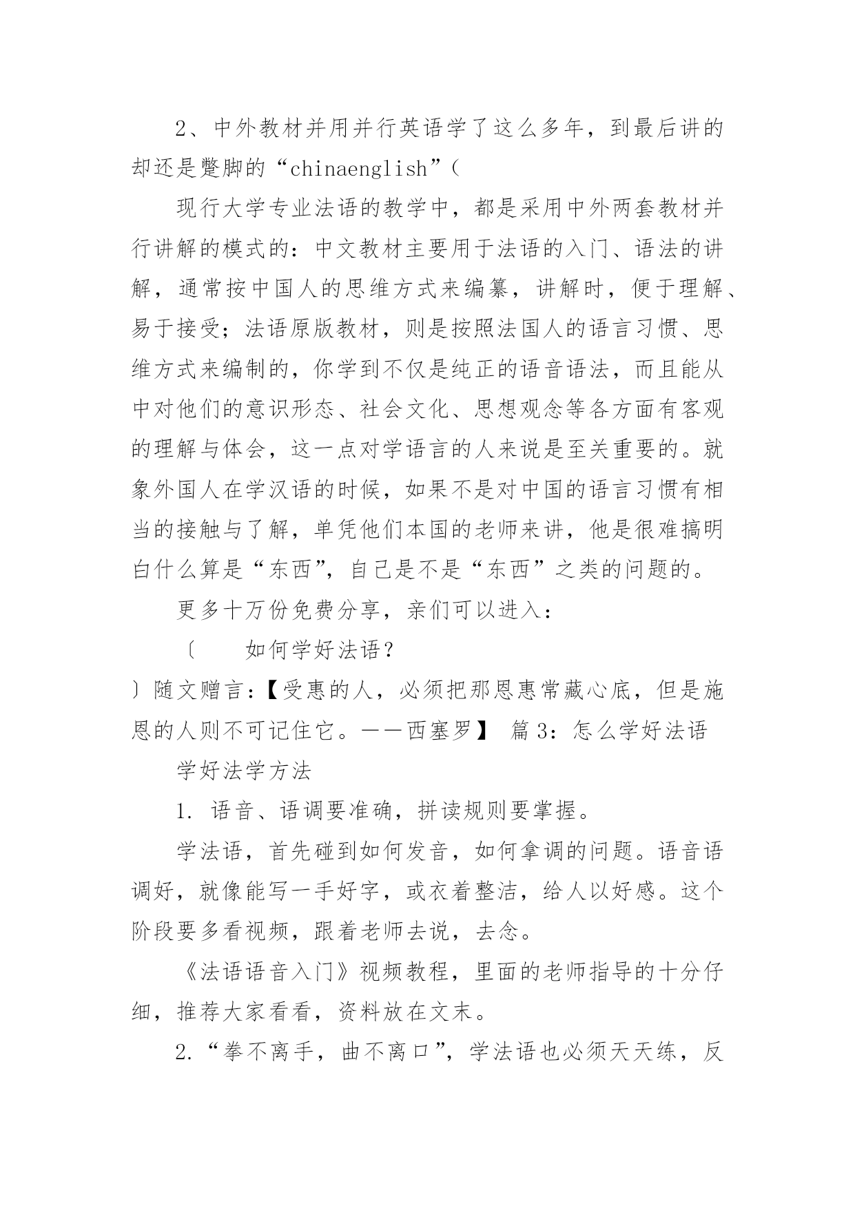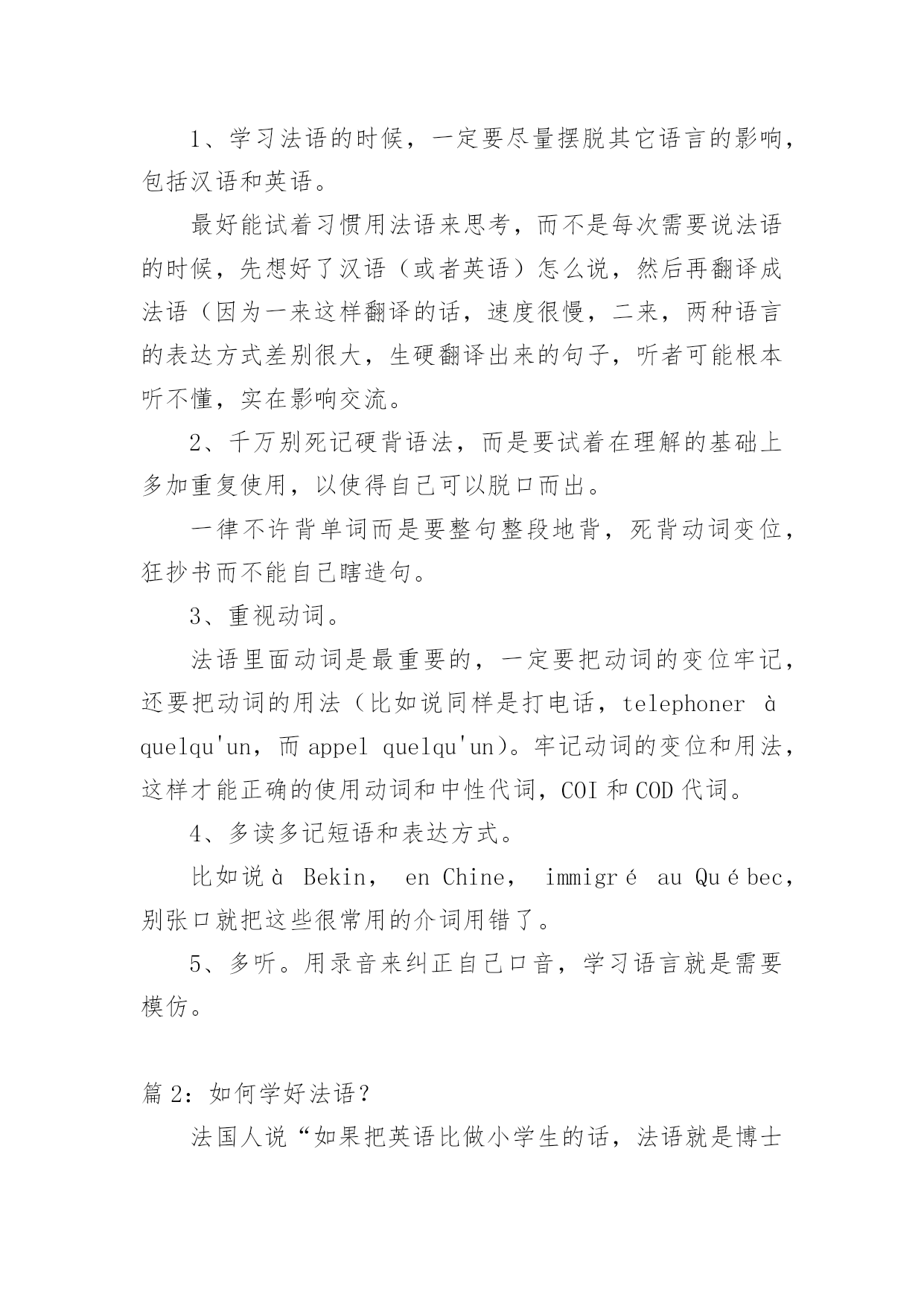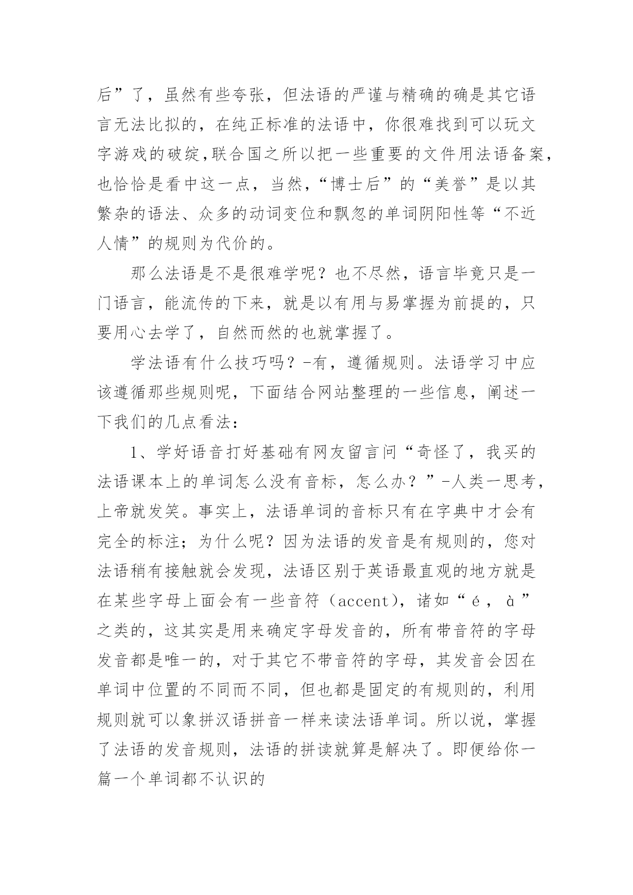 教你学好法语的方法 “Pumpkin”通过精心收集,向本站投稿了8篇教你学好法语的方法,以下是小编收集整理后的教你学好法语的方法,欢迎阅读与借鉴。篇1:教你学好法语的方法教你学好法语的方法法国是世界上最美的语言,但众观小语种,法语学起来难度比较大,不少音毫无规律可寻,完全靠死记。人才的金字塔是按难度堆起来的,但越向上,人才求大于供,回报率上自然是高的。按人才市场规律,未来至少五年,法语专业高回报率是不会变的。一、法语的特点:法语被公认为世界上最优美的语言之一。它的最突出的特点是优美动听、清楚悦耳、准确生动。从语言学角度来讲,法语主要属分析型语言,但它也具有综合性语言的特长,融合了拉丁语的.严谨和希腊语的细腻,构成了独特的法语风格。马克思曾是说过:法语像小河流水,德语像大炮。作为德国人的马克思在这里并没有褒贬之意,他只是形象地指明两种语言的不同特色:法语优美和谐,德语雄壮有力。法语首先说出说话的主语,然后出现动词,即表达动作,最后出现的是这个动作的补语,这就是法语的自然逻辑,句法合乎人类思维理性的语言逻辑。法语的社交性以及其优美、高雅、灵活等特质注定法语被称为最佳国际语言。与英语相比,就总体而言,英语更具有自发性,而法语更具有思索性;前者更趋具体和色彩,而后者则更趋明朗。当代作家J杜龙(J。Duron)则形象地描述了法语与英语的不同风格:“英语可将世界拍成电影,而法语则可对世界进行思考。”语法在法语的学习过程中是一个难点。它较英语来说更加复杂,也较容易和英语混淆。法语主要有两大难点,一是动词变位,二是名词的阴阳性:1、法语的动词变位比起英语来说要复杂的多。有人形容法语动词变位如同孙悟空的七十二般变化。法语的每个动词都和英语中的be动词那样,随着人称、时态、单复数的变化而变化,还多出性的变化。特别是不规则动词,比起英语要复杂的多。需要死记硬背的东西很多。在复合句中,主句和从句之间的动词时态配合也比较复杂。2、法语的名词有阴阳性之分。例如:bureau办公桌是阳性名词,而table桌子则是阴性名词。在记住词意的同时必须记住该词是阴性还是阳性名词。因为相关的形容词,以及动词的过去分词都会随之变化。记住许多单词已属不易,更必须背住阴阳性。3、法语主、谓、宾的结构通常情况下和汉语一样。不过,如果直接宾语和间接宾语是人称代词的话,要放在谓语动词的前面。二、关于学习法语的一些建议:1、学习法语的时候,一定要尽量摆脱其它语言的影响,包括汉语和英语。最好能试着习惯用法语来思考,而不是每次需要说法语的时候,先想好了汉语(或者英语)怎么说,然后再翻译成法语(因为一来这样翻译的话,速度很慢,二来,两种语言的表达方式差别很大,生硬翻译出来的句子,听者可能根本听不懂,实在影响交流。2、千万别死记硬背语法,而是要试着在理解的基础上多加重复使用,以使得自己可以脱口而出。一律不许背单词而是要整句整段地背,死背动词变位,狂抄书而不能自己瞎造句。3、重视动词。法语里面动词是最重要的,一定要把动词的变位牢记,还要把动词的用法(比如说同样是打电话,telephoneràquelqu'un,而appelquelqu'un)。牢记动词的变位和用法,这样才能正确的使用动词和中性代词,COI和COD代词。4、多读多记短语和表达方式。比如说àBekin,enChine,immigréauQuébec,别张口就把这些很常用的介词用错了。5、多听。用录音来纠正自己口音,学习语言就是需要模仿。篇2:如何学好法语?法国人说“如果把英语比做小学生的话,法语就是博士后”了,虽然有些夸张,但法语的严谨与精确的确是其它语言无法比拟的,在纯正标准的法语中,你很难找到可以玩文字游戏的破绽,联合国之所以把一些重要的文件用法语备案,也恰恰是看中这一点,当然,“博士后”的“美誉”是以其繁杂的语法、众多的动词变位和飘忽的单词阴阳性等“不近人情”的规则为代价的。那么法语是不是很难学呢?也不尽然,语言毕竟只是一门语言,能流传的下来,就是以有用与易掌握为前提的,只要用心去学了,自然而然的也就掌握了。学法语有什么技巧吗?-有,遵循规则。法语学习中应该遵循那些规则呢,下面结合网站整理的一些信息,阐述一下我们的几点看法:1、学好语音打好基础有网友留言问“奇怪了,我买的法语课本上的单词怎么没有音标,怎么办?”-人类一思考,上帝就发笑。事实上,法语单词的音标只有在字典中才会有完全的标注;为什么呢?因为法语的发音是有规则的,您对法语稍有接触就会发现,法语区别于英语最直观的地方就是在某些字母上面会有一些音符(accent),诸如“é,à”之类的,这其实是用来确定字母发音的,所有带音符的字母发音都是唯一的,对于其它不带音符的字母,其发音会因在单词中位置的不同而不同,但也都是固定的有规则的,利用规则就可以象拼汉语拼音一样来读法语