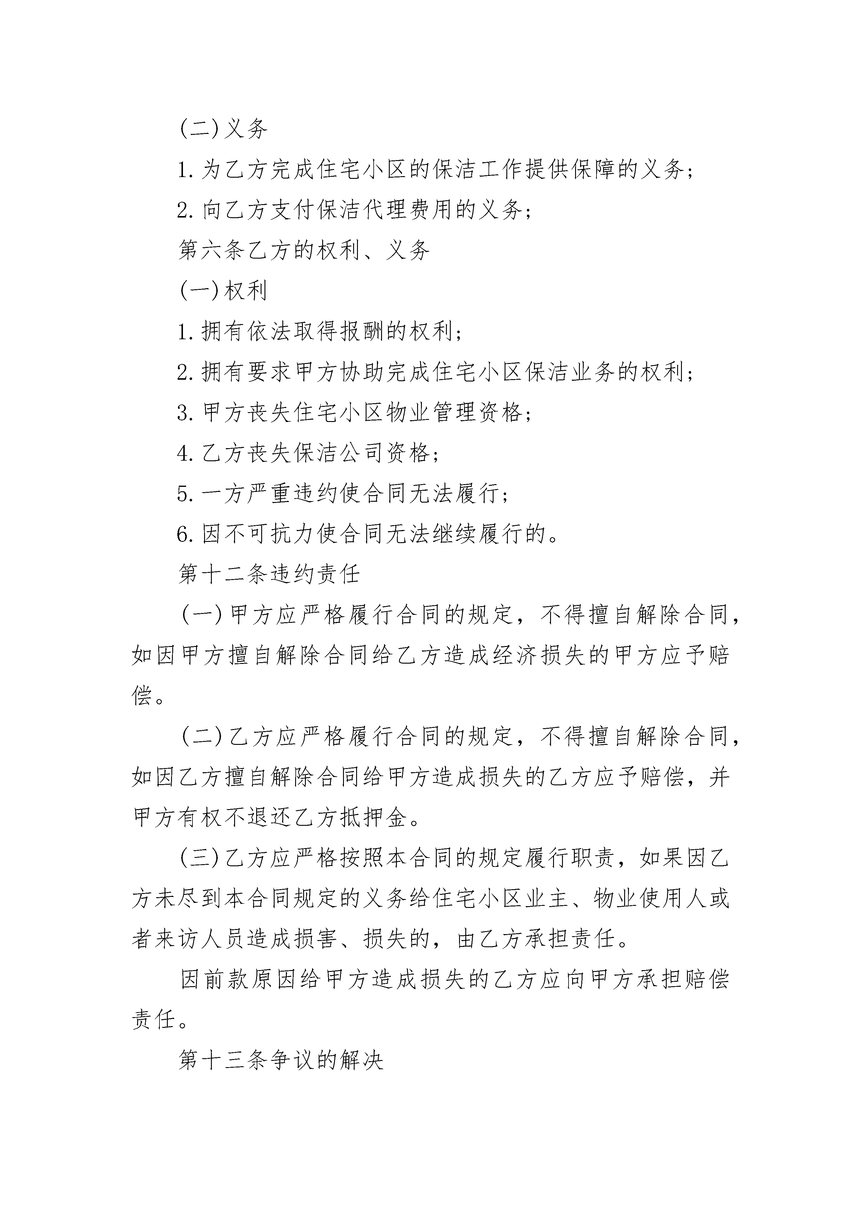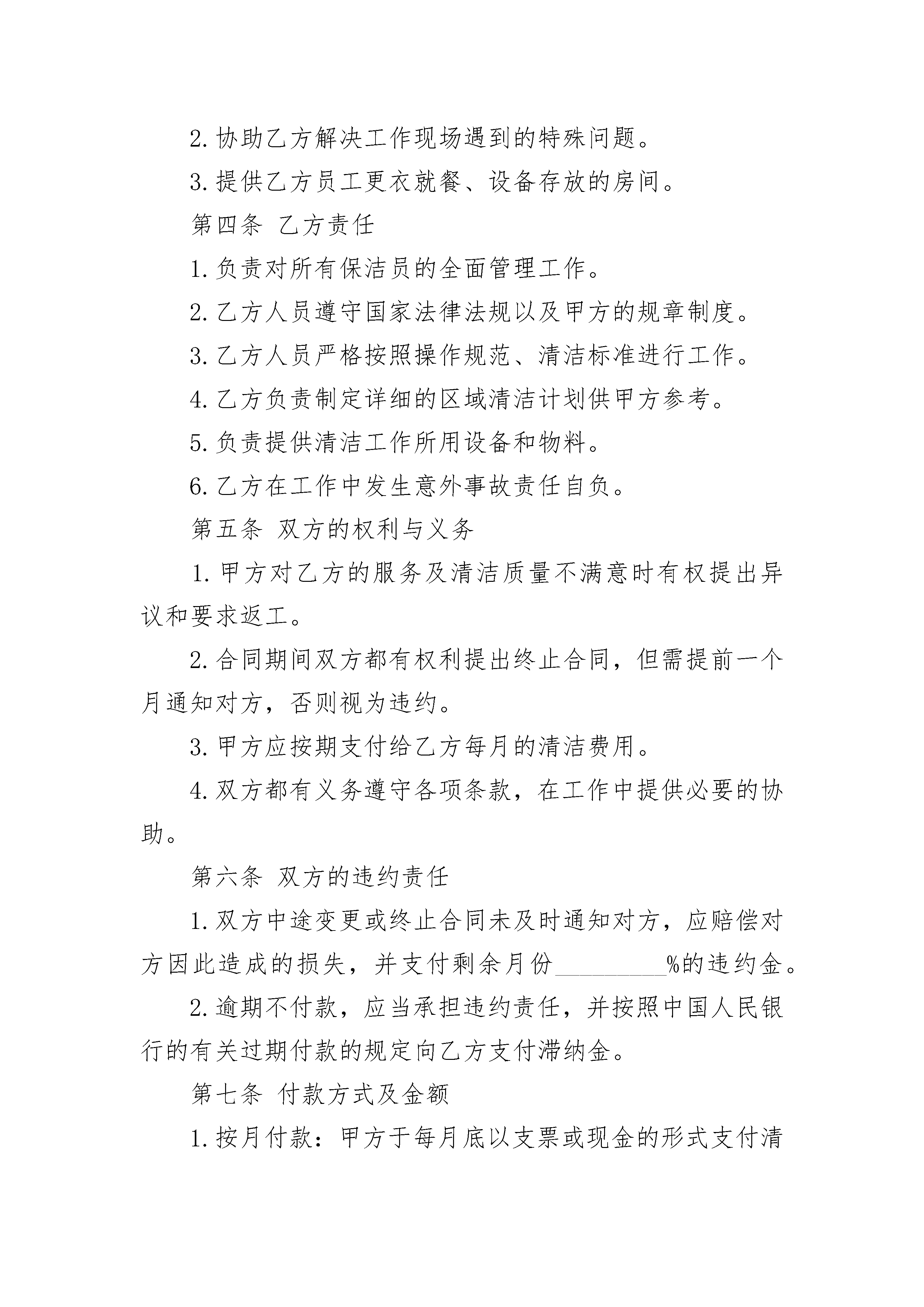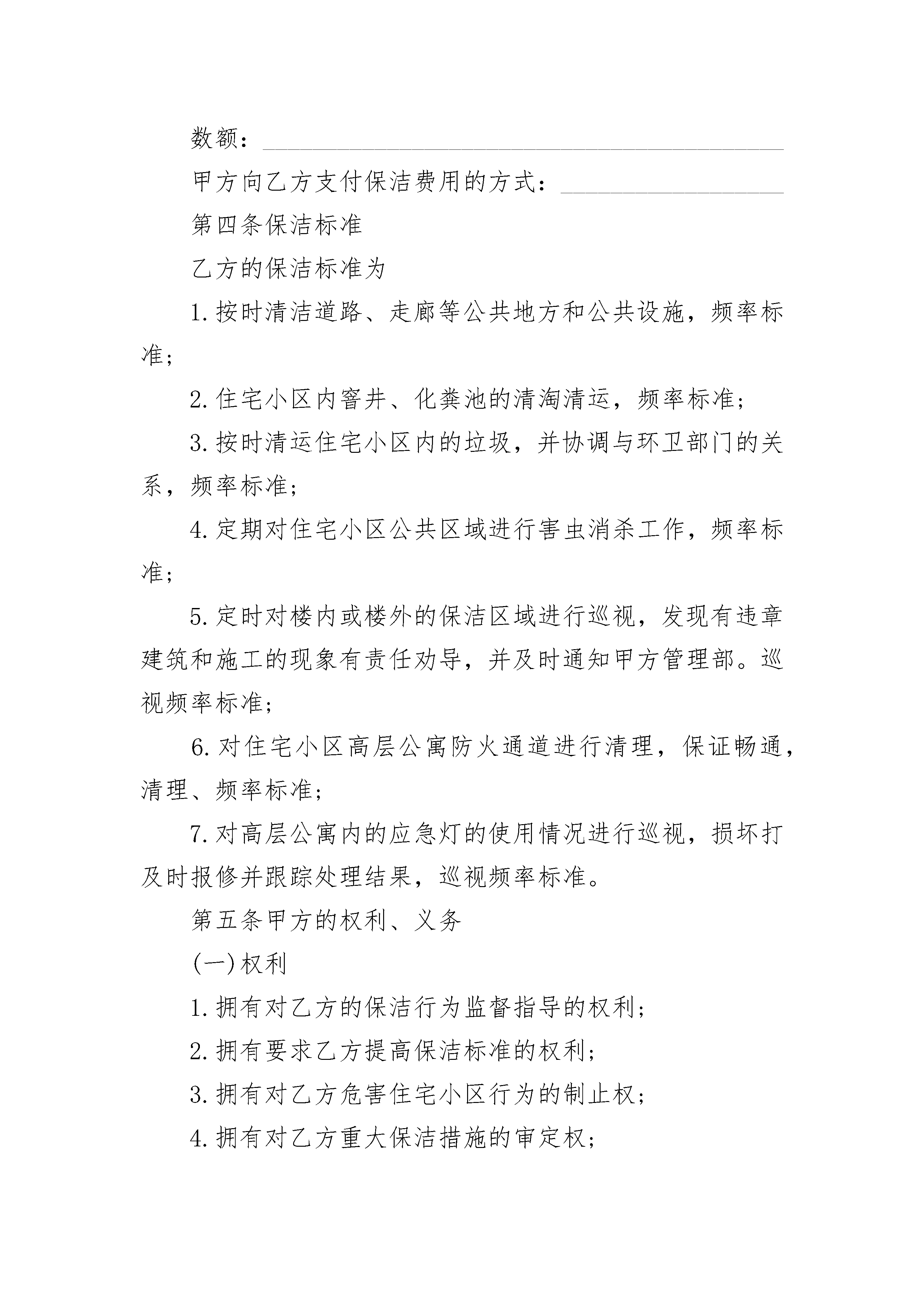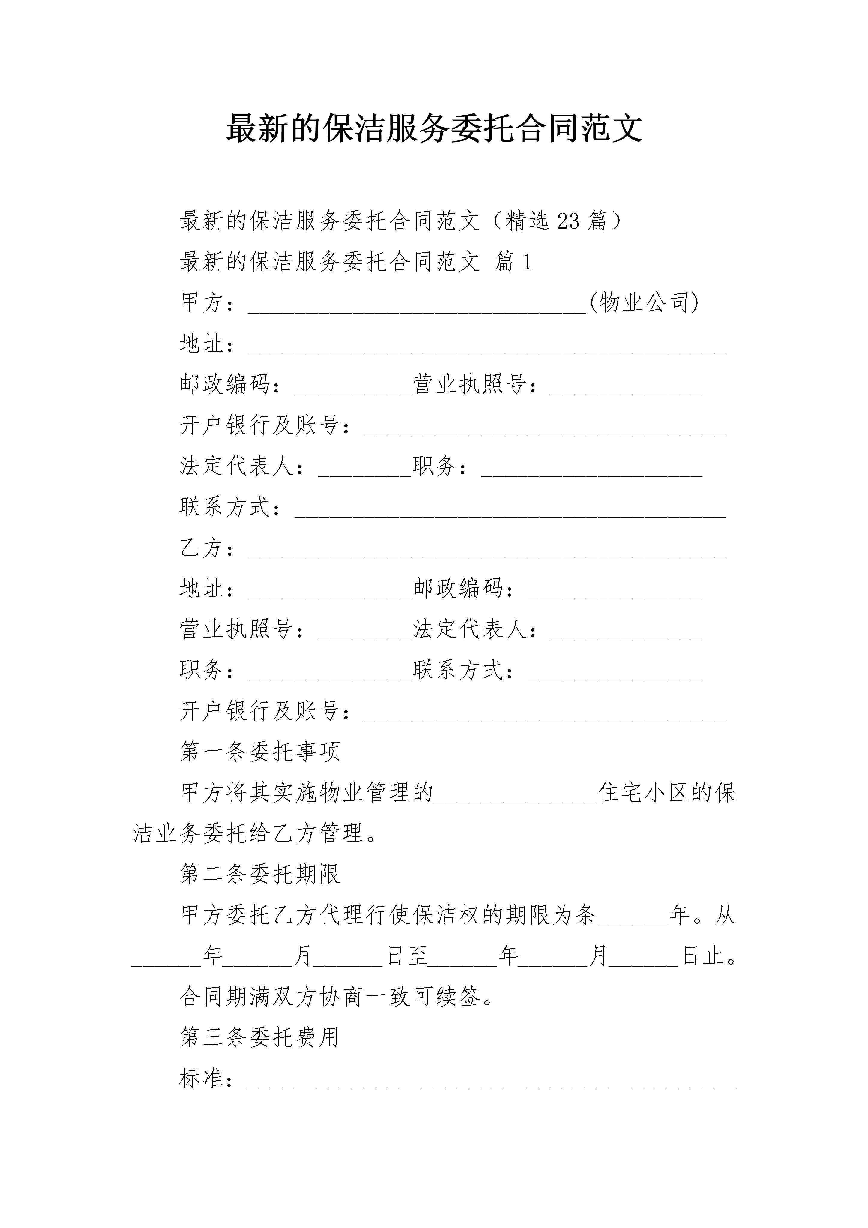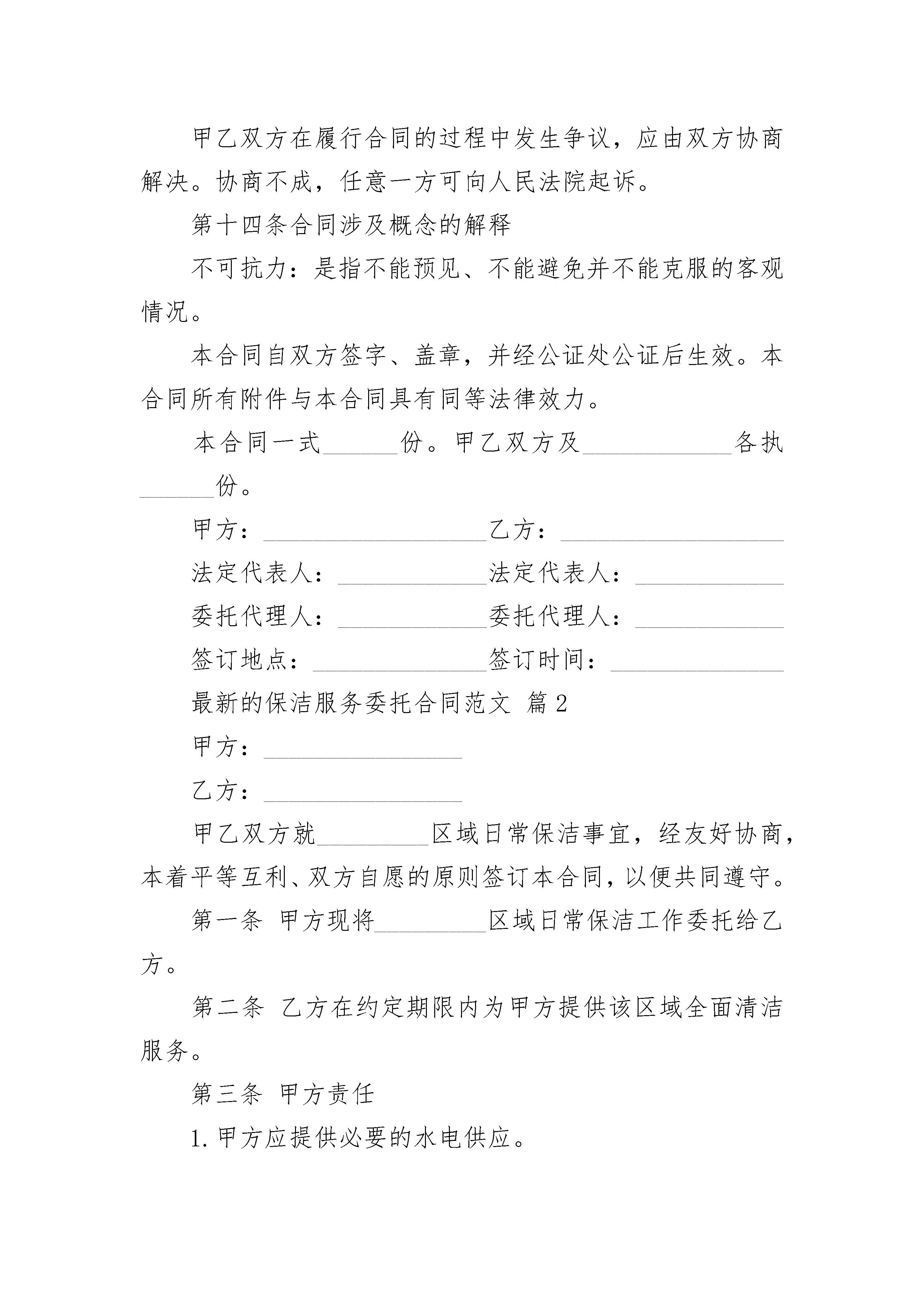 最新的保洁服务委托合同范文最新的保洁服务委托合同范文(精选23篇)最新的保洁服务委托合同范文篇1甲方:_____________________________(物业公司)地址:_________________________________________邮政编码:__________营业执照号:_____________开户银行及账号:_______________________________法定代表人:________职务:___________________联系方式:_____________________________________乙方:_________________________________________地址:______________邮政编码:_______________营业执照号:________法定代表人:_____________职务:______________联系方式:_______________开户银行及账号:_______________________________第一条委托事项甲方将其实施物业管理的______________住宅小区的保洁业务委托给乙方管理。第二条委托期限甲方委托乙方代理行使保洁权的期限为条______年。从______年______月______日至______年______月______日止。合同期满双方协商一致可续签。第三条委托费用标准:__________________________________________数额:__________________________________________甲方向乙方支付保洁费用的方式:__________________第四条保洁标准乙方的保洁标准为1.按时清洁道路、走廊等公共地方和公共设施,频率标准;2.住宅小区内窨井、化粪池的清淘清运,频率标准;3.按时清运住宅小区内的垃圾,并协调与环卫部门的关系,频率标准;4.定期对住宅小区公共区域进行害虫消杀工作,频率标准;5.定时对楼内或楼外的保洁区域进行巡视,发现有违章建筑和施工的现象有责任劝导,并及时通知甲方管理部。巡视频率标准;6.对住宅小区高层公寓防火通道进行清理,保证畅通,清理、频率标准;7.对高层公寓内的应急灯的使用情况进行巡视,损坏打及时报修并跟踪处理结果,巡视频率标准。第五条甲方的权利、义务(一)权利1.拥有对乙方的保洁行为监督指导的权利;2.拥有要求乙方提高保洁标准的权利;3.拥有对乙方危害住宅小区行为的制止权;4.拥有对乙方重大保洁措施的审定权;(二)义务1.为乙方完成住宅小区的保洁工作提供保障的义务;2.向乙方支付保洁代理费用的义务;第六条乙方的权利、义务(一)权利1.拥有依法取得报酬的权利;2.拥有要求甲方协助完成住宅小区保洁业务的权利;3.甲方丧失住宅小区物业管理资格;4.乙方丧失保洁公司资格;5.一方严重违约使合同无法履行;6.因不可抗力使合同无法继续履行的。第十二条违约责任(一)甲方应严格履行合同的规定,不得擅自解除合同,如因甲方擅自解除合同给乙方造成经济损失的甲方应予赔偿。(二)乙方应严格履行合同的规定,不得擅自解除合同,如因乙方擅自解除合同给甲方造成损失的乙方应予赔偿,并甲方有权不退还乙方抵押金。(三)乙方应严格按照本合同的规定履行职责,如果因乙方未尽到本合同规定的义务给住宅小区业主、物业使用人或者来访人员造成损害、损失的,由乙方承担责任。因前款原因给甲方造成损失的乙方应向甲方承担赔偿责任。第十三条争议的解决甲乙双方在履行合同的过程中发生争议,应由双方协商解决。协商不成,任意一方可向人民法院起诉。第十四条合同涉及概念的解释不可抗力:是指不能预见、不能避免并不能克服的客观情况。本合同自双方签字、盖章,并经公证处公证后生效。本合同所有附件与本合同具有同等法律效力。本合同一式______份。甲乙双方及____________各执______份。甲方:__________________乙方:__________________法定代表人:____________法定代表人:____________委托代理人:____________委托代理人:____________签订地点:______________签订时间:______________最新的保洁服务委托合同范文篇2甲方:________________乙方:________________甲乙双方就_________区域日常保洁事宜,经友好协商,本着平等互利、双方自愿的原则签订本合同,以便共同遵守。第一条甲方现将_________区域日常保洁工作委托给乙方。第二条乙方在约定期限内为甲方提供该区域全面清洁服务。第三条甲方责任1.甲方应提供必要的水电供应。2