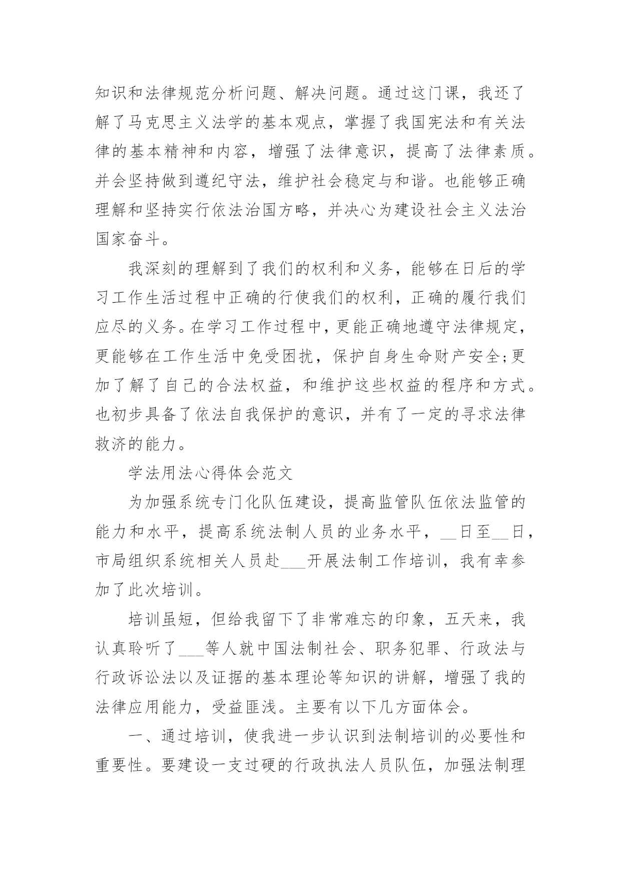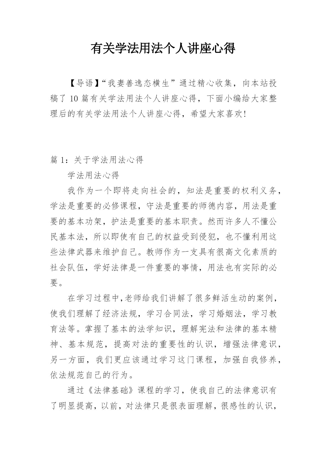 有关学法用法个人讲座心得 【导语】“我妻善逸态横生”通过精心收集,向本站投稿了10篇有关学法用法个人讲座心得,下面小编给大家整理后的有关学法用法个人讲座心得,希望大家喜欢!篇1:关于学法用法心得学法用法心得我作为一个即将走向社会的,知法是重要的权利义务,学法是重要的必修课程,守法是重要的师德内容,用法是重要的基本功架,护法是重要的基本职责。然而许多人不懂公民基本法,所以即使有自己的权益受到侵犯,也不懂利用这些法律武器来维护自己。教师作为一支具有很高文化素质的社会队伍,学好法律是一件重要的事情,用法也有实际的必要。在学习过程中,老师给我们讲解了很多鲜活生动的案例,使我们理解了经济法规,学习合同法,学习婚姻法,学习教育法等。掌握了基本的法学知识,理解宪法和法律的基本精神、基本规范,提高对法的重要性的认识,增强法律意识,另一方面,我们更应该通过学习这门课程,加强自我修养,依法规范自己的行为。通过《法律基础》课程的学习,使我自己的法律意识有了明显提高,以前,对法律只是很表面理解,很感性的认识,现在能够领悟到法律的深层次内涵,有了理性的认识,通过学习使我的法律意识产生了质的转变。学习结束后,我静下心来,参照课本,对照笔记,联系一些法律事例,以及观看普法宣传节目,感觉到在法制建设方面,我还有很多需要学习,还有很多工作要做,还有许多有待解决的问题需要考虑。法律知识是我们必备素质之一,我们必须通过它,树立正确的人生观,价值观。促进和规范人与人之间的关系,正确的处理人与人之间关系问题。公平交易,平等……,在生活过程中,遵守法律,享受个人权利,履行义务。由于我们专业的知识体系过于单一,导致我们很少接触到能使自己综合素质提高的知识。而这门课很好的弥补了我们专业所缺乏的,并使我们的知识视野扩大。对提高自己的综合能力很有好处。比如:在找兼职做的时候,能够更好的维护自己的利益等。在这一个学期的学习中,我感觉到自己有了很大的变化。其中实体法部分对我以后很有帮助,它主要介绍我国几大基本的部门法和几个重要的单行法的相关内容,,使大家了解包括行政法、民法、婚姻法、继承法、知识产权法、经济法、刑法的立法目的、原则及基本规定和精神,培养大家的知法、守法、护法、用法的自觉意识。总之,在本学期学习的这门《法律基础》课上,我掌握了法学的基本理论,了解并明确了各主要法律部门的基本精神和规定,并在一定法律知识的基础上形成了有关法与法律现象的知识、思想、心理、观点和评价。并学会了运用法律知识和法律规范分析问题、解决问题。通过这门课,我还了解了马克思主义法学的基本观点,掌握了我国宪法和有关法律的基本精神和内容,增强了法律意识,提高了法律素质。并会坚持做到遵纪守法,维护社会稳定与和谐。也能够正确理解和坚持实行依法治国方略,并决心为建设社会主义法治国家奋斗。我深刻的理解到了我们的权利和义务,能够在日后的学习工作生活过程中正确的行使我们的权利,正确的履行我们应尽的义务。在学习工作过程中,更能正确地遵守法律规定,更能够在工作生活中免受困扰,保护自身生命财产安全;更加了解了自己的合法权益,和维护这些权益的程序和方式。也初步具备了依法自我保护的意识,并有了一定的寻求法律救济的能力。学法用法心得体会范文为加强系统专门化队伍建设,提高监管队伍依法监管的能力和水平,提高系统法制人员的业务水平,__日至__日,市局组织系统相关人员赴___开展法制工作培训,我有幸参加了此次培训。培训虽短,但给我留下了非常难忘的印象,五天来,我认真聆听了___等人就中国法制社会、职务犯罪、行政法与行政诉讼法以及证据的基本理论等知识的讲解,增强了我的法律应用能力,受益匪浅。主要有以下几方面体会。一、通过培训,使我进一步认识到法制培训的必要性和重要性。要建设一支过硬的行政执法人员队伍,加强法制理论培训是非常必要的。因为在我们现阶段行政执法的过程中,虽说我们已经在不断完善各项制度,增加政府工作的透明度、规范行政执法程序,清理行政执法依据,不断加强行政执法监督的力度和不断完善行政执法监督手段,做了大量的卓有成效的工作。但事实上,在我们的执法过程中还是存在一些法律法规的制定上有一些不完备的情况或者漏洞,行政执法队伍业务水平有待提高,行政执法监督亟待加强等问题。而且,从行政执法部门人员的角度来说,只有整个行政机关的大多数人员都有了依法行政的思想意识,自觉地行动起来,这些自觉地的行动才会汇聚成一股汹涌的力量,推进依法行政事业向前发展。从这个层面上来说,加强法制理论培训显得尤为重要。二、通过培训,使我进一步地意识到自身的不足。这次培训,老师除了讲药品监管相关的专业法律知识,也讲了一些证据法、刑事诉讼法、行政案件审理等相关的法律知识,这些法律知识由于平时在药品、医疗器械监管中用得不多,所以也不是很熟悉。但是通过老师的讲解,发现其实这些
