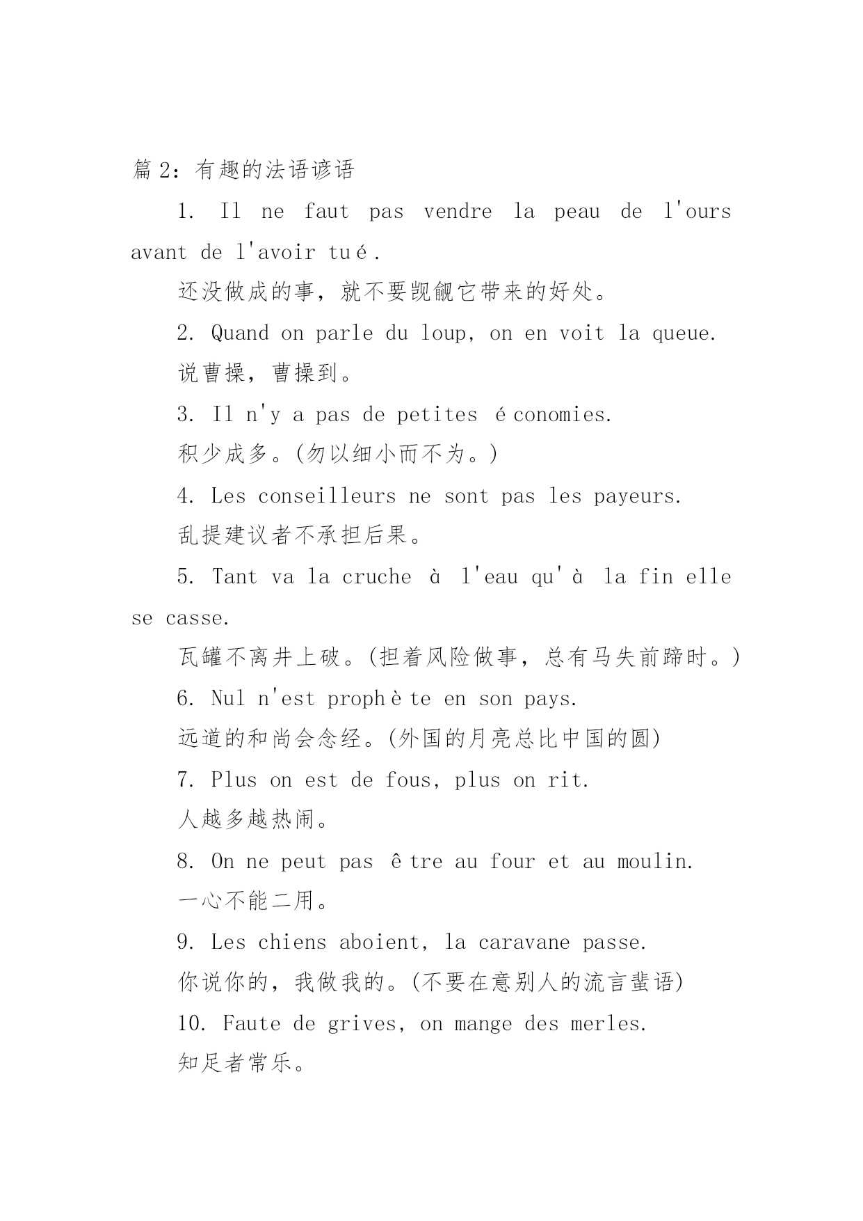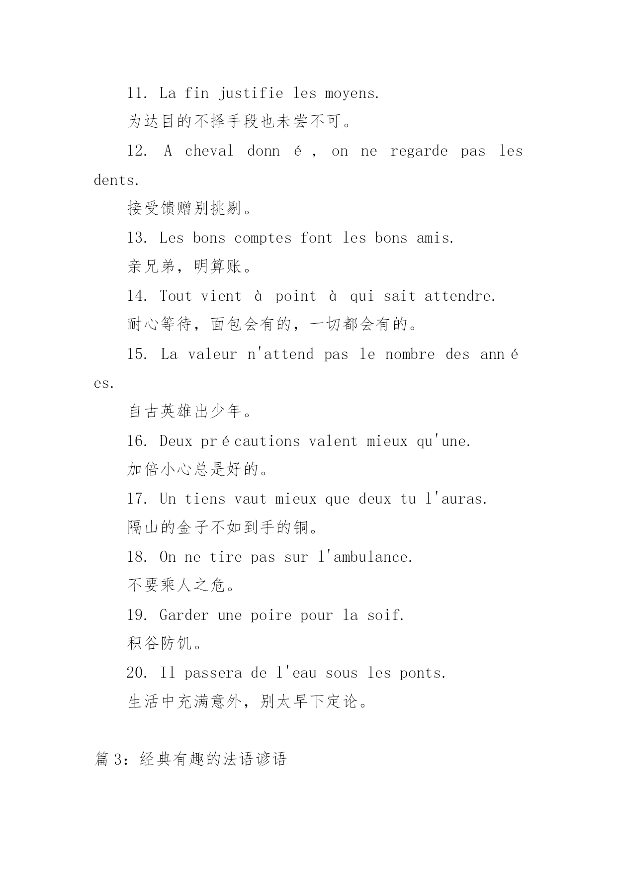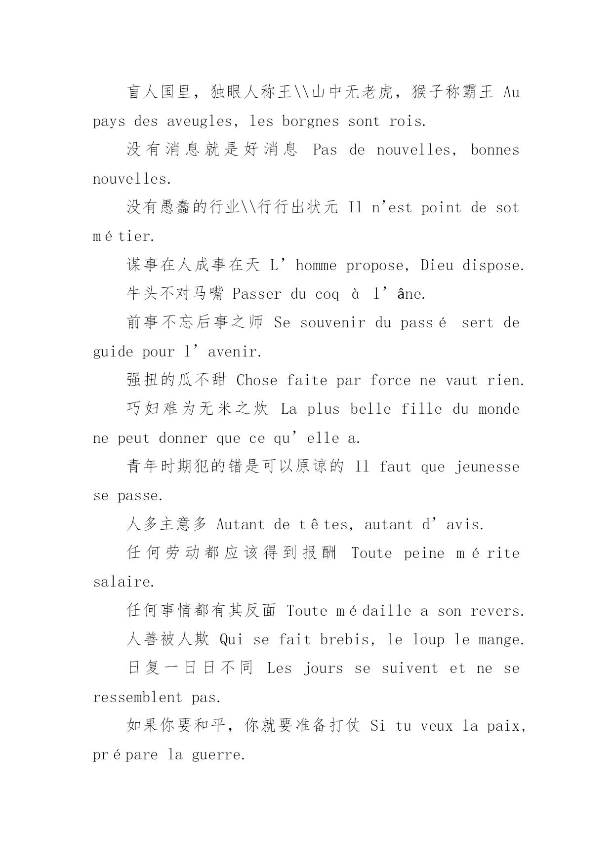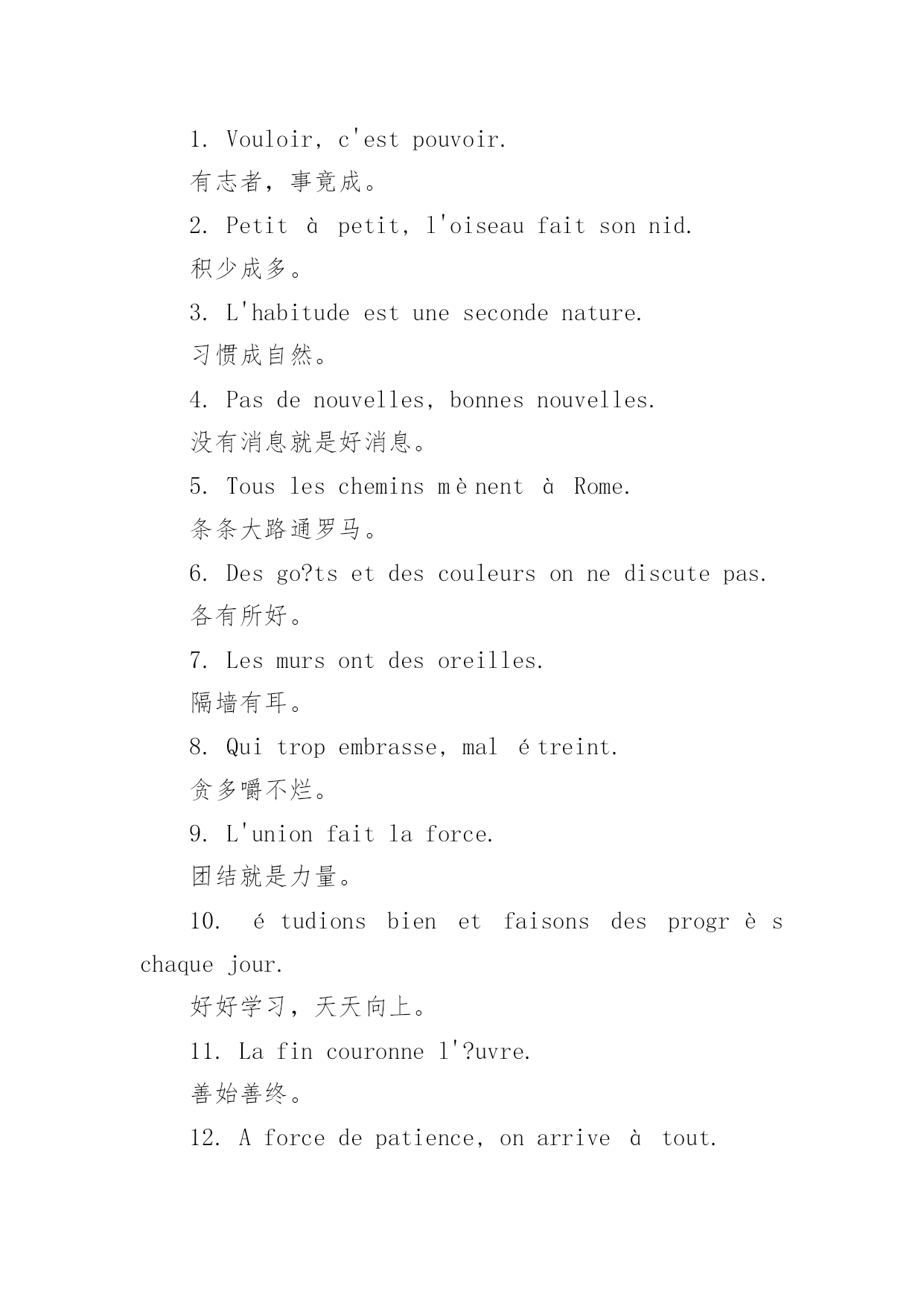 有趣的法语谚语 “橘崽”通过精心收集,向本站投稿了12篇有趣的法语谚语,下面小编为大家整理后的有趣的法语谚语,欢迎阅读与借鉴!篇1:有趣的法语谚语今日事今日毕Ilnefautpasremattreaulendemaincequ'onpeutfairelejourmême.近朱者赤近墨者黑Onsetientenrougeauprèsduvermillonetennoirauprèsdel'encrechinoise.酒不醉人人自醉Levinn'enivrepas,c'estl'hommequis'enire.旧的不去,新的不来Unclouchassel'autre.酒香不怕巷子深Àbonvin,pointd'enseingne.一不做二不休Levinesttiré,ilfautleboire.涓涓流水汇成河Lespetitsruisseauxfontlesgrandesrivières.三思而后行Ilfauttournerseptfoissalanguedanslaboucheavantdeparler.留得青山在不愁没柴烧Mieuxvauxperdrelainequelabrebis.龙生龙凤生凤,老鼠生儿打地洞Bonchienchassederace.盲人国里,独眼人称王\\山中无老虎,猴子称霸王Aupaysdesaveugles,lesborgnessontrois.没有消息就是好消息Pasdenouvelles,bonnesnouvelles.没有愚蠢的行业\\行行出状元Iln’estpointdesotmétier.谋事在人成事在天L’hommepropose,Dieudispose.牛头不对马嘴Passerducoqàl’âne.前事不忘后事之师Sesouvenirdupassésertdeguidepourl’avenir.强扭的瓜不甜Chosefaiteparforcenevautrien.巧妇难为无米之炊Laplusbellefilledumondenepeutdonnerquecequ’ellea.青年时期犯的错是可以原谅的Ilfautquejeunessesepasse.人多主意多Autantdetêtes,autantd’avis.任何劳动都应该得到报酬Toutepeineméritesalaire.任何事情都有其反面Toutemédailleasonrevers.人善被人欺Quisefaitbrebis,lelouplemange.日复一日日不同Lesjourssesuiventetneseressemblentpas.如果你要和平,你就要准备打仗Situveuxlapaix,préparelaguerre.篇2:有趣的法语谚语1.Ilnefautpasvendrelapeaudel'oursavantdel'avoirtué.还没做成的事,就不要觊觎它带来的好处。2.Quandonparleduloup,onenvoitlaqueue.说曹操,曹操到。3.Iln'yapasdepetiteséconomies.积少成多。(勿以细小而不为。)4.Lesconseilleursnesontpaslespayeurs.乱提建议者不承担后果。5.Tantvalacrucheàl'eauqu'àlafinellesecasse.瓦罐不离井上破。(担着风险做事,总有马失前蹄时。)6.Nuln'estprophèteensonpays.远道的和尚会念经。(外国的月亮总比中国的圆)7.Plusonestdefous,plusonrit.人越多越热闹。8.Onnepeutpasêtreaufouretaumoulin.一心不能二用。9.Leschiensaboient,lacaravanepasse.你说你的,我做我的。(不要在意别人的流言蜚语)10.Fautedegrives,onmangedesmerles.知足者常乐。11.Lafinjustifielesmoyens.为达目的不择手段也未尝不可。12.Achevaldonné,onneregardepaslesdents.接受馈赠别挑剔。13.Lesbonscomptesfontlesbonsamis.亲兄弟,明算账。14.Toutvientàpointàquisaitattendre.耐心等待,面包会有的,一切都会有的。15.Lavaleurn'attendpaslenombredesannées.自古英雄出少年。16.Deuxprécautionsvalentmieuxqu'une.加倍小心总是好的。17.Untiensvautmieuxquedeuxtul'auras.隔山的金子不如到手的铜。18.Onnetirepassurl'ambulance.不要