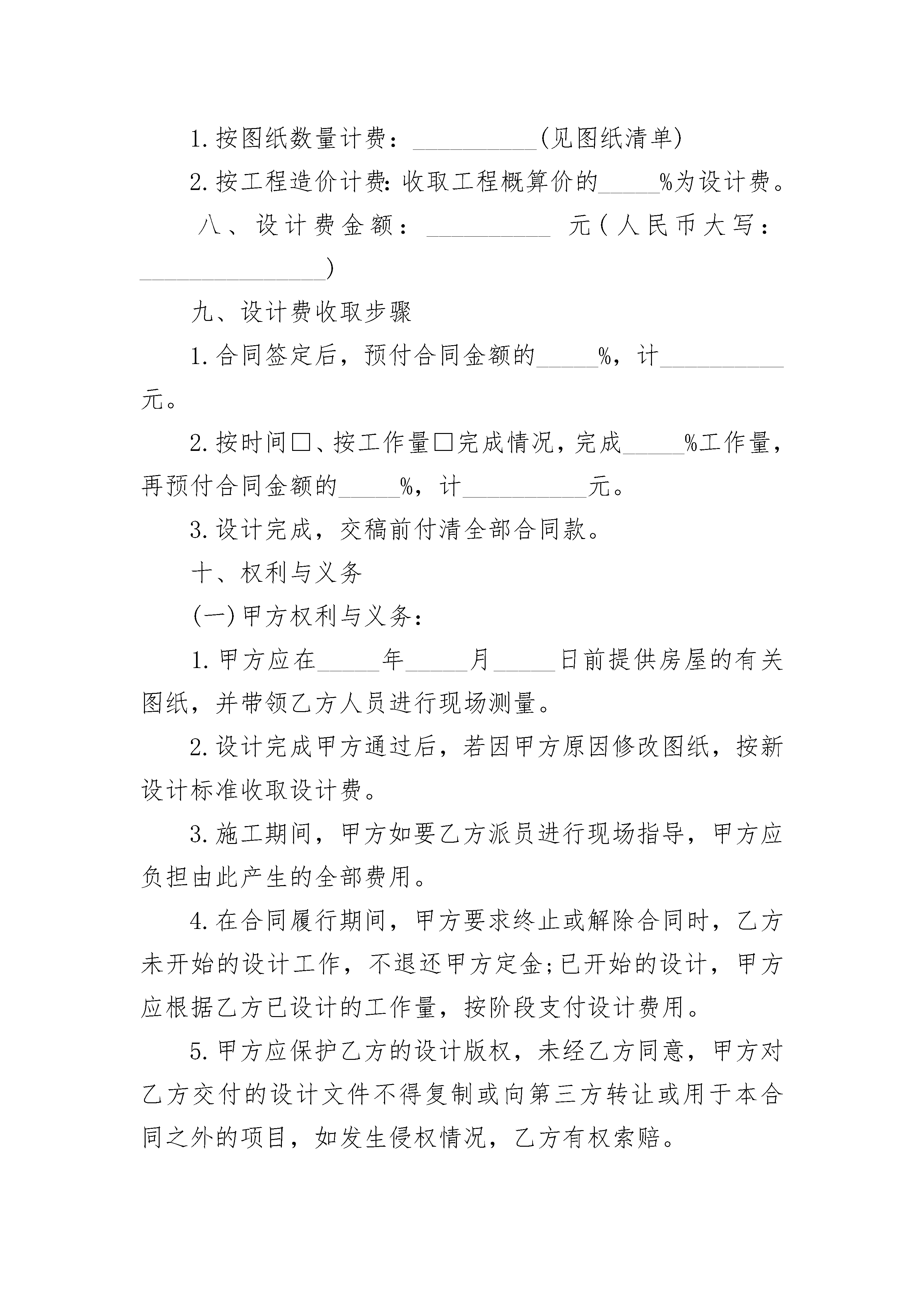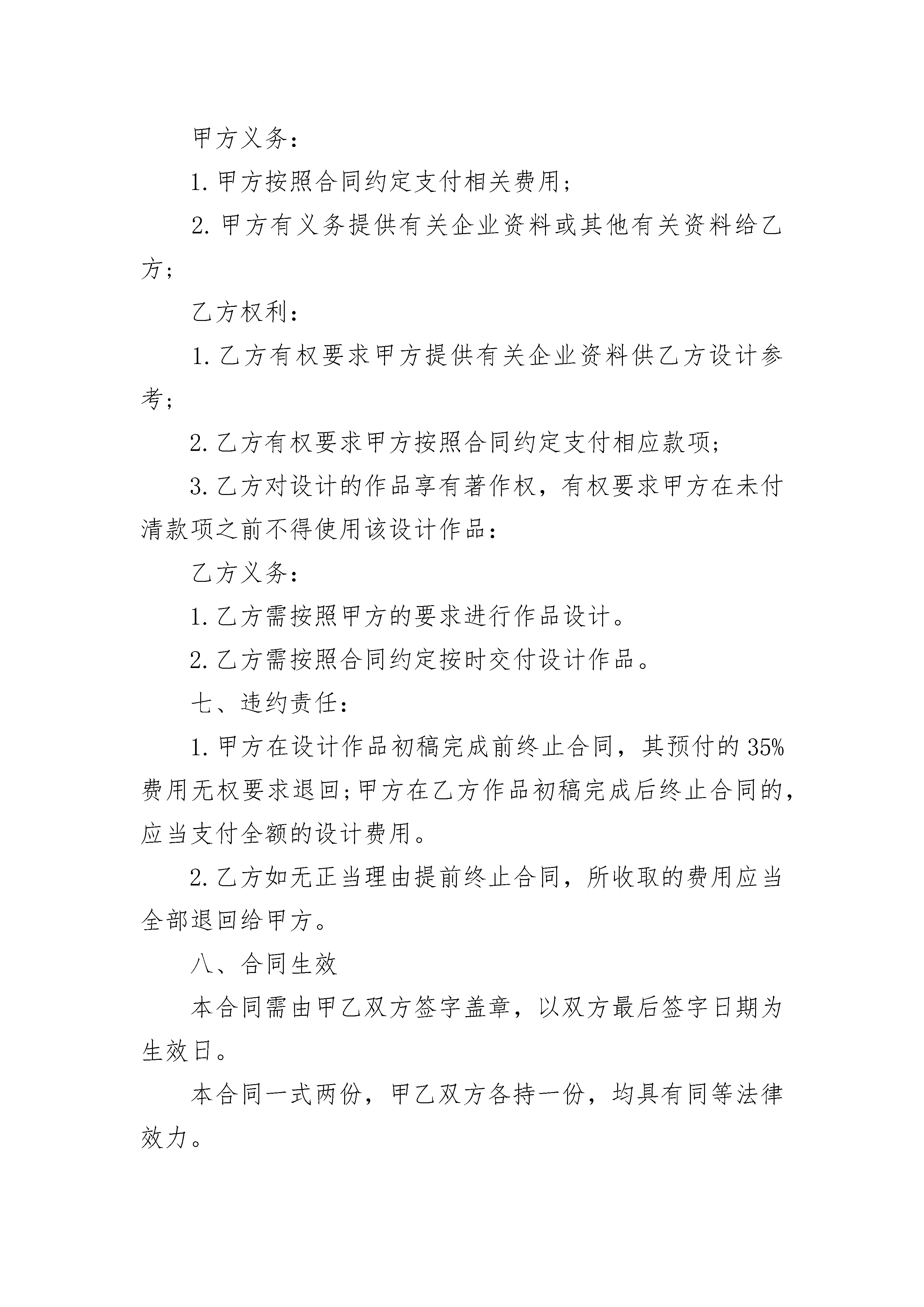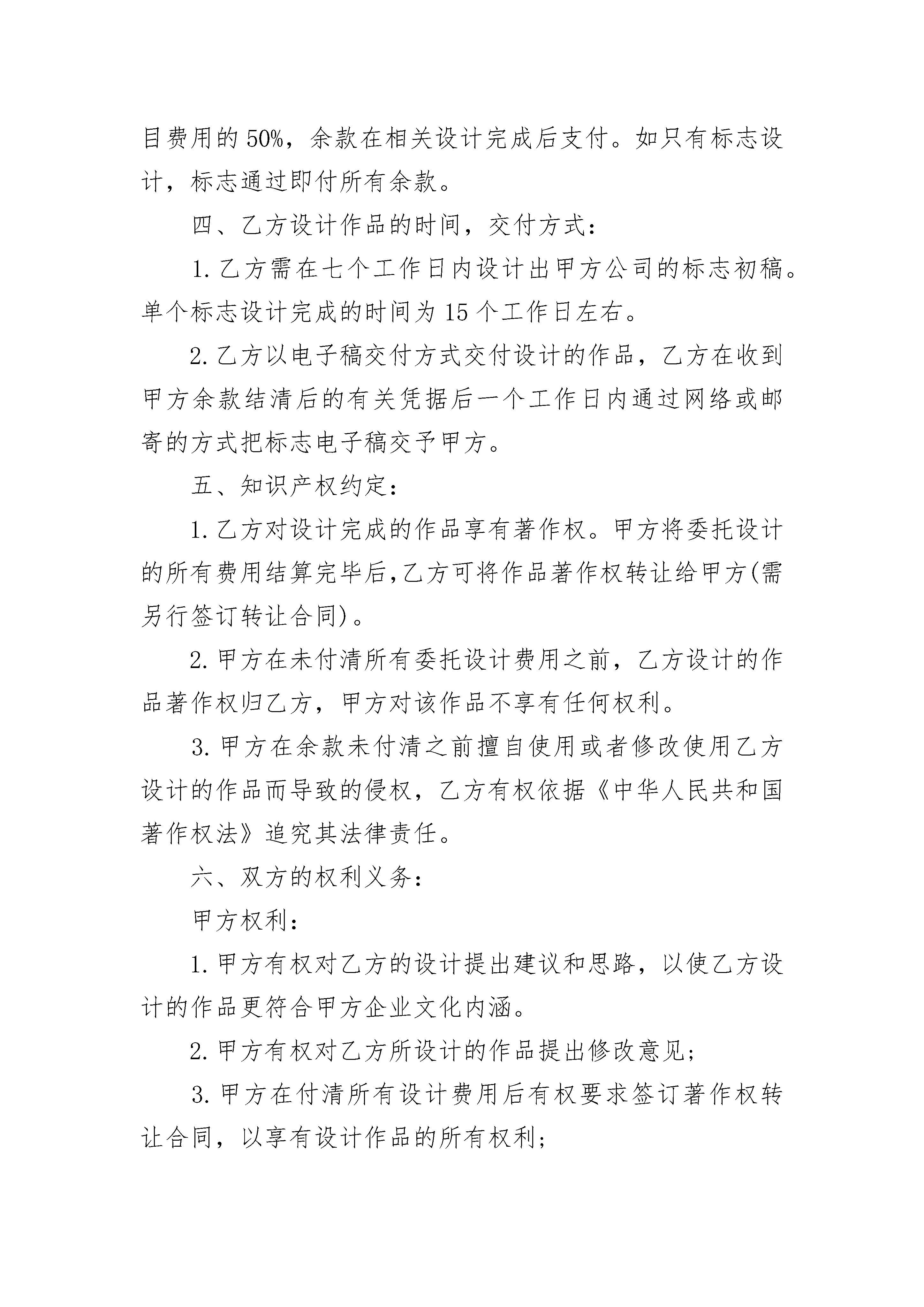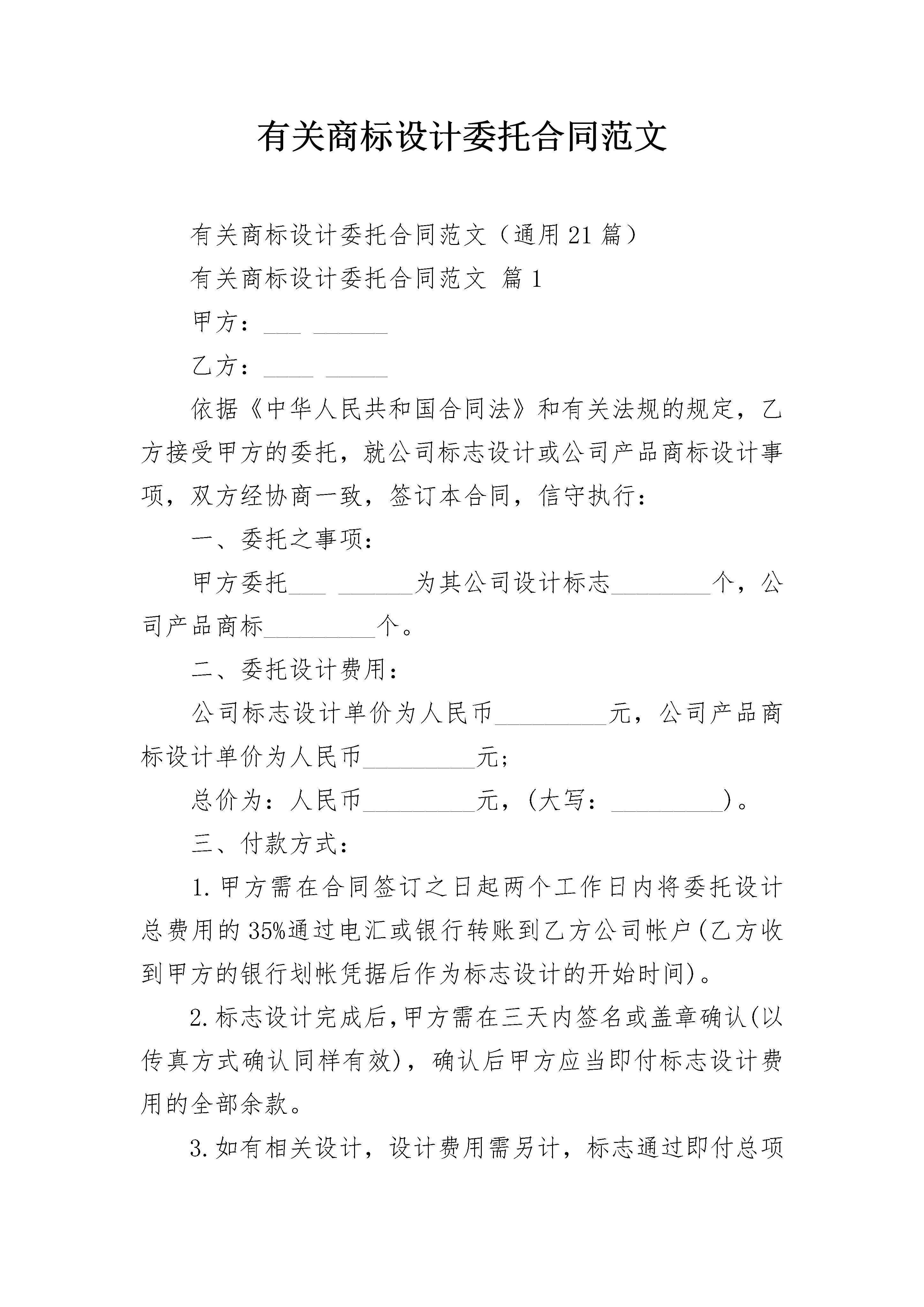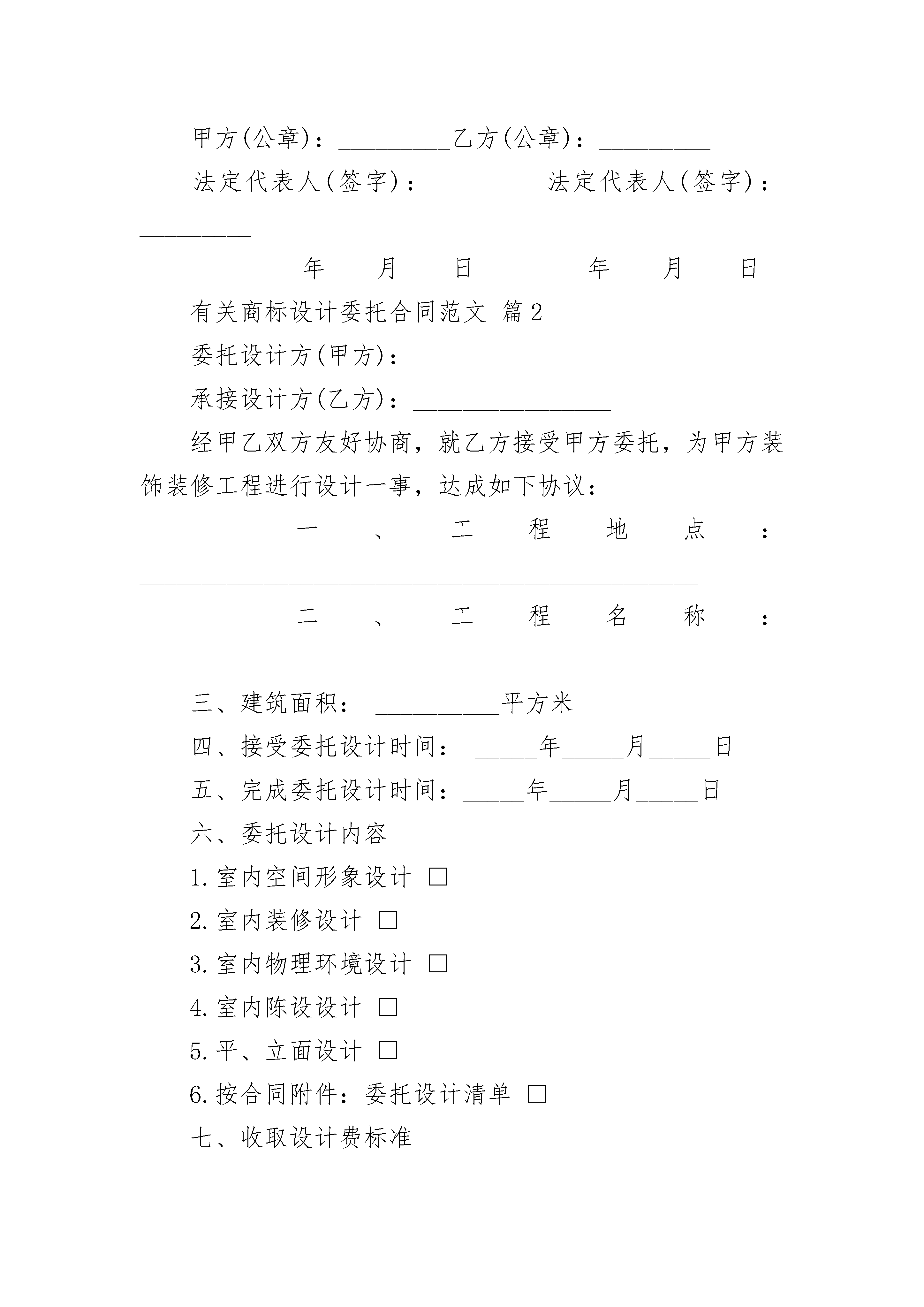 有关商标设计委托合同范文有关商标设计委托合同范文(通用21篇)有关商标设计委托合同范文篇1甲方:_________乙方:_________依据《中华人民共和国合同法》和有关法规的规定,乙方接受甲方的委托,就公司标志设计或公司产品商标设计事项,双方经协商一致,签订本合同,信守执行:一、委托之事项:甲方委托_________为其公司设计标志________个,公司产品商标_________个。二、委托设计费用:公司标志设计单价为人民币_________元,公司产品商标设计单价为人民币_________元;总价为:人民币_________元,(大写:_________)。三、付款方式:1.甲方需在合同签订之日起两个工作日内将委托设计总费用的35%通过电汇或银行转账到乙方公司帐户(乙方收到甲方的银行划帐凭据后作为标志设计的开始时间)。2.标志设计完成后,甲方需在三天内签名或盖章确认(以传真方式确认同样有效),确认后甲方应当即付标志设计费用的全部余款。3.如有相关设计,设计费用需另计,标志通过即付总项目费用的50%,余款在相关设计完成后支付。如只有标志设计,标志通过即付所有余款。四、乙方设计作品的时间,交付方式:1.乙方需在七个工作日内设计出甲方公司的标志初稿。单个标志设计完成的时间为15个工作日左右。2.乙方以电子稿交付方式交付设计的作品,乙方在收到甲方余款结清后的有关凭据后一个工作日内通过网络或邮寄的方式把标志电子稿交予甲方。五、知识产权约定:1.乙方对设计完成的作品享有著作权。甲方将委托设计的所有费用结算完毕后,乙方可将作品著作权转让给甲方(需另行签订转让合同)。2.甲方在未付清所有委托设计费用之前,乙方设计的作品著作权归乙方,甲方对该作品不享有任何权利。3.甲方在余款未付清之前擅自使用或者修改使用乙方设计的作品而导致的侵权,乙方有权依据《中华人民共和国著作权法》追究其法律责任。六、双方的权利义务:甲方权利:1.甲方有权对乙方的设计提出建议和思路,以使乙方设计的作品更符合甲方企业文化内涵。2.甲方有权对乙方所设计的作品提出修改意见;3.甲方在付清所有设计费用后有权要求签订著作权转让合同,以享有设计作品的所有权利;甲方义务:1.甲方按照合同约定支付相关费用;2.甲方有义务提供有关企业资料或其他有关资料给乙方;乙方权利:1.乙方有权要求甲方提供有关企业资料供乙方设计参考;2.乙方有权要求甲方按照合同约定支付相应款项;3.乙方对设计的作品享有著作权,有权要求甲方在未付清款项之前不得使用该设计作品:乙方义务:1.乙方需按照甲方的要求进行作品设计。2.乙方需按照合同约定按时交付设计作品。七、违约责任:1.甲方在设计作品初稿完成前终止合同,其预付的35%费用无权要求退回;甲方在乙方作品初稿完成后终止合同的,应当支付全额的设计费用。2.乙方如无正当理由提前终止合同,所收取的费用应当全部退回给甲方。八、合同生效本合同需由甲乙双方签字盖章,以双方最后签字日期为生效日。本合同一式两份,甲乙双方各持一份,均具有同等法律效力。甲方(公章):_________乙方(公章):_________法定代表人(签字):_________法定代表人(签字):__________________年____月____日_________年____月____日有关商标设计委托合同范文篇2委托设计方(甲方):________________承接设计方(乙方):________________经甲乙双方友好协商,就乙方接受甲方委托,为甲方装饰装修工程进行设计一事,达成如下协议:一、工程地点:_____________________________________________二、工程名称:_____________________________________________三、建筑面积:__________平方米四、接受委托设计时间:_____年_____月_____日五、完成委托设计时间:_____年_____月_____日六、委托设计内容1.室内空间形象设计□2.室内装修设计□3.室内物理环境设计□4.室内陈设设计□5.平、立面设计□6.按合同附件:委托设计清单□七、收取设计费标准1.按图纸数量计费:__________(见图纸清单)2.按工程造价计费:收取工程概算价的_____%为设计费。八、设计费金额:__________元(人民币大写:_______________)九、设计费收取步骤1.合同签定后,预付合同金额的_____%,计__________元。2.按时间□、按工作量□完成情况,完成_____%工作量,再预付合同金额的_____%,计__________元。3.设计完成,交稿前付清全部合同款。十、权利与义务(一)甲方权利与义务:1.甲方应在___
