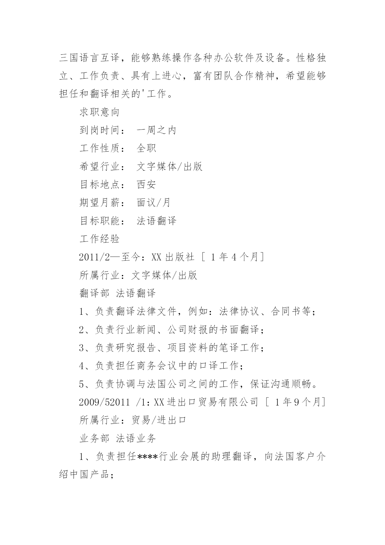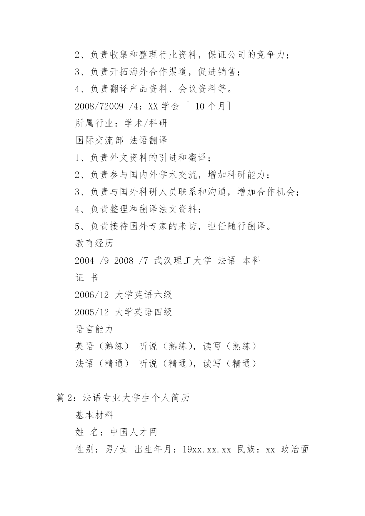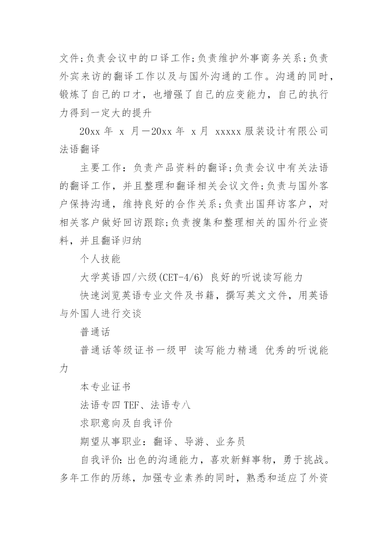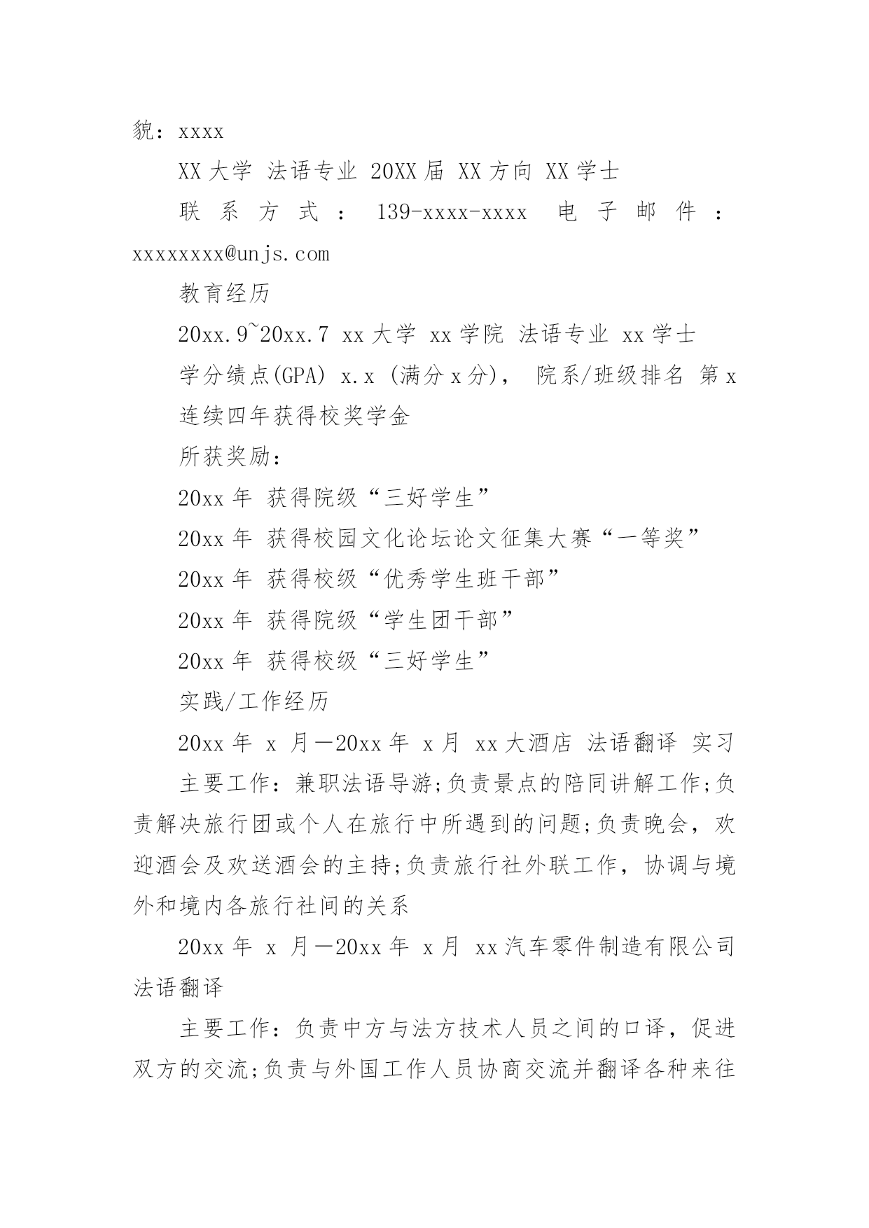 法语专业个人简历 【导语】“sz23546615”通过精心收集,向本站投稿了16篇法语专业个人简历,下面就是小编给大家带来的法语专业个人简历,希望大家喜欢,可以帮助到有需要的朋友!篇1:法语专业个人简历李琴三年以上工作经验|女|25岁(1986年1月14日)居住地:西安电话:138********(手机)Email:liqin@最近工作[1年4个月]公司:XX出版社行业:文字媒体/出版职位:法语翻译最高学历学历:本科专业:法语学校:武汉理工大学自我评价本人在多行业多领域工作数年,法语流利,英语能力较好,在口译和笔译方面积累了丰富的经验,能够胜任中英法三国语言互译,能够熟练操作各种办公软件及设备。性格独立、工作负责、具有上进心,富有团队合作精神,希望能够担任和翻译相关的'工作。求职意向到岗时间:一周之内工作性质:全职希望行业:文字媒体/出版目标地点:西安期望月薪:面议/月目标职能:法语翻译工作经验2011/2—至今:XX出版社[1年4个月]所属行业:文字媒体/出版翻译部法语翻译1、负责翻译法律文件,例如:法律协议、合同书等;2、负责行业新闻、公司财报的书面翻译;3、负责研究报告、项目资料的笔译工作;4、负责担任商务会议中的口译工作;5、负责协调与法国公司之间的工作,保证沟通顺畅。2009/52011/1:XX进出口贸易有限公司[1年9个月]所属行业:贸易/进出口业务部法语业务1、负责担任****行业会展的助理翻译,向法国客户介绍中国产品;2、负责收集和整理行业资料,保证公司的竞争力;3、负责开拓海外合作渠道,促进销售;4、负责翻译产品资料、会议资料等。2008/72009/4:XX学会[10个月]所属行业:学术/科研国际交流部法语翻译1、负责外文资料的引进和翻译;2、负责参与国内外学术交流,增加科研能力;3、负责与国外科研人员联系和沟通,增加合作机会;4、负责整理和翻译法文资料;5、负责接待国外专家的来访,担任随行翻译。教育经历2004/92008/7武汉理工大学法语本科证书2006/12大学英语六级2005/12大学英语四级语言能力英语(熟练)听说(熟练),读写(熟练)法语(精通)听说(精通),读写(精通)篇2:法语专业大学生个人简历基本材料姓名:中国人才网性别:男/女出生年月:19xx.xx.xx民族:xx政治面貌:xxxxXX大学法语专业20XX届XX方向XX学士联系方式:139-xxxx-xxxx电子邮件:xxxxxxxx@unjs.com教育经历20xx.9~20xx.7xx大学xx学院法语专业xx学士学分绩点(GPA)x.x(满分x分),院系/班级排名第x连续四年获得校奖学金所获奖励:20xx年获得院级“三好学生”20xx年获得校园文化论坛论文征集大赛“一等奖”20xx年获得校级“优秀学生班干部”20xx年获得院级“学生团干部”20xx年获得校级“三好学生”实践/工作经历20xx年x月―20xx年x月xx大酒店法语翻译实习主要工作:兼职法语导游;负责景点的陪同讲解工作;负责解决旅行团或个人在旅行中所遇到的问题;负责晚会,欢迎酒会及欢送酒会的主持;负责旅行社外联工作,协调与境外和境内各旅行社间的关系20xx年x月―20xx年x月xx汽车零件制造有限公司法语翻译主要工作:负责中方与法方技术人员之间的口译,促进双方的交流;负责与外国工作人员协商交流并翻译各种来往文件;负责会议中的口译工作;负责维护外事商务关系;负责外宾来访的翻译工作以及与国外沟通的工作。沟通的同时,锻炼了自己的口才,也增强了自己的应变能力,自己的执行力得到一定大的提升20xx年x月―20xx年x月xxxxx服装设计有限公司法语翻译主要工作:负责产品资料的翻译;负责会议中有关法语的翻译工作,并且整理和翻译相关会议文件;负责与国外客户保持沟通,维持良好的合作关系;负责出国拜访客户,对相关客户做好回访跟踪;负责搜集和整理相关的国外行业资料,并且翻译归纳个人技能大学英语四/六级(CET-4/6)良好的听说读写能力快速浏览英语专业文件及书籍,撰写英文文件,用英语与外国人进行交谈普通话普通话等级证书一级甲读写能力精通优秀的听说能力本专业证书法语专四TEF、法语专八求职意向及自我评价期望从事职业:翻译、导游、业务员自我评价:出色的沟通能力,喜欢新鲜事物,勇于挑战。多年工作的历练,加强专业素养的同时,熟悉和适应了外资企业的工作模式。能够翻译大量的专业技术资料,多年与法国人共事的经历,锻炼了自己的日常沟通和交流的能力,希望自己能够学有所用。篇3:法语专业应届大专毕业生个人简历姓名YJBYS性别女照片政治面貌团员民族汉出生年月1990.05健康状况良好国籍中国身高170CM现所在地XX专业法语毕业院校XX职业技术学院电子邮箱yjbys@126.com联系电话XXXXXXXX