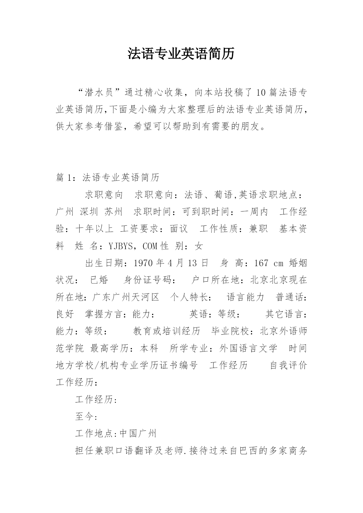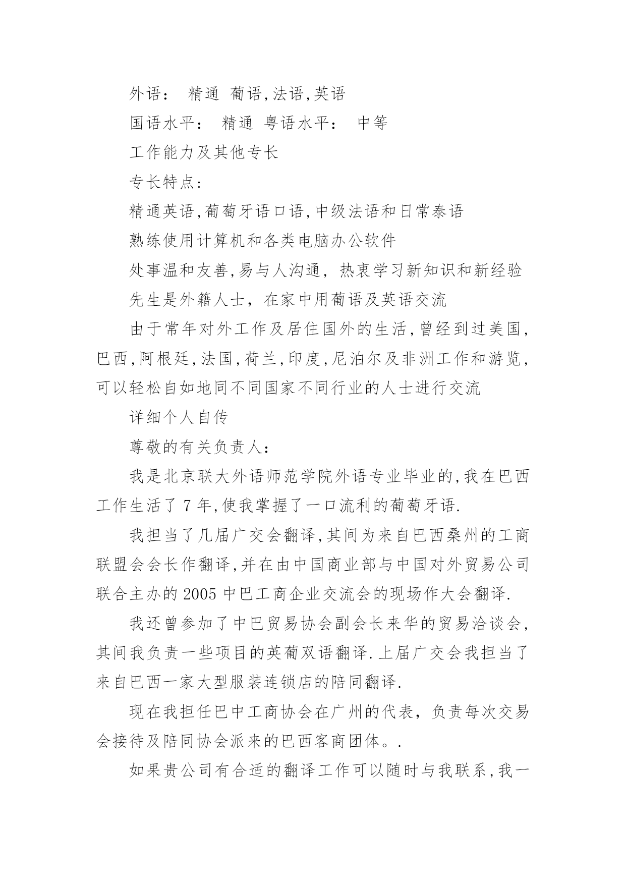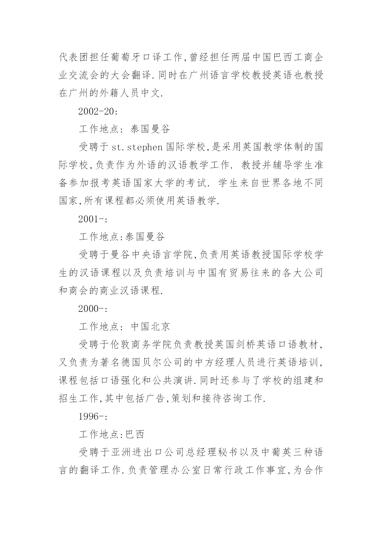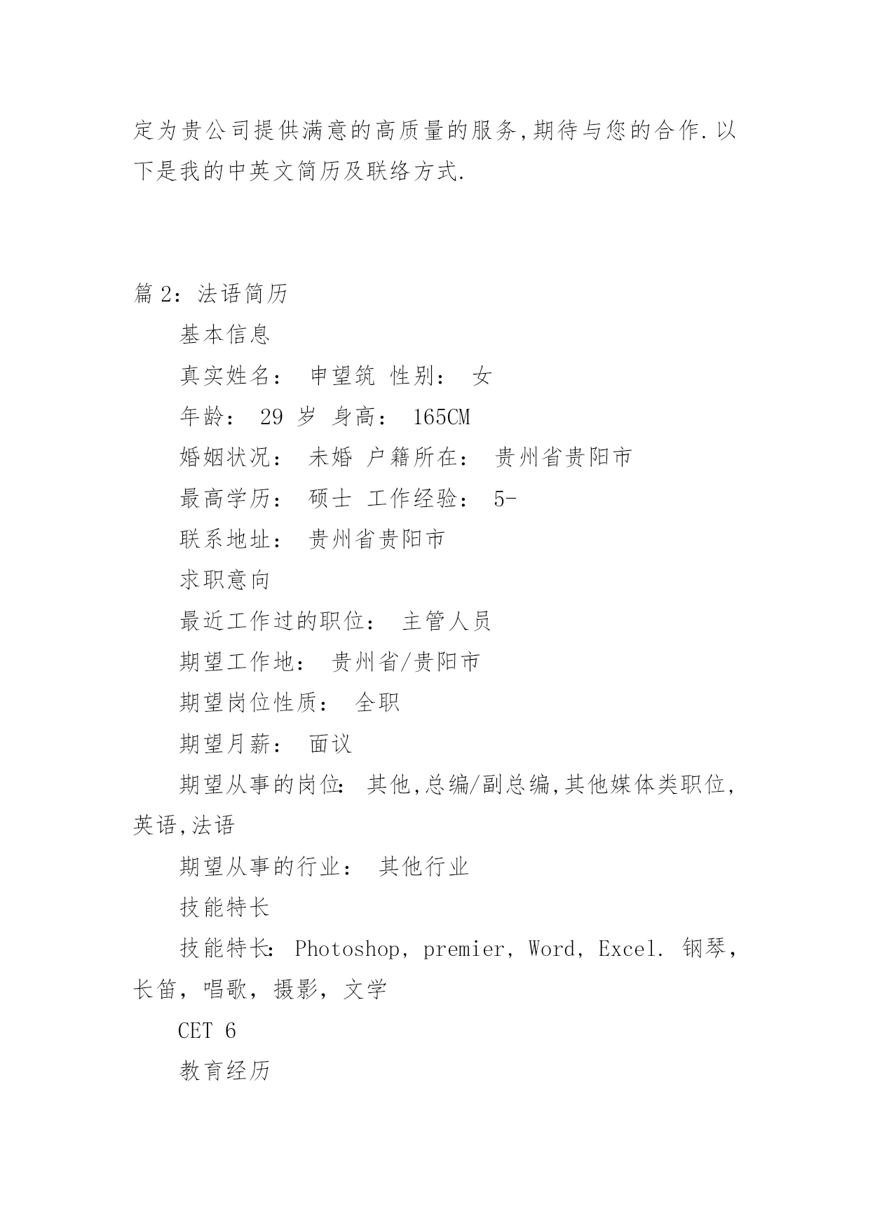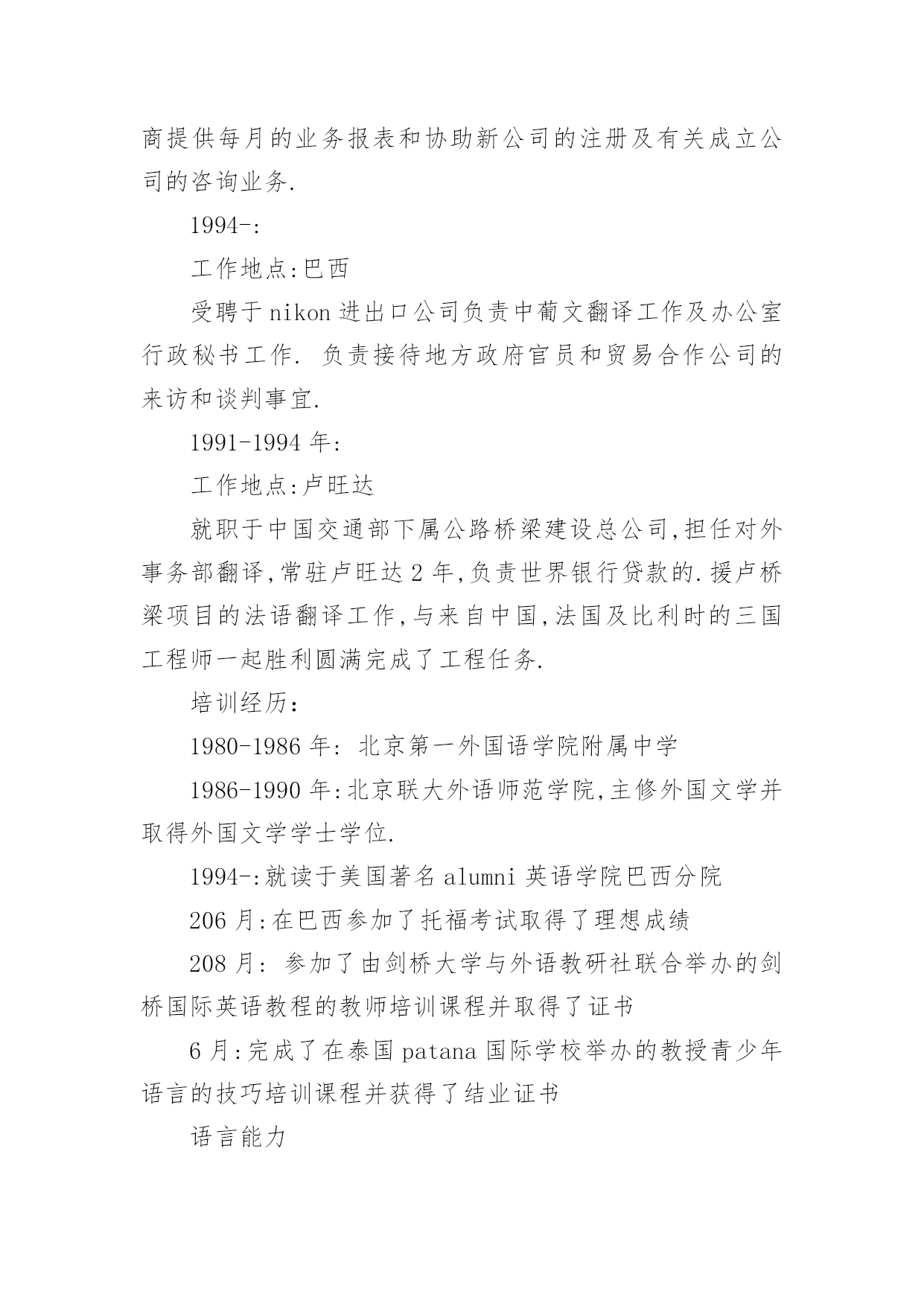 法语专业英语简历 “潜水员”通过精心收集,向本站投稿了10篇法语专业英语简历,下面是小编为大家整理后的法语专业英语简历,供大家参考借鉴,希望可以帮助到有需要的朋友。篇1:法语专业英语简历求职意向求职意向:法语、葡语,英语求职地点:广州深圳苏州求职时间:可到职时间:一周内工作经验:十年以上工资要求:面议工作性质:兼职基本资料姓名:YJBYS,COM性别:女出生日期:1970年4月13日身高:167cm婚姻状况:已婚身份证号码:户口所在地:北京北京现在所在地:广东广州天河区个人特长:语言能力普通话:良好掌握方言:能力:英语:等级:其它语言:能力:等级:教育或培训经历毕业院校:北京外语师范学院最高学历:本科所学专业:外国语言文学时间地方学校/机构专业学历证书编号工作经历自我评价工作经历:工作经历:至今:工作地点:中国广州担任兼职口语翻译及老师.接待过来自巴西的多家商务代表团担任葡萄牙口译工作,曾经担任两届中国巴西工商企业交流会的大会翻译.同时在广州语言学校教授英语也教授在广州的外籍人员中文.2002-20:工作地点:泰国曼谷受聘于st.stephen国际学校,是采用英国教学体制的国际学校,负责作为外语的汉语教学工作.教授并辅导学生准备参加报考英语国家大学的考试.学生来自世界各地不同国家,所有课程都必须使用英语教学.2001-:工作地点:泰国曼谷受聘于曼谷中央语言学院,负责用英语教授国际学校学生的汉语课程以及负责培训与中国有贸易往来的各大公司和商会的商业汉语课程.2000-:工作地点:中国北京受聘于伦敦商务学院负责教授英国剑桥英语口语教材,又负责为著名德国贝尔公司的中方经理人员进行英语培训,课程包括口语强化和公共演讲.同时还参与了学校的组建和招生工作,其中包括广告,策划和接待咨询工作.1996-:工作地点:巴西受聘于亚洲进出口公司总经理秘书以及中葡英三种语言的翻译工作.负责管理办公室日常行政工作事宜,为合作商提供每月的业务报表和协助新公司的注册及有关成立公司的咨询业务.1994-:工作地点:巴西受聘于nikon进出口公司负责中葡文翻译工作及办公室行政秘书工作.负责接待地方政府官员和贸易合作公司的来访和谈判事宜.1991-1994年:工作地点:卢旺达就职于中国交通部下属公路桥梁建设总公司,担任对外事务部翻译,常驻卢旺达2年,负责世界银行贷款的.援卢桥梁项目的法语翻译工作,与来自中国,法国及比利时的三国工程师一起胜利圆满完成了工程任务.培训经历:1980-1986年:北京第一外国语学院附属中学1986-1990年:北京联大外语师范学院,主修外国文学并取得外国文学学士学位.1994-:就读于美国著名alumni英语学院巴西分院206月:在巴西参加了托福考试取得了理想成绩208月:参加了由剑桥大学与外语教研社联合举办的剑桥国际英语教程的教师培训课程并取得了证书6月:完成了在泰国patana国际学校举办的教授青少年语言的技巧培训课程并获得了结业证书语言能力外语:精通葡语,法语,英语国语水平:精通粤语水平:中等工作能力及其他专长专长特点:精通英语,葡萄牙语口语,中级法语和日常泰语熟练使用计算机和各类电脑办公软件处事温和友善,易与人沟通,热衷学习新知识和新经验先生是外籍人士,在家中用葡语及英语交流由于常年对外工作及居住国外的生活,曾经到过美国,巴西,阿根廷,法国,荷兰,印度,尼泊尔及非洲工作和游览,可以轻松自如地同不同国家不同行业的人士进行交流详细个人自传尊敬的有关负责人:我是北京联大外语师范学院外语专业毕业的,我在巴西工作生活了7年,使我掌握了一口流利的葡萄牙语.我担当了几届广交会翻译,其间为来自巴西桑州的工商联盟会会长作翻译,并在由中国商业部与中国对外贸易公司联合主办的2005中巴工商企业交流会的现场作大会翻译.我还曾参加了中巴贸易协会副会长来华的贸易洽谈会,其间我负责一些项目的英葡双语翻译.上届广交会我担当了来自巴西一家大型服装连锁店的陪同翻译.现在我担任巴中工商协会在广州的代表,负责每次交易会接待及陪同协会派来的巴西客商团体。.如果贵公司有合适的翻译工作可以随时与我联系,我一定为贵公司提供满意的高质量的服务,期待与您的合作.以下是我的中英文简历及联络方式.篇2:法语简历基本信息真实姓名:申望筑性别:女年龄:29岁身高:165CM婚姻状况:未婚户籍所在:贵州省贵阳市最高学历:硕士工作经验:5-联系地址:贵州省贵阳市求职意向最近工作过的职位:主管人员期望工作地:贵州省/贵阳市期望岗位性质:全职期望月薪:面议期望从事的岗位:其他,总编/副总编,其他媒体类职位,英语,法语期望从事的行业:其他行业技能特长技能特长:Photoshop,premier,Word,Excel.钢琴,长笛,唱歌,摄影,文学CET6教育经历贵州师大附中(高中)起止年月:20