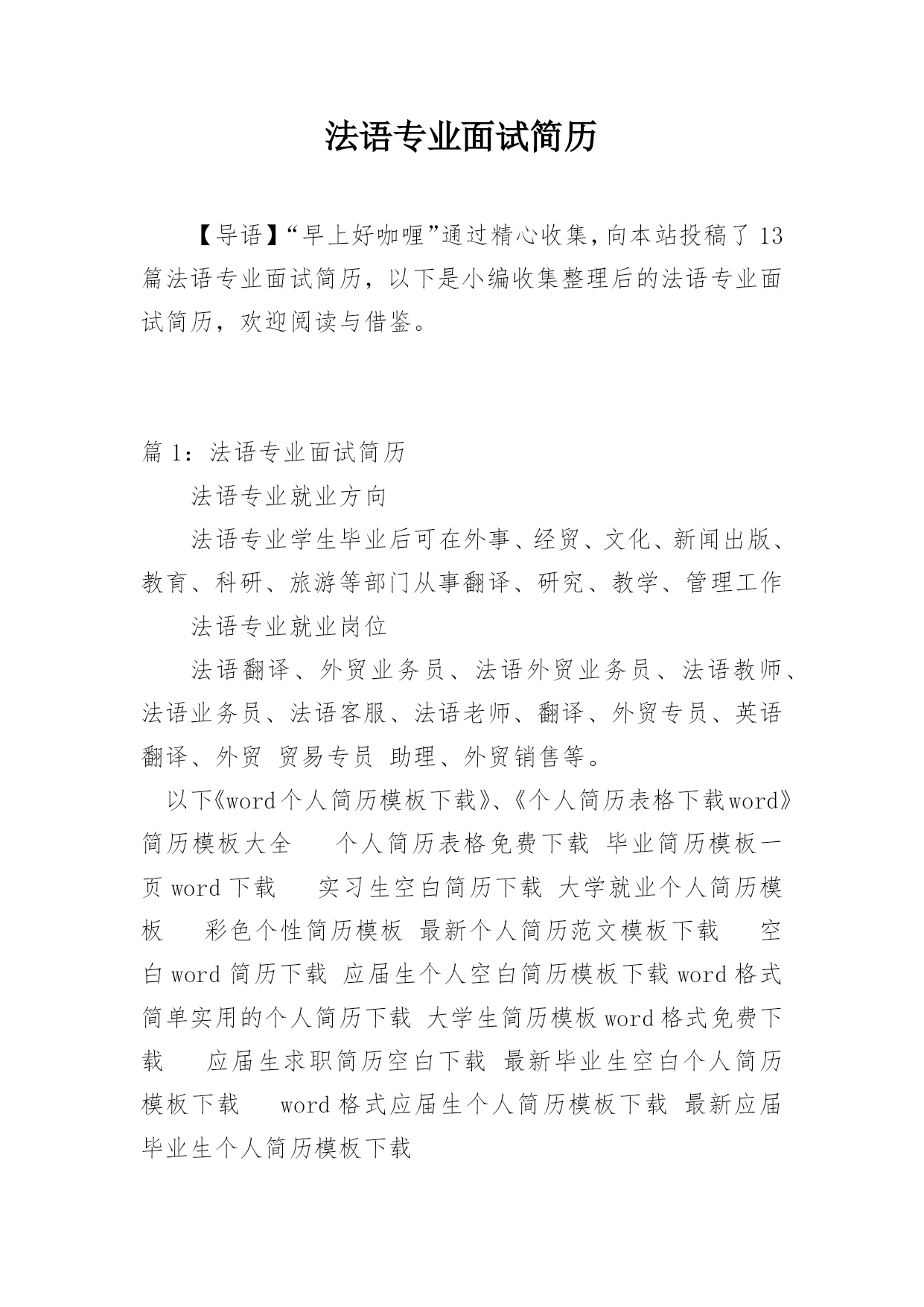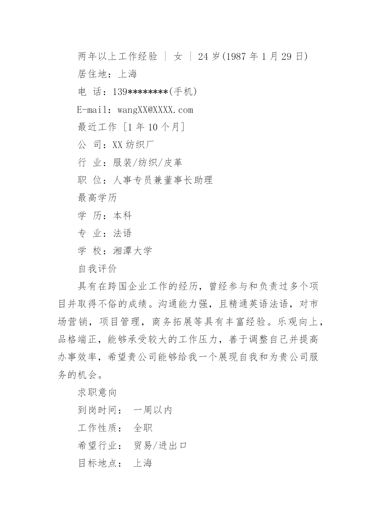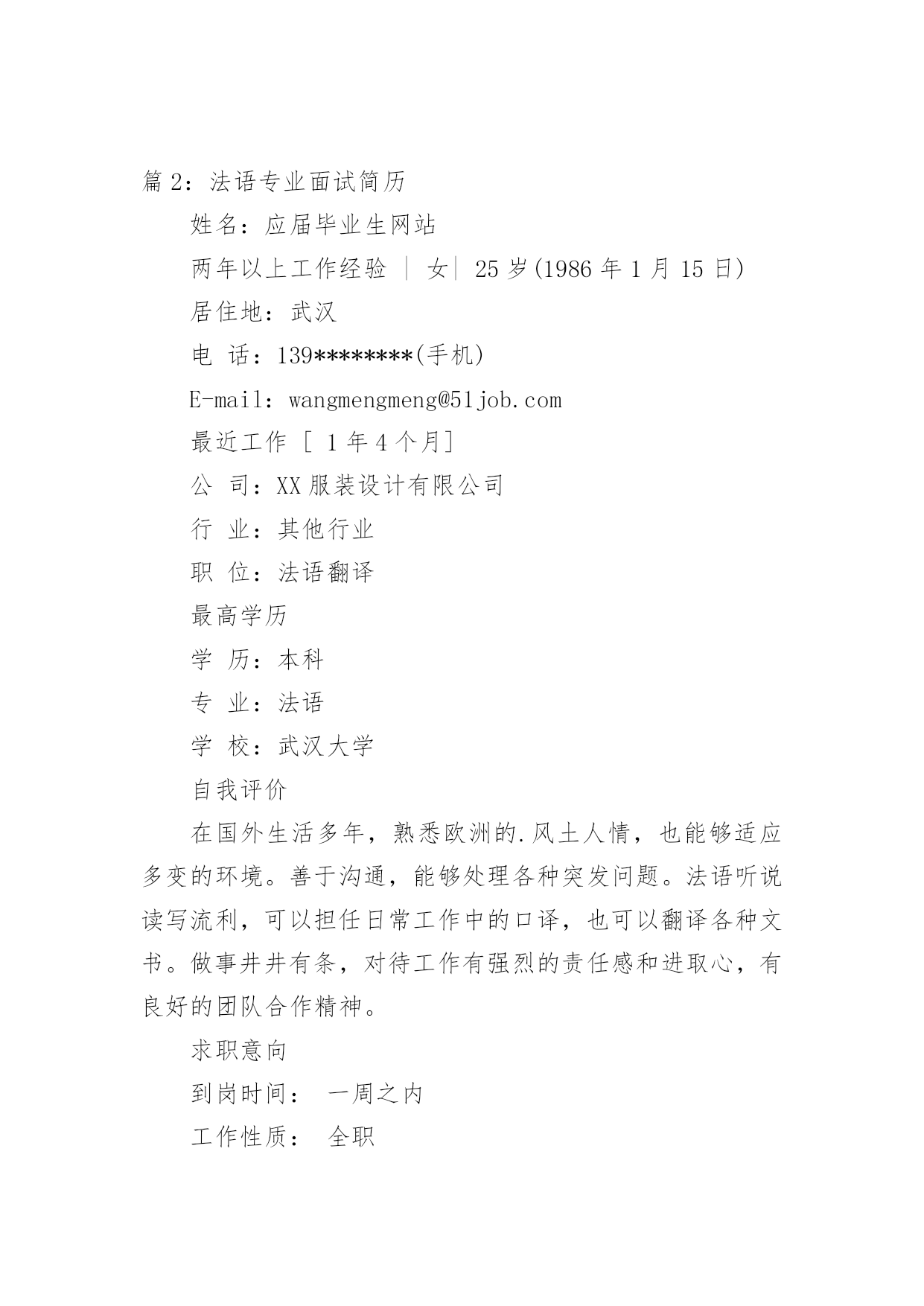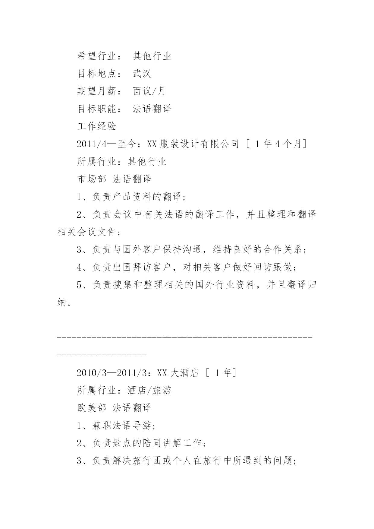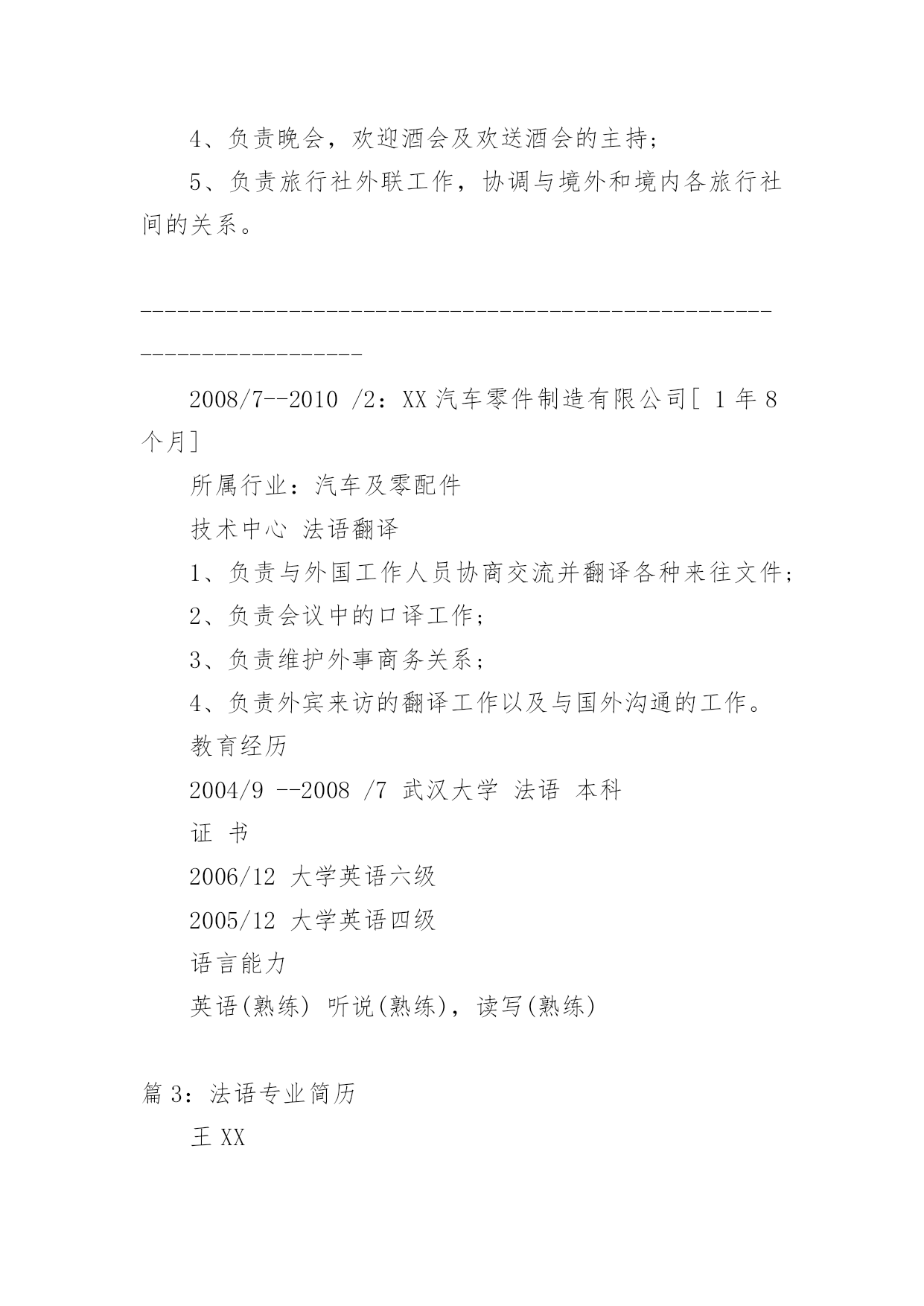 法语专业面试简历 【导语】“早上好咖喱”通过精心收集,向本站投稿了13篇法语专业面试简历,以下是小编收集整理后的法语专业面试简历,欢迎阅读与借鉴。篇1:法语专业面试简历法语专业就业方向法语专业学生毕业后可在外事、经贸、文化、新闻出版、教育、科研、旅游等部门从事翻译、研究、教学、管理工作法语专业就业岗位法语翻译、外贸业务员、法语外贸业务员、法语教师、法语业务员、法语客服、法语老师、翻译、外贸专员、英语翻译、外贸贸易专员助理、外贸销售等。以下《word个人简历模板下载》、《个人简历表格下载word》简历模板大全个人简历表格免费下载毕业简历模板一页word下载实习生空白简历下载大学就业个人简历模板彩色个性简历模板最新个人简历范文模板下载空白word简历下载应届生个人空白简历模板下载word格式简单实用的个人简历下载大学生简历模板word格式免费下载应届生求职简历空白下载最新毕业生空白个人简历模板下载word格式应届生个人简历模板下载最新应届毕业生个人简历模板下载篇2:法语专业面试简历姓名:应届毕业生网站两年以上工作经验|女|25岁(1986年1月15日)居住地:武汉电话:139********(手机)E-mail:wangmengmeng@51job.com最近工作[1年4个月]公司:XX服装设计有限公司行业:其他行业职位:法语翻译最高学历学历:本科专业:法语学校:武汉大学自我评价在国外生活多年,熟悉欧洲的.风土人情,也能够适应多变的环境。善于沟通,能够处理各种突发问题。法语听说读写流利,可以担任日常工作中的口译,也可以翻译各种文书。做事井井有条,对待工作有强烈的责任感和进取心,有良好的团队合作精神。求职意向到岗时间:一周之内工作性质:全职希望行业:其他行业目标地点:武汉期望月薪:面议/月目标职能:法语翻译工作经验2011/4—至今:XX服装设计有限公司[1年4个月]所属行业:其他行业市场部法语翻译1、负责产品资料的翻译;2、负责会议中有关法语的翻译工作,并且整理和翻译相关会议文件;3、负责与国外客户保持沟通,维持良好的合作关系;4、负责出国拜访客户,对相关客户做好回访跟做;5、负责搜集和整理相关的国外行业资料,并且翻译归纳。---------------------------------------------------------------------2010/3—2011/3:XX大酒店[1年]所属行业:酒店/旅游欧美部法语翻译1、兼职法语导游;2、负责景点的陪同讲解工作;3、负责解决旅行团或个人在旅行中所遇到的问题;4、负责晚会,欢迎酒会及欢送酒会的主持;5、负责旅行社外联工作,协调与境外和境内各旅行社间的关系。---------------------------------------------------------------------2008/7--2010/2:XX汽车零件制造有限公司[1年8个月]所属行业:汽车及零配件技术中心法语翻译1、负责与外国工作人员协商交流并翻译各种来往文件;2、负责会议中的口译工作;3、负责维护外事商务关系;4、负责外宾来访的翻译工作以及与国外沟通的工作。教育经历2004/9--2008/7武汉大学法语本科证书2006/12大学英语六级2005/12大学英语四级语言能力英语(熟练)听说(熟练),读写(熟练)篇3:法语专业简历王XX两年以上工作经验|女|24岁(1987年1月29日)居住地:上海电话:139********(手机)E-mail:wangXX@XXXX.com最近工作[1年10个月]公司:XX纺织厂行业:服装/纺织/皮革职位:人事专员兼董事长助理最高学历学历:本科专业:法语学校:湘潭大学自我评价具有在跨国企业工作的经历,曾经参与和负责过多个项目并取得不俗的成绩。沟通能力强,且精通英语法语,对市场营销,项目管理,商务拓展等具有丰富经验。乐观向上,品格端正,能够承受较大的工作压力,善于调整自己并提高办事效率,希望贵公司能够给我一个展现自我和为贵公司服务的机会。求职意向到岗时间:一周以内工作性质:全职希望行业:贸易/进出口目标地点:上海期望月薪:面议/月目标职能:法语翻译工作经验20XX/8―至今:XX纺织厂[1年10个月]所属行业:服装/纺织/皮革人力资源人事专员兼董事长助理1、负责为外籍工作人员办理入境所需资料;2、负责与法国总部联系有关上海代表处的相关事宜;3、负责为董事长安排日常行程;4、负责翻译会议纪要;5、负责协助董事长整理相关外文文件;6、负责帮助董事长处理紧急事务。20XX/7―20XX/7:XX贸易有限公司[1年]所属行业:贸易/进出口总务部行政助理兼业务拓展1、负责公司会议、差旅路线、酒店、机票的安排及预定;2、负责新员工入职培训以及培训材料的更新