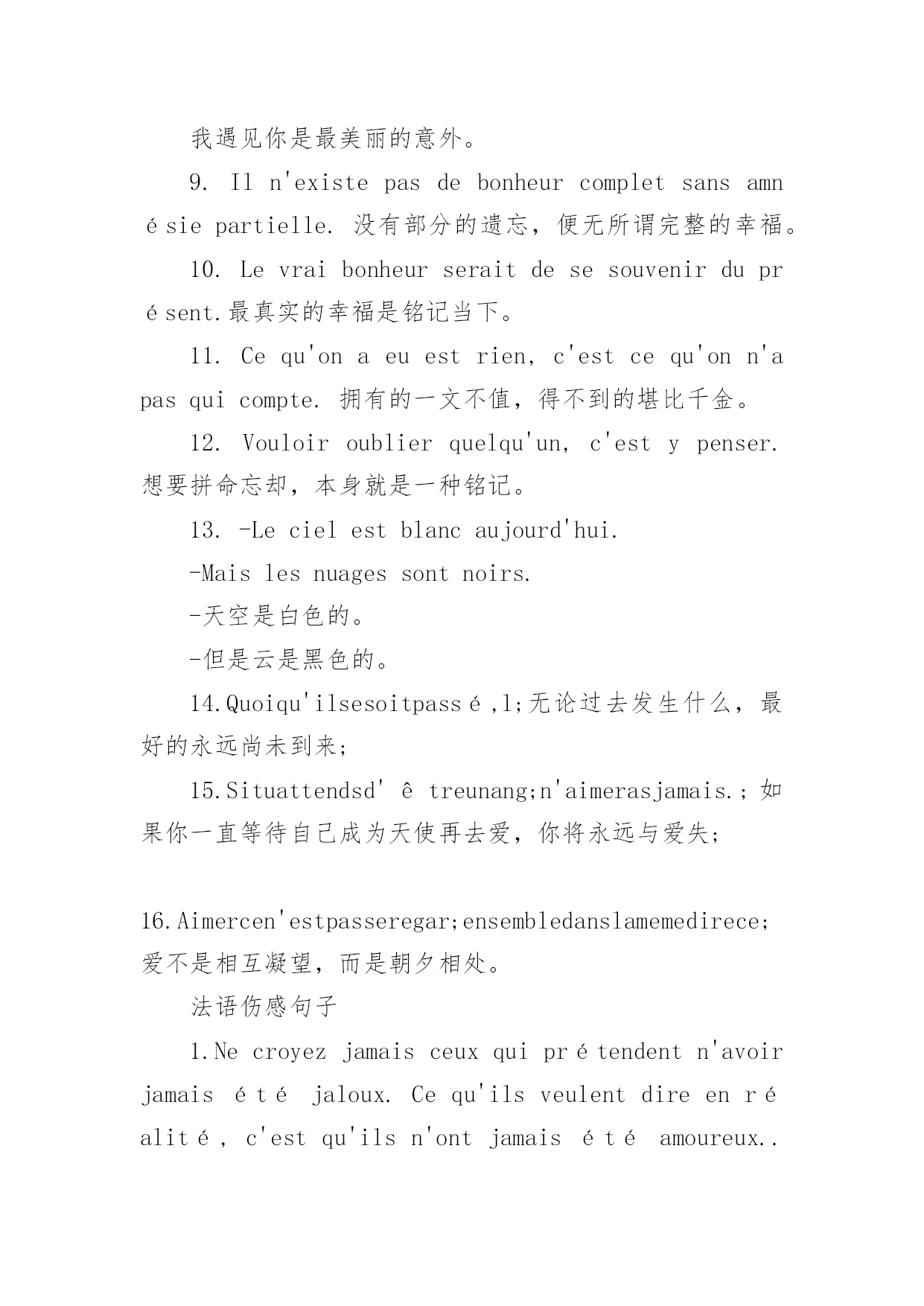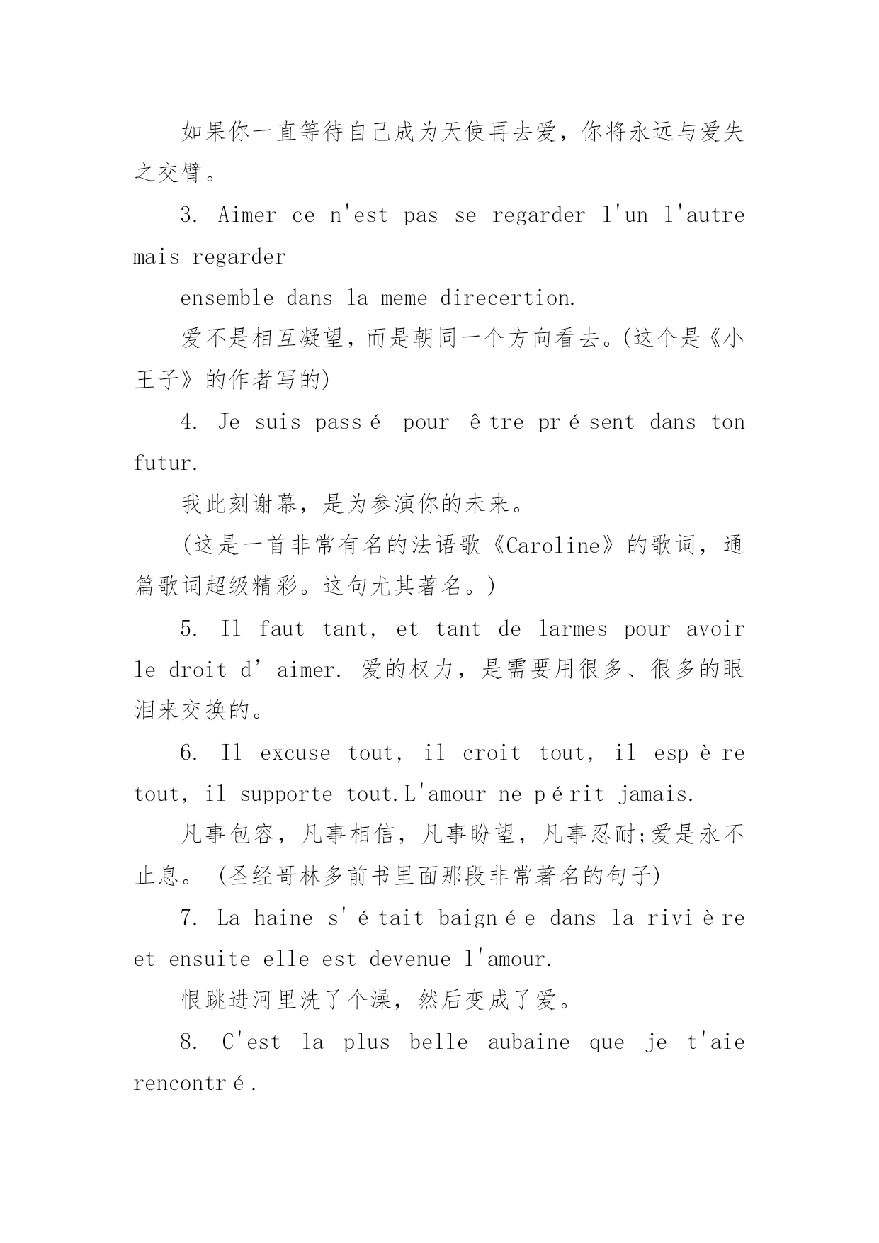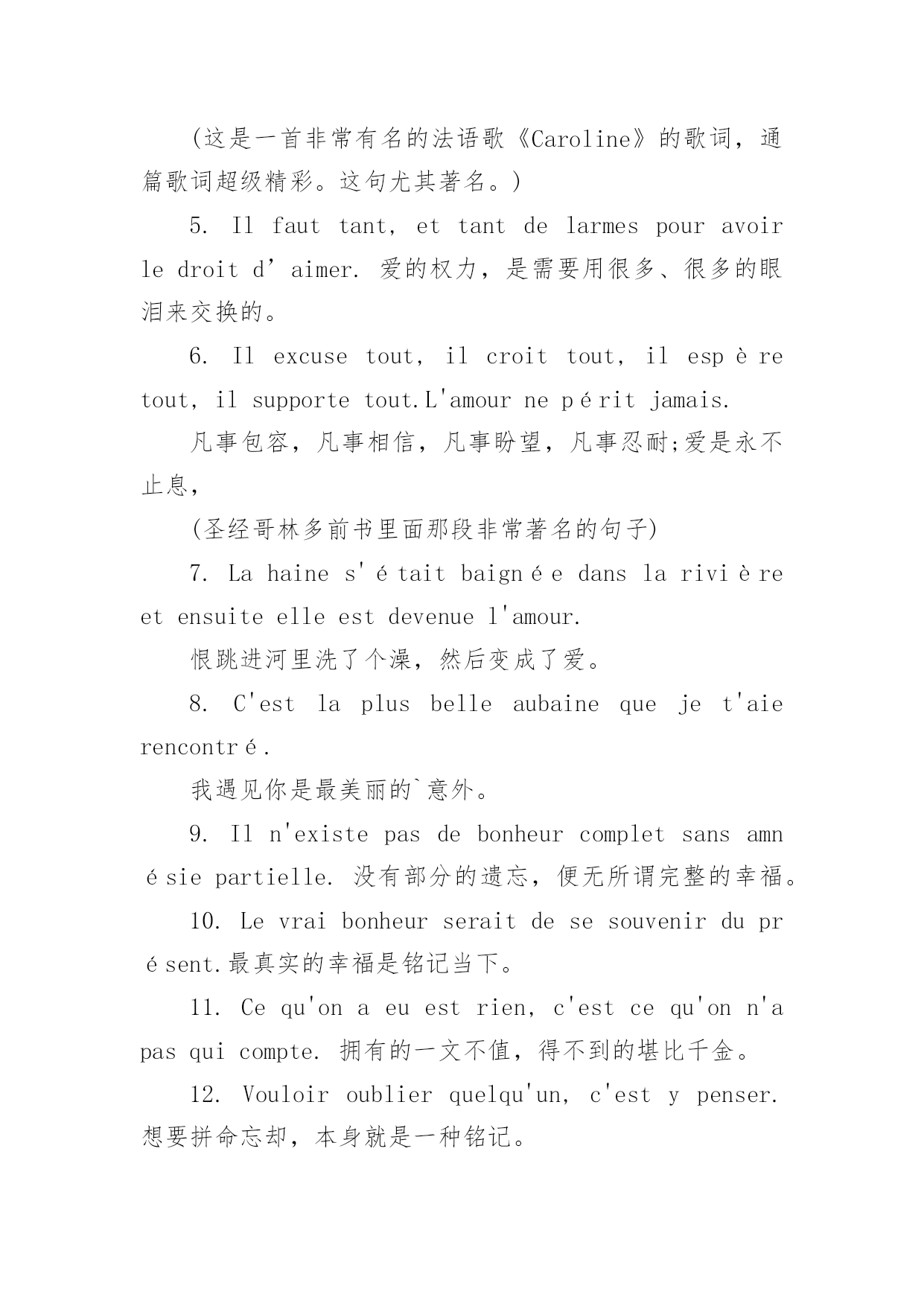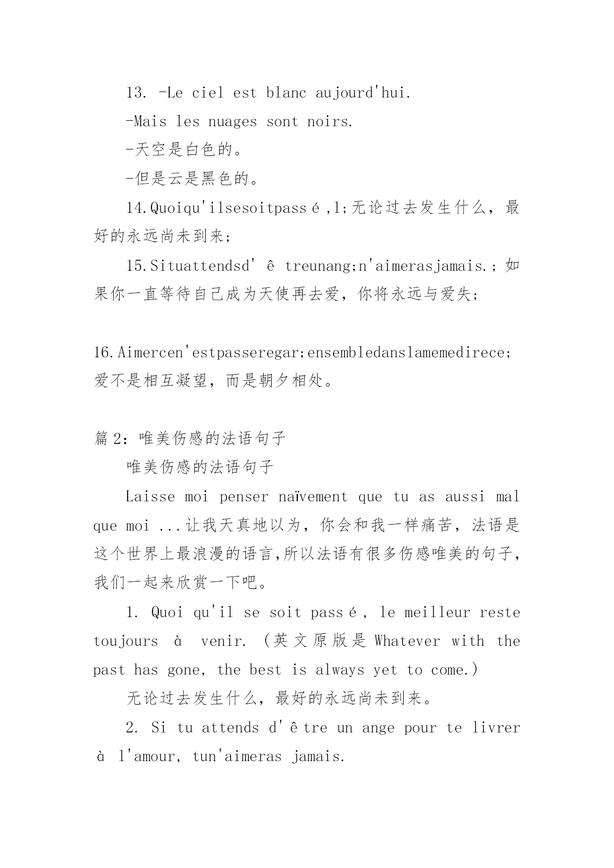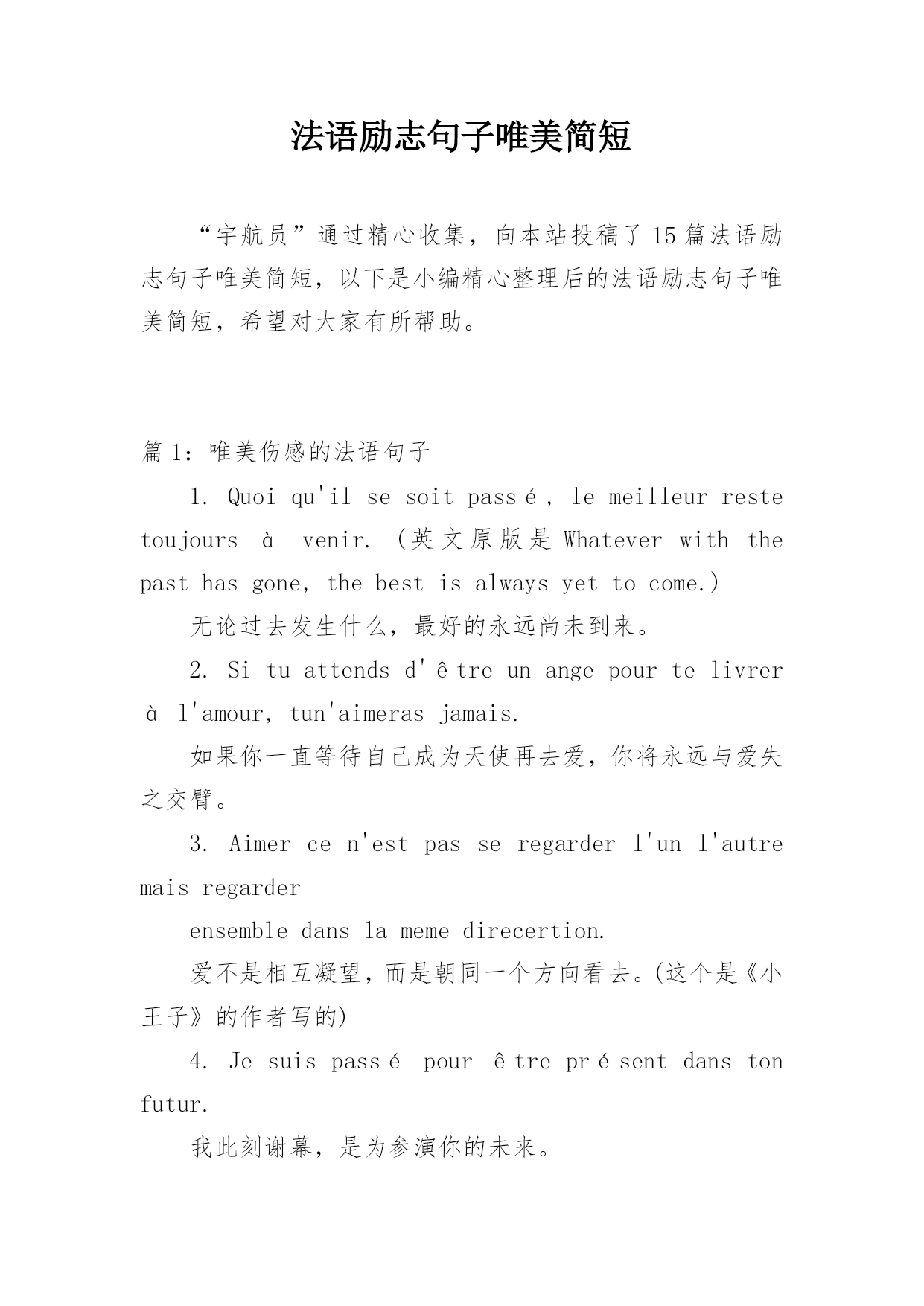 法语励志句子唯美简短 “宇航员”通过精心收集,向本站投稿了15篇法语励志句子唯美简短,以下是小编精心整理后的法语励志句子唯美简短,希望对大家有所帮助。篇1:唯美伤感的法语句子1.Quoiqu'ilsesoitpassé,lemeilleurrestetoujoursàvenir.(英文原版是Whateverwiththepasthasgone,thebestisalwaysyettocome.)无论过去发生什么,最好的永远尚未到来。2.Situattendsd'êtreunangepourtelivreràl'amour,tun'aimerasjamais.如果你一直等待自己成为天使再去爱,你将永远与爱失之交臂。3.Aimercen'estpasseregarderl'unl'autremaisregarderensembledanslamemedirecertion.爱不是相互凝望,而是朝同一个方向看去。(这个是《小王子》的作者写的)4.Jesuispassépourêtreprésentdanstonfutur.我此刻谢幕,是为参演你的未来。(这是一首非常有名的法语歌《Caroline》的歌词,通篇歌词超级精彩。这句尤其著名。)5.Ilfauttant,ettantdelarmespouravoirledroitd’aimer.爱的权力,是需要用很多、很多的眼泪来交换的。6.Ilexcusetout,ilcroittout,ilespèretout,ilsupportetout.L'amournepéritjamais.凡事包容,凡事相信,凡事盼望,凡事忍耐;爱是永不止息,(圣经哥林多前书里面那段非常著名的句子)7.Lahaines'étaitbaignéedanslarivièreetensuiteelleestdevenuel'amour.恨跳进河里洗了个澡,然后变成了爱。8.C'estlaplusbelleaubainequejet'aierencontré.我遇见你是最美丽的`意外。9.Iln'existepasdebonheurcompletsansamnésiepartielle.没有部分的遗忘,便无所谓完整的幸福。10.Levraibonheurseraitdesesouvenirduprésent.最真实的幸福是铭记当下。11.Cequ'onaeuestrien,c'estcequ'onn'apasquicompte.拥有的一文不值,得不到的堪比千金。12.Vouloiroublierquelqu'un,c'estypenser.想要拼命忘却,本身就是一种铭记。13.-Lecielestblancaujourd'hui.-Maislesnuagessontnoirs.-天空是白色的。-但是云是黑色的。14.Quoiqu'ilsesoitpassé,l;无论过去发生什么,最好的永远尚未到来;15.Situattendsd'êtreunang;n'aimerasjamais.;如果你一直等待自己成为天使再去爱,你将永远与爱失;16.Aimercen'estpasseregar;ensembledanslamemedirece;爱不是相互凝望,而是朝夕相处。篇2:唯美伤感的法语句子唯美伤感的法语句子Laissemoipensernaïvementquetuasaussimalquemoi...让我天真地以为,你会和我一样痛苦,法语是这个世界上最浪漫的语言,所以法语有很多伤感唯美的句子,我们一起来欣赏一下吧。1.Quoiqu'ilsesoitpassé,lemeilleurrestetoujoursàvenir.(英文原版是Whateverwiththepasthasgone,thebestisalwaysyettocome.)无论过去发生什么,最好的永远尚未到来。2.Situattendsd'êtreunangepourtelivreràl'amour,tun'aimerasjamais.如果你一直等待自己成为天使再去爱,你将永远与爱失之交臂。3.Aimercen'estpasseregarderl'unl'autremaisregarderensembledanslamemedirecertion.爱不是相互凝望,而是朝同一个方向看去。(这个是《小王子》的作者写的)4.Jesuispassépourêtreprésentdanstonfutur.我此刻谢幕,是为参演你的未来。(这是一首非常有名的法语歌《Caroline》的歌词,通篇歌词超级精彩。这句尤其著名。)5.Ilfauttant,ettantdelarmespouravoirledroitd’aimer.爱的权力,是需要用很多、很多的眼泪来交换的。6.