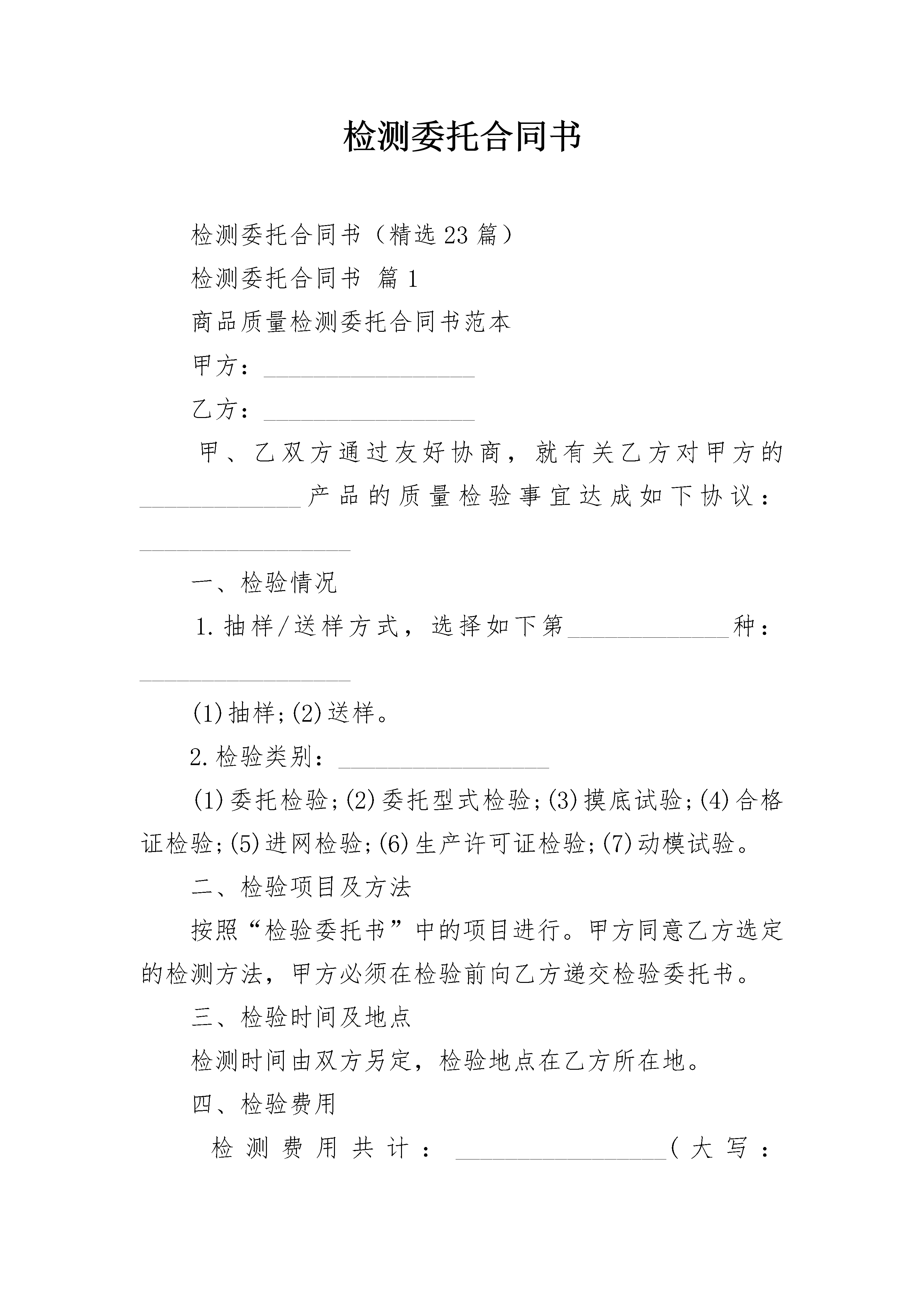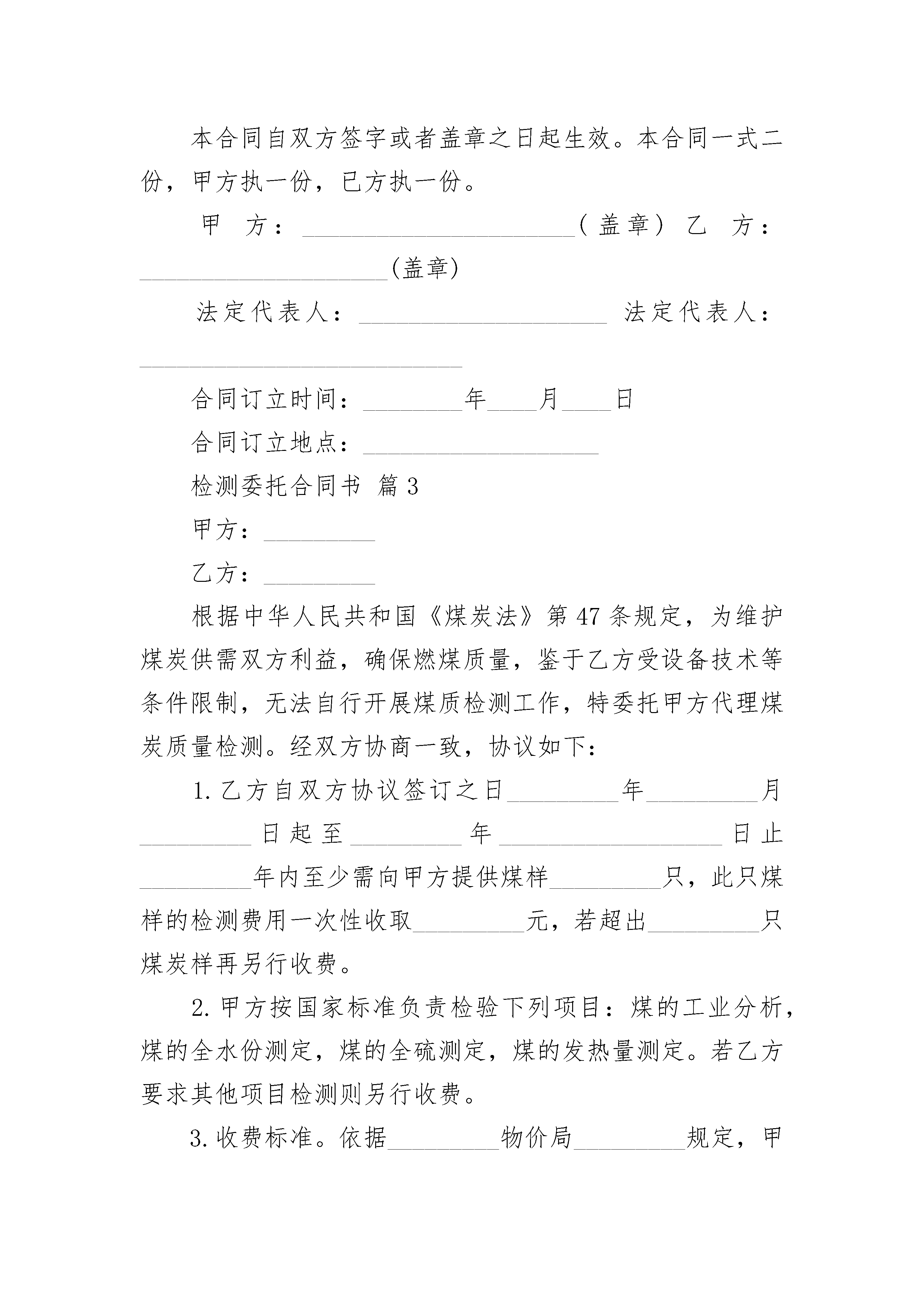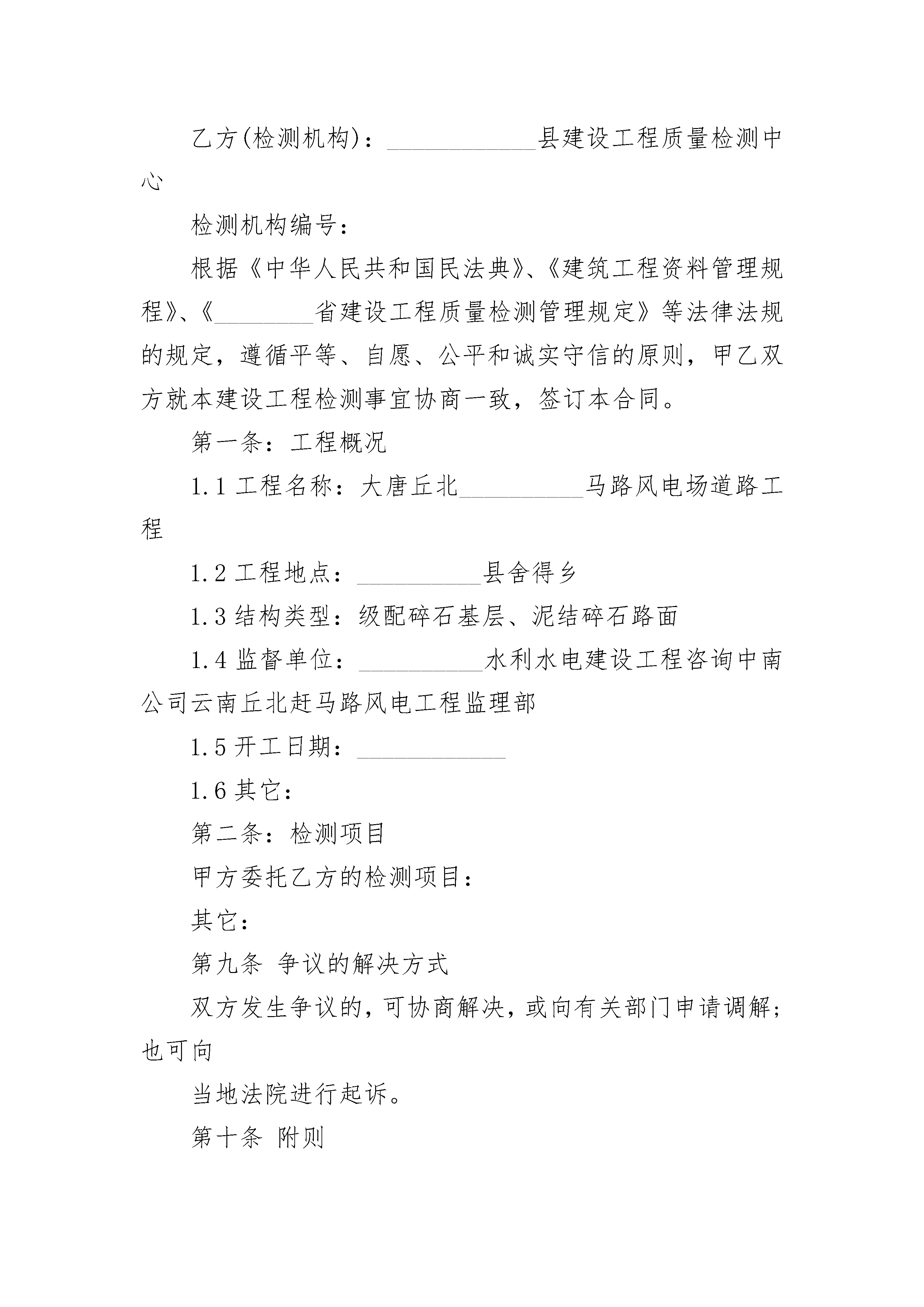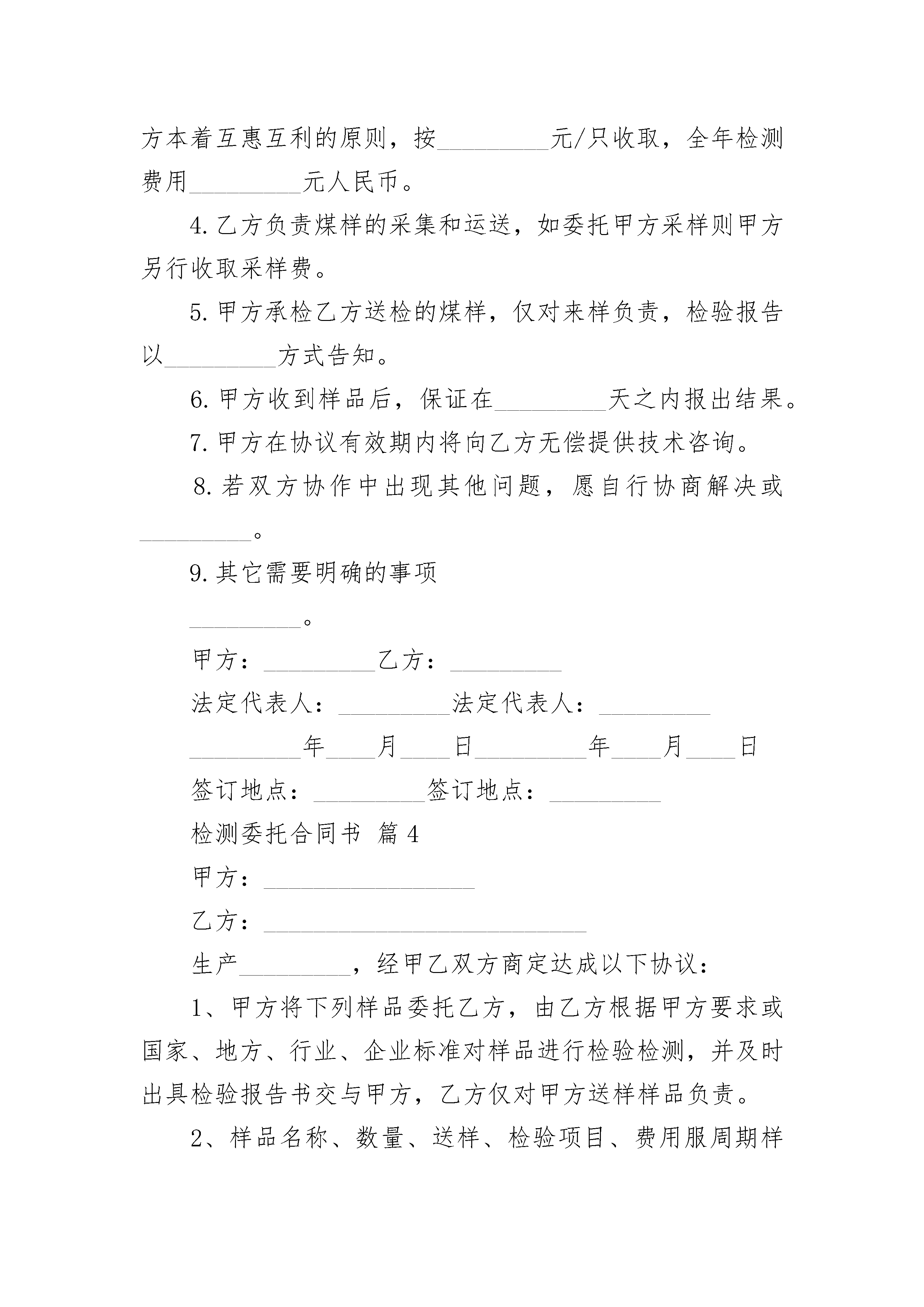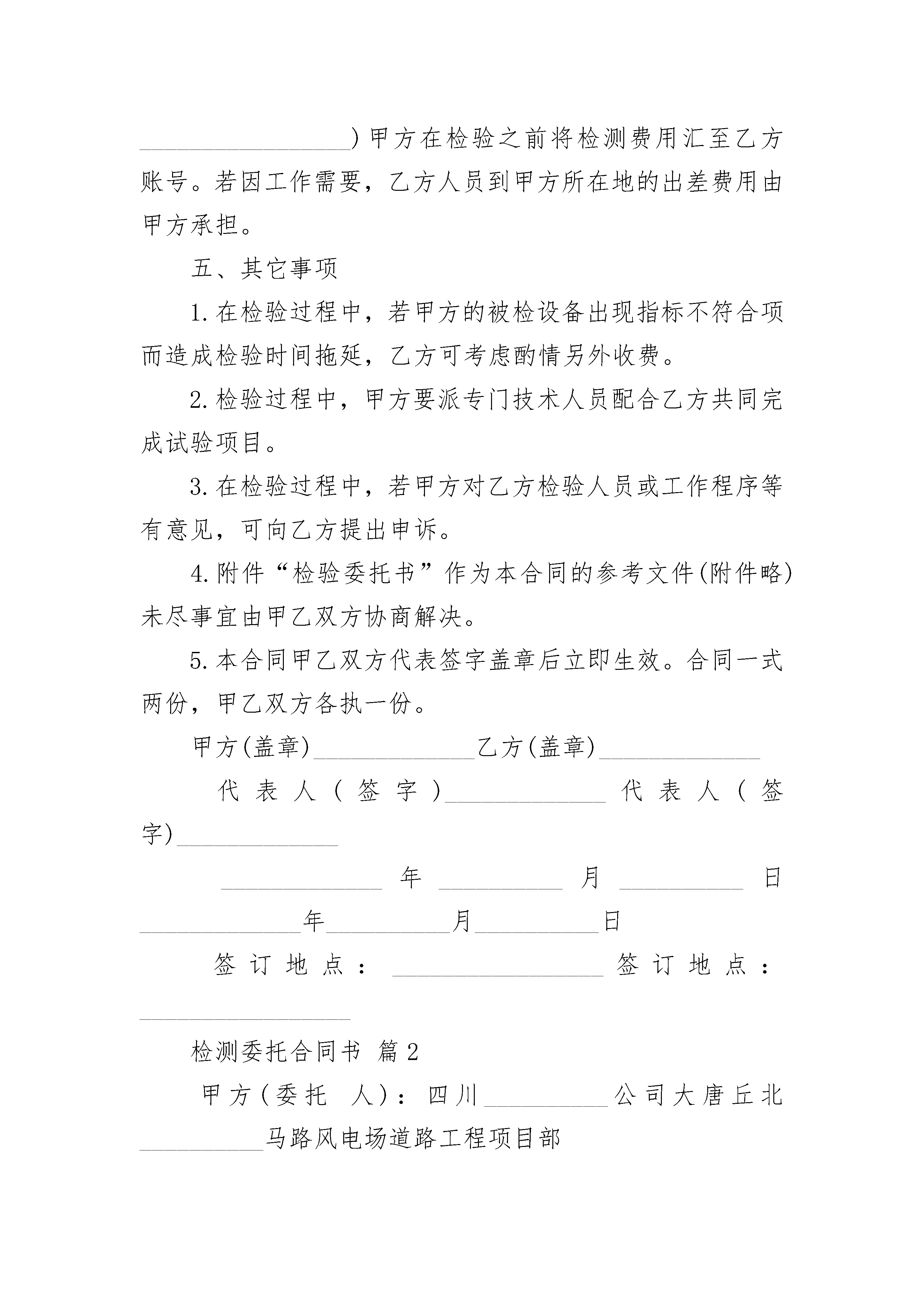 检测委托合同书检测委托合同书(精选23篇)检测委托合同书篇1商品质量检测委托合同书范本甲方:_________________乙方:_________________甲、乙双方通过友好协商,就有关乙方对甲方的_____________产品的质量检验事宜达成如下协议:_________________一、检验情况1.抽样/送样方式,选择如下第_____________种:_________________(1)抽样;(2)送样。2.检验类别:_________________(1)委托检验;(2)委托型式检验;(3)摸底试验;(4)合格证检验;(5)进网检验;(6)生产许可证检验;(7)动模试验。二、检验项目及方法按照“检验委托书”中的项目进行。甲方同意乙方选定的检测方法,甲方必须在检验前向乙方递交检验委托书。三、检验时间及地点检测时间由双方另定,检验地点在乙方所在地。四、检验费用检测费用共计:_________________(大写:_________________)甲方在检验之前将检测费用汇至乙方账号。若因工作需要,乙方人员到甲方所在地的出差费用由甲方承担。五、其它事项1.在检验过程中,若甲方的被检设备出现指标不符合项而造成检验时间拖延,乙方可考虑酌情另外收费。2.检验过程中,甲方要派专门技术人员配合乙方共同完成试验项目。3.在检验过程中,若甲方对乙方检验人员或工作程序等有意见,可向乙方提出申诉。4.附件“检验委托书”作为本合同的参考文件(附件略)未尽事宜由甲乙双方协商解决。5.本合同甲乙双方代表签字盖章后立即生效。合同一式两份,甲乙双方各执一份。甲方(盖章)_____________乙方(盖章)_____________代表人(签字)_____________代表人(签字)__________________________年__________月__________日_____________年__________月__________日签订地点:_________________签订地点:_________________检测委托合同书篇2甲方(委托人):四川__________公司大唐丘北__________马路风电场道路工程项目部乙方(检测机构):____________县建设工程质量检测中心检测机构编号:根据《中华人民共和国民法典》、《建筑工程资料管理规程》、《________省建设工程质量检测管理规定》等法律法规的规定,遵循平等、自愿、公平和诚实守信的原则,甲乙双方就本建设工程检测事宜协商一致,签订本合同。第一条:工程概况1.1工程名称:大唐丘北__________马路风电场道路工程1.2工程地点:__________县舍得乡1.3结构类型:级配碎石基层、泥结碎石路面1.4监督单位:__________水利水电建设工程咨询中南公司云南丘北赶马路风电工程监理部1.5开工日期:____________1.6其它:第二条:检测项目甲方委托乙方的检测项目:其它:第九条争议的解决方式双方发生争议的,可协商解决,或向有关部门申请调解;也可向当地法院进行起诉。第十条附则本合同自双方签字或者盖章之日起生效。本合同一式二份,甲方执一份,已方执一份。甲方:______________________(盖章)乙方:____________________(盖章)法定代表人:____________________法定代表人:__________________________合同订立时间:________年____月____日合同订立地点:___________________检测委托合同书篇3甲方:_________乙方:_________根据中华人民共和国《煤炭法》第47条规定,为维护煤炭供需双方利益,确保燃煤质量,鉴于乙方受设备技术等条件限制,无法自行开展煤质检测工作,特委托甲方代理煤炭质量检测。经双方协商一致,协议如下:1.乙方自双方协议签订之日_________年_________月_________日起至_________年__________________日止_________年内至少需向甲方提供煤样_________只,此只煤样的检测费用一次性收取_________元,若超出_________只煤炭样再另行收费。2.甲方按国家标准负责检验下列项目:煤的工业分析,煤的全水份测定,煤的全硫测定,煤的发热量测定。若乙方要求其他项目检测则另行收费。3.收费标准。依据_________物价局_________规定,甲方本着互惠互利的原则,按_________元/只收取,全年检测费用_________元人民币。4.乙方负责煤样的采集和运送,如委托甲方采样则甲方另行收取采样费。5.甲方承检乙方送检的煤样,仅对来样负责,检验