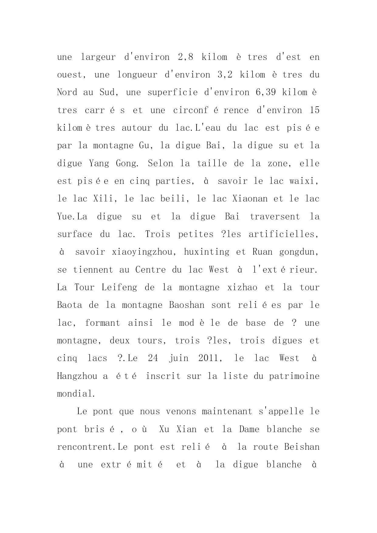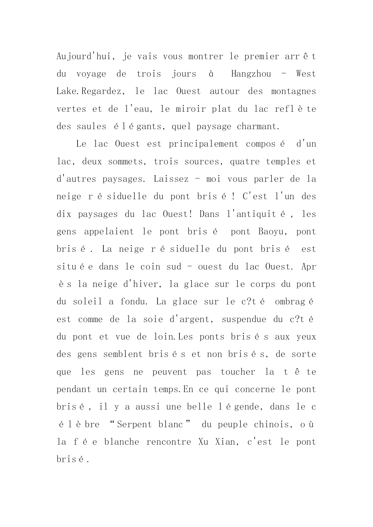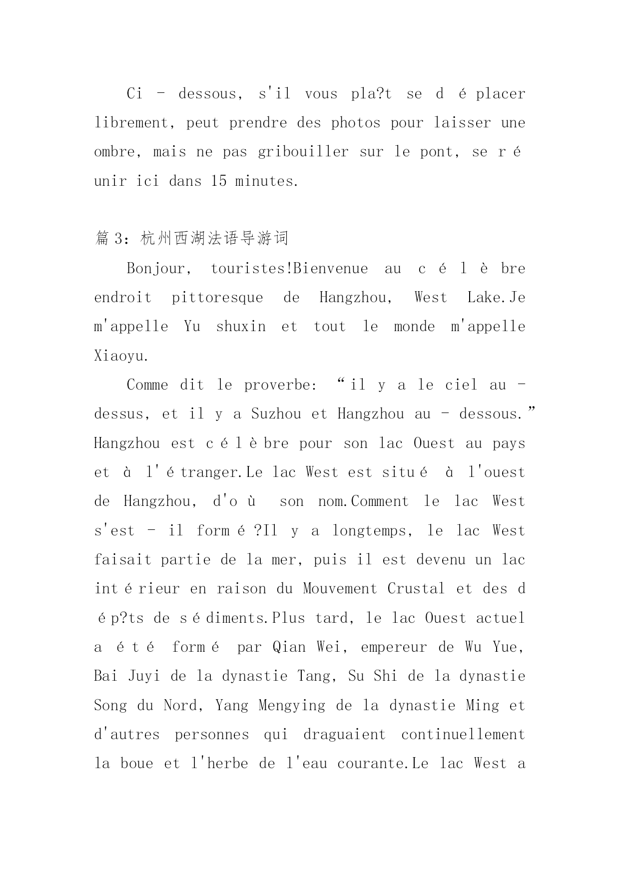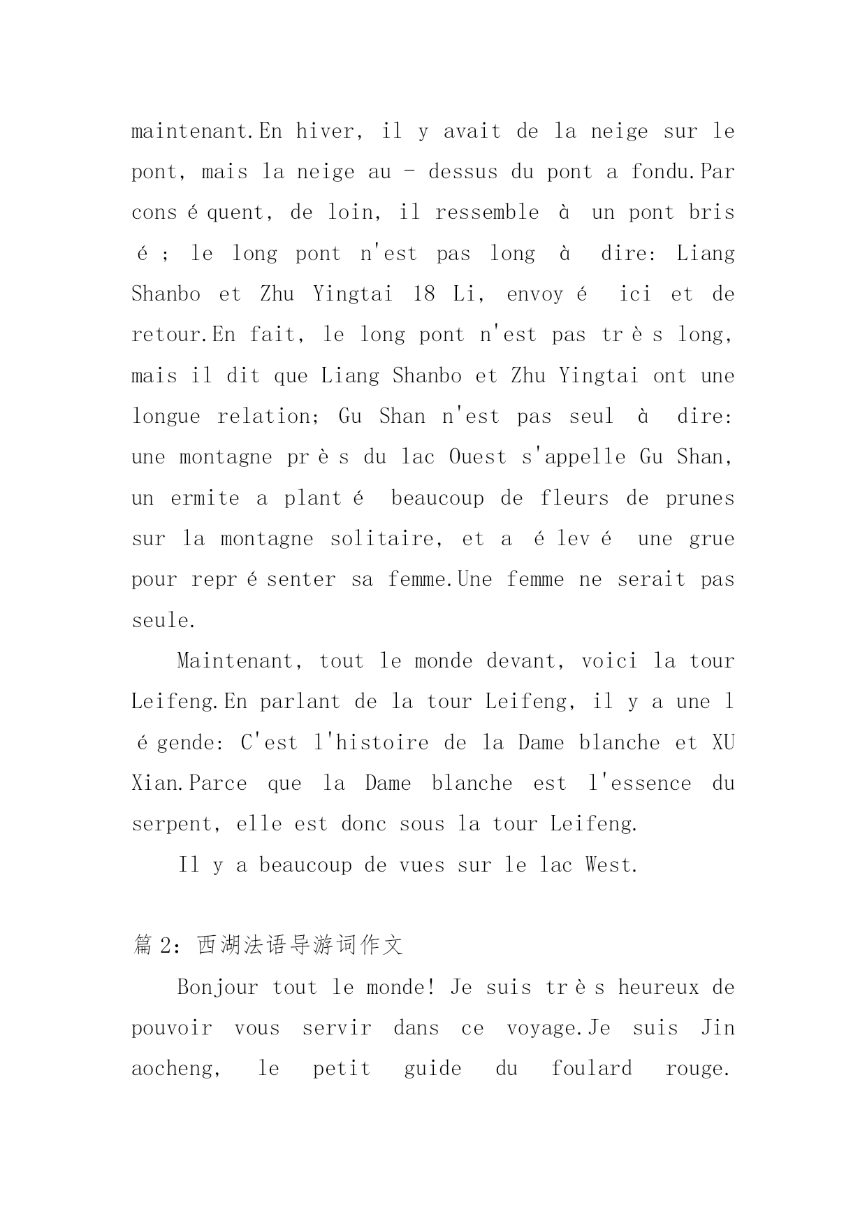 西湖法语导游词作文 【导语】“成了呢”通过精心收集,向本站投稿了27篇西湖法语导游词作文,下面是小编给大家带来关于西湖法语导游词作文,一起来看看吧,希望对您有所帮助。篇1:西湖法语导游词作文Chervoyageur,jesuisleGuidedel'AgencedevoyageBlueSky,monnomestZhao,toutlemondem'appelleZhaoGuide.MaintenantquenoussommesarrivésaulacWest,toutlemondeconna?tlelacWestàHangzhou.RegardezlelacOuest,lelacscintillant,scintillantunpeud'or.Deloin,lelacOuestestcommeunpavillondejeunesfilles,chuchutouchante,gracieuse.LesfleursdelotussurlebordajoutentdelabeautéaulacWest.S'ilvouspla?t,nejetezpasdepiècessurlaFeuilledelotus.Commevouslesavezpeut-être,lalégendeditqu'ilyatroismonstresdanslelacWest.Lesvisiteursquinelesaventpasdoiventsedemander:Qu'est-cequec'est?Laissez-moivousenparlermaintenant.Enhiver,ilyavaitdelaneigesurlepont,maislaneigeau-dessusdupontafondu.Parconséquent,deloin,ilressembleàunpontbrisé;lelongpontn'estpaslongàdire:LiangShanboetZhuYingtai18Li,envoyéicietderetour.Enfait,lelongpontn'estpastrèslong,maisilditqueLiangShanboetZhuYingtaiontunelonguerelation;GuShann'estpasseulàdire:unemontagneprèsdulacOuests'appelleGuShan,unermiteaplantébeaucoupdefleursdeprunessurlamontagnesolitaire,etaélevéunegruepourreprésentersafemme.Unefemmeneseraitpasseule.Maintenant,toutlemondedevant,voicilatourLeifeng.EnparlantdelatourLeifeng,ilyaunelégende:C'estl'histoiredelaDameblancheetXUXian.ParcequelaDameblancheestl'essenceduserpent,elleestdoncsouslatourLeifeng.IlyabeaucoupdevuessurlelacWest.篇2:西湖法语导游词作文Bonjourtoutlemonde!Jesuistrèsheureuxdepouvoirvousservirdanscevoyage.JesuisJinaocheng,lepetitguidedufoulardrouge.Aujourd'hui,jevaisvousmontrerlepremierarrêtduvoyagedetroisjoursàHangzhou-WestLake.Regardez,lelacOuestautourdesmontagnesvertesetdel'eau,lemiroirplatdulacreflètedessaulesélégants,quelpaysagecharmant.LelacOuestestprincipalementcomposéd'unlac,deuxsommets,troissources,quatretemplesetd'autrespaysages.Laissez-moivousparlerdelaneigerésiduelledupontbrisé!C'estl'undesdixpaysagesdulacOuest!Dansl'antiquité,lesgensappelaientlepontbrisépontBaoyu,pontbrisé.Laneigerésiduelledupontbriséestsituéedanslecoinsud-oue